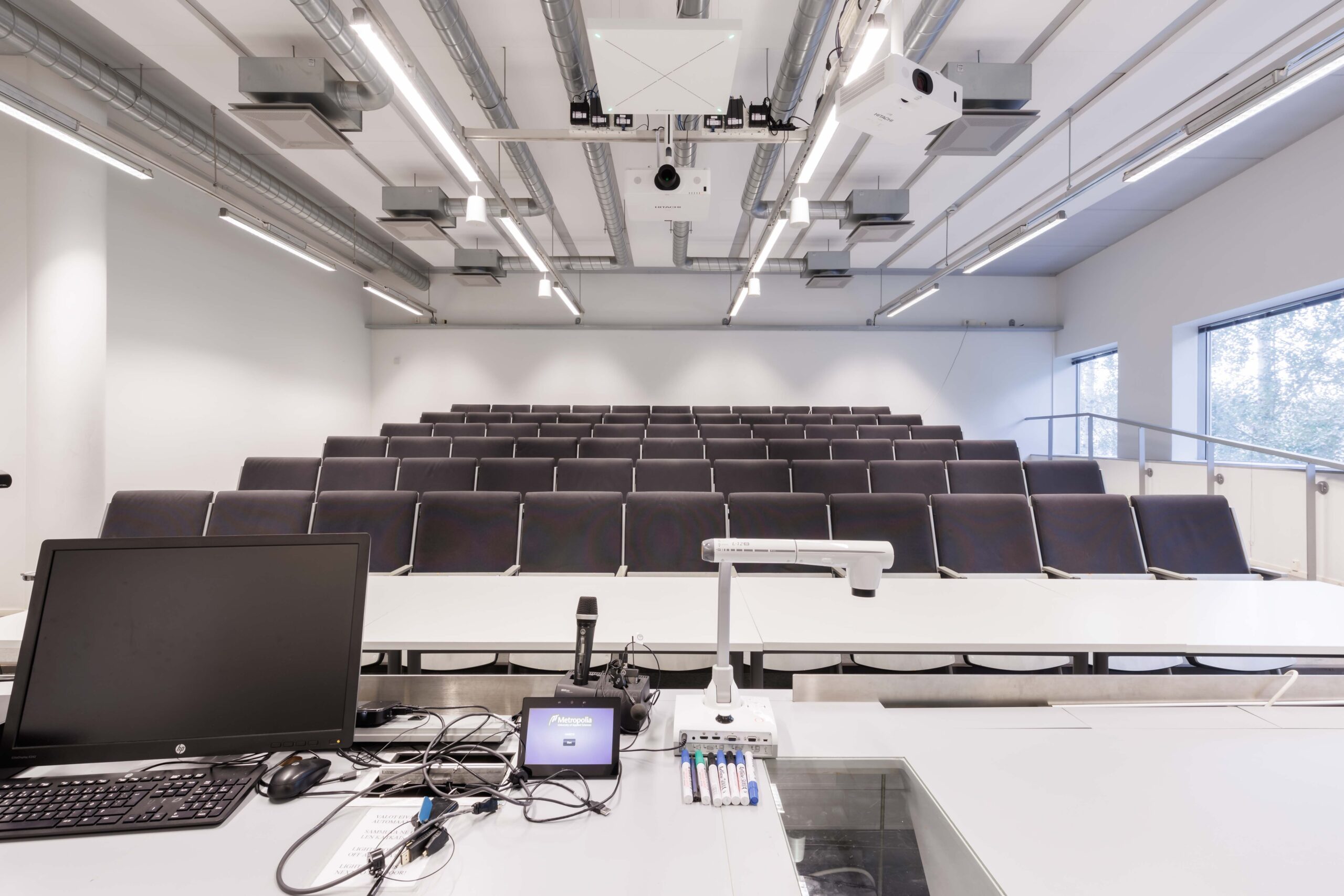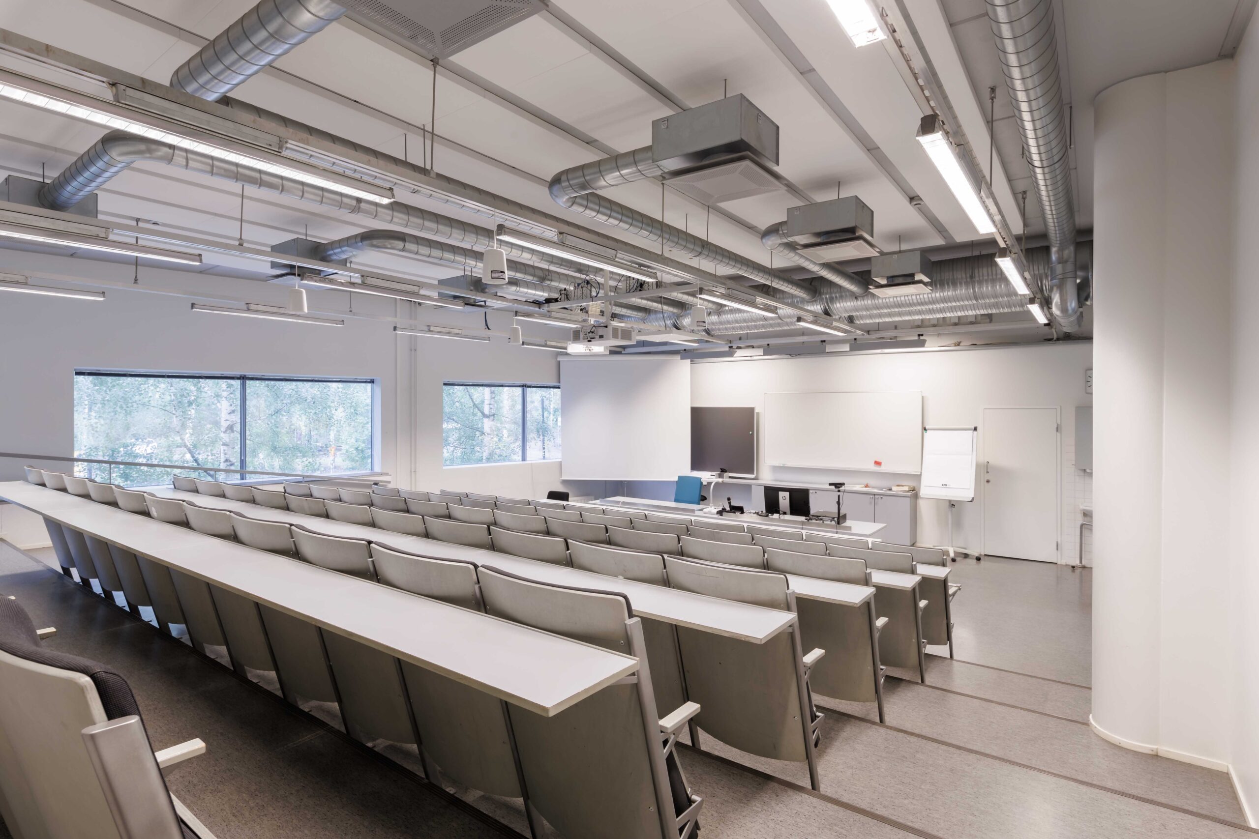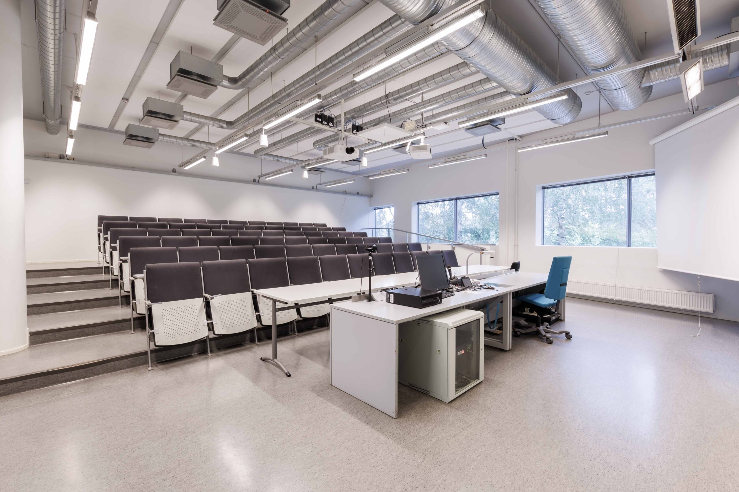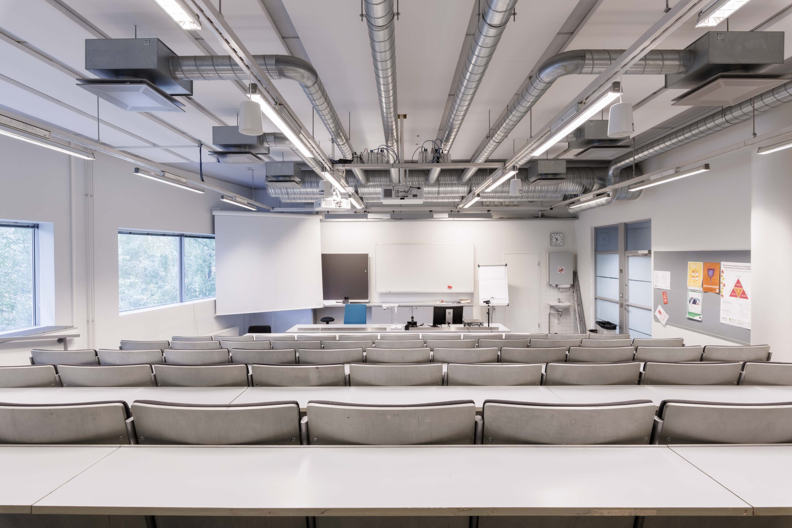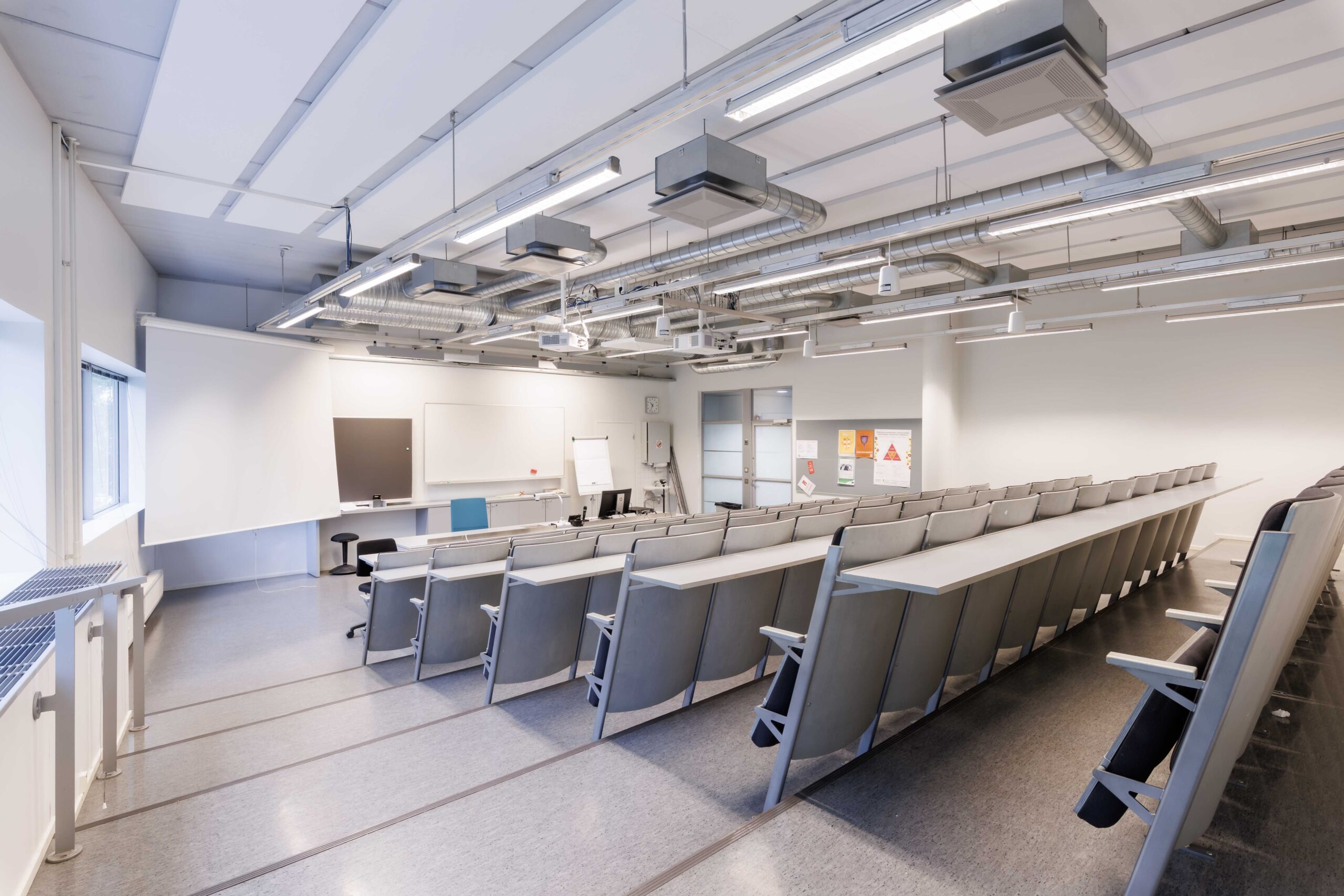 Keskikokoinen auditorio, tuoliriveillä pöytätasot. Tilassa kaksi etäprojektoria