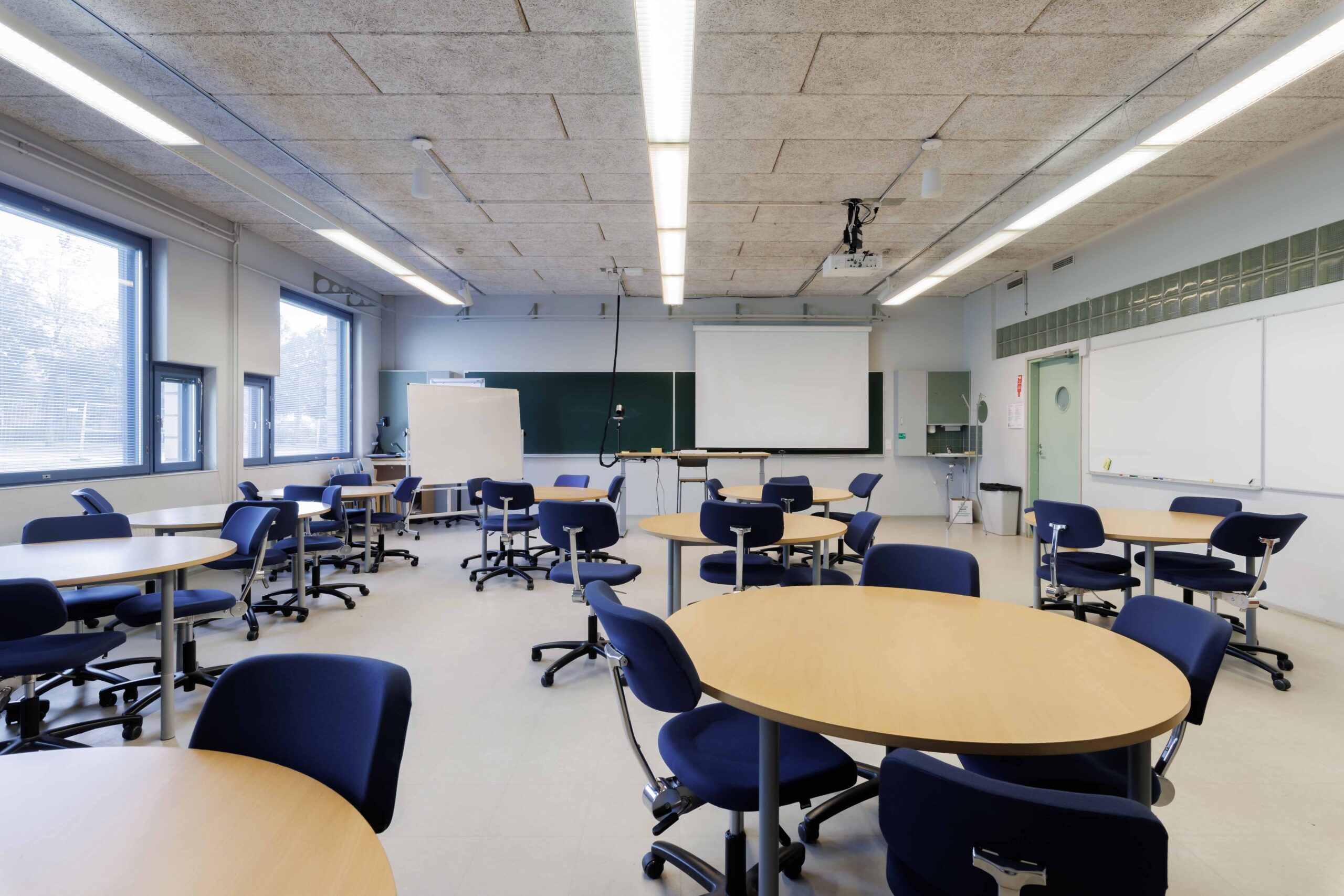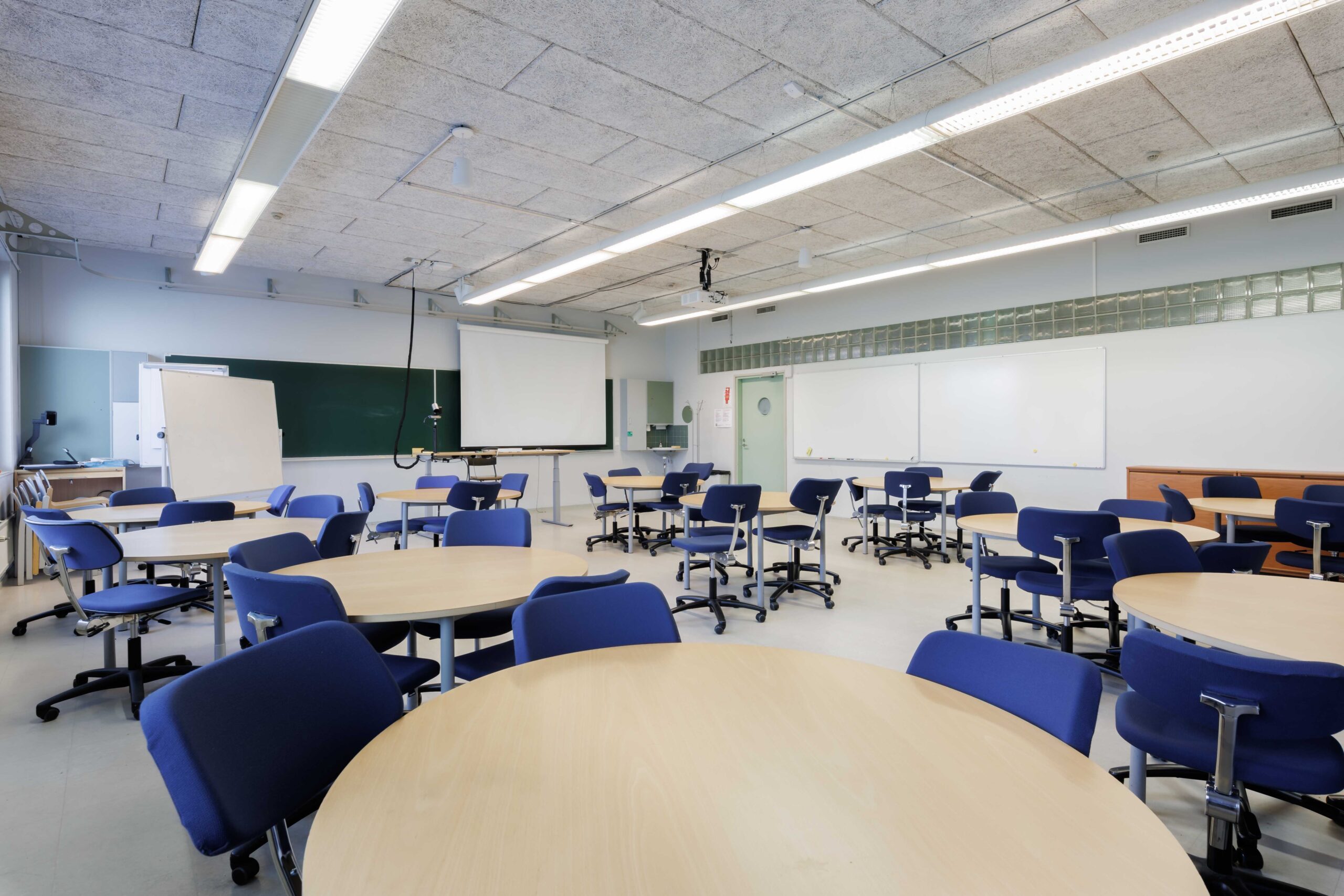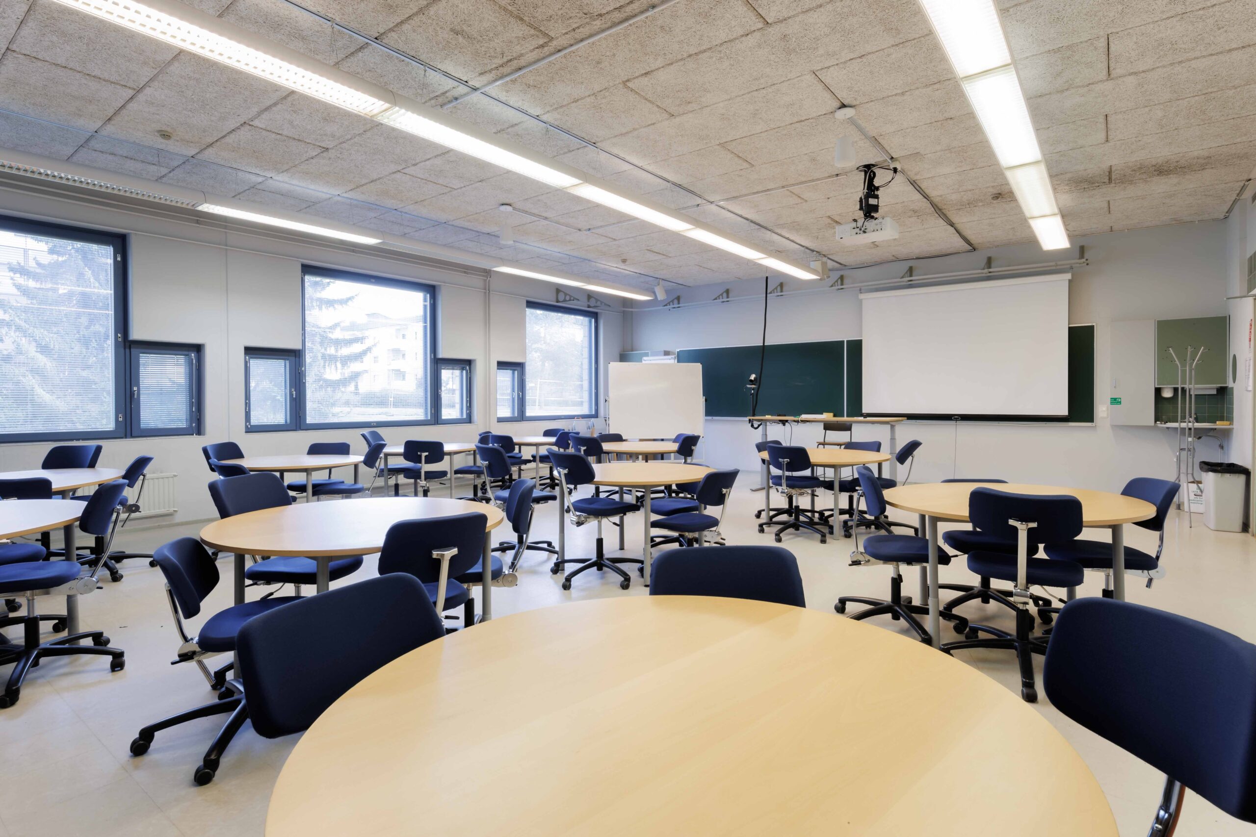 Pyöreat neljän hengen pöydät tuoleilla. Tilassa etäprojektori