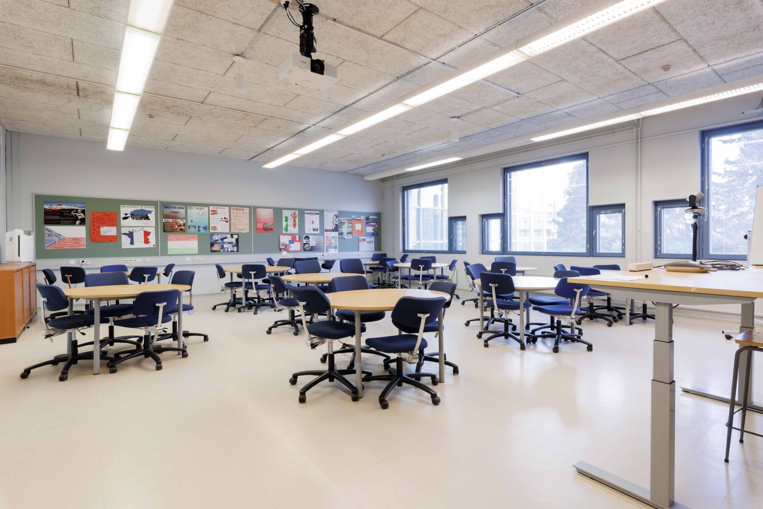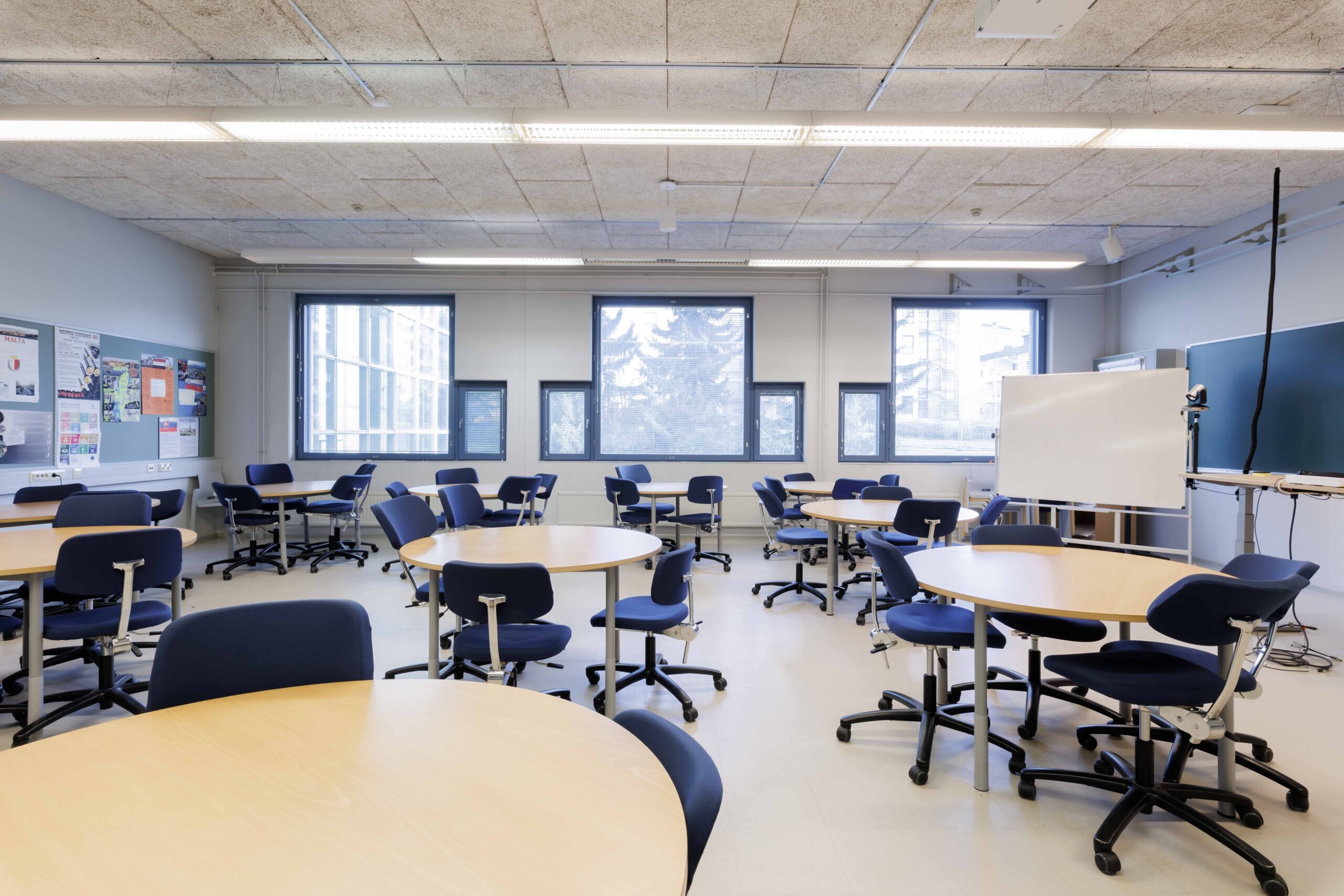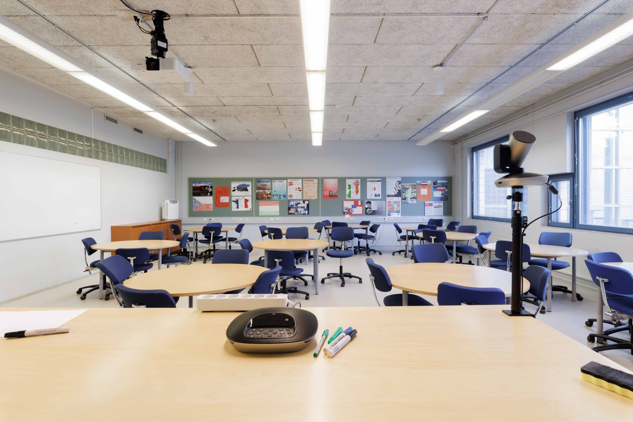 Pyöreat neljän hengen pöydät tuoleilla. Tilassa etäprojektori