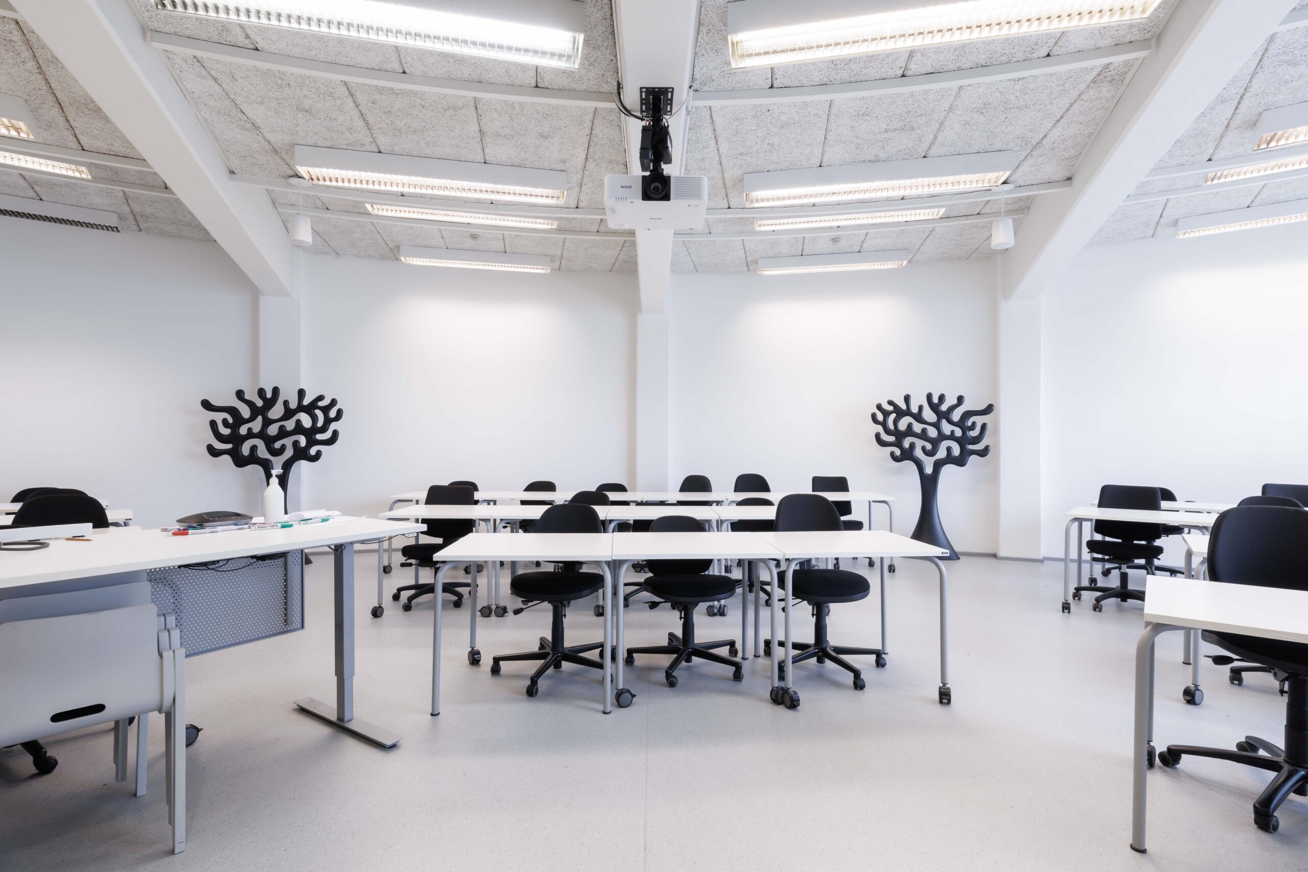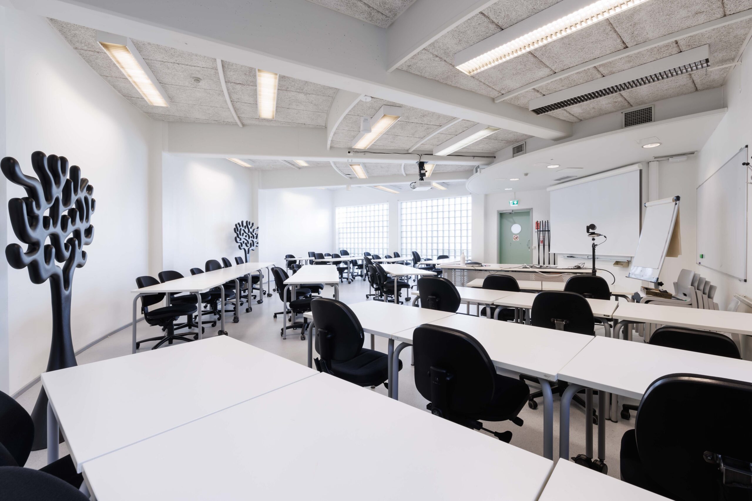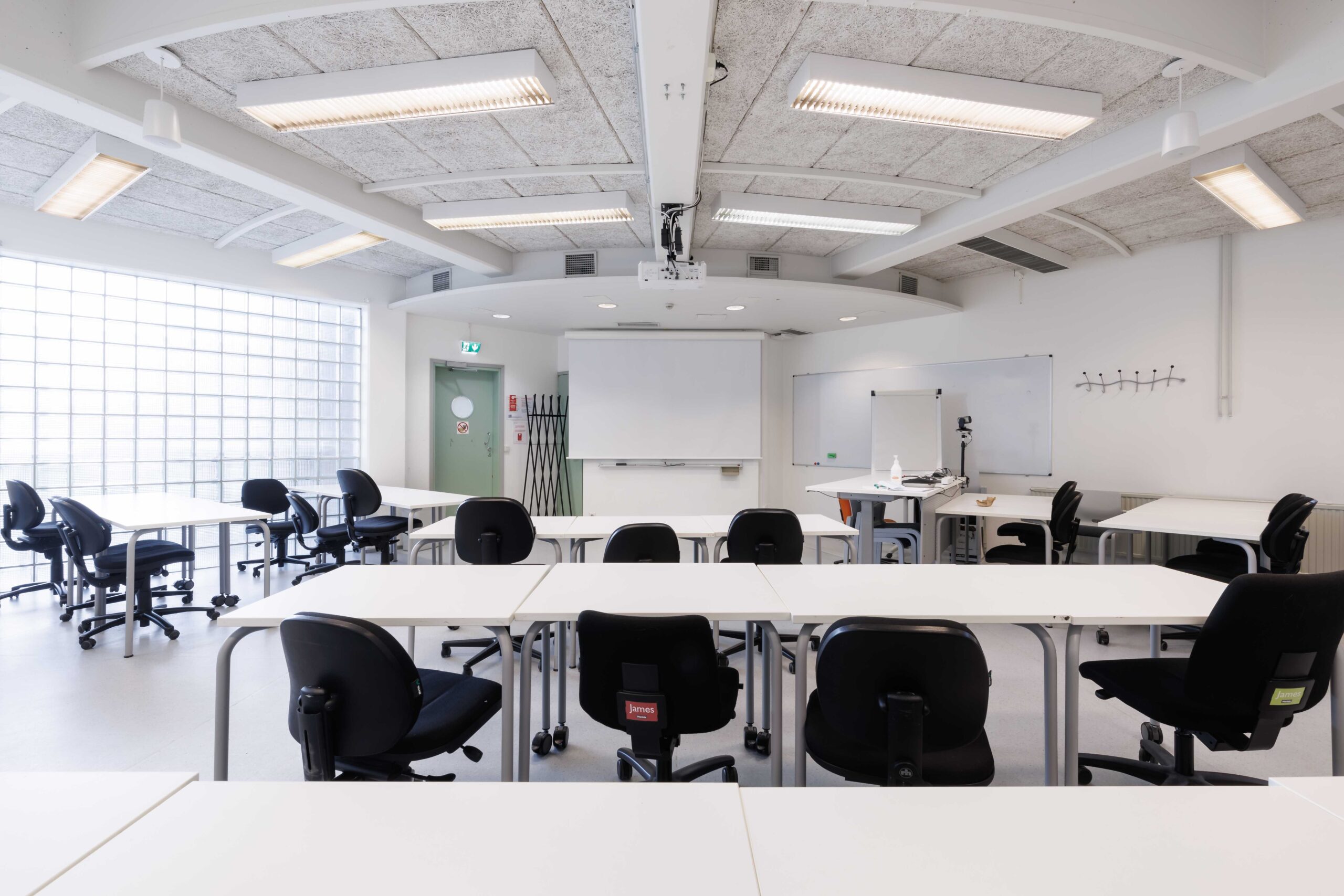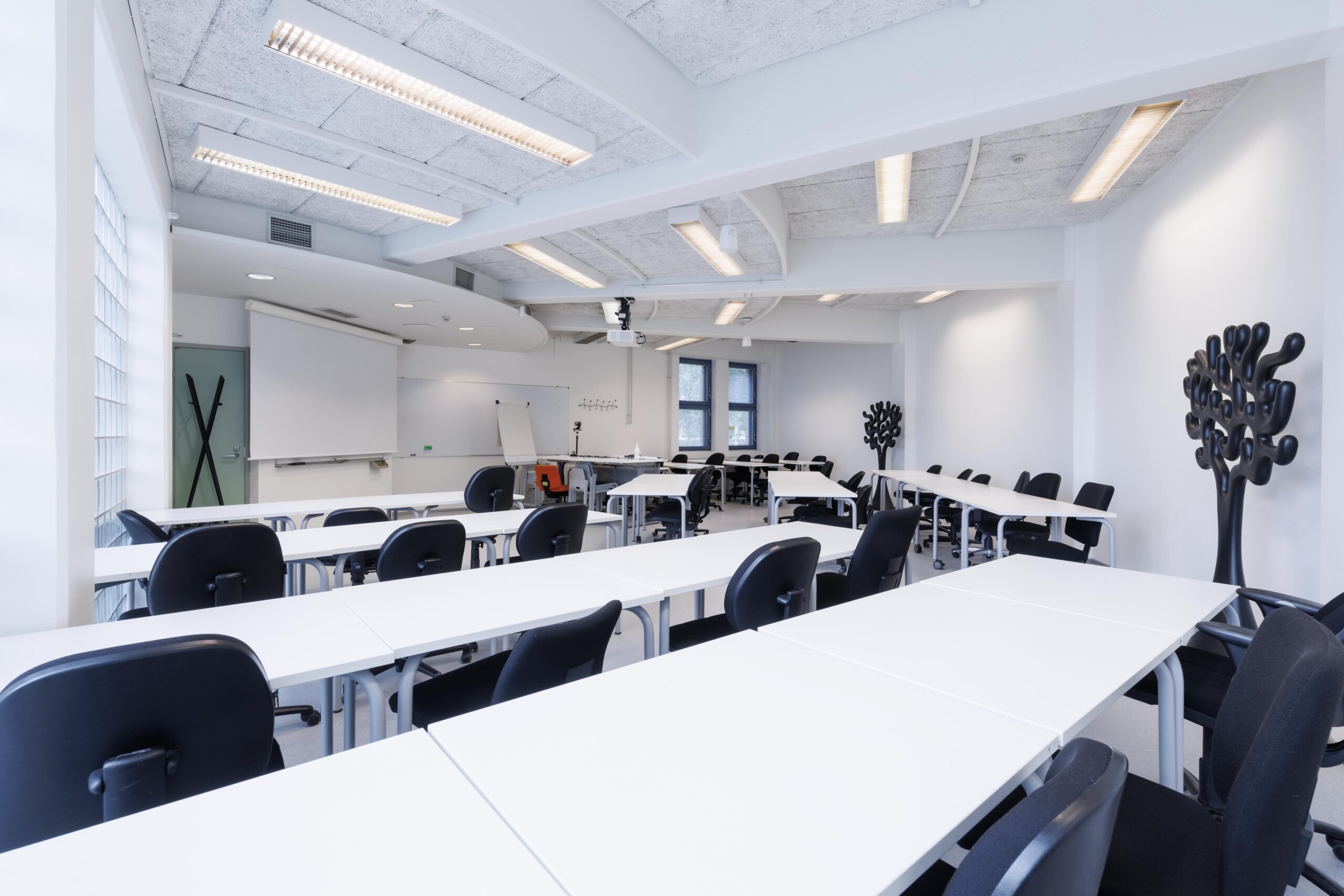 Yhden hengen pöydät tuoleilla. Tilassa etäprojektori