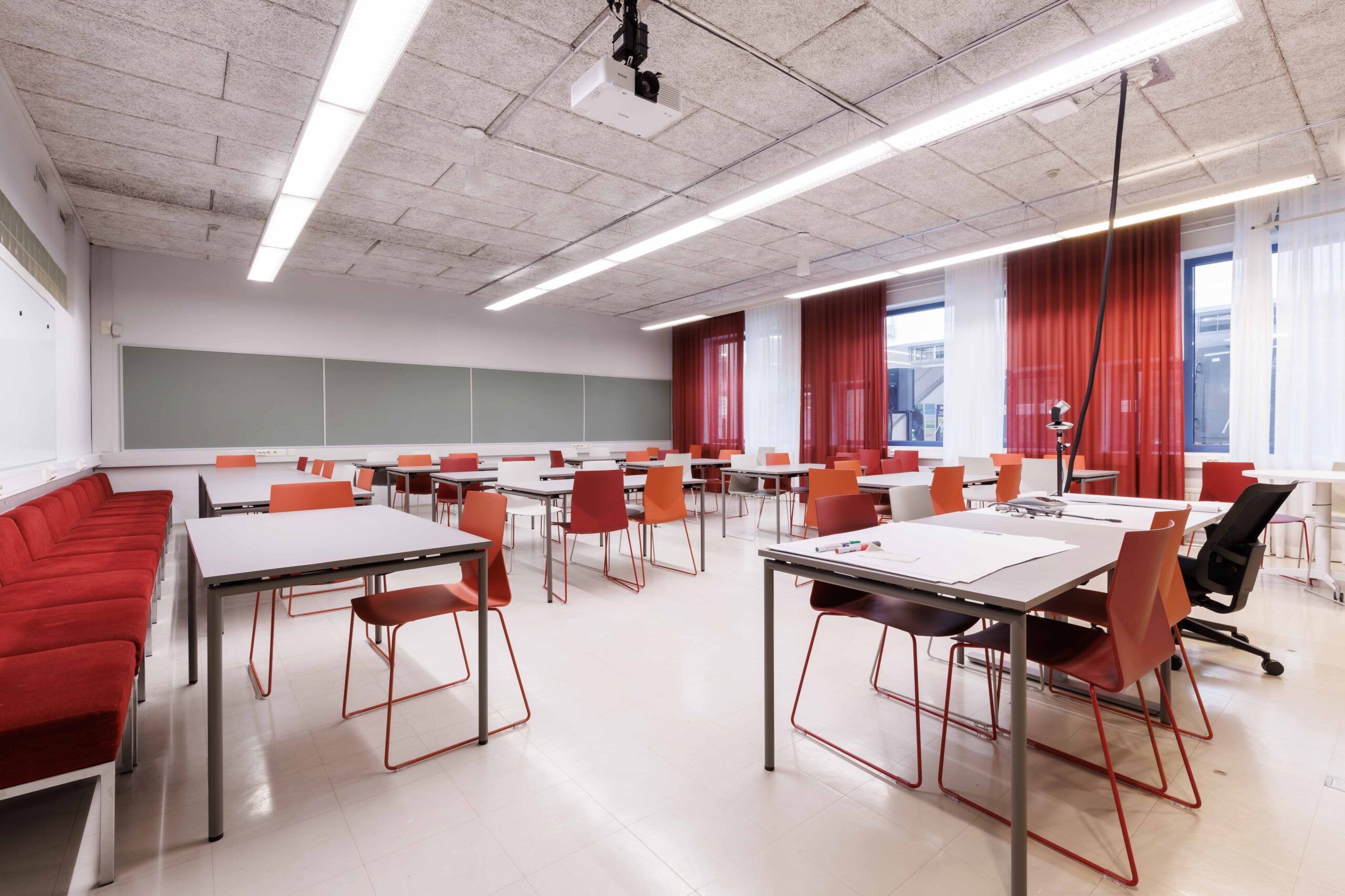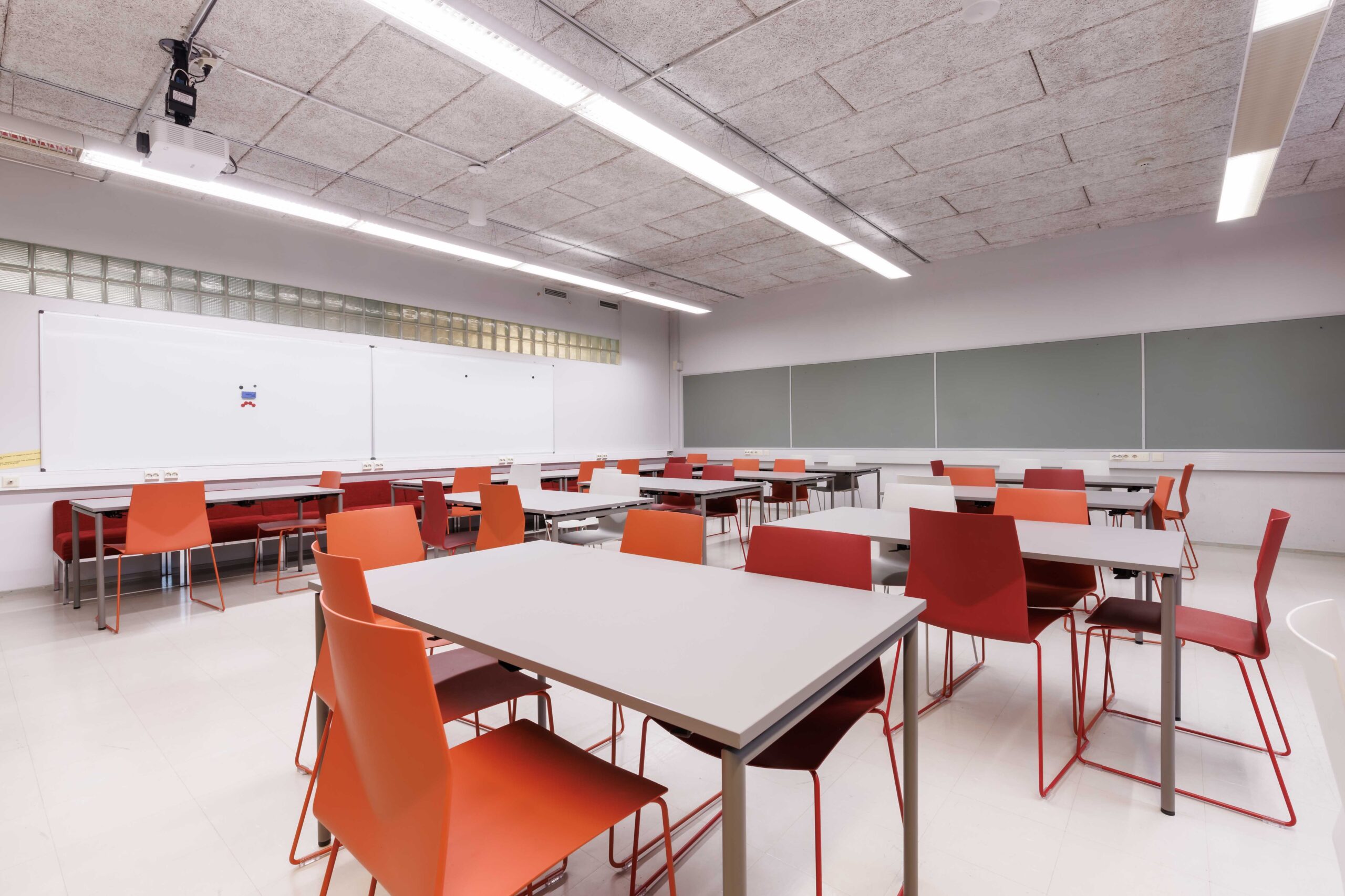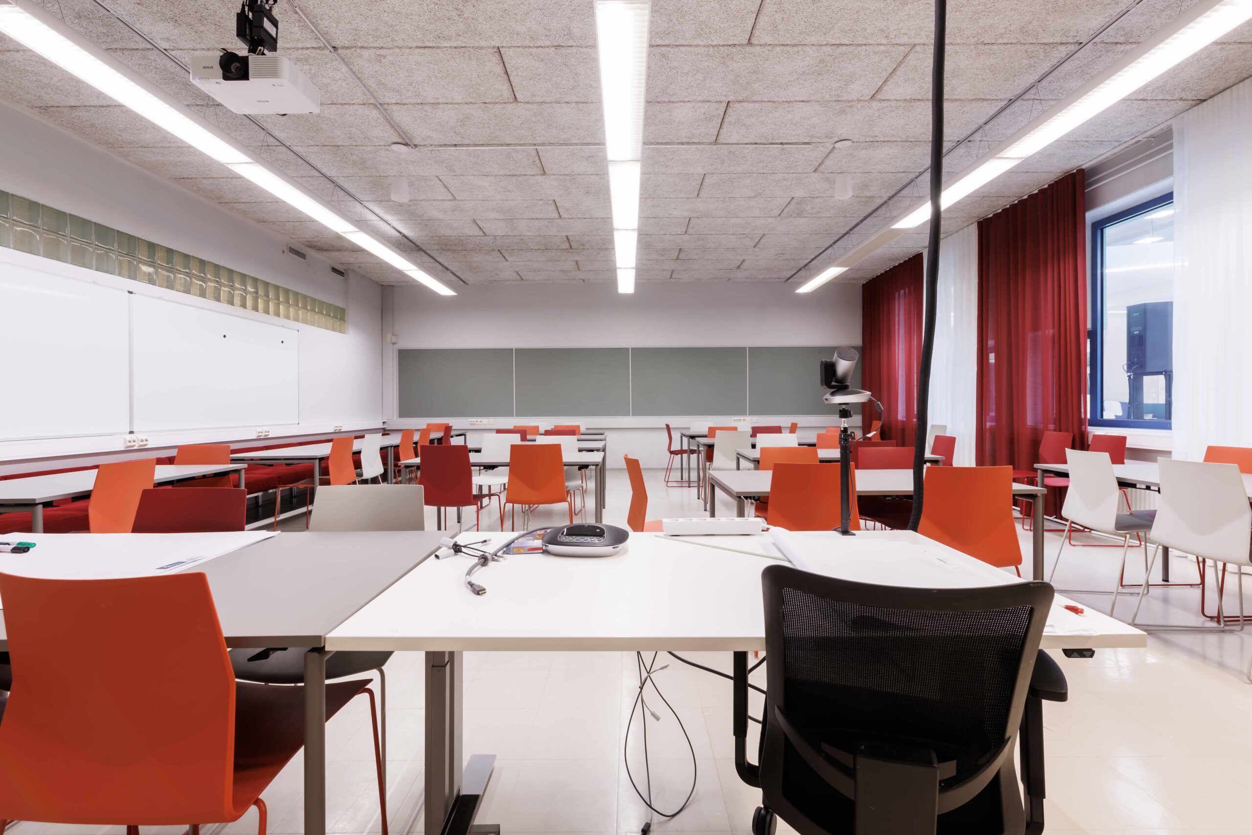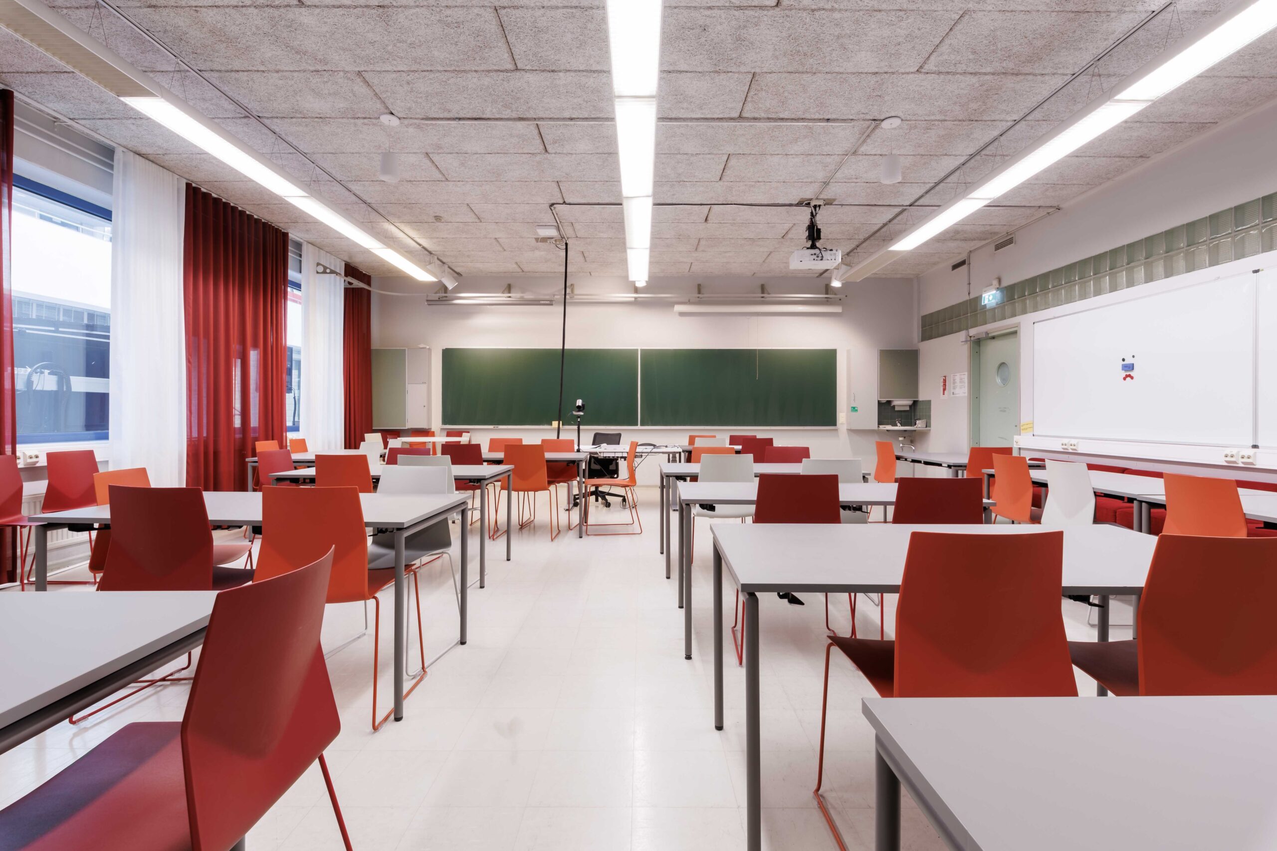 Neljän hengen pöydät tuoleilla. Tilassa etäprojektori