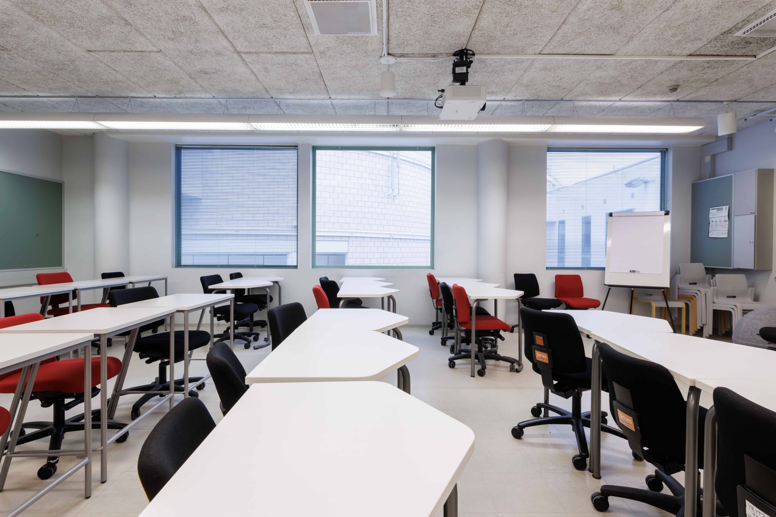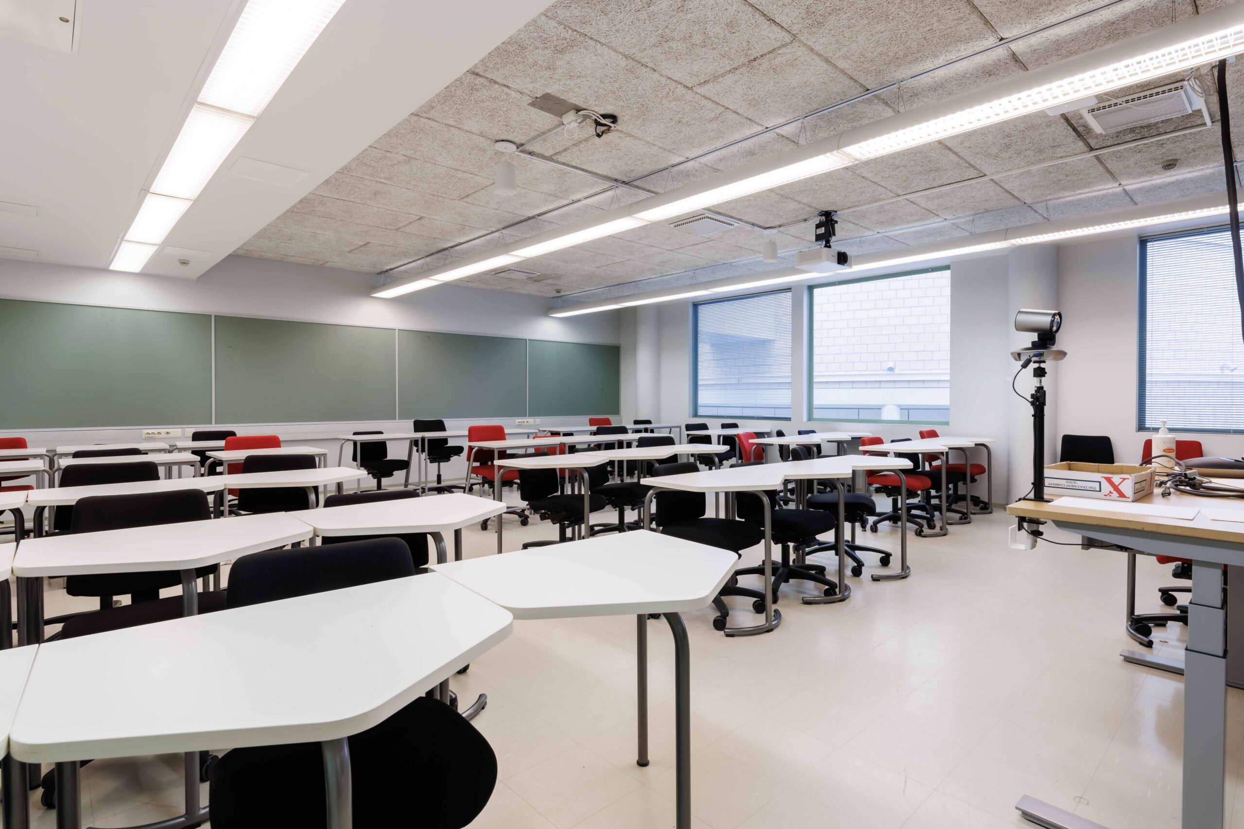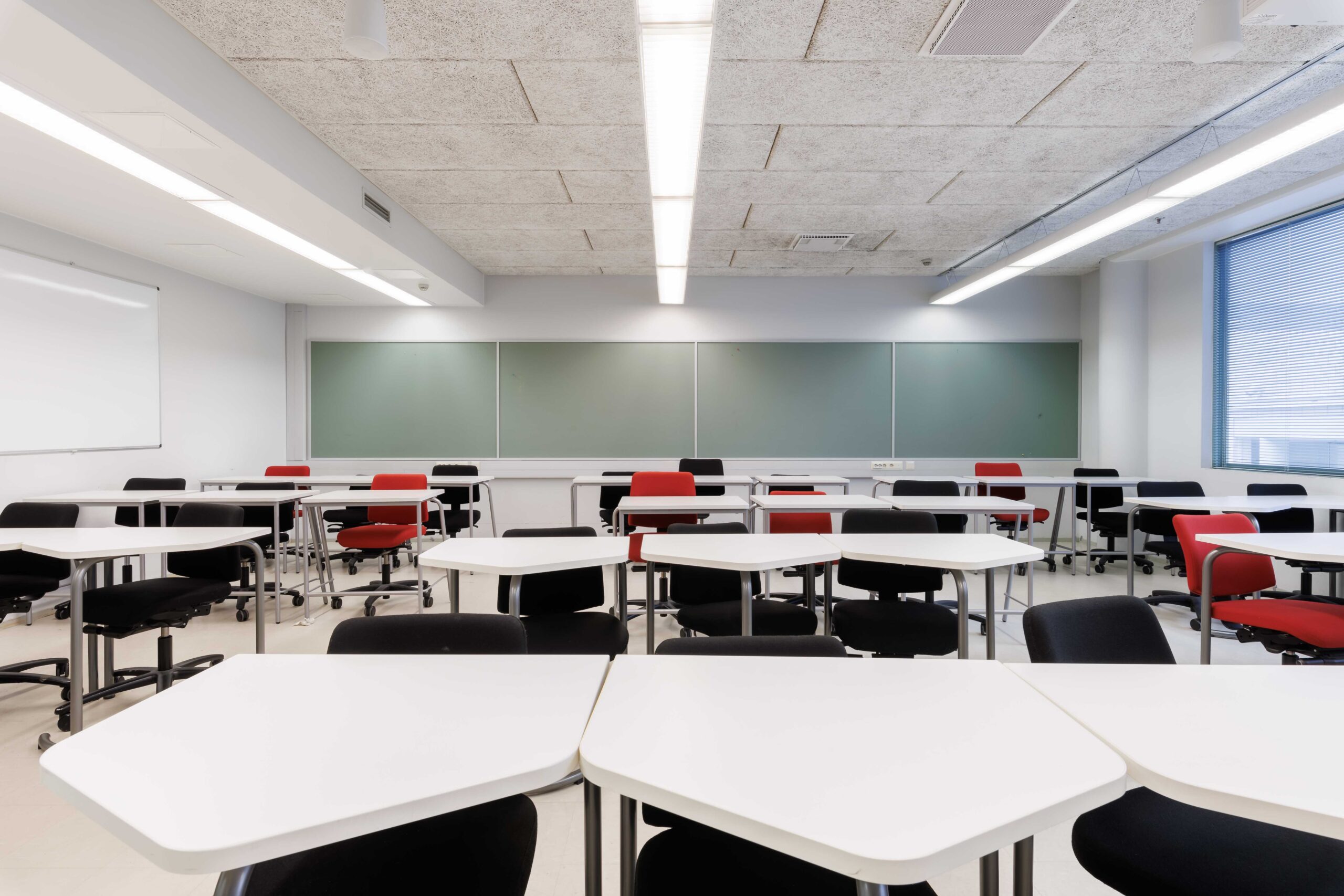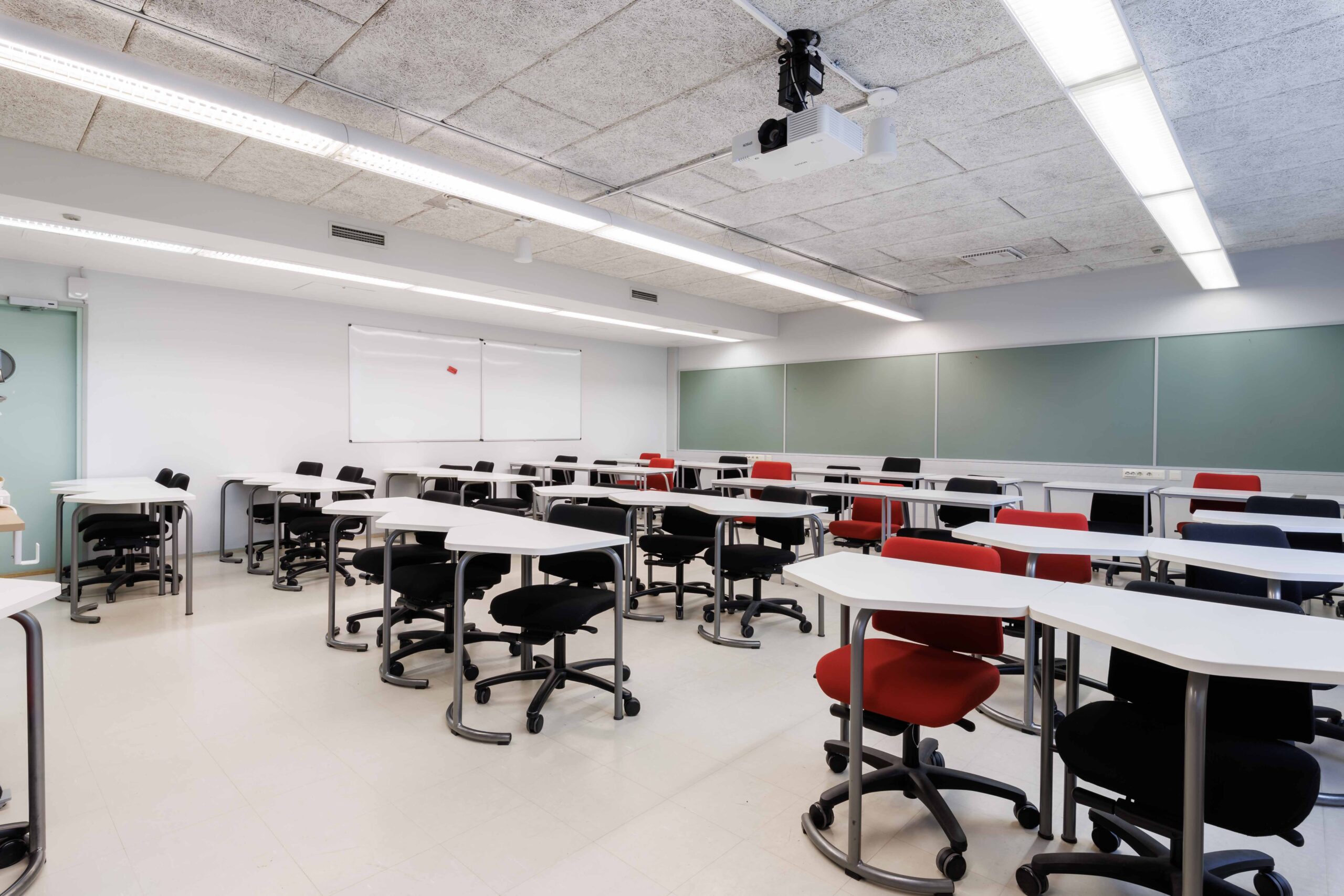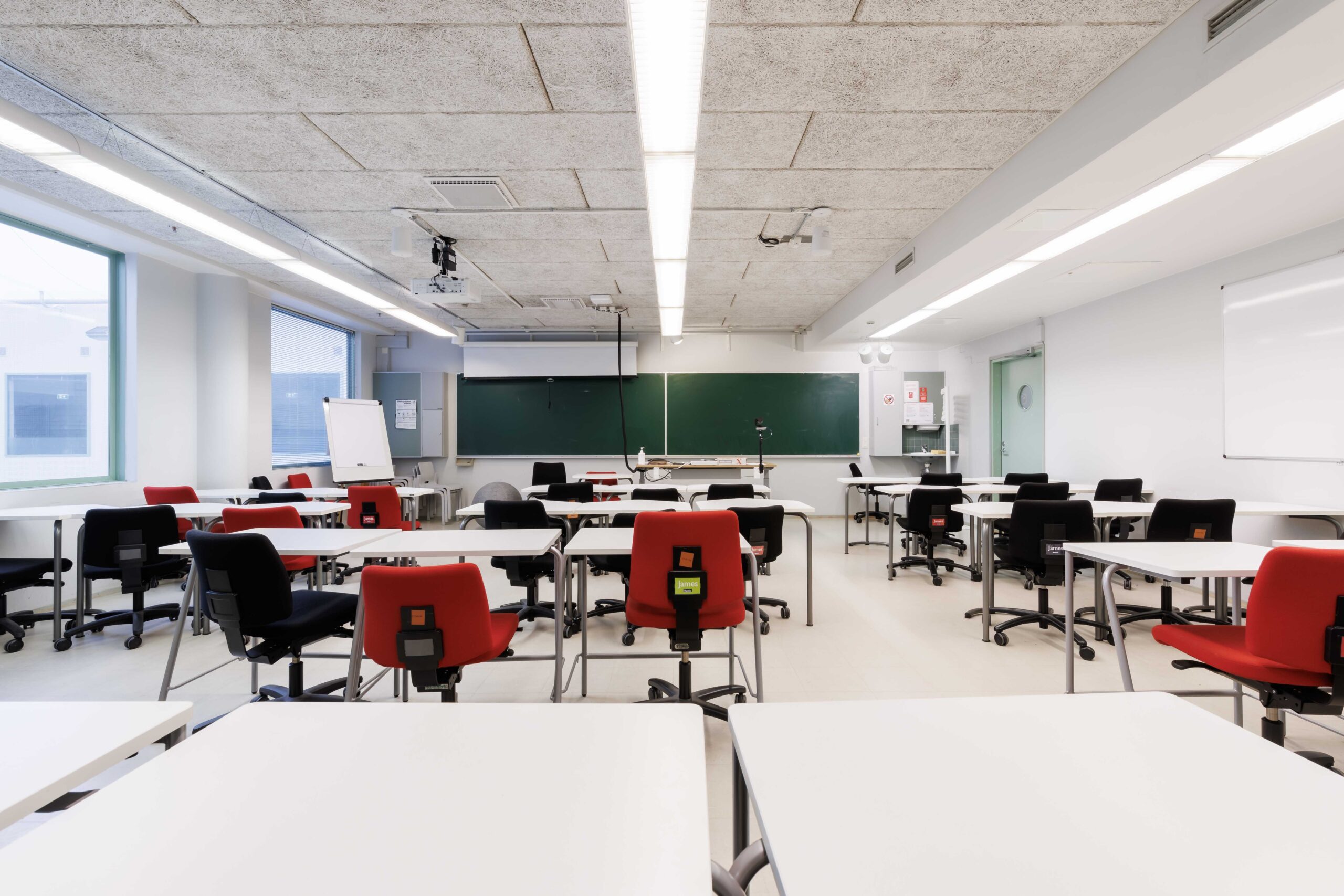 Yhden hengen pöydät tuoleilla. Tilassa etäprojektori
