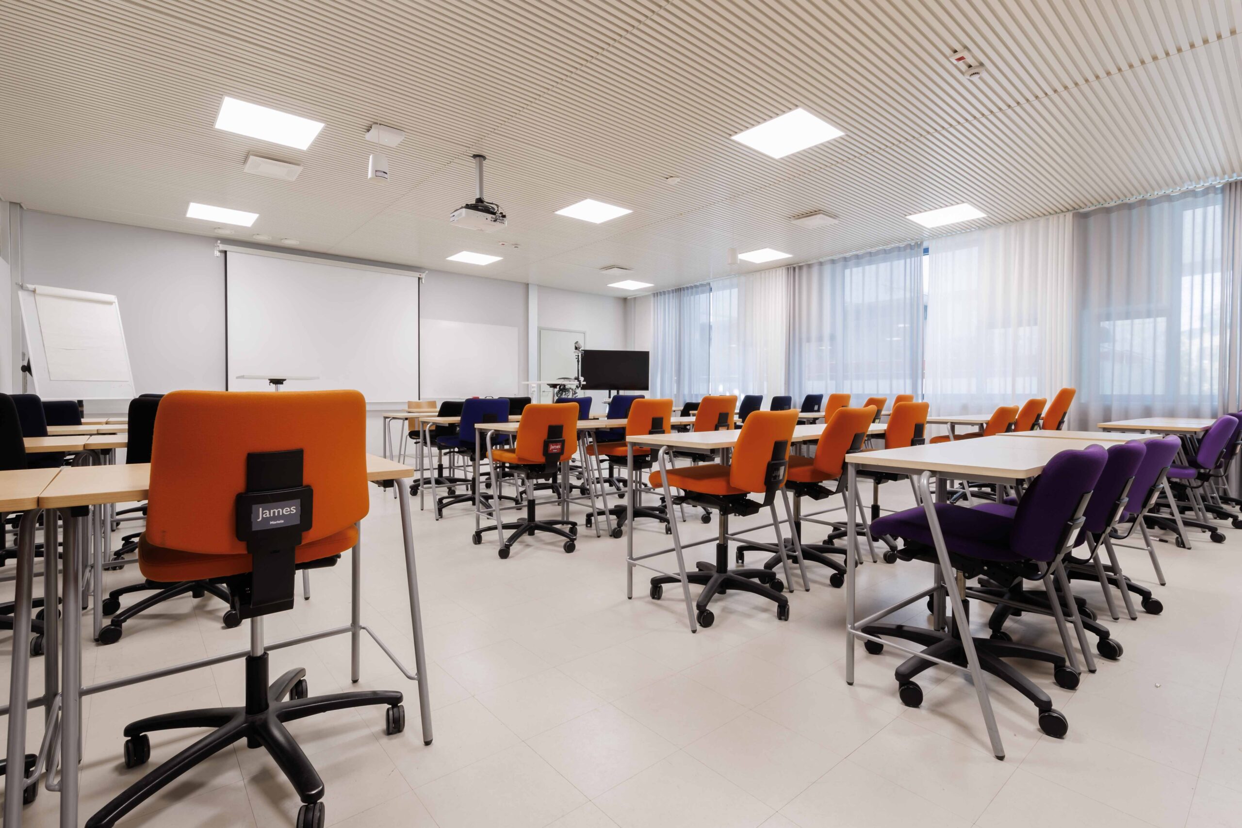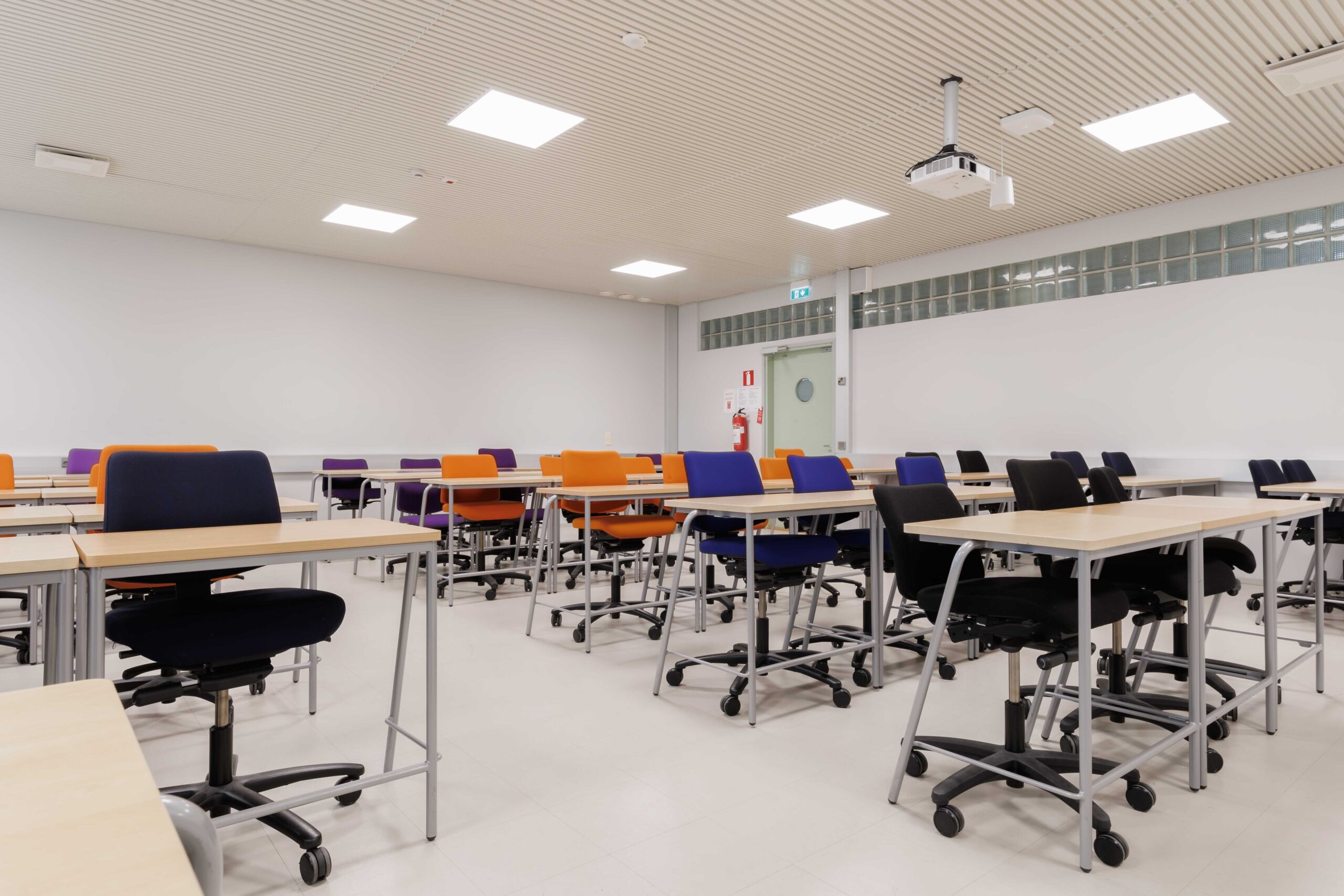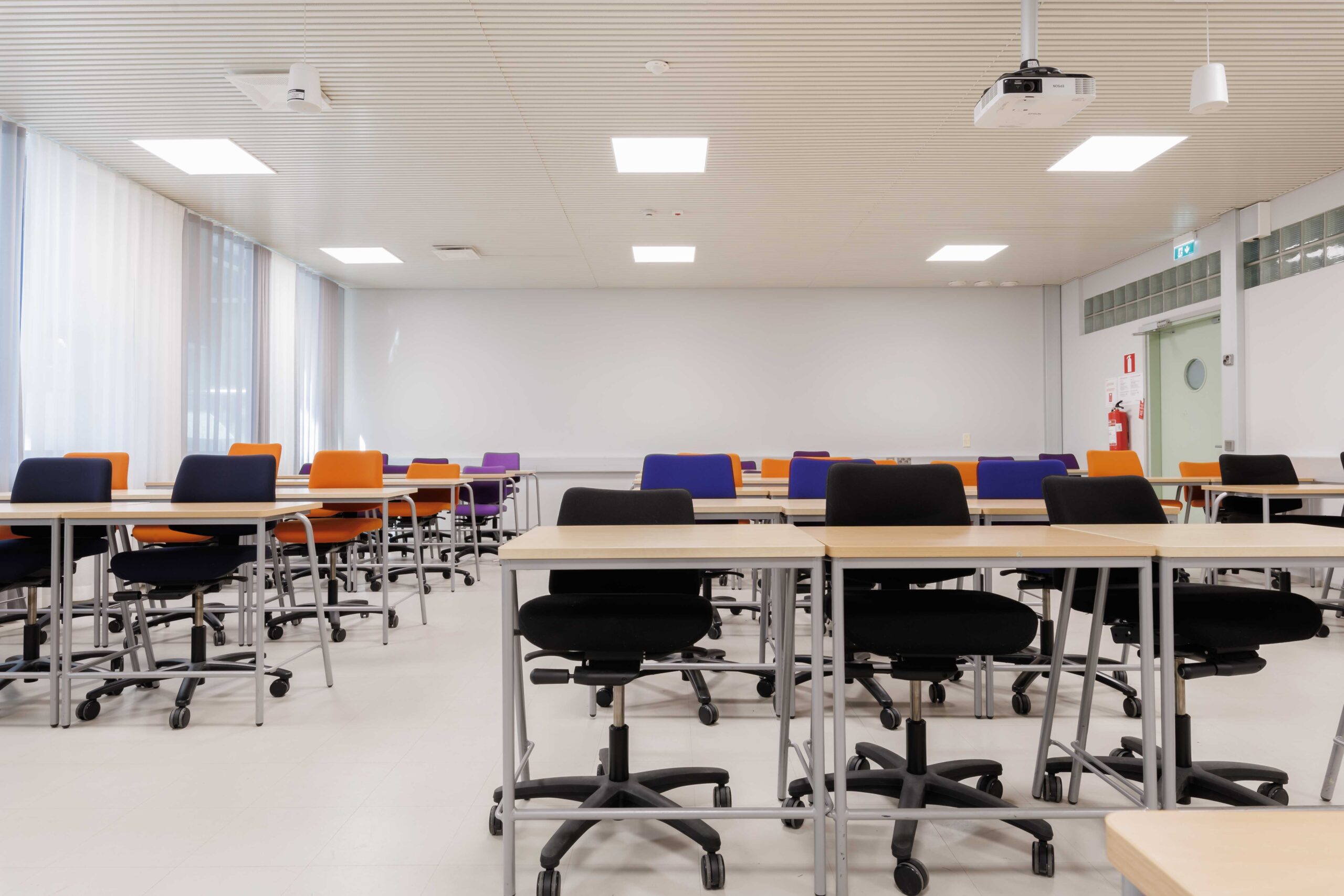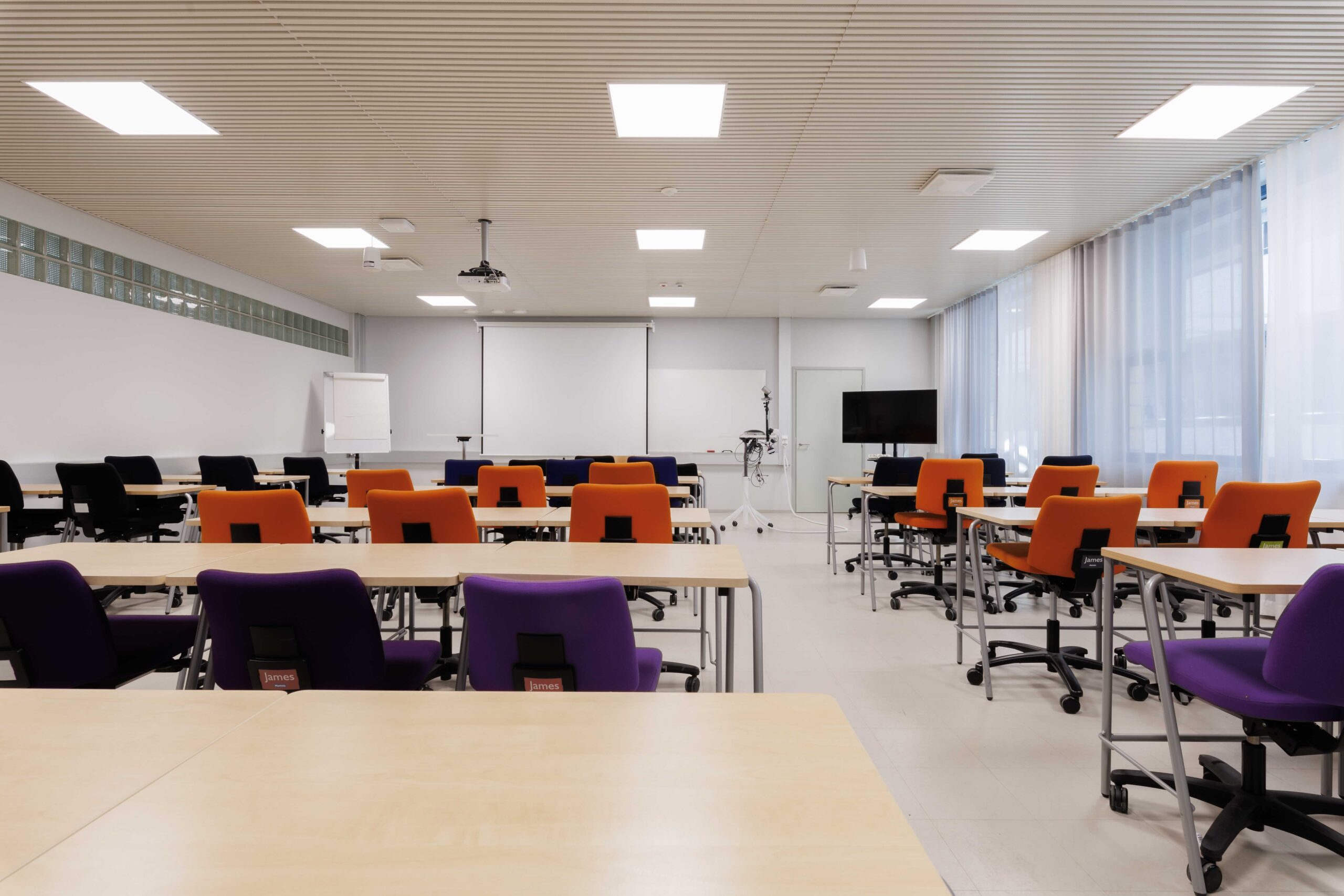 Yhden hengen pöydät tuoleilla. Tilassa etäprojektori ja esitysnäyttö