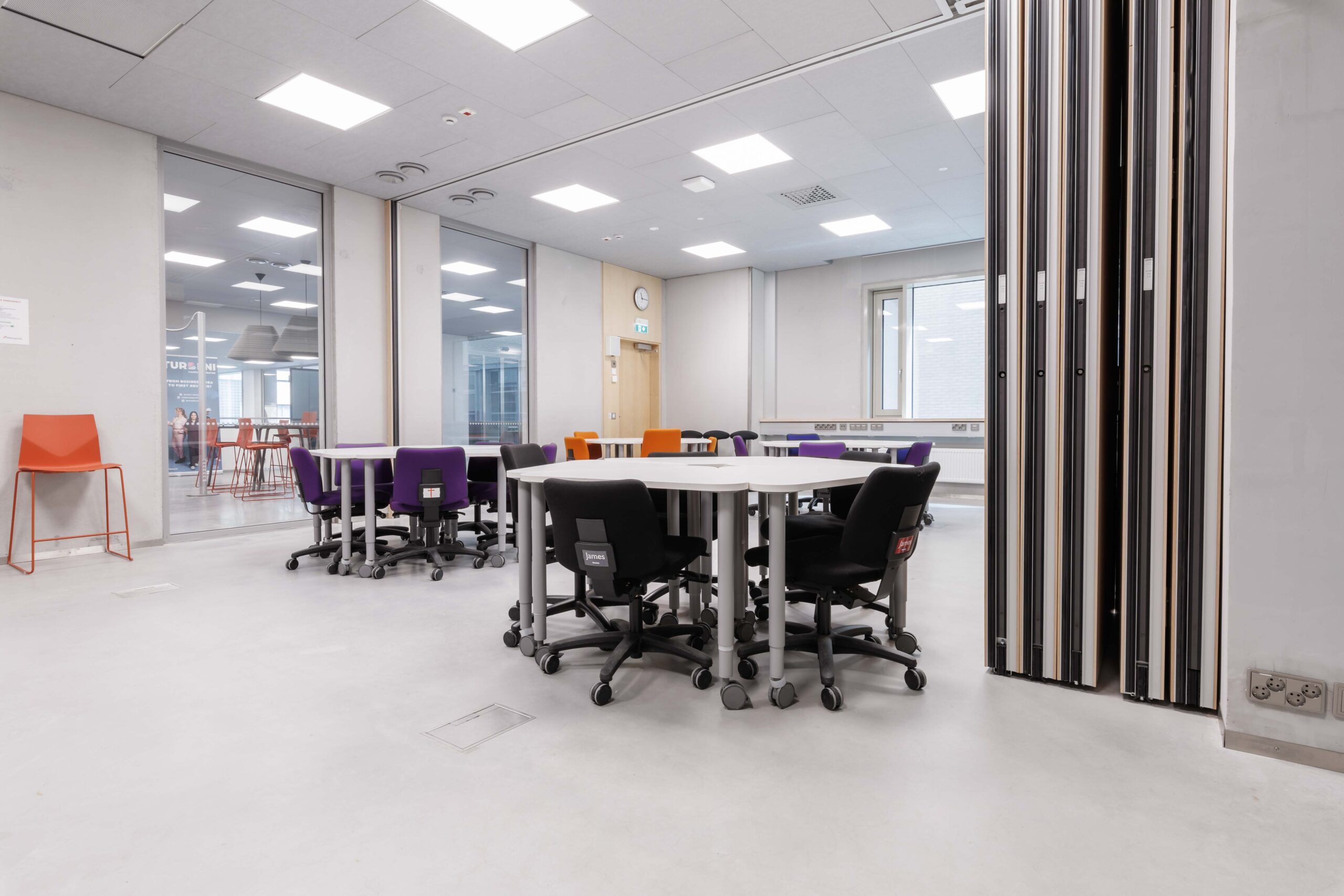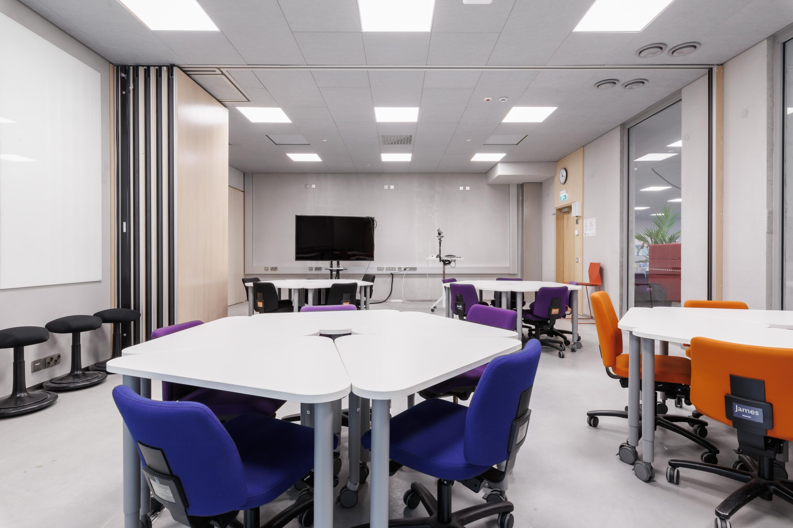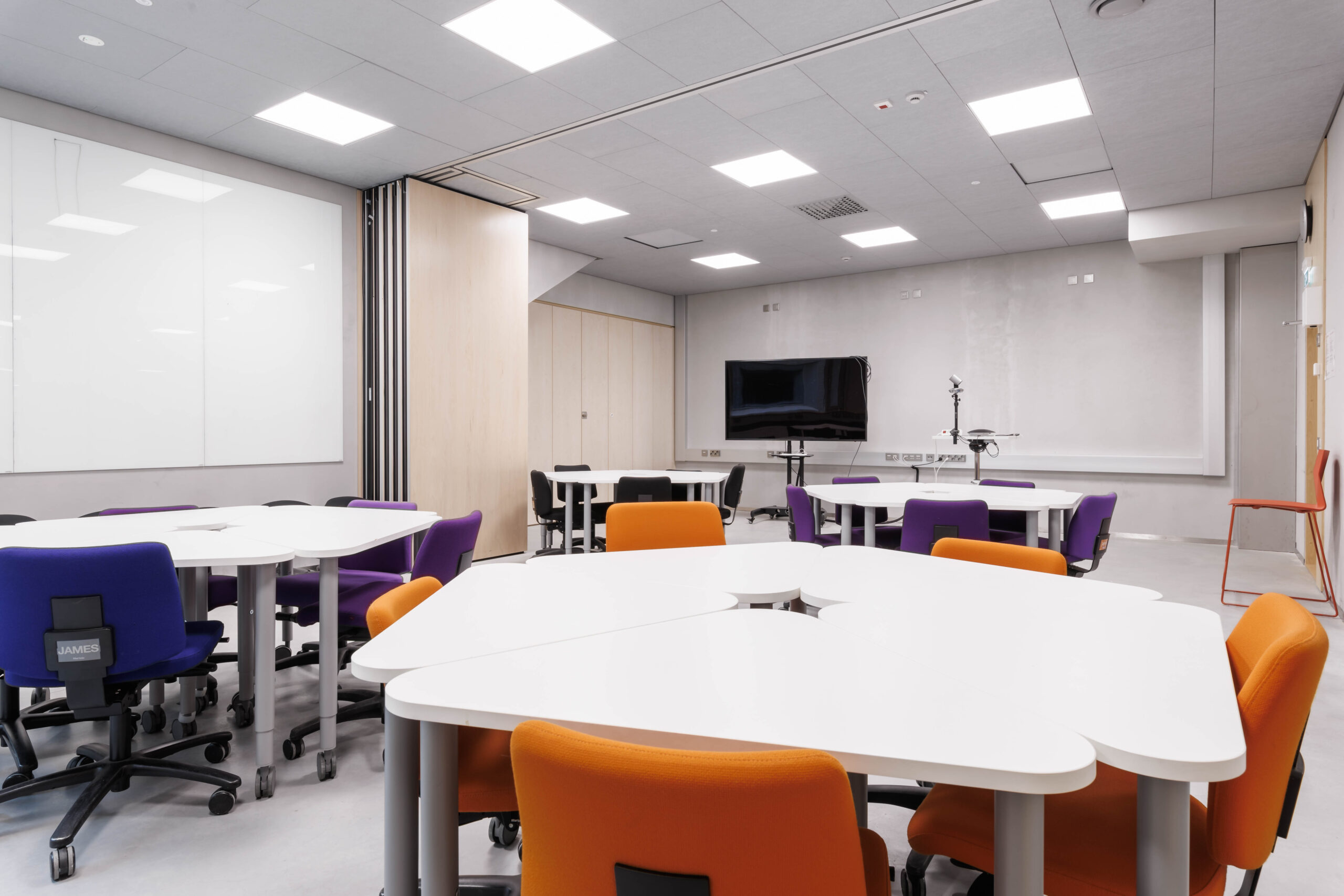 Yhden hengen pöydät tuoleilla. Tilassa esitysnäyttö