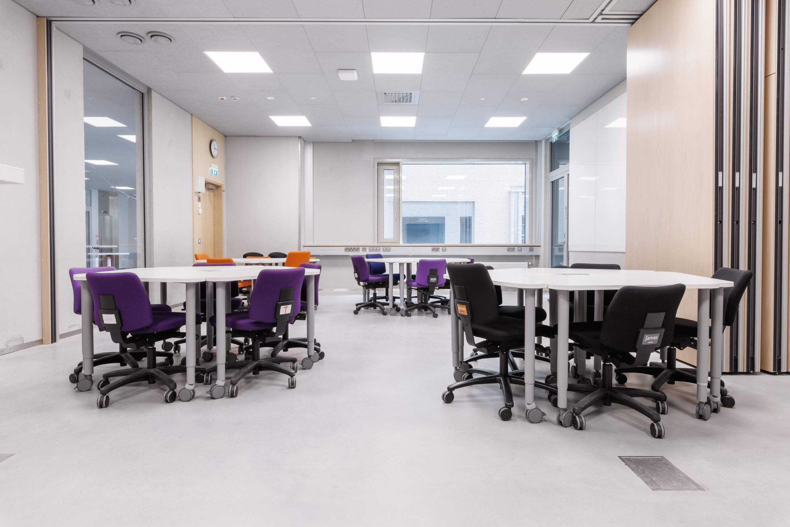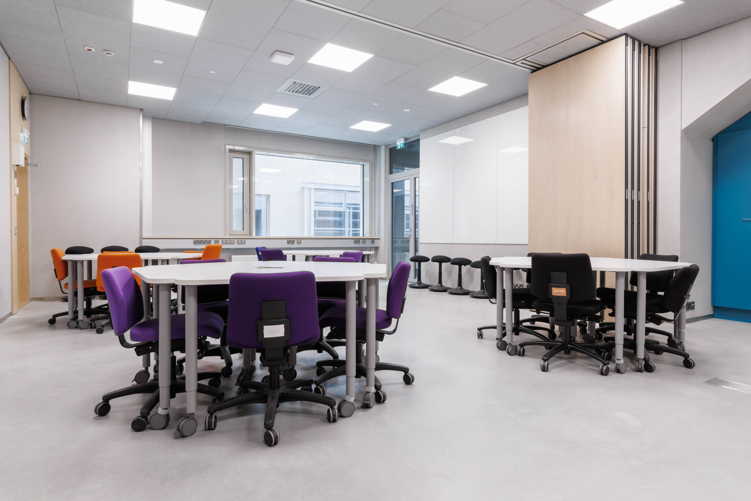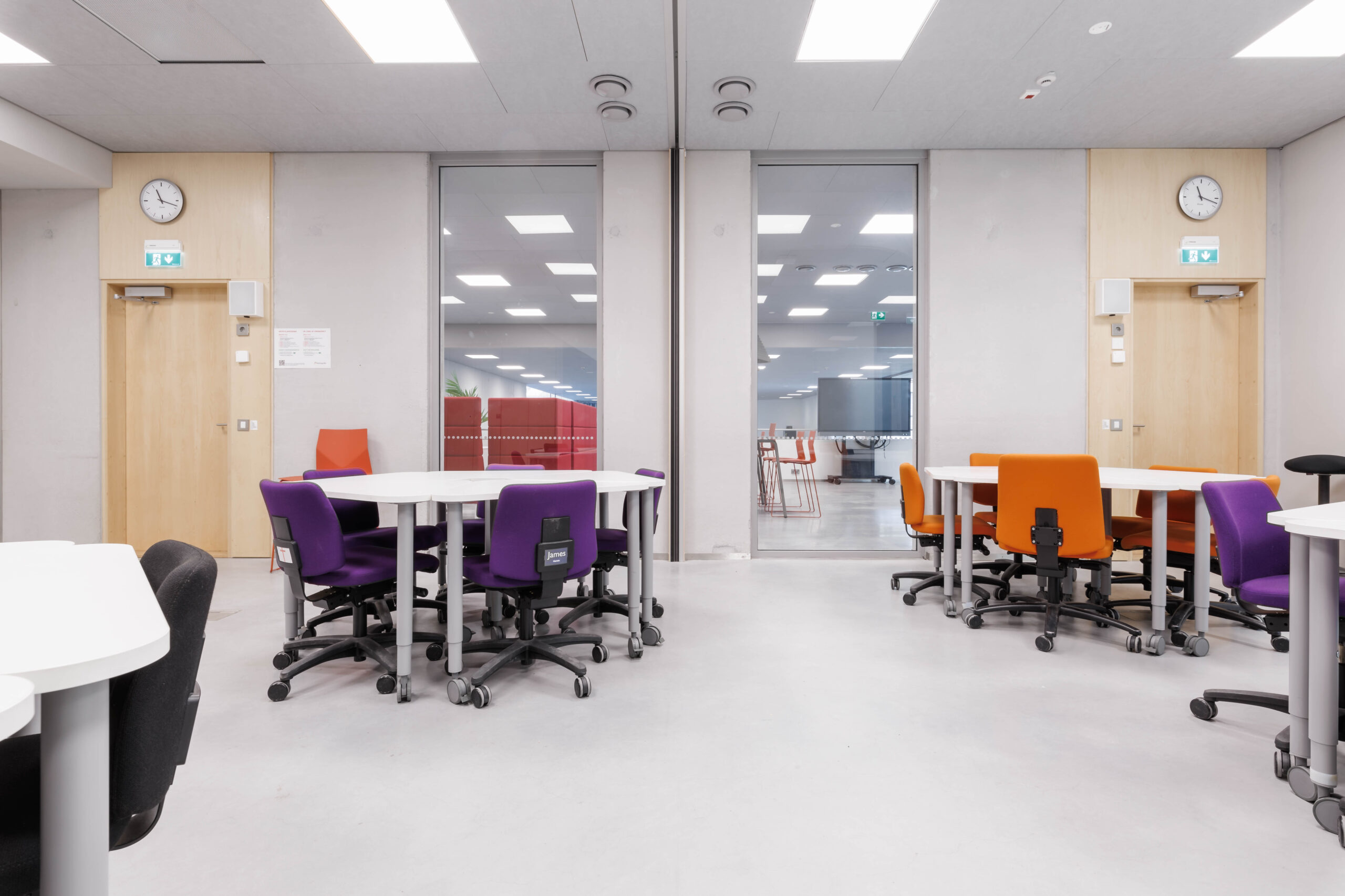 Yhden hengen pöydät tuoleilla. Tilassa esitysnäyttö