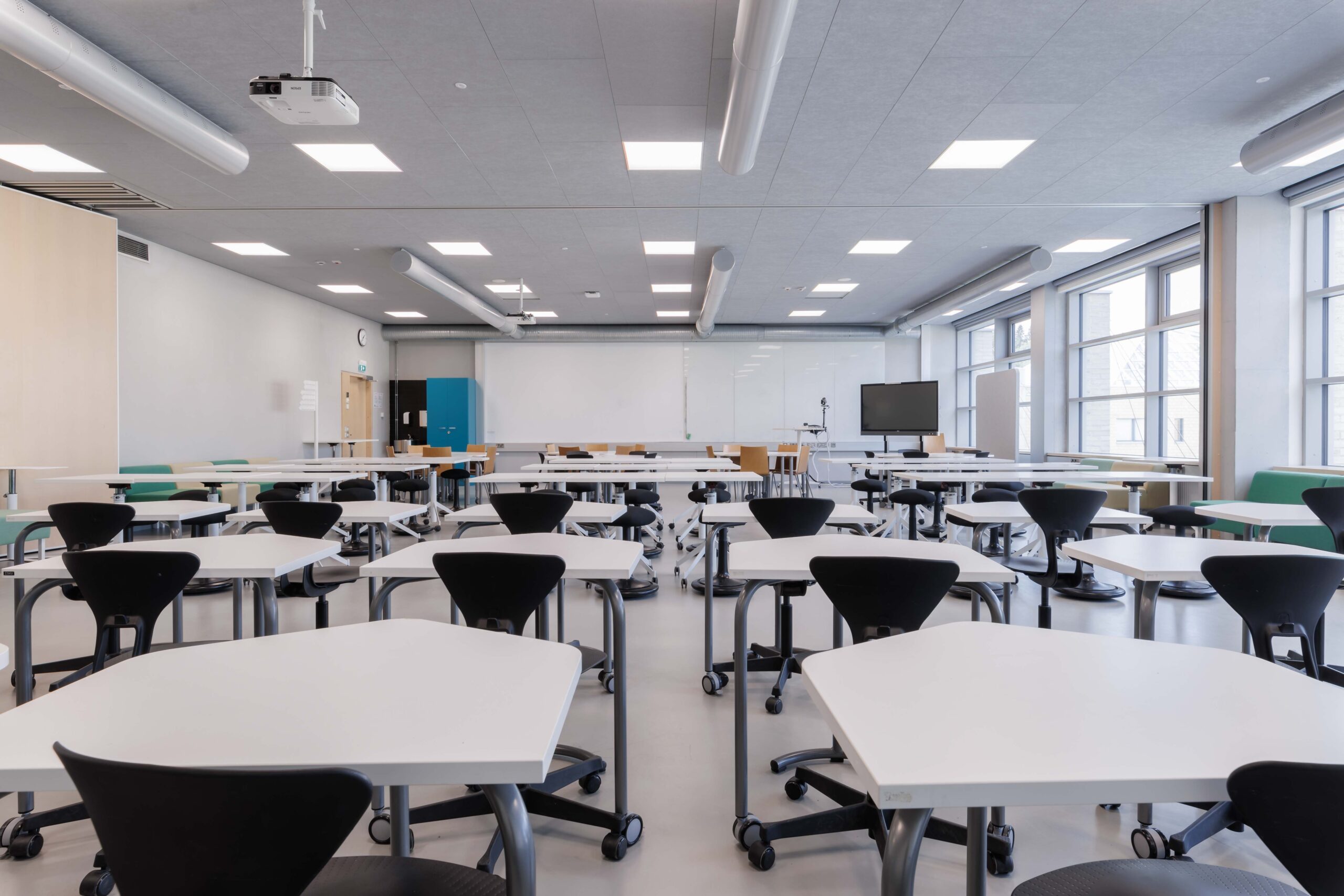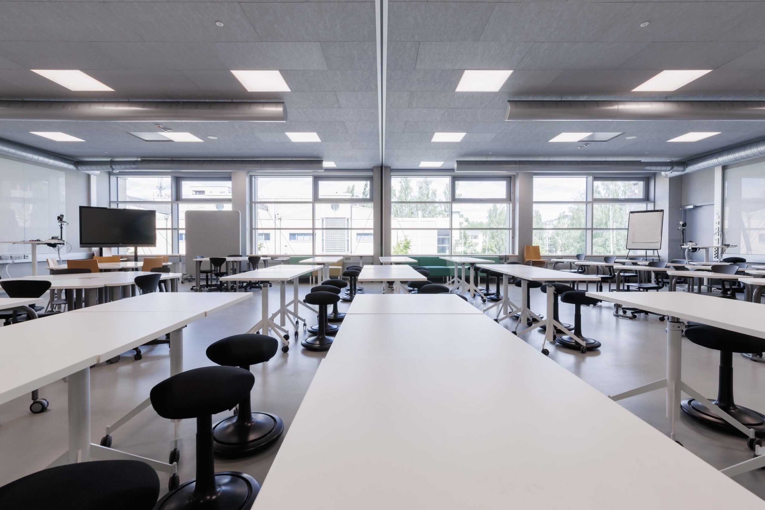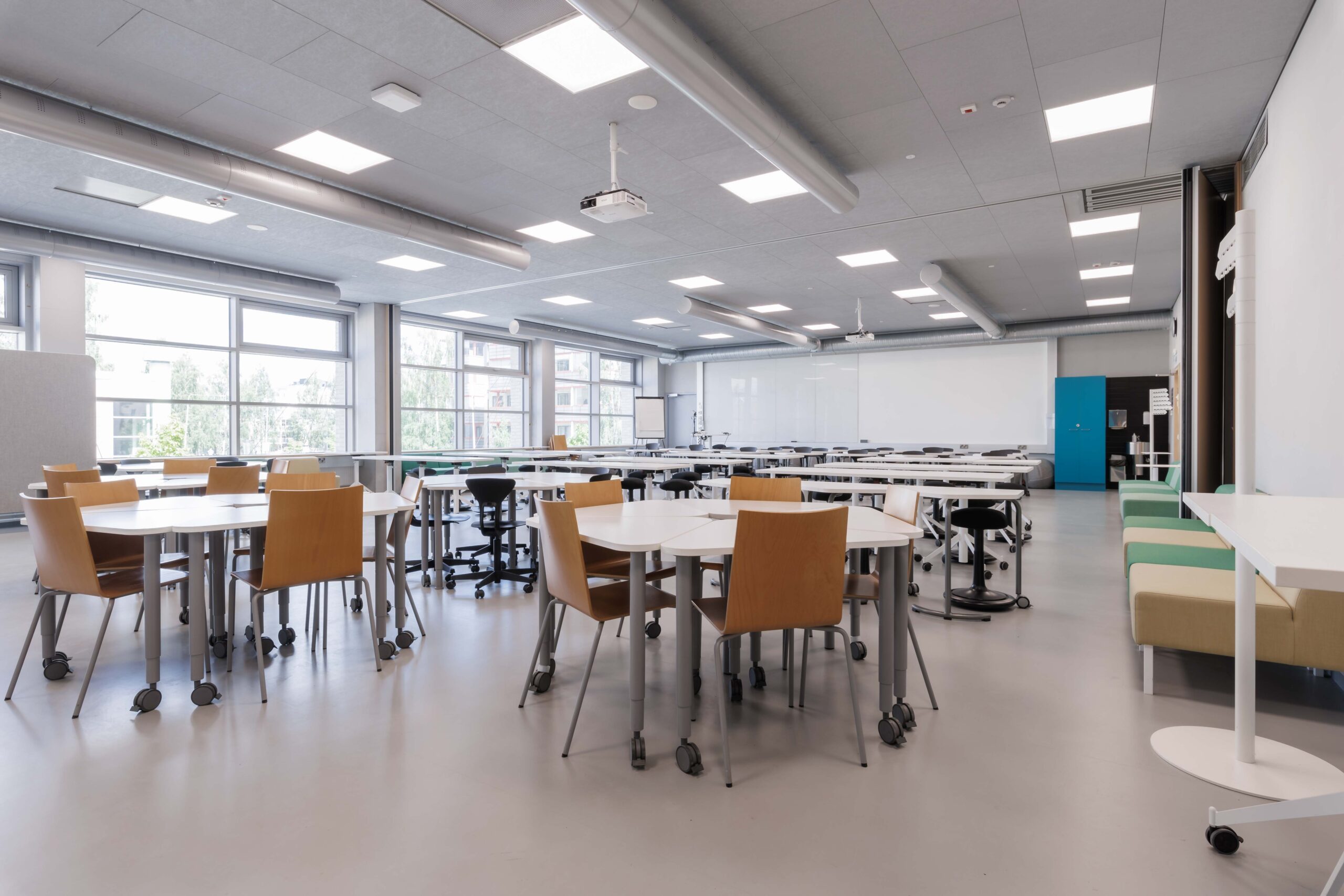 Yhden hengen pöydät tuoleilla. Tilassa etäprojektori sekä interaktiivinen esitysnäyttö.