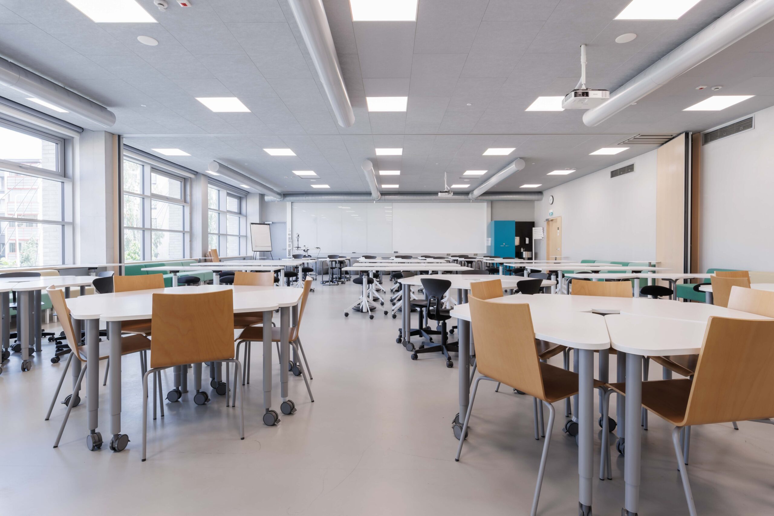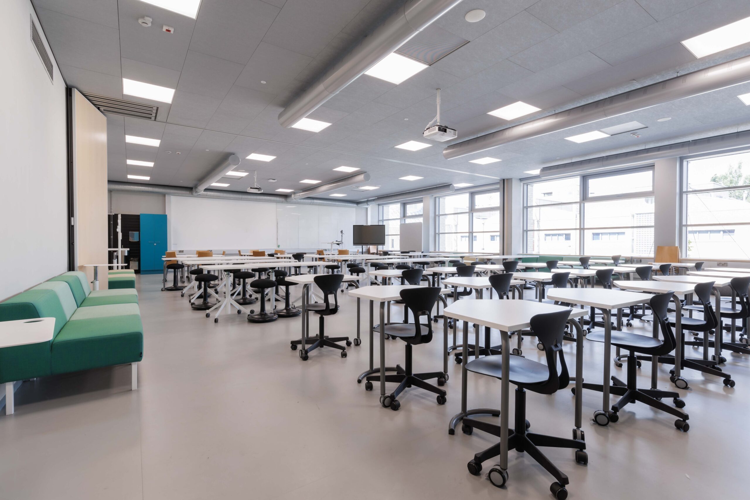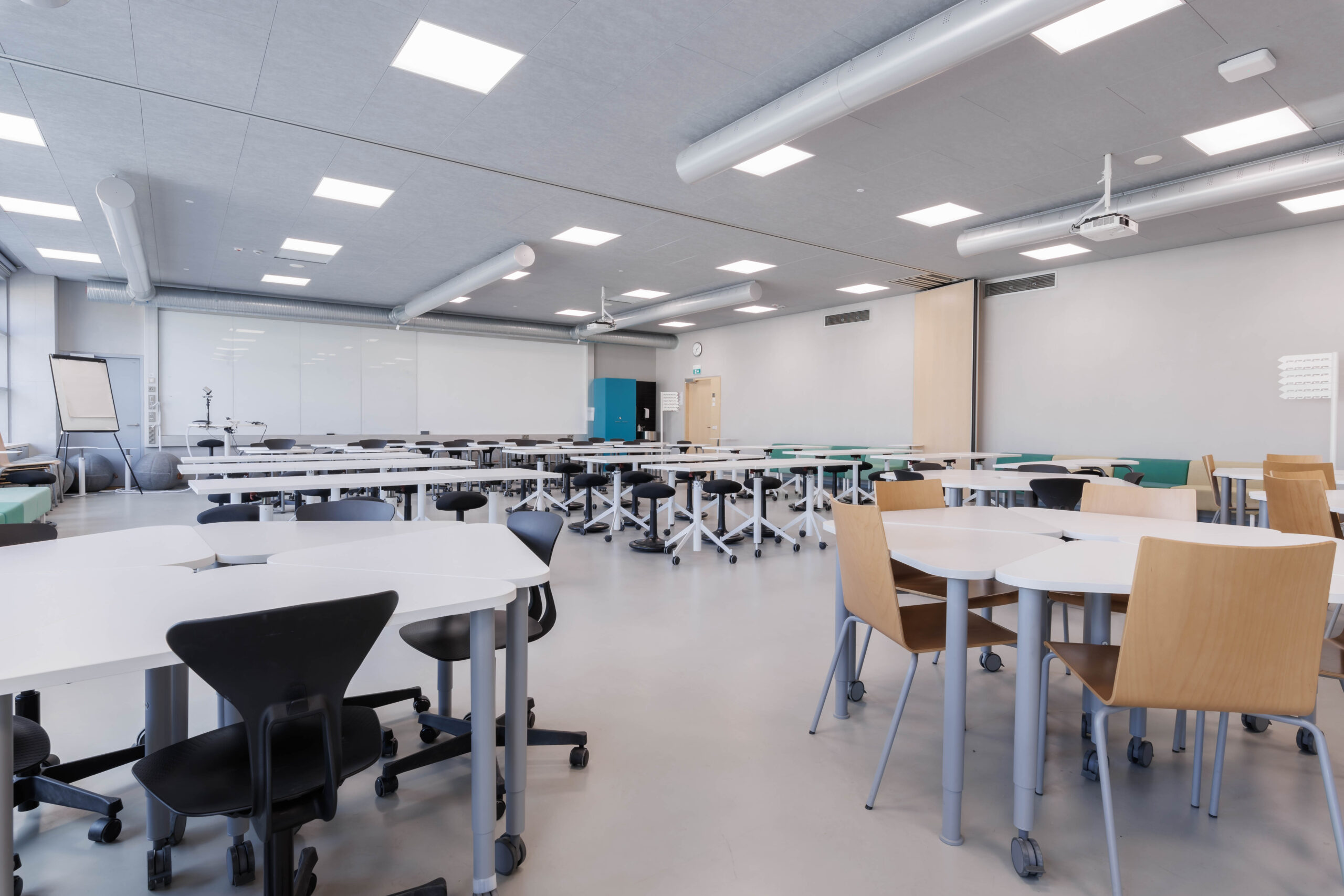 Yhden hengen pöydät tuoleilla. Tilassa etäprojektori sekä interaktiivinen esitysnäyttö.