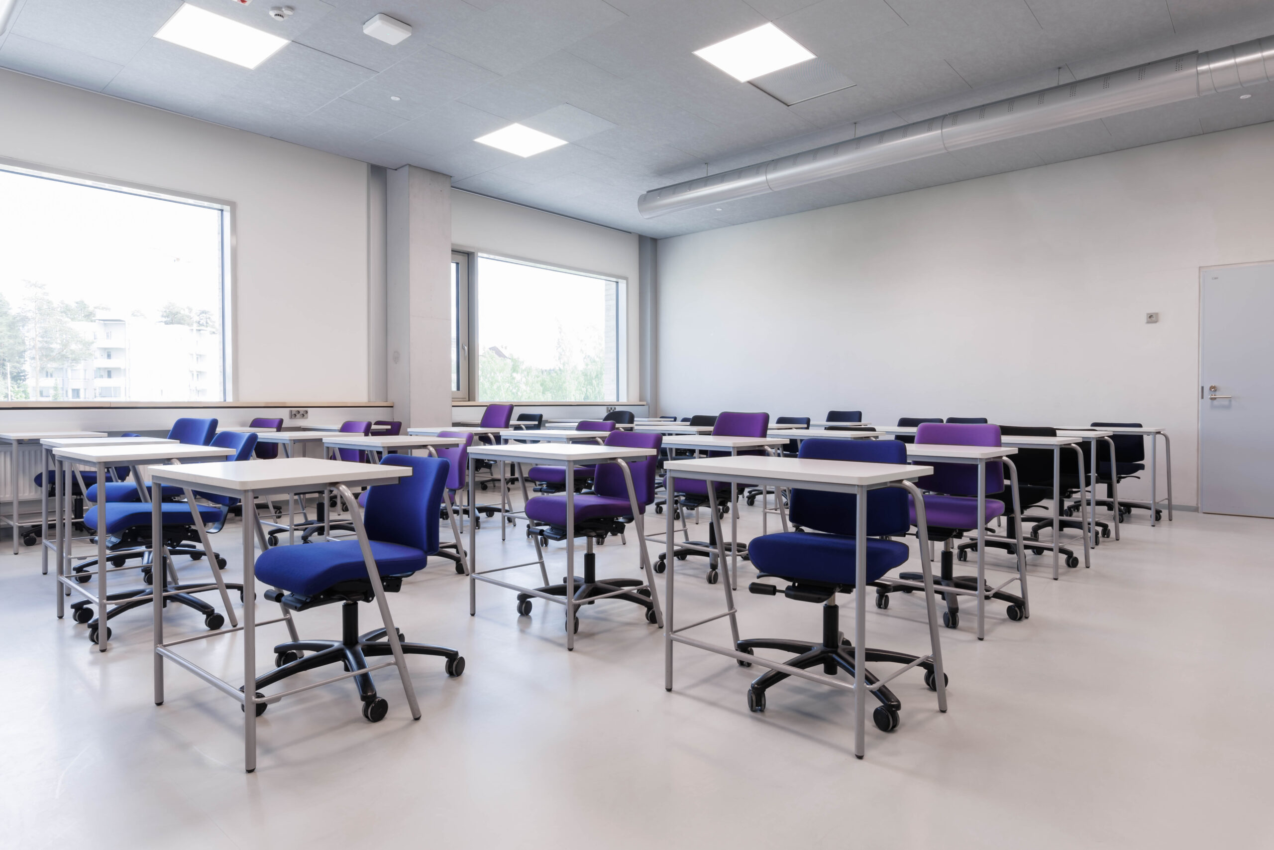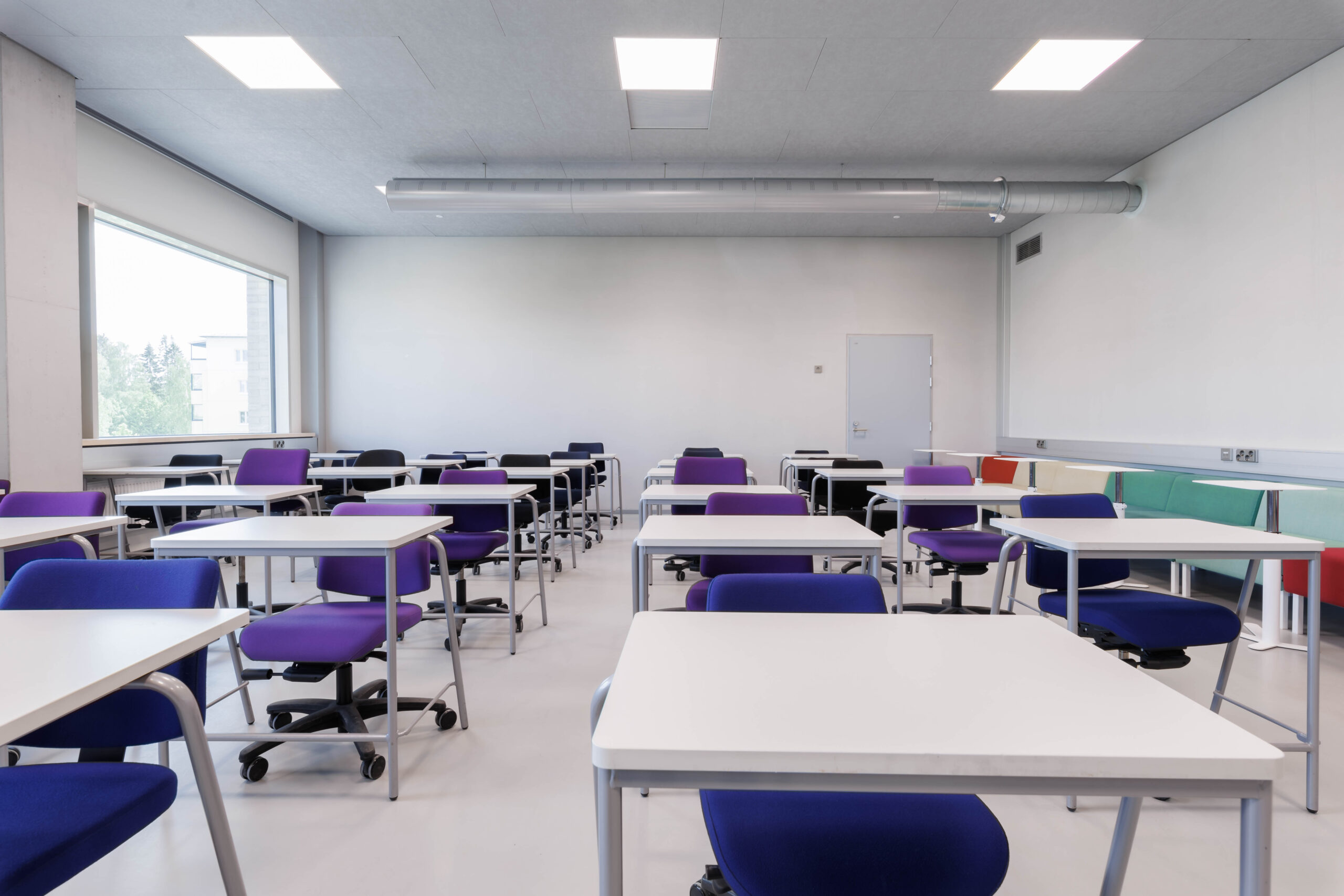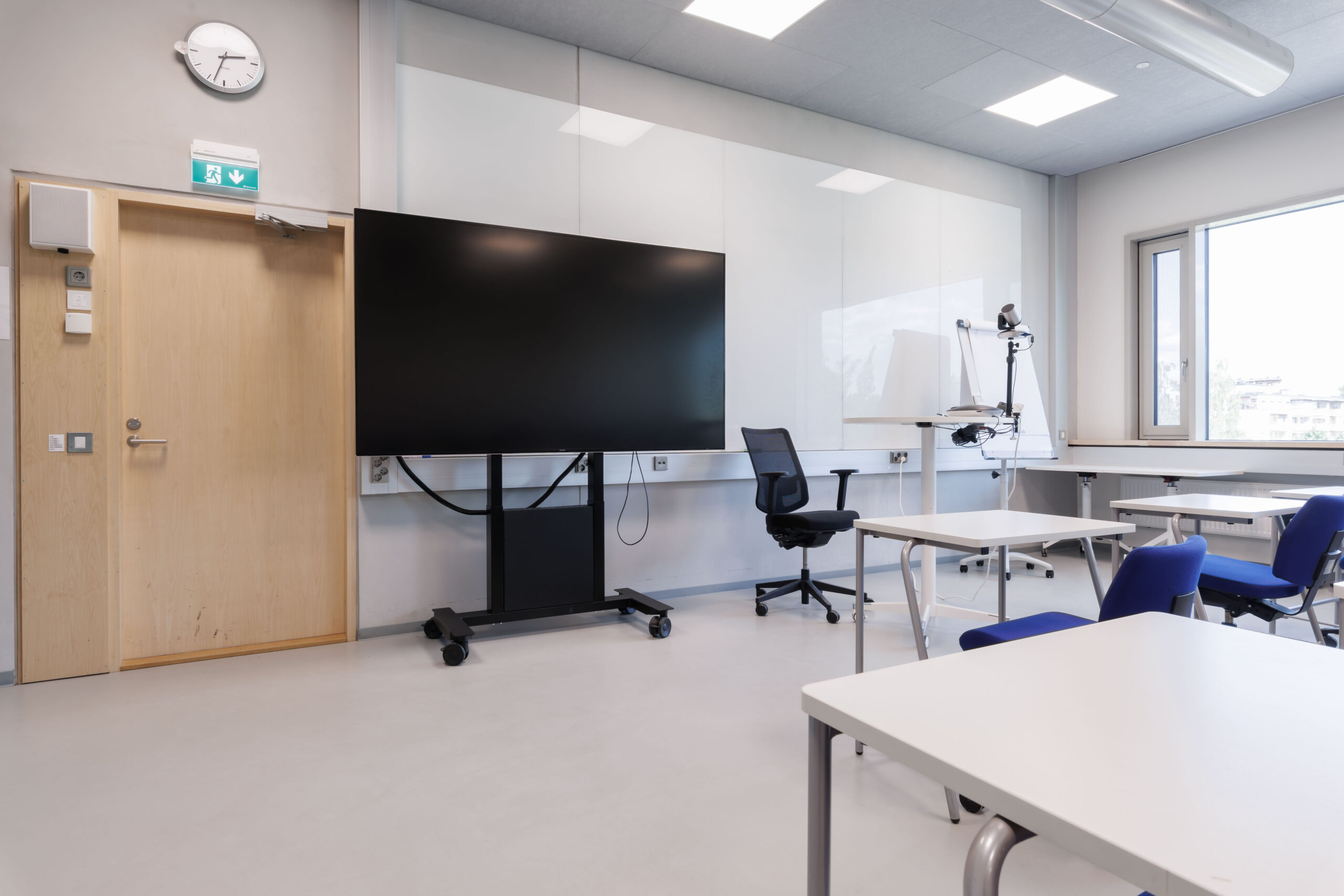 Yhden hengen pöydät tuoleilla. Tilassa esitysnäyttö.