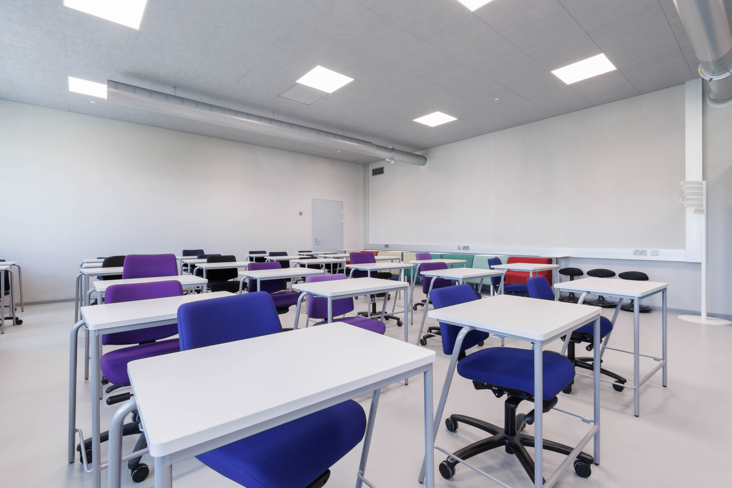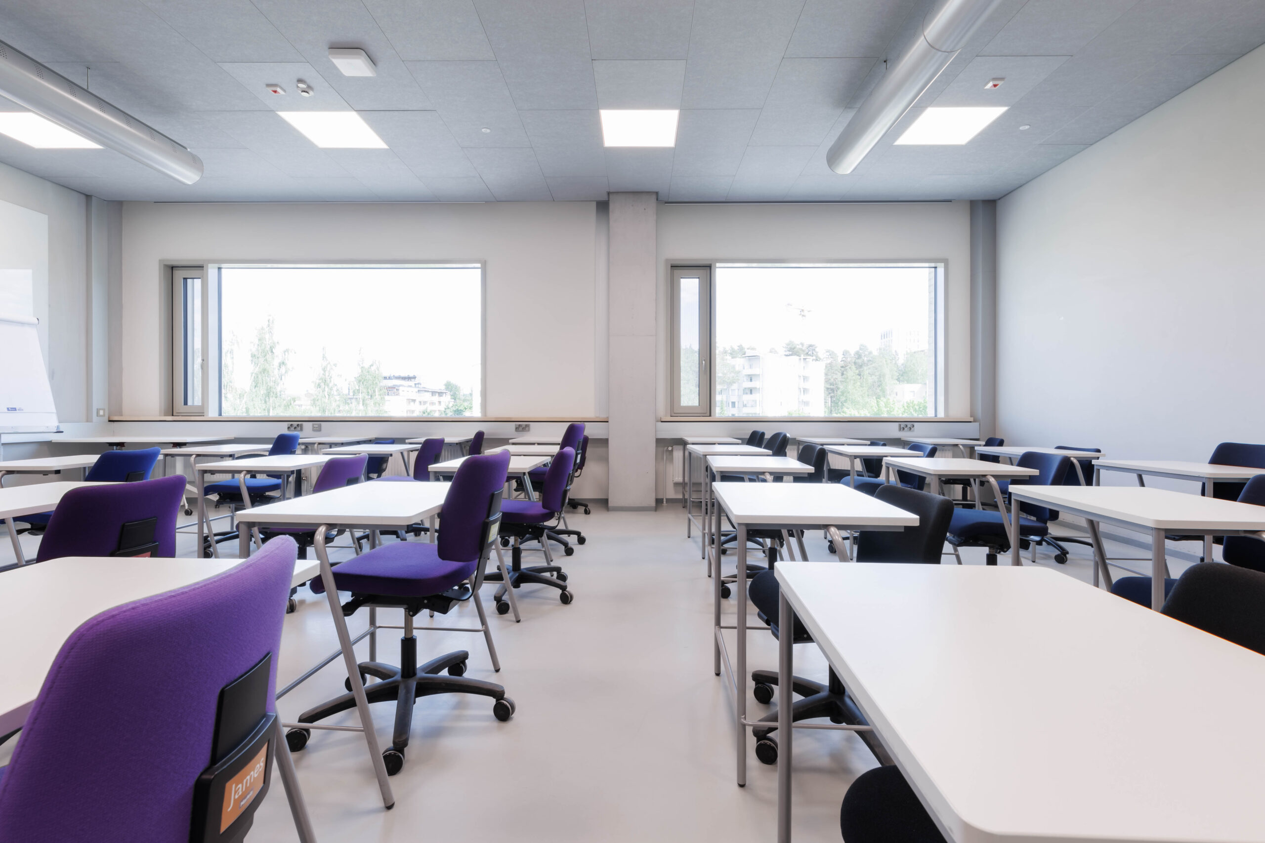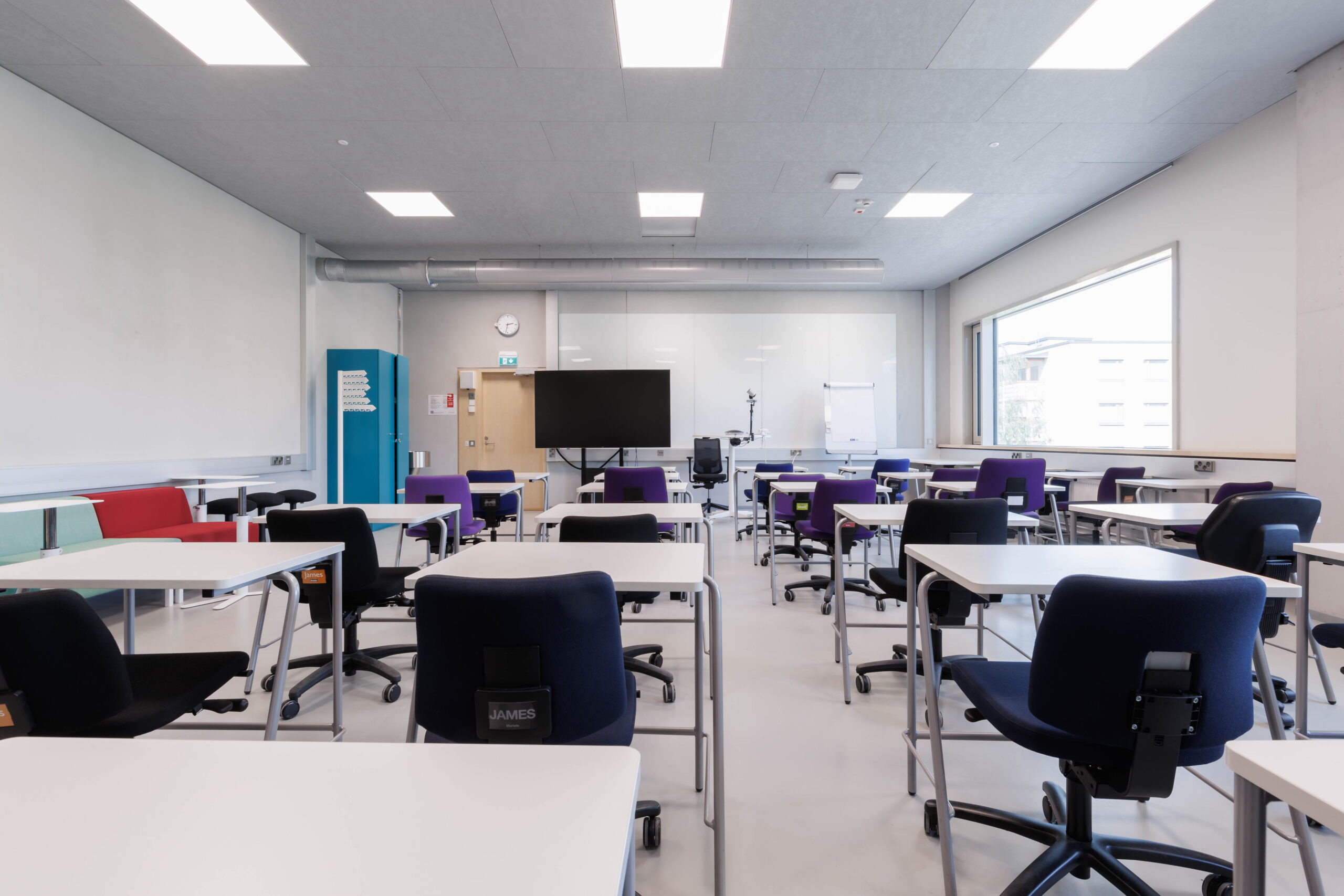 Yhden hengen pöydät tuoleilla. Tilassa esitysnäyttö.