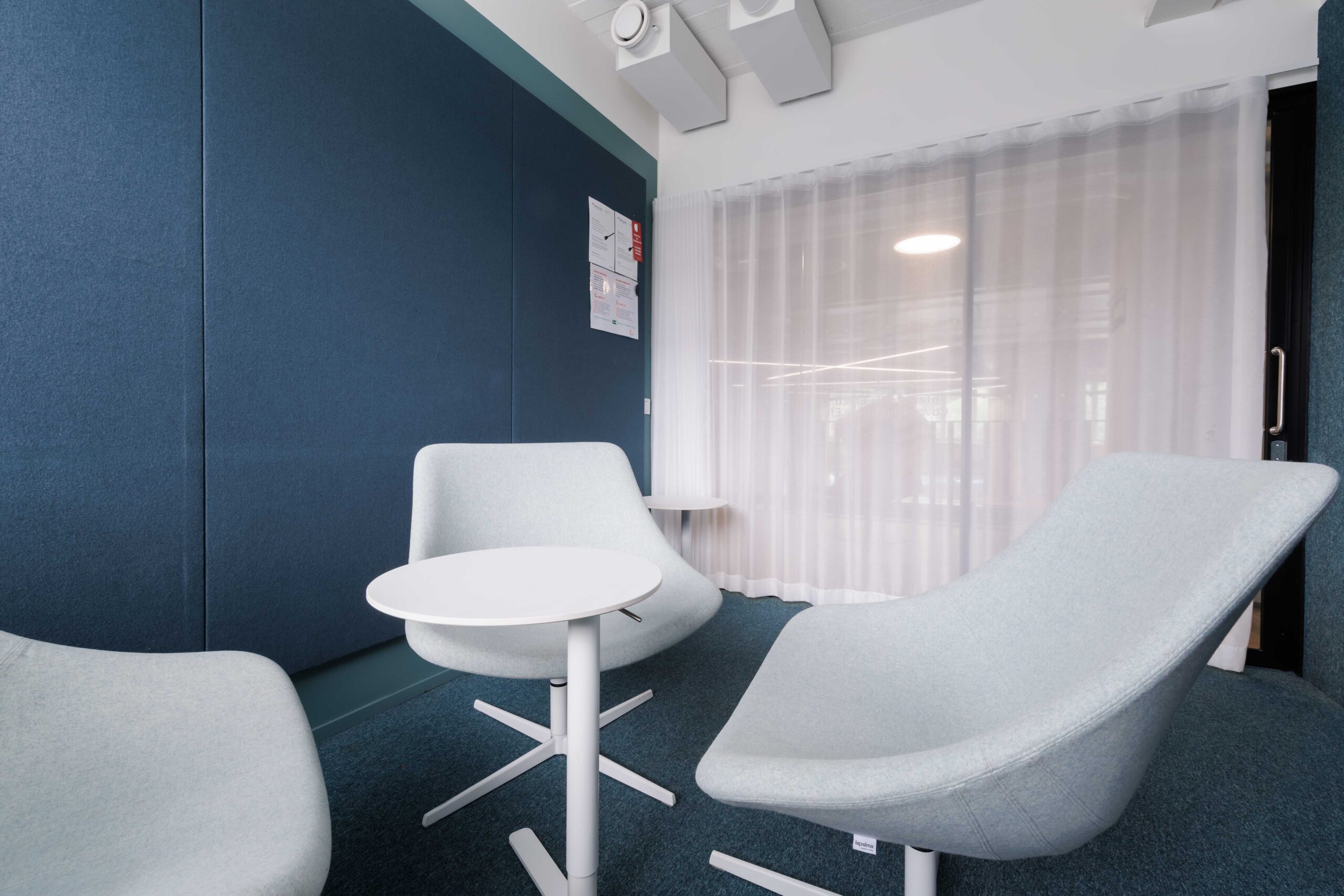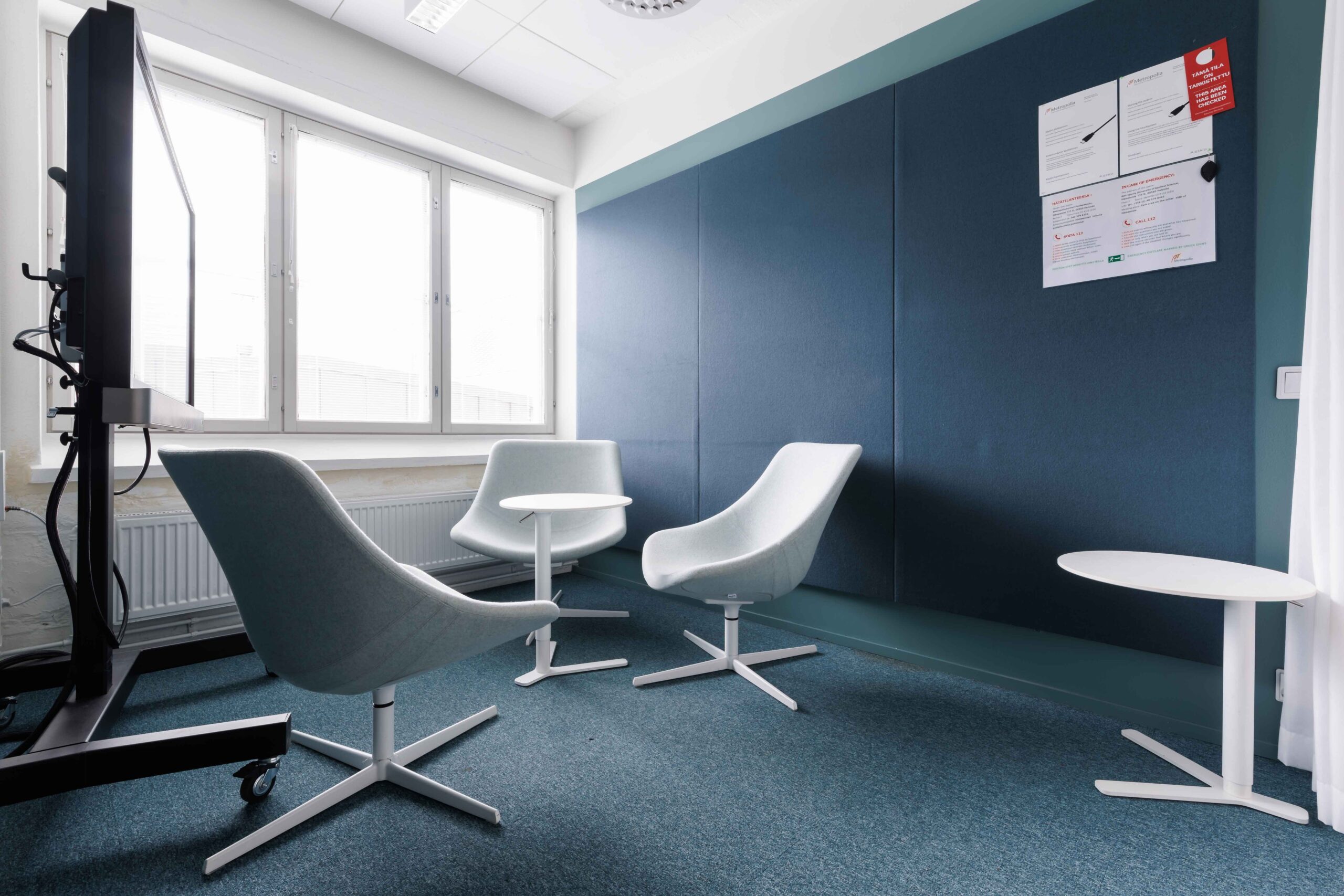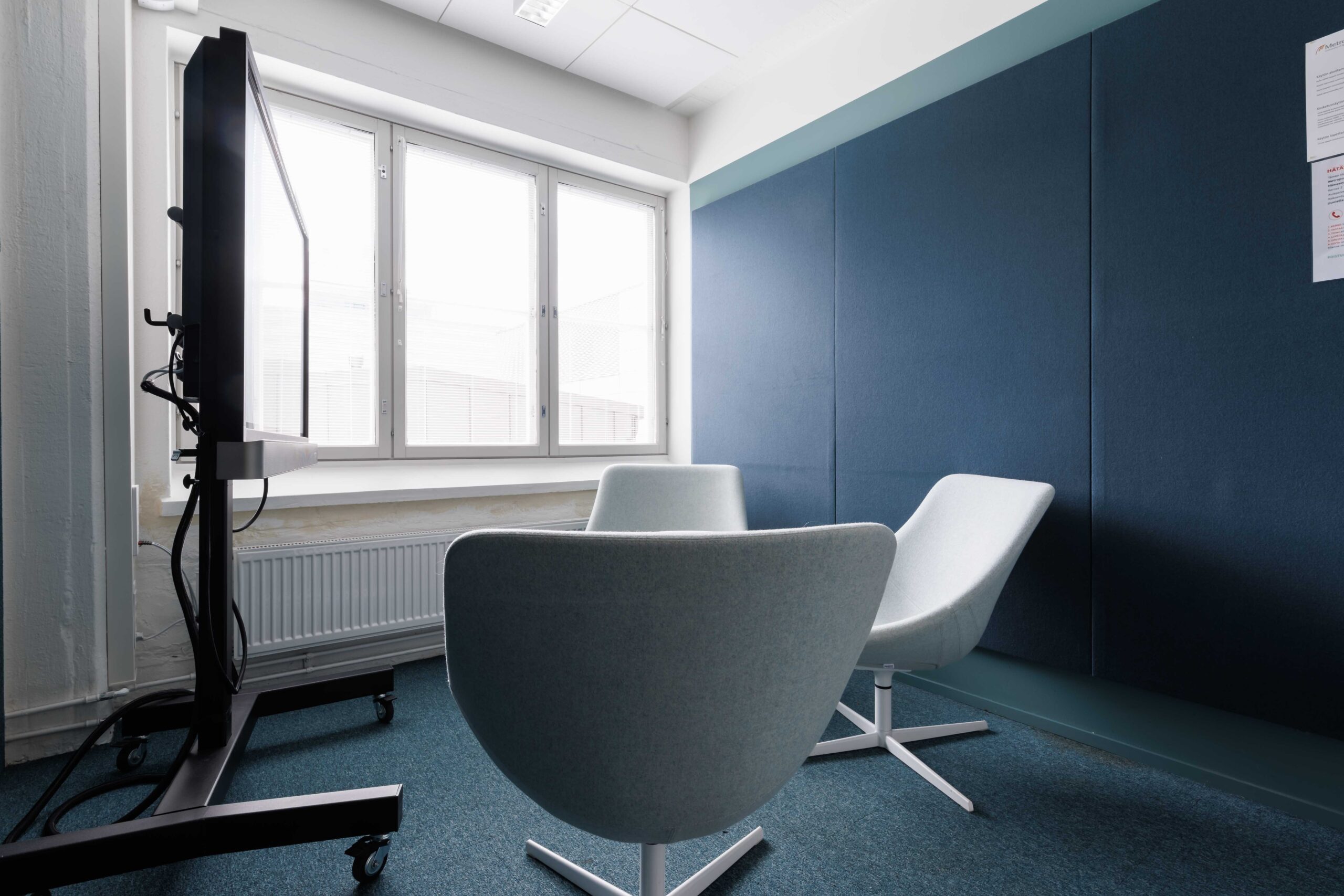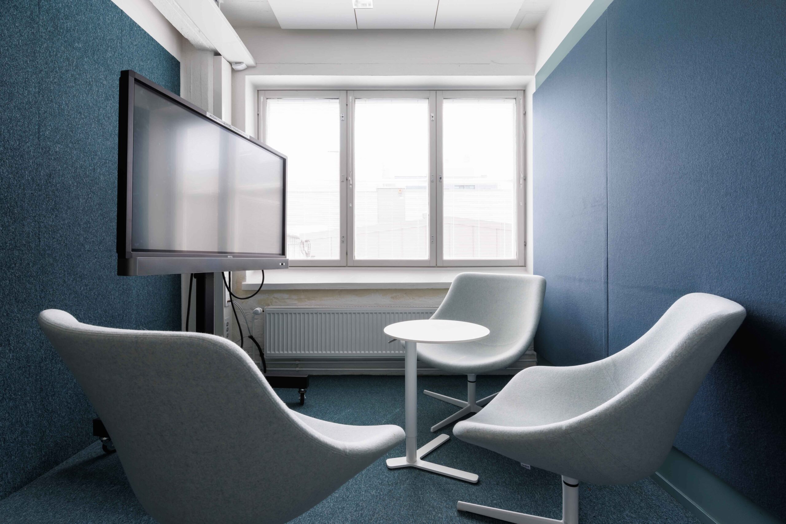 Pieni kokoustila pyöreällä pöydällä ja nojatuoleilla. Tilassa interaktiivinen esitysnäyttö