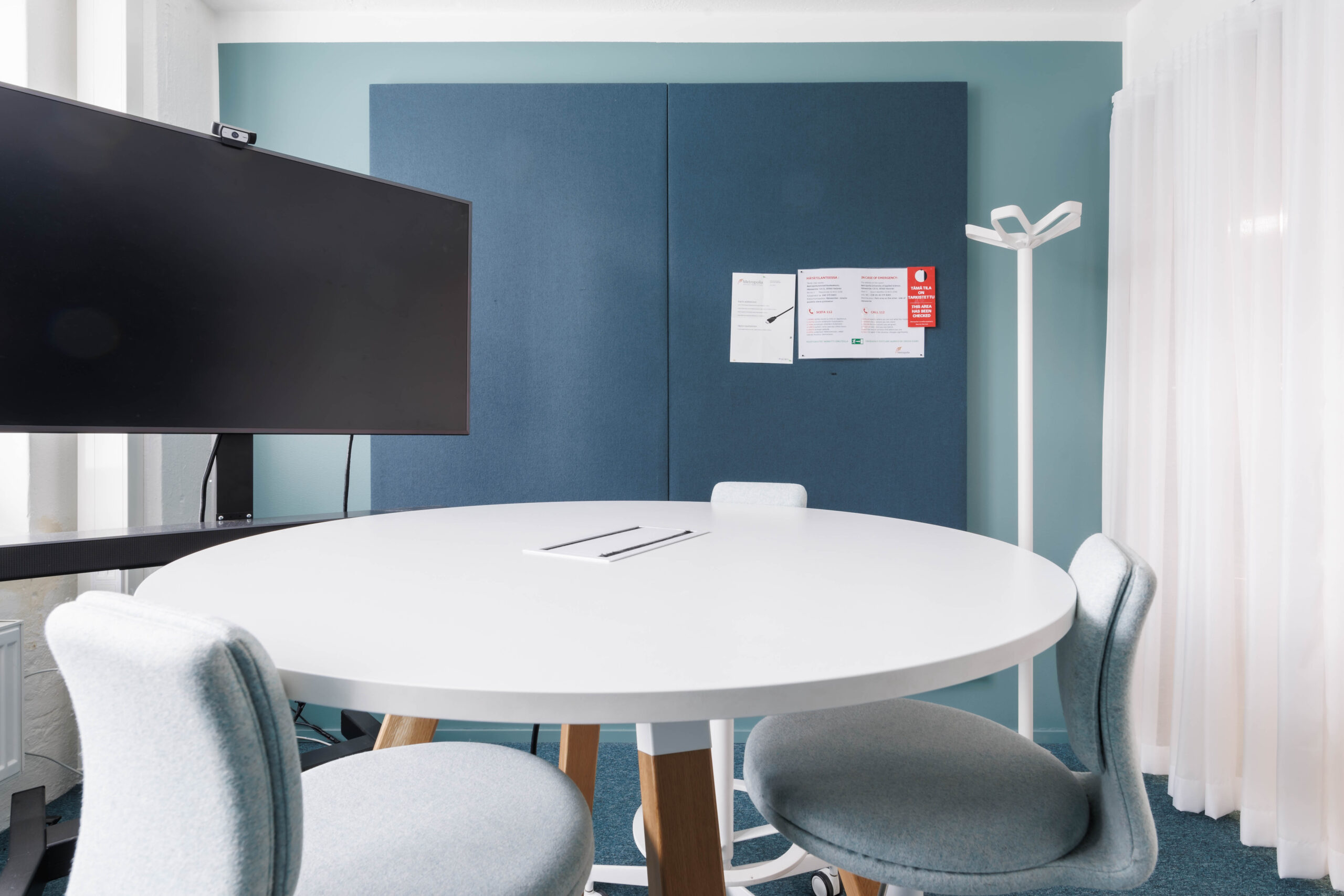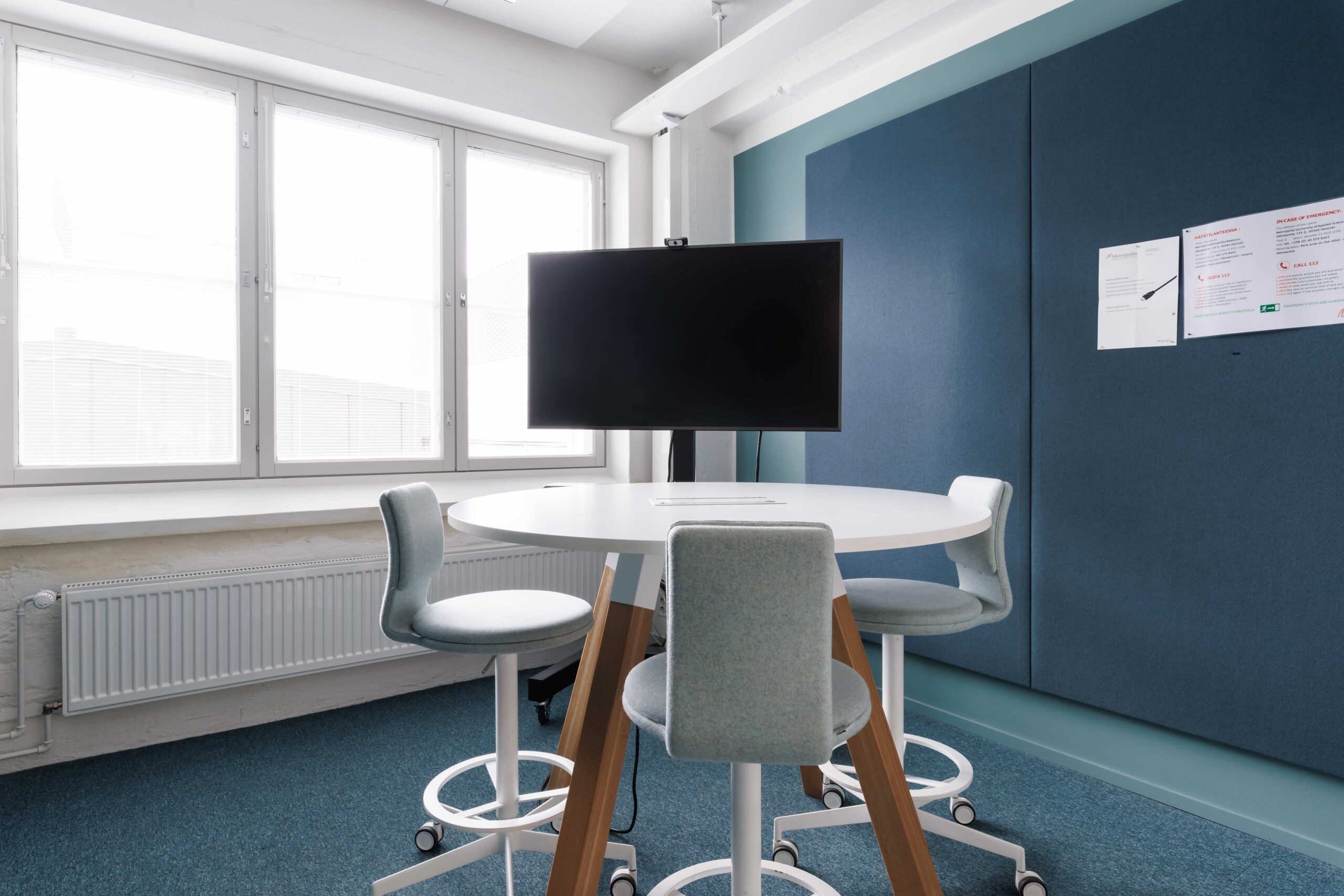 Pieni kokoustila, korkealla pöydällä ja tuoleilla. Tilassa esitysnäyttö