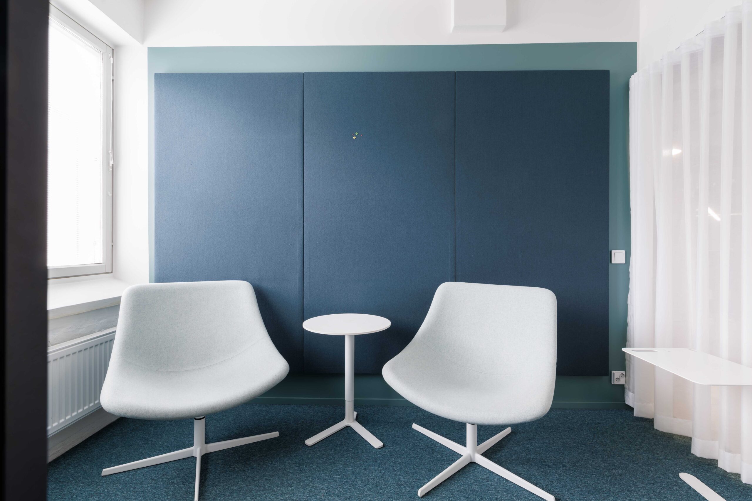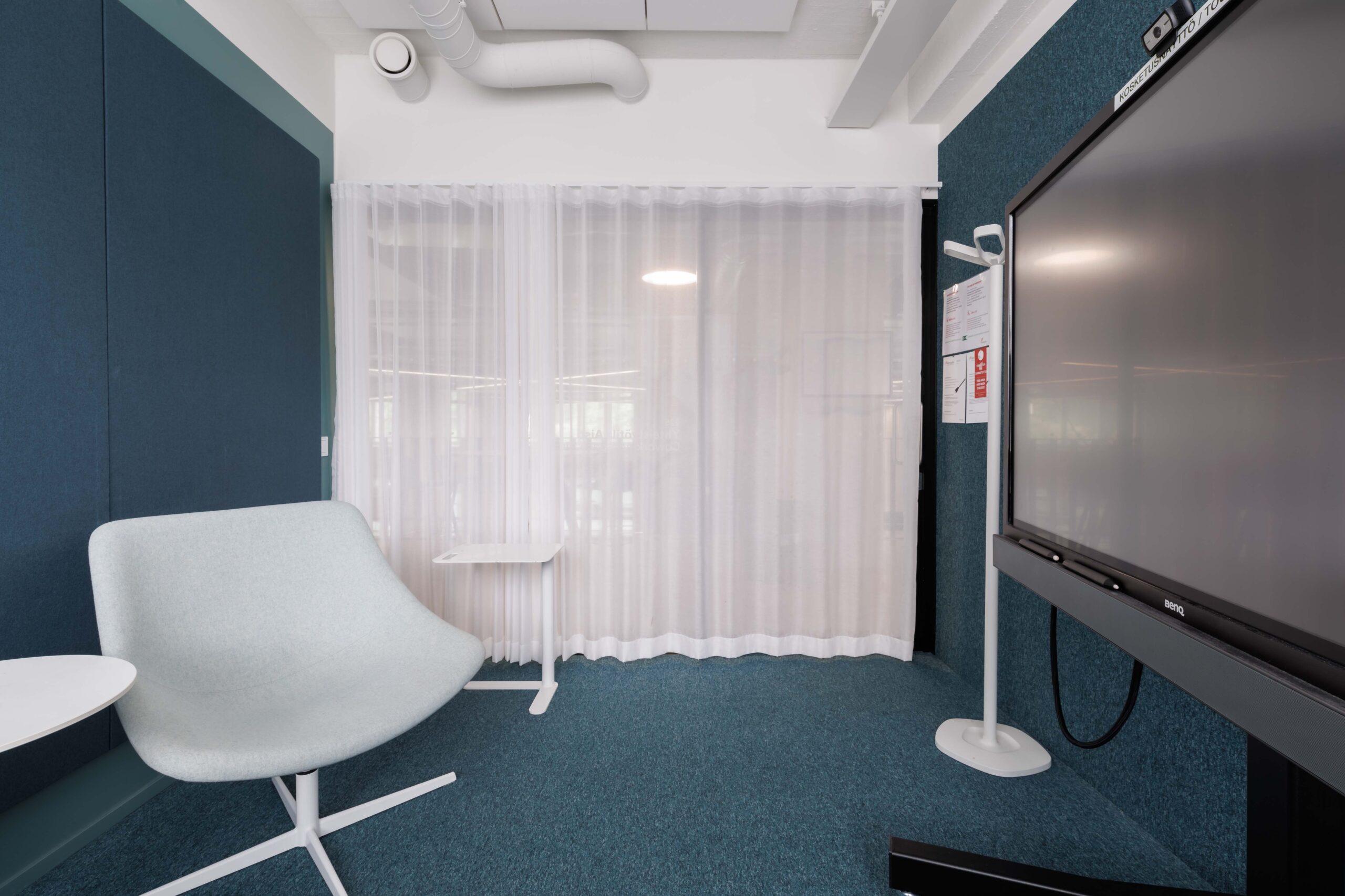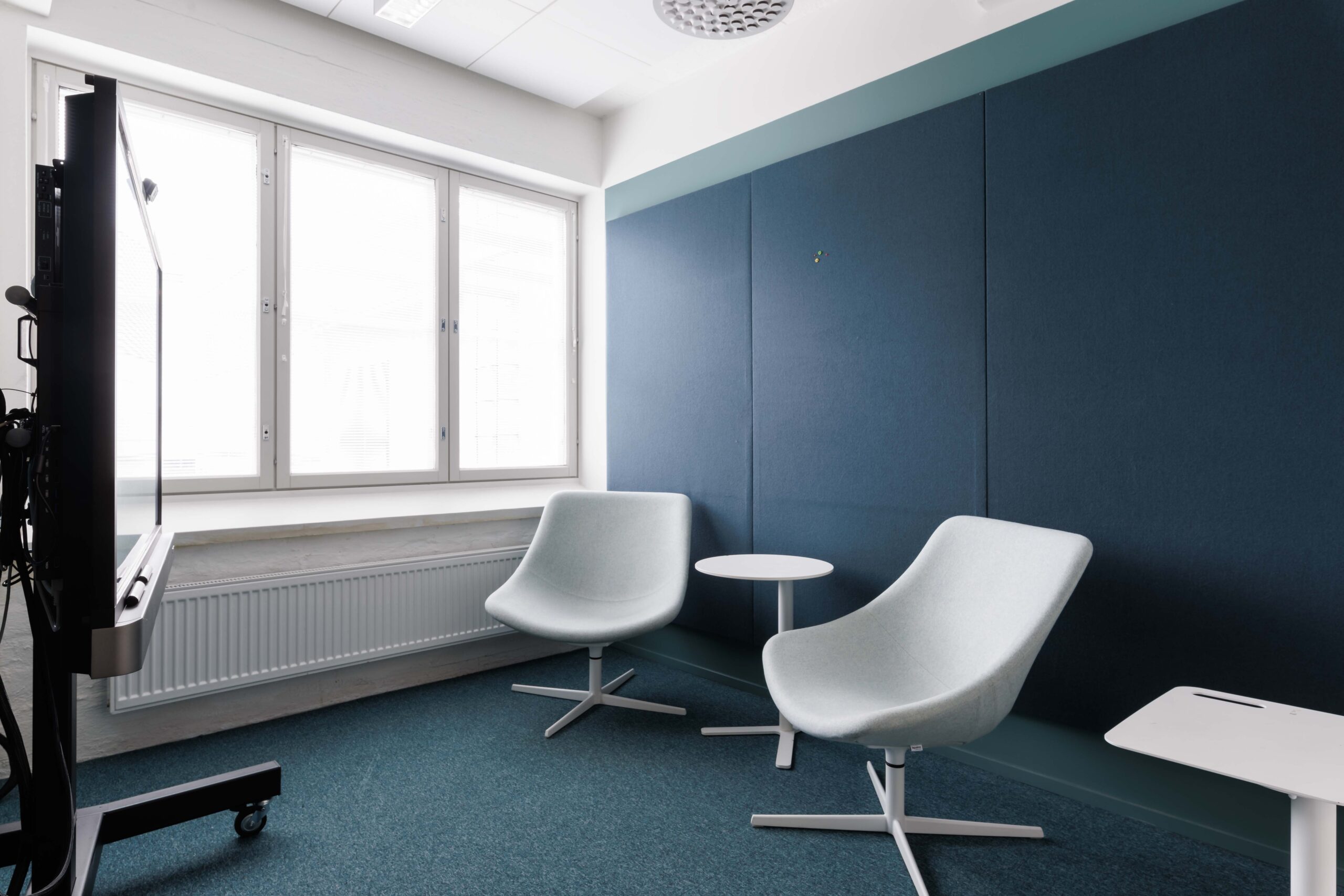 Pieni kokoustila sivupöydällä pöydällä ja nojatuoleilla. Tilassa interaktiivinen esitysnäyttö