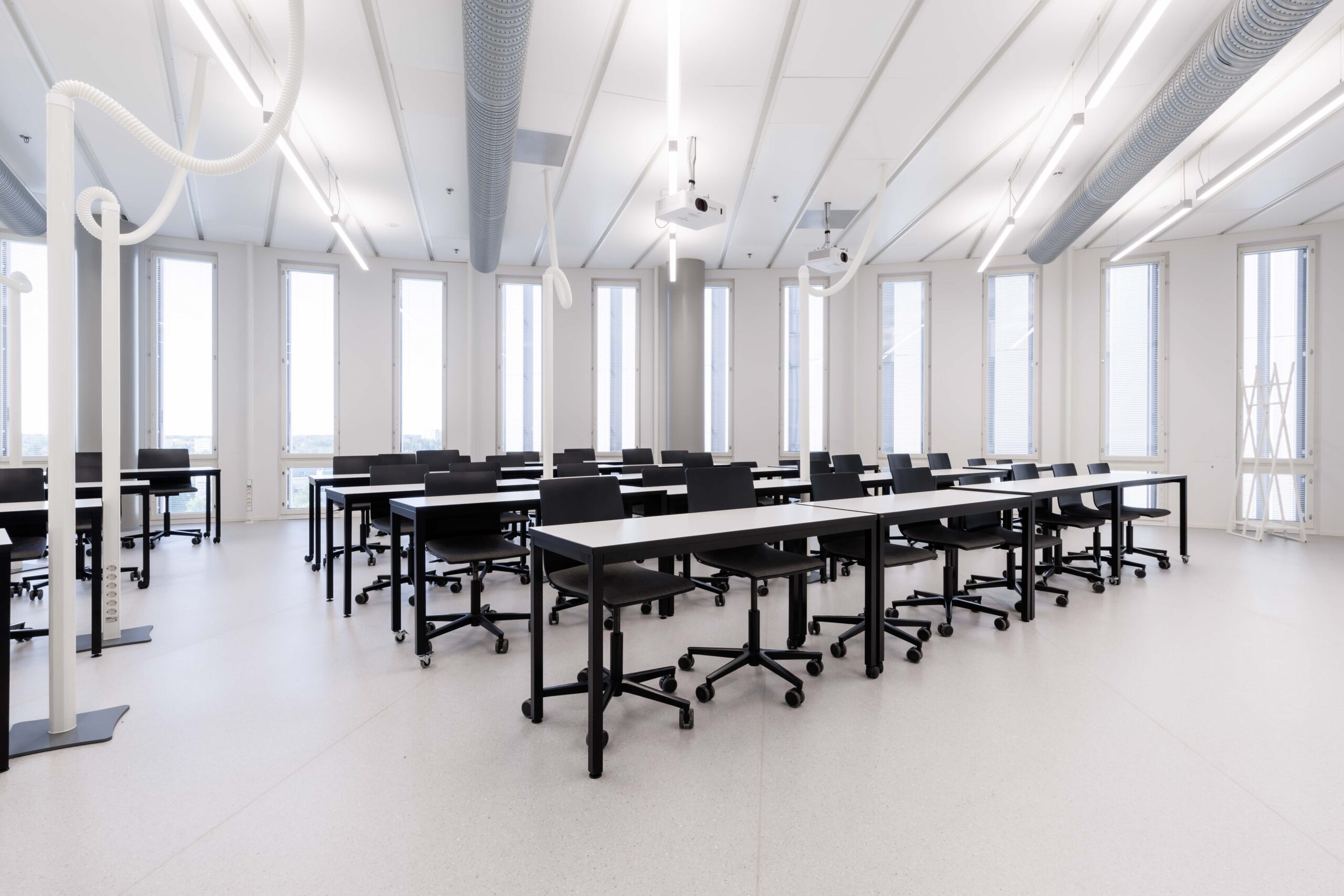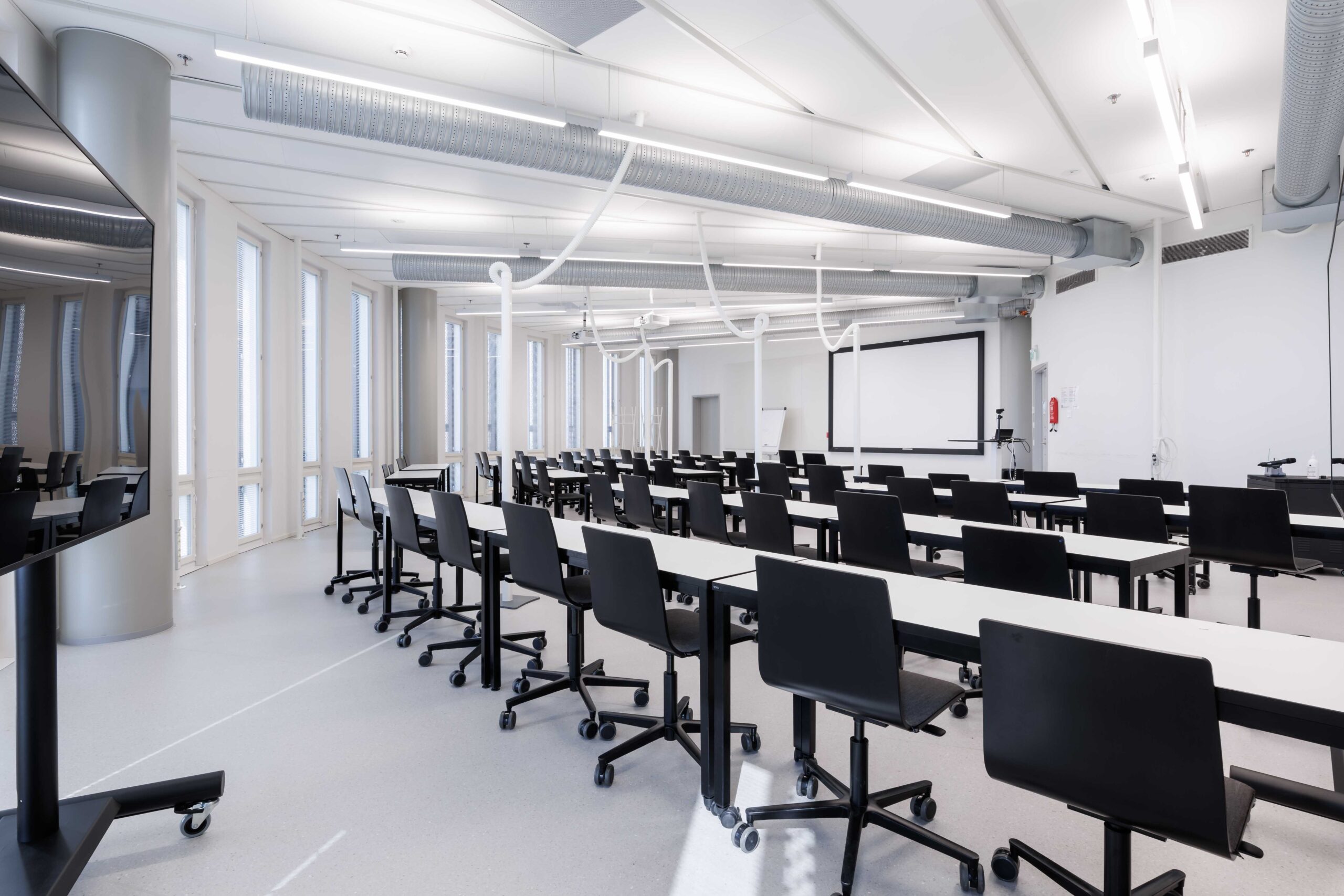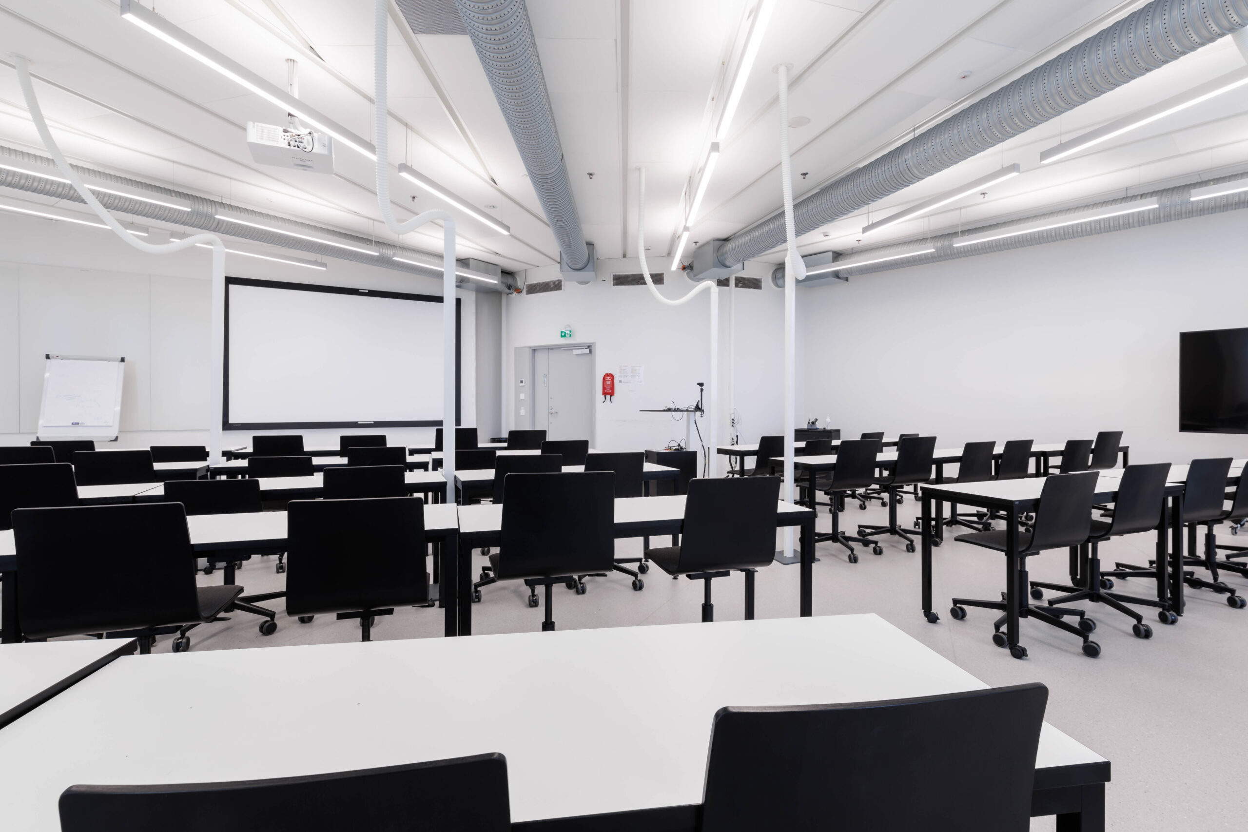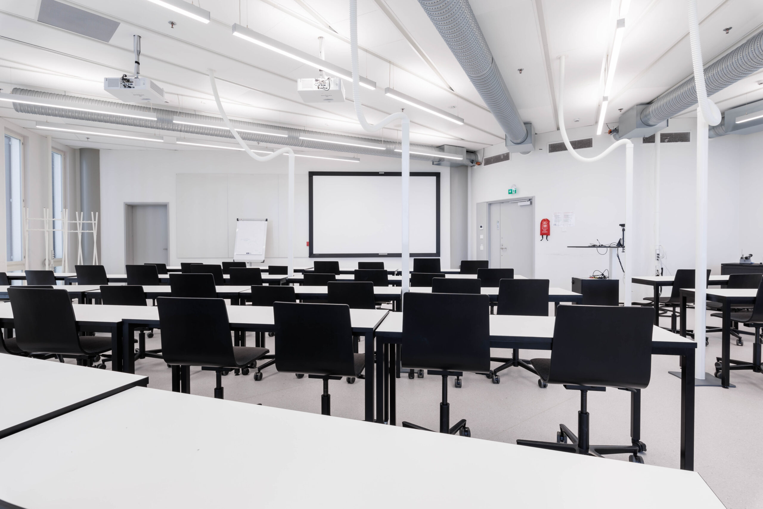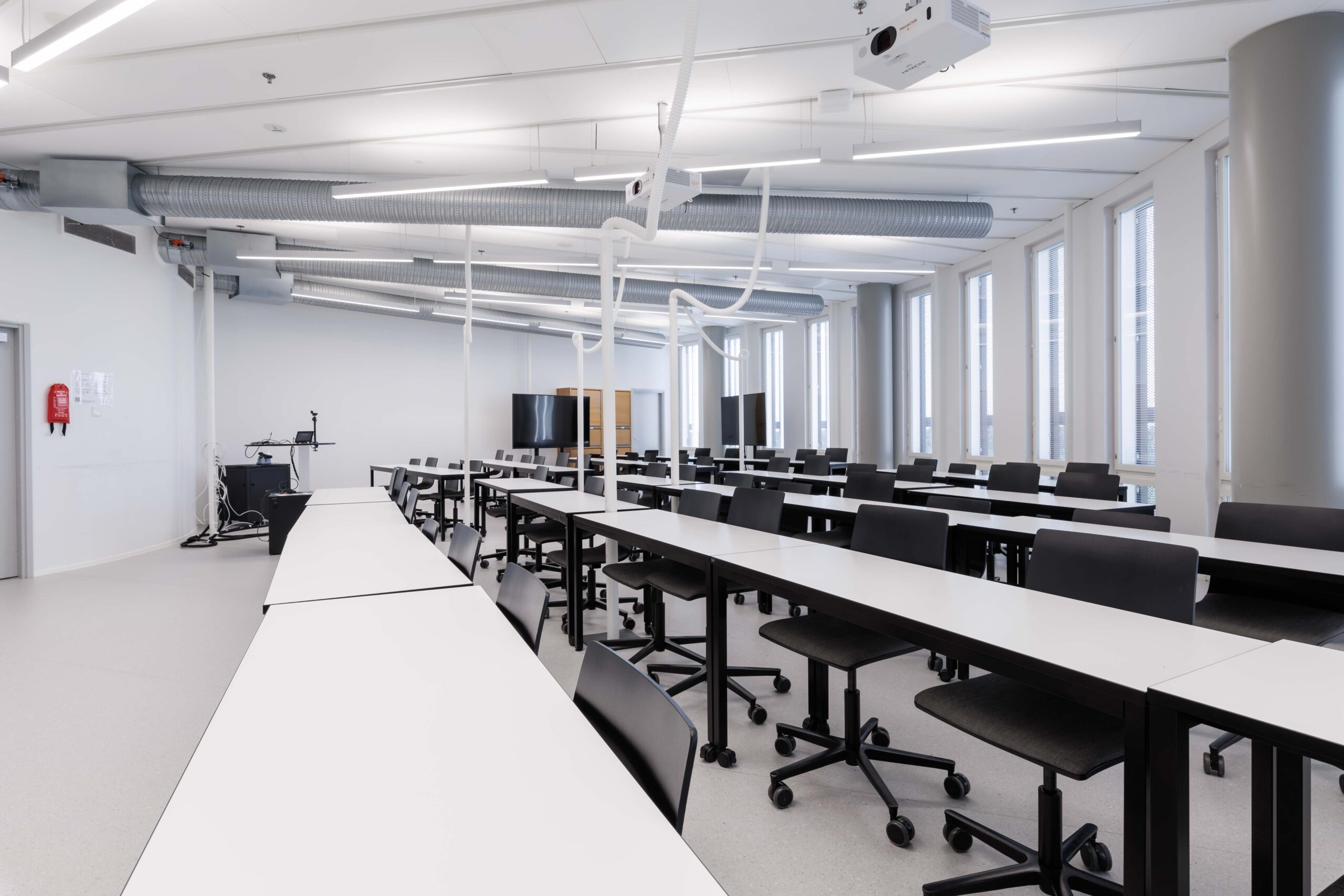 Kahden hengen pöydät tuoleilla. Tilassa etäprojektori.