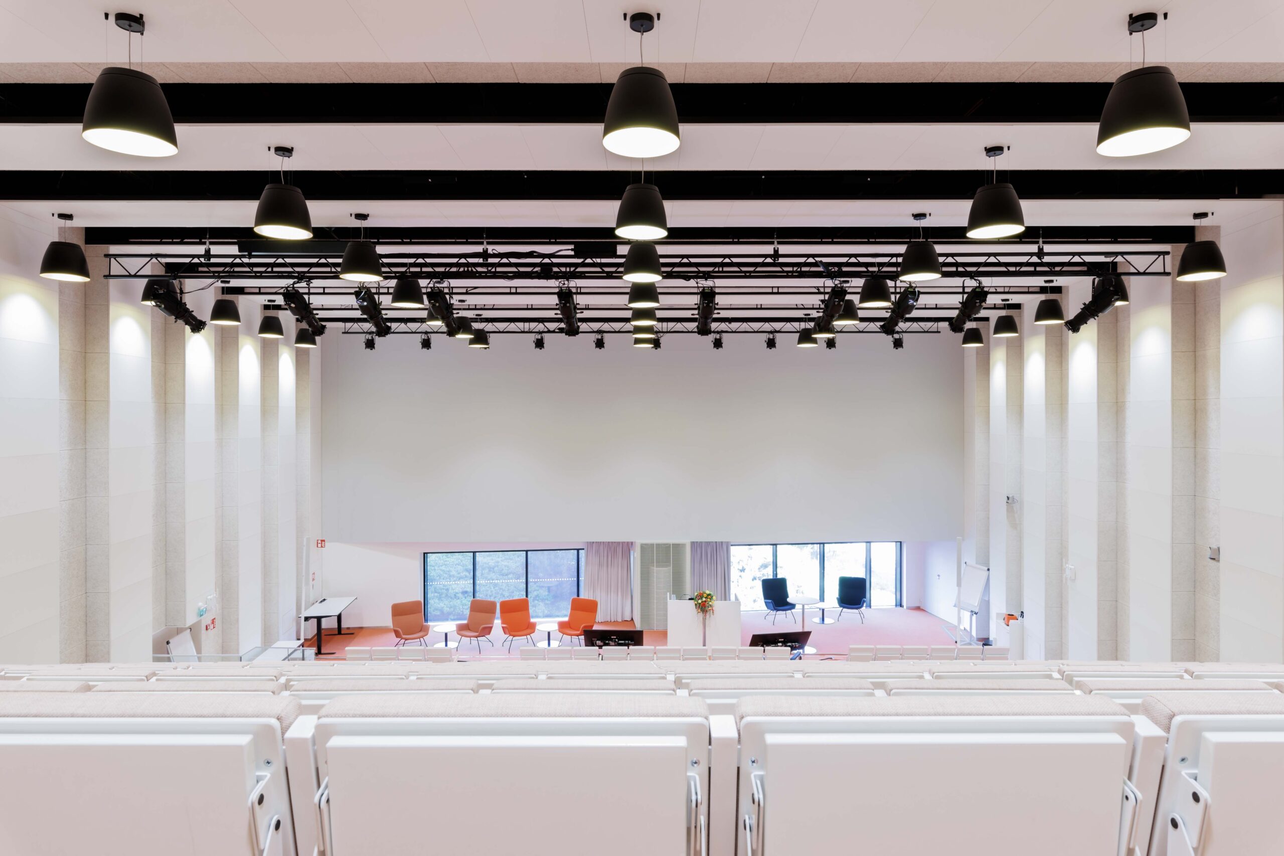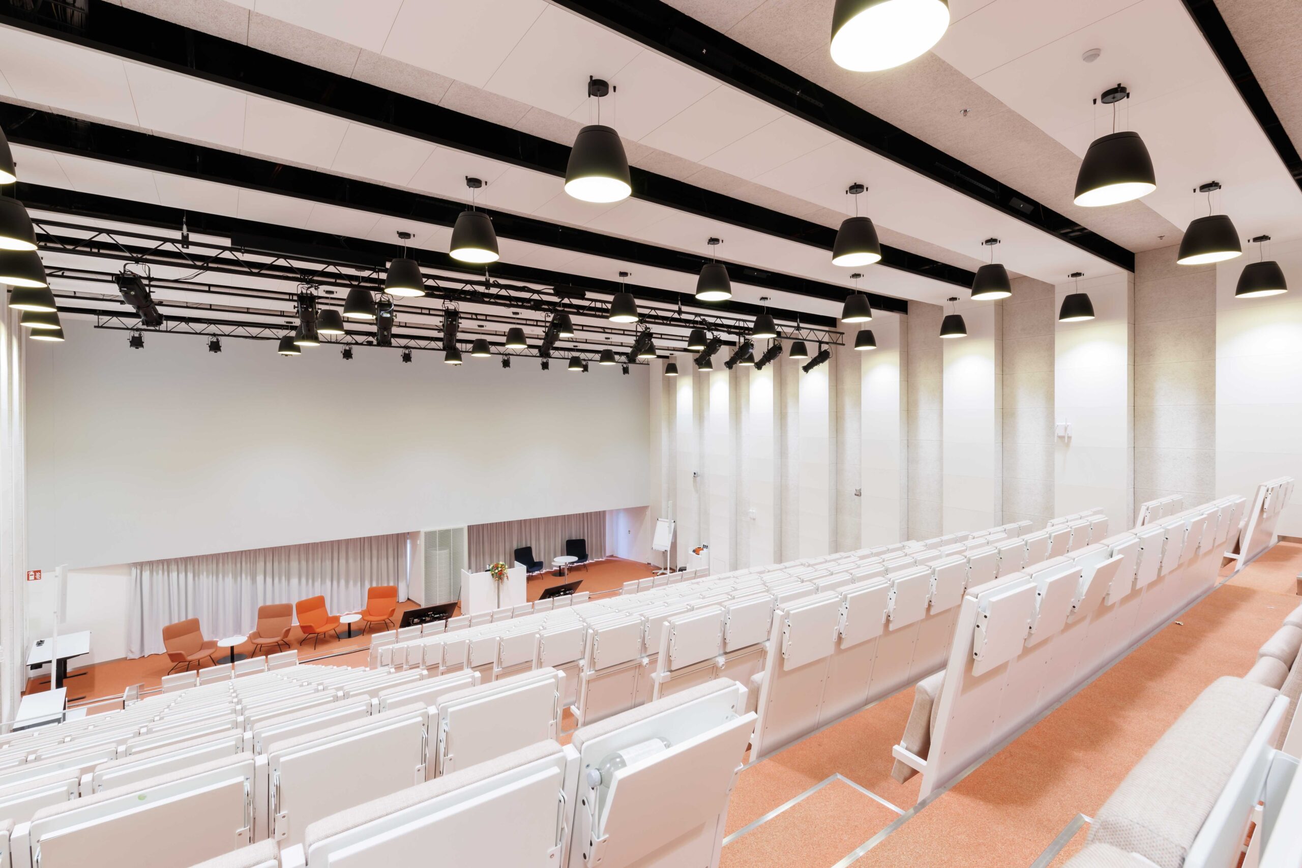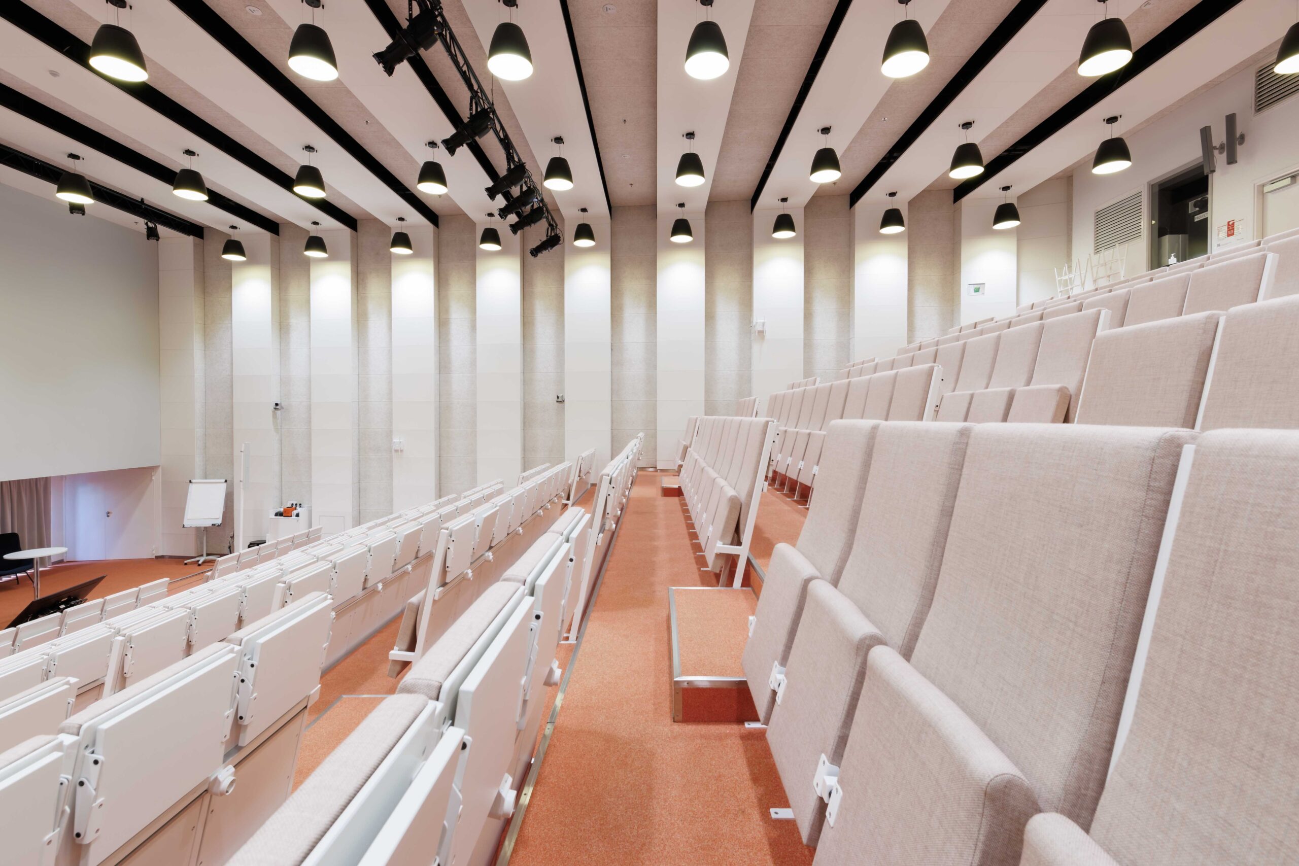 Moderni auditoriotila kahdella korkealaatuisella etäprojektorilla ja äänentoistolla. Tuolirivit on varustettu kirjoitustasoilla ja pistorasioilla. Auditorion ylätasolla on istumapaikkojen lisäksi 10 paikkaa.
