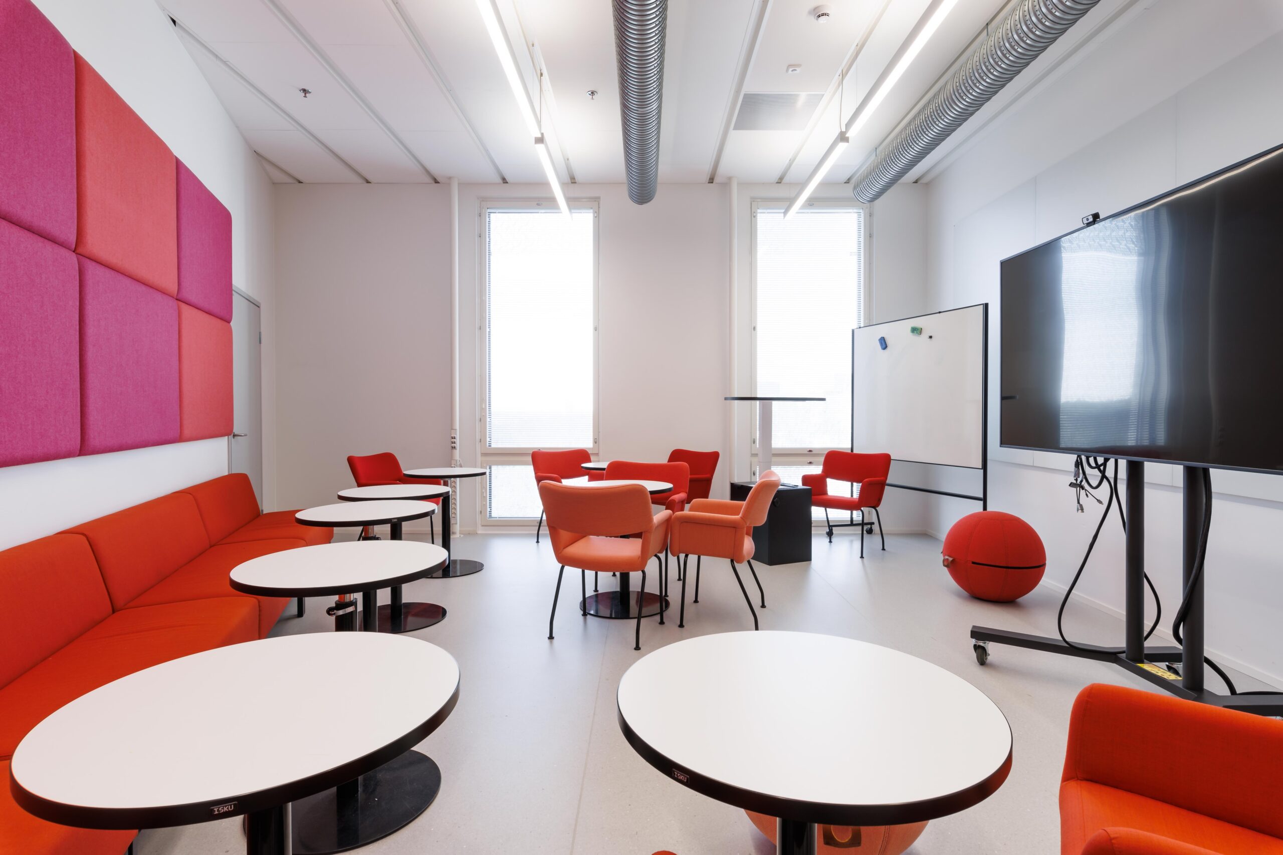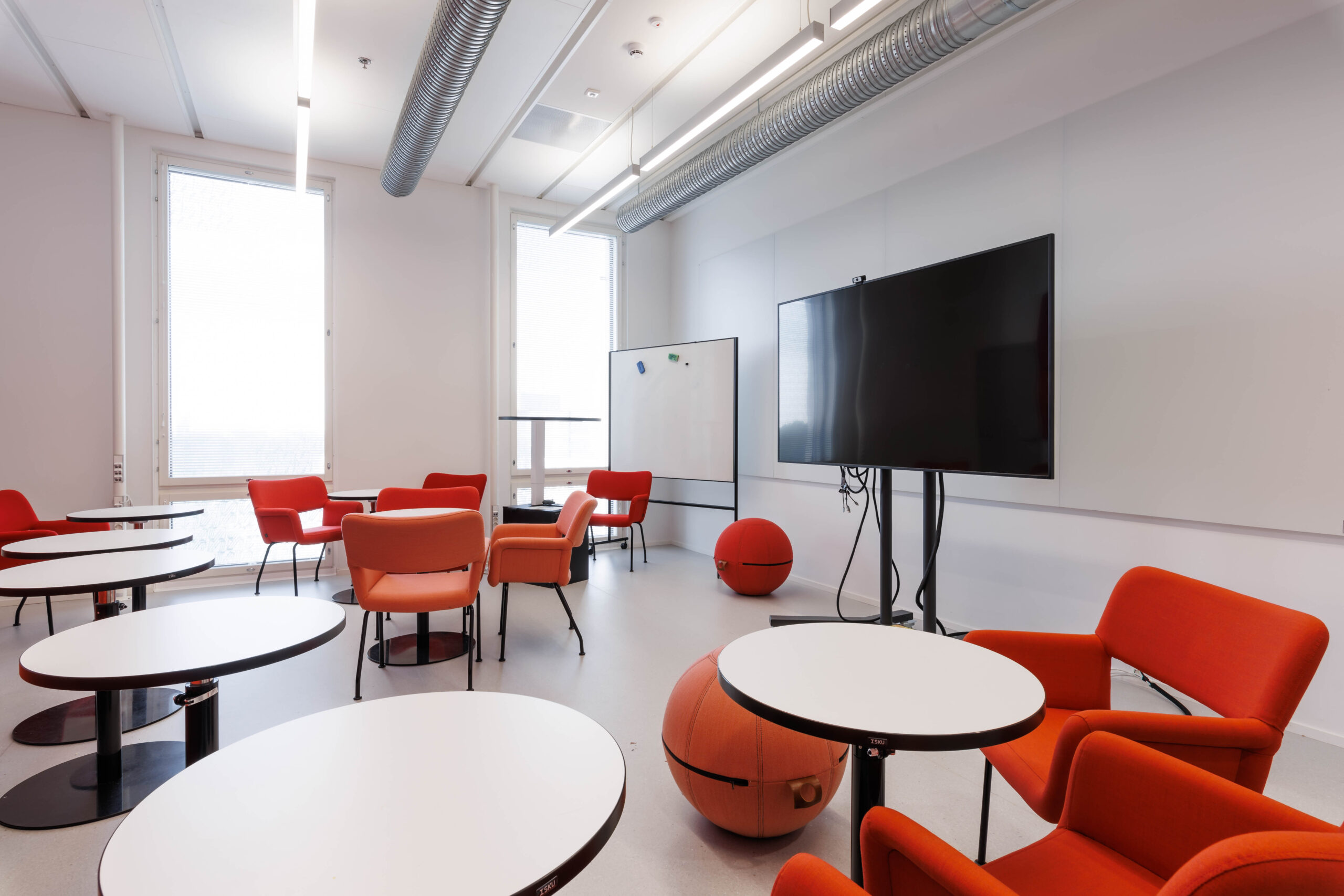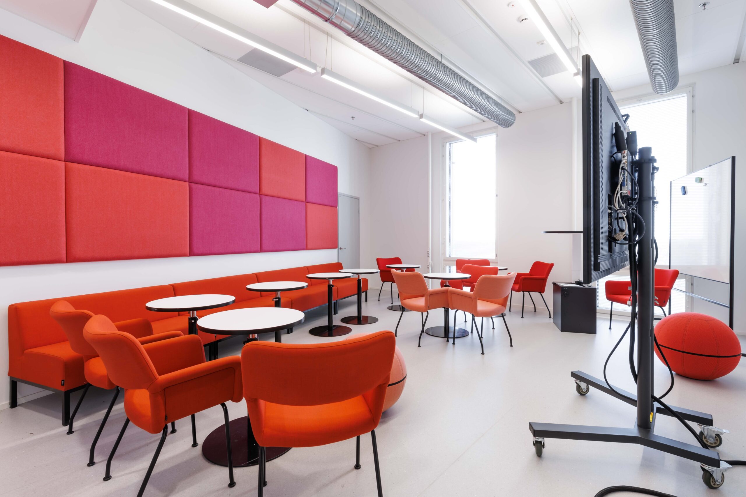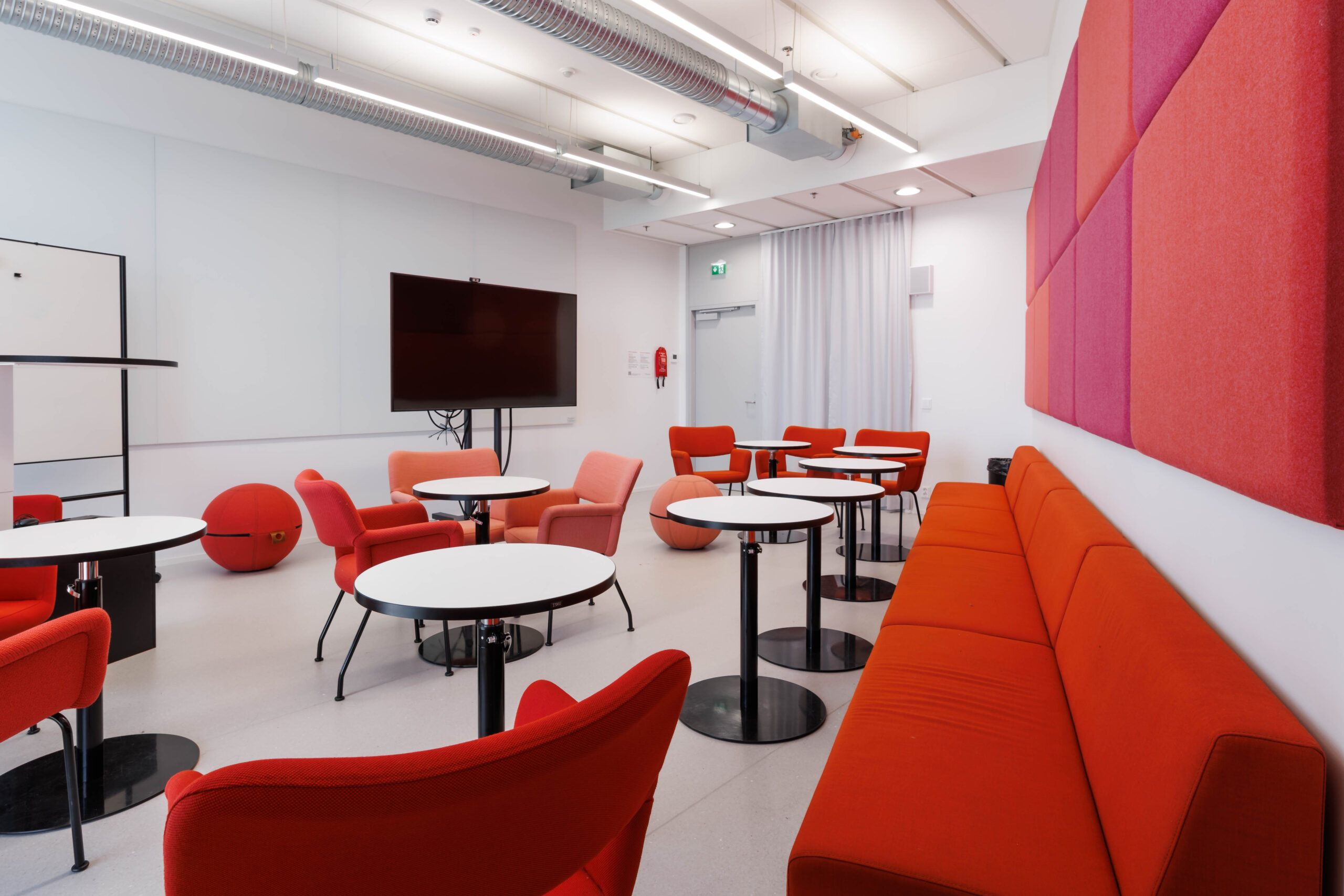 Tilassa sohvia ja nojatuoleja, korkeussäädettävät pyöreät pöydät. Tilassa esitysnäyttö