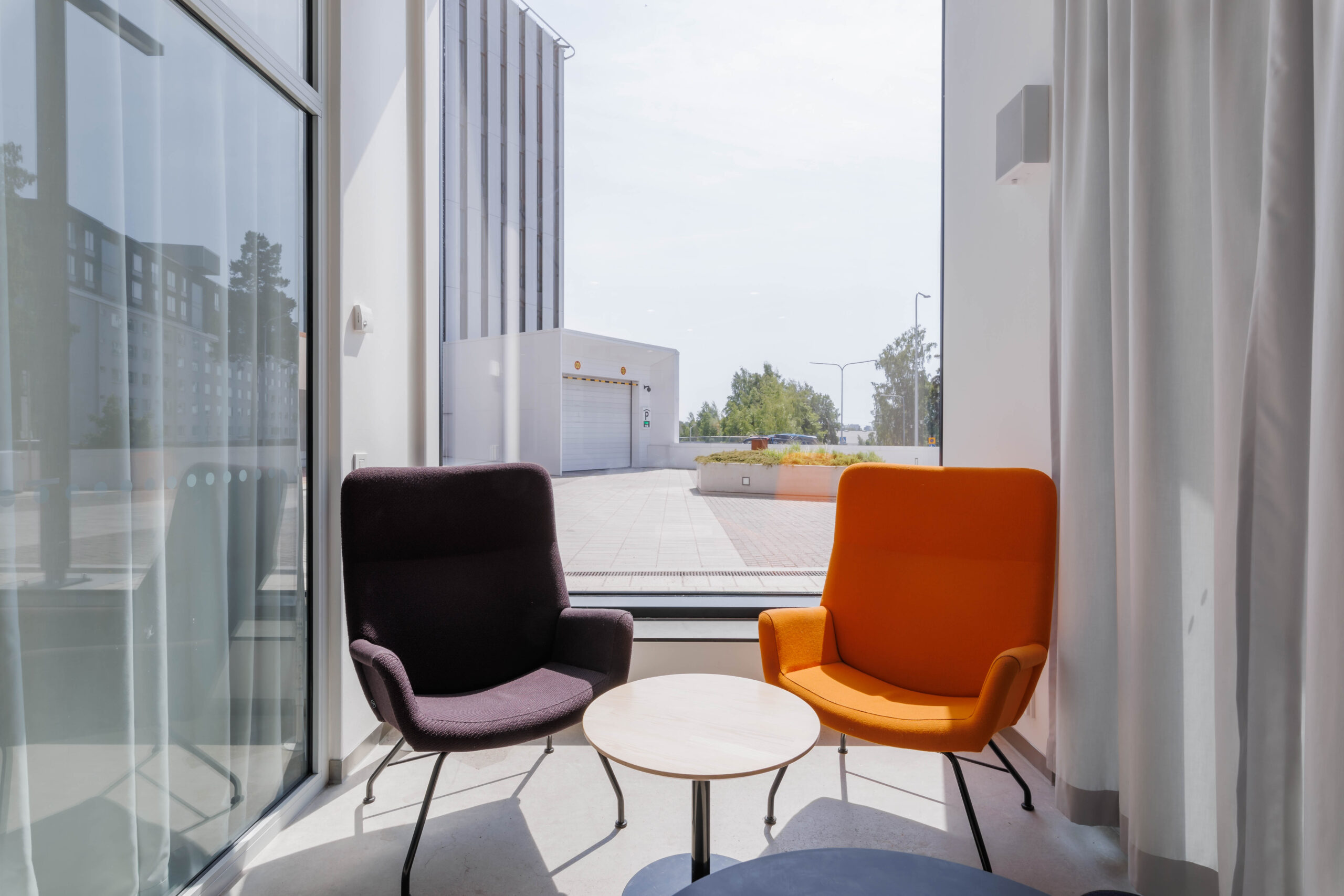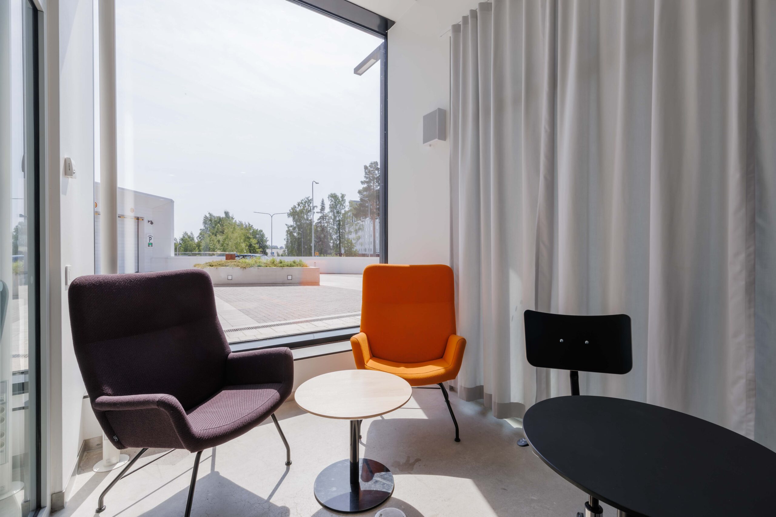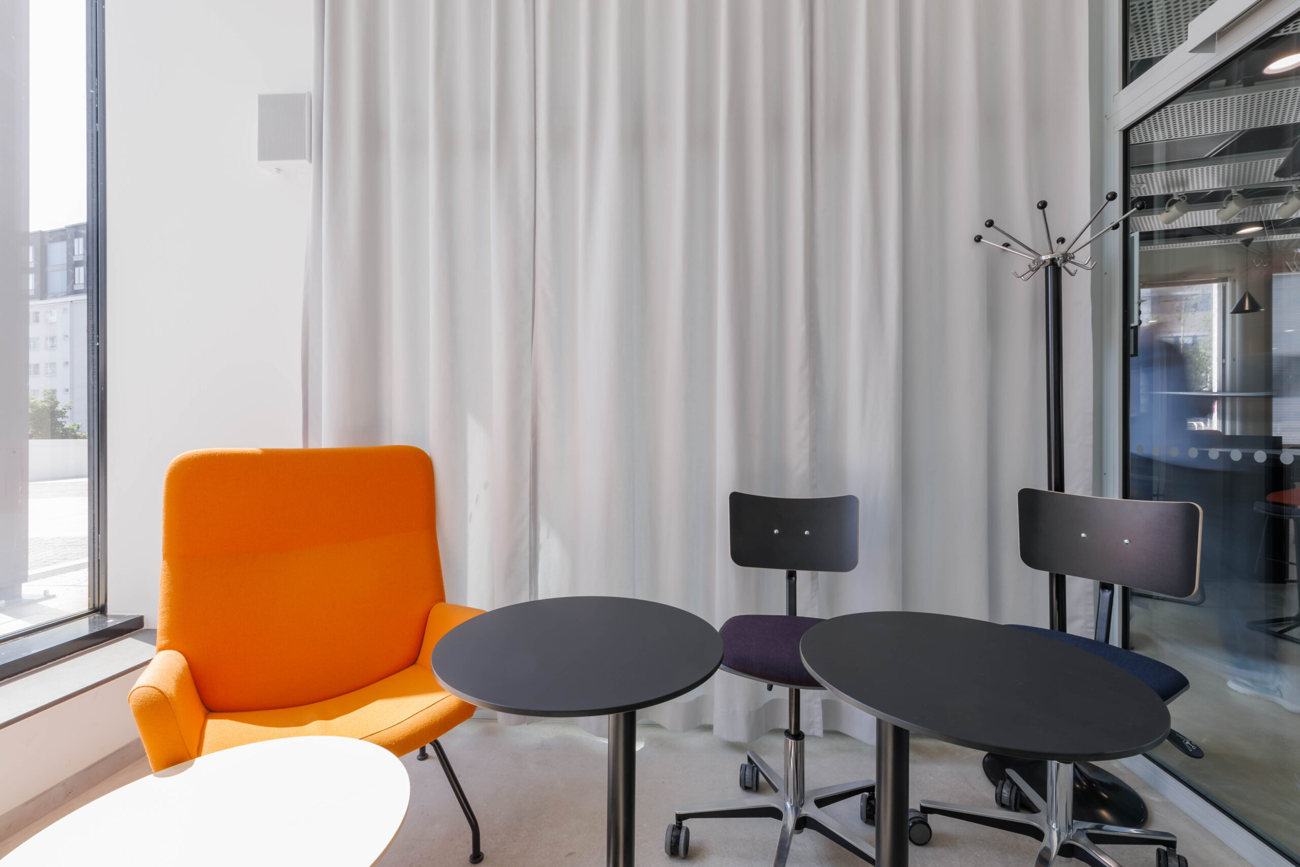 Pieni kokoustila, pyöreät pöydät ja nojatuolit, tilassa ei ole esitystekniikkaa