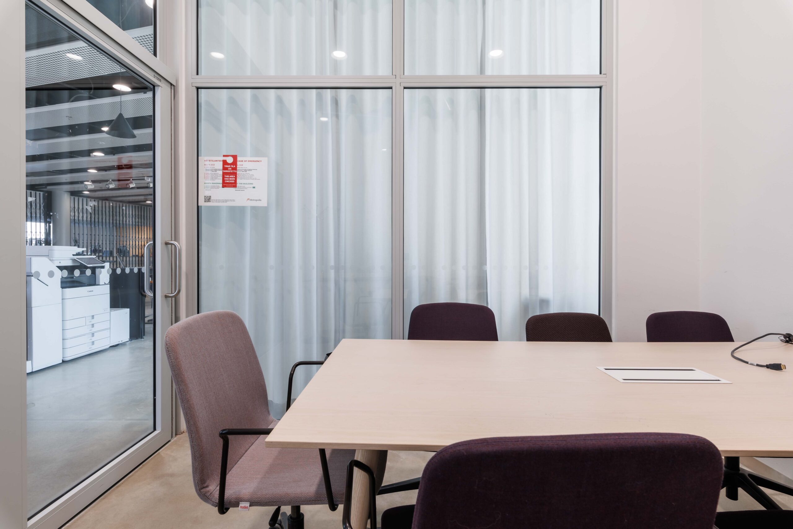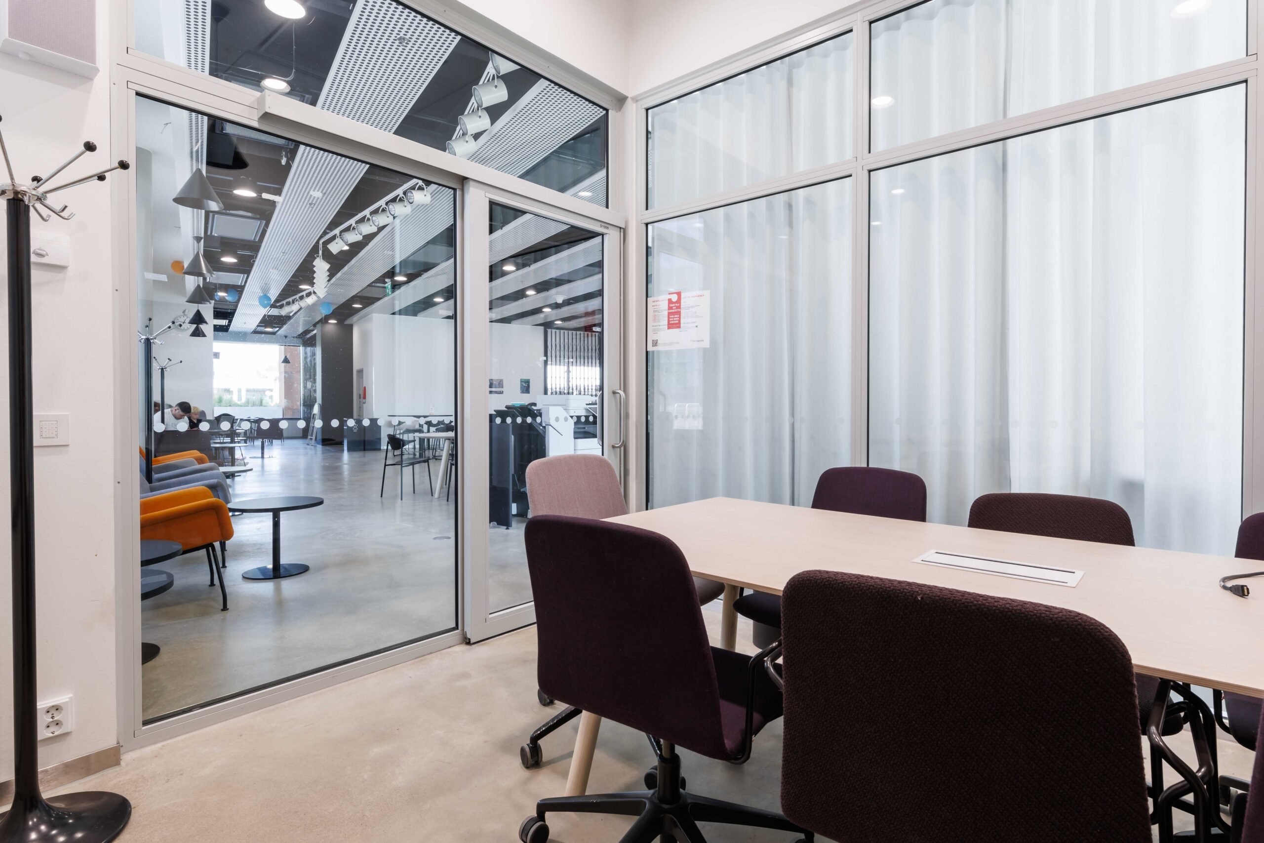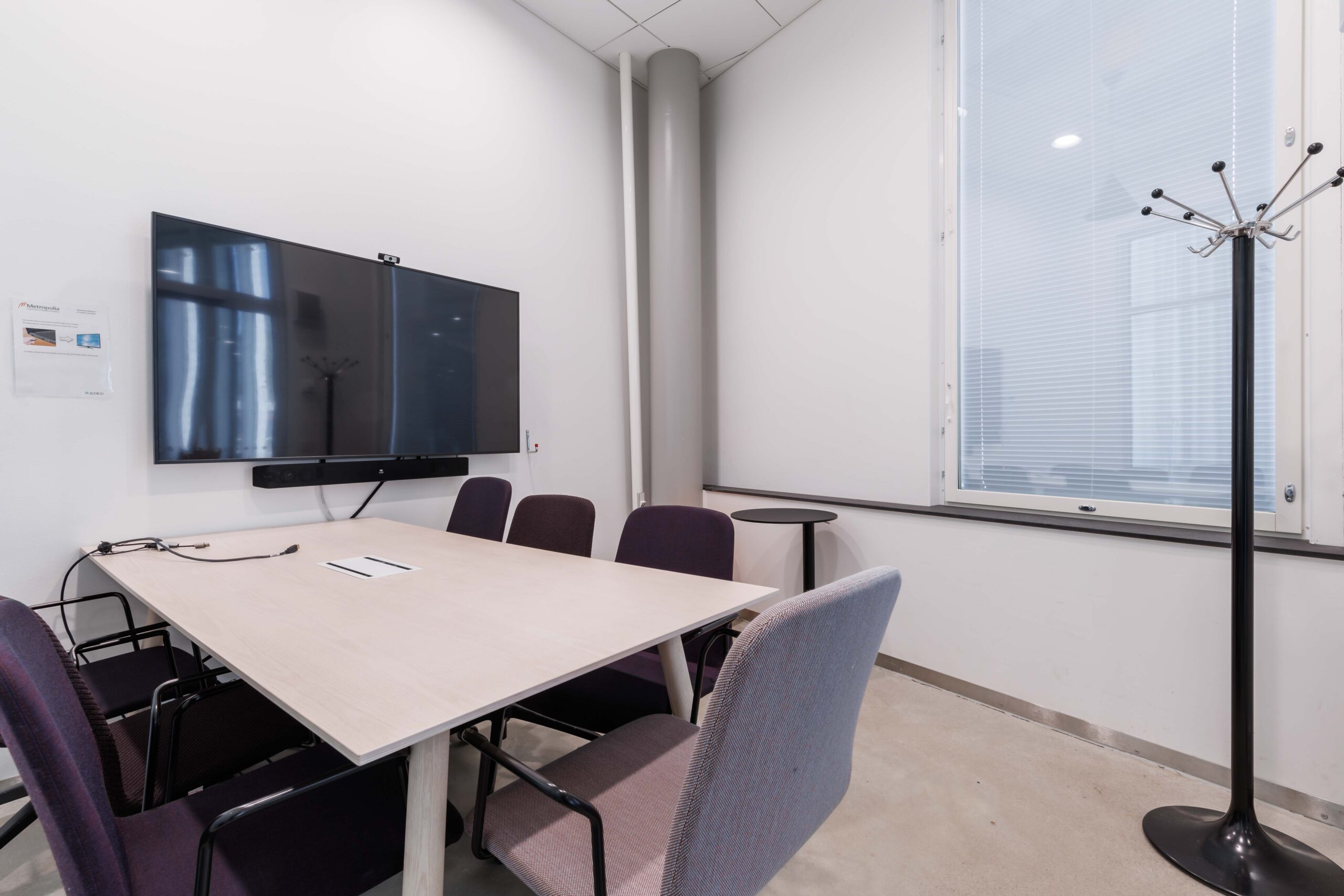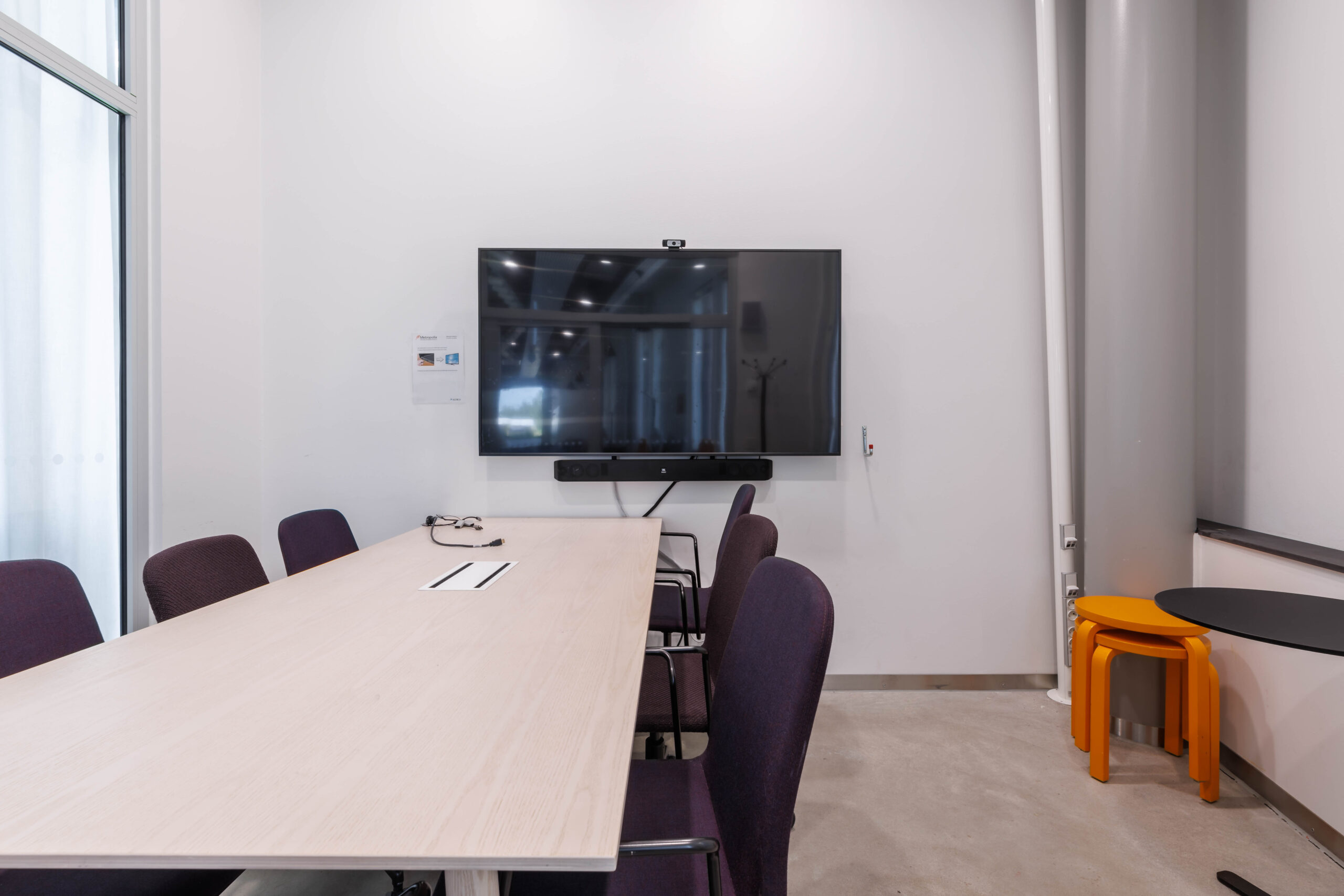 Pieni kokoustila, neuvottelupöytä ja tuolit. Tilassa esitysnäyttö