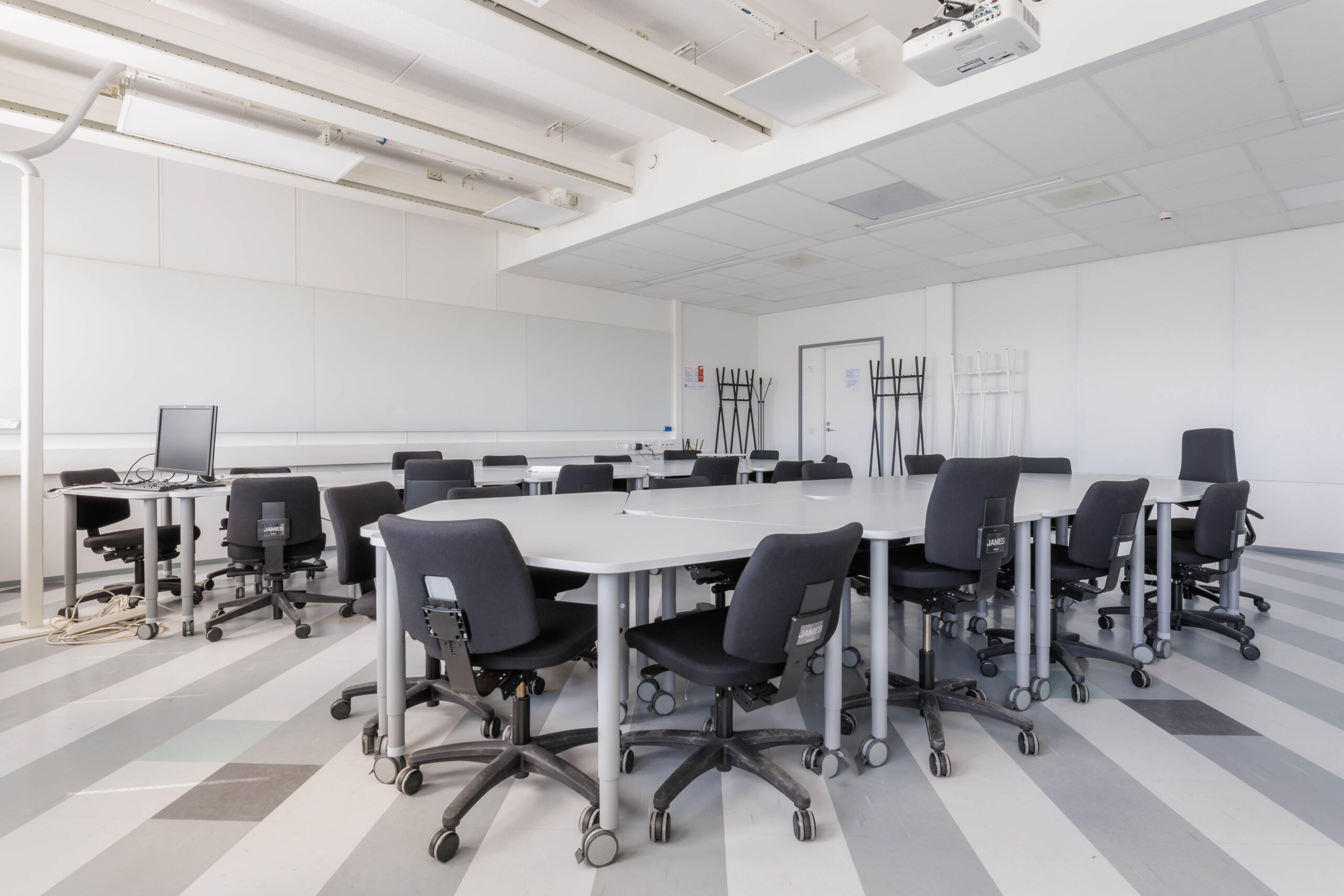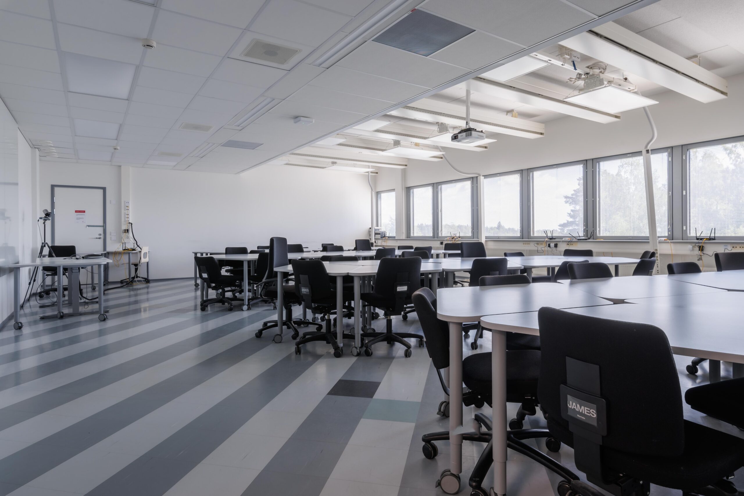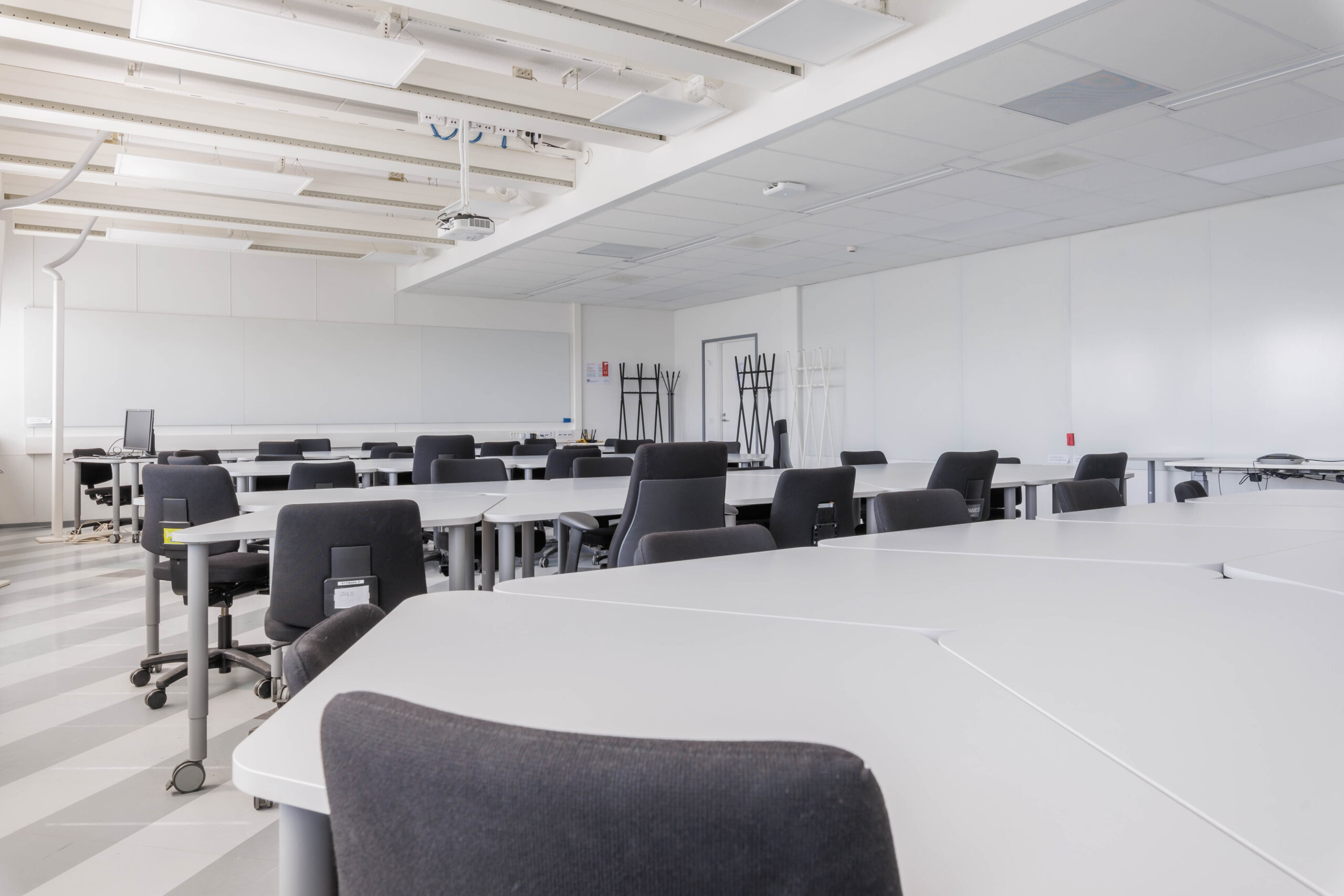 Yhden hengen pöydät tuoleilla. Tilassa etäprojektori