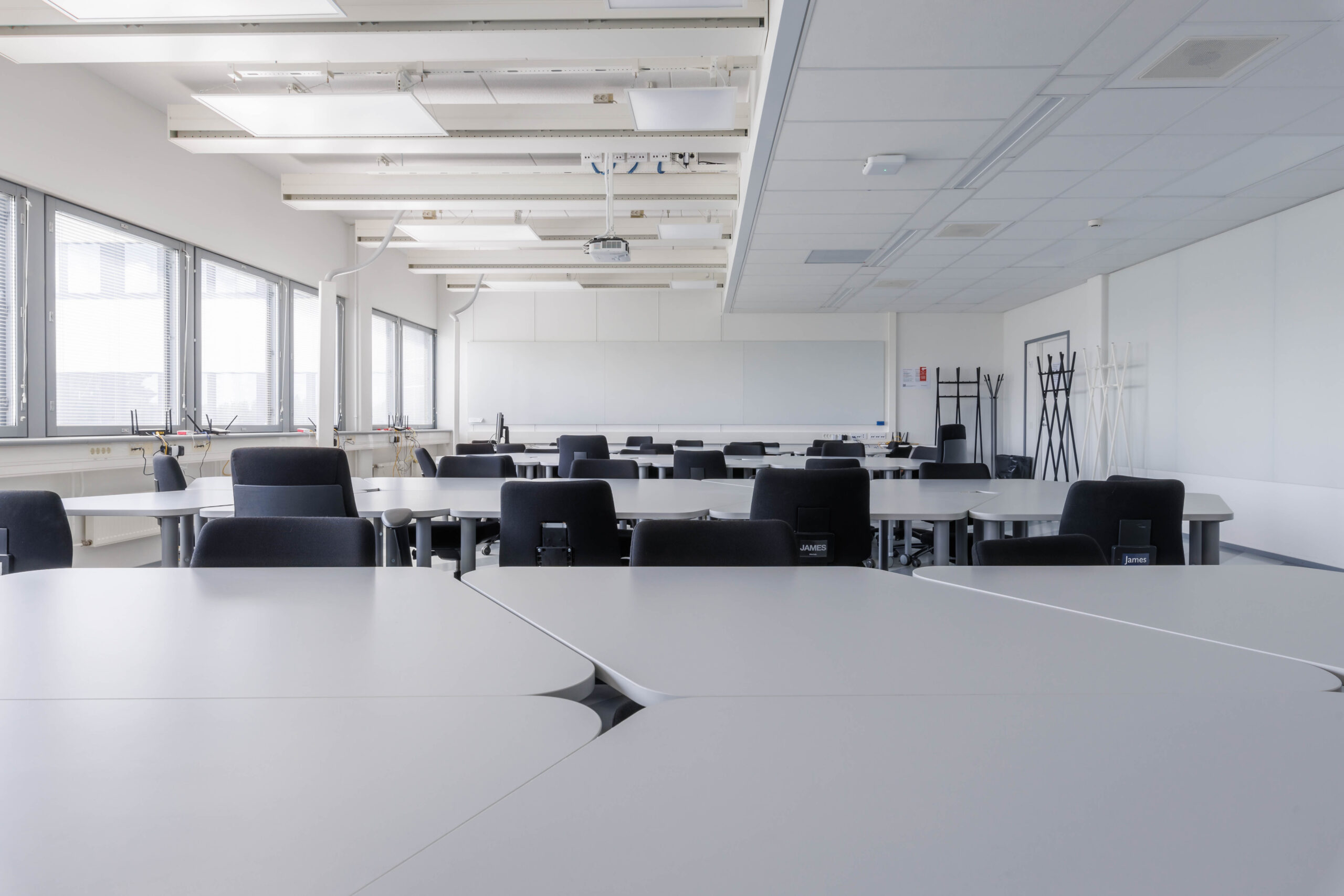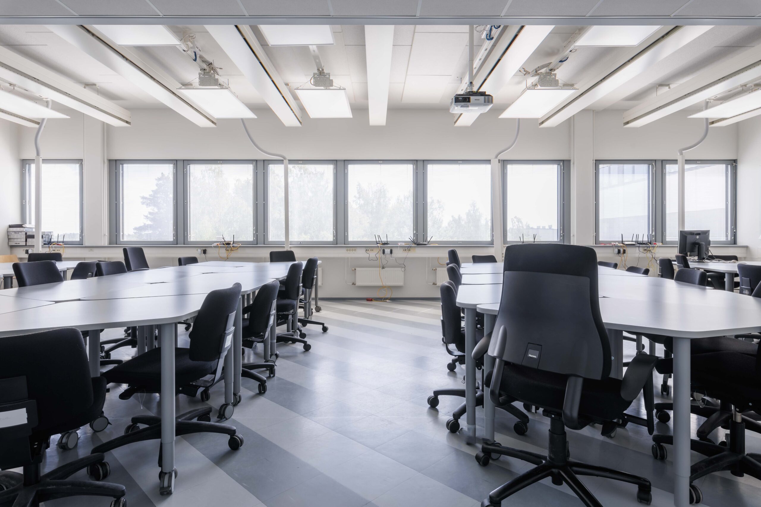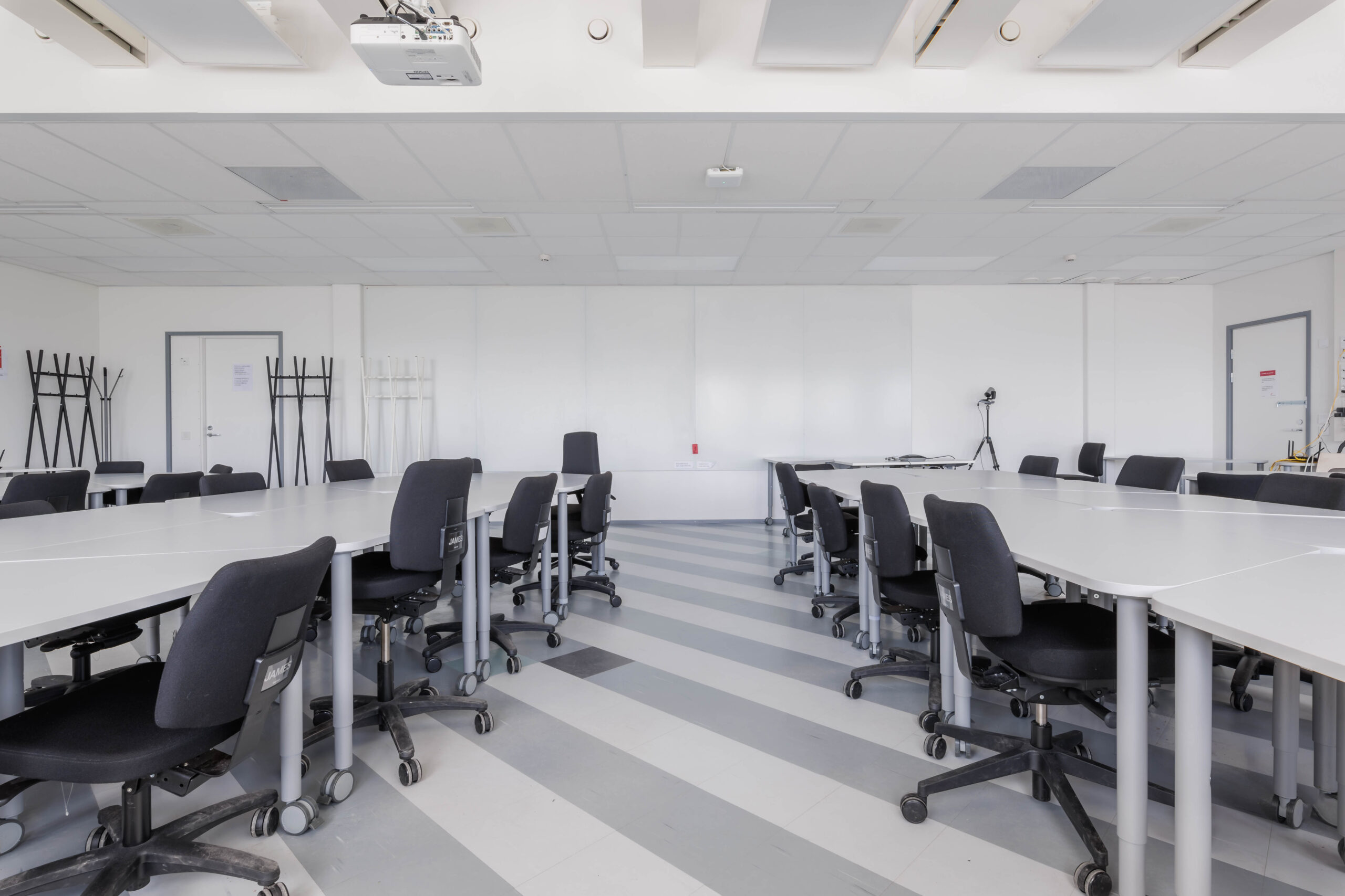 Yhden hengen pöydät tuoleilla. Tilassa etäprojektori