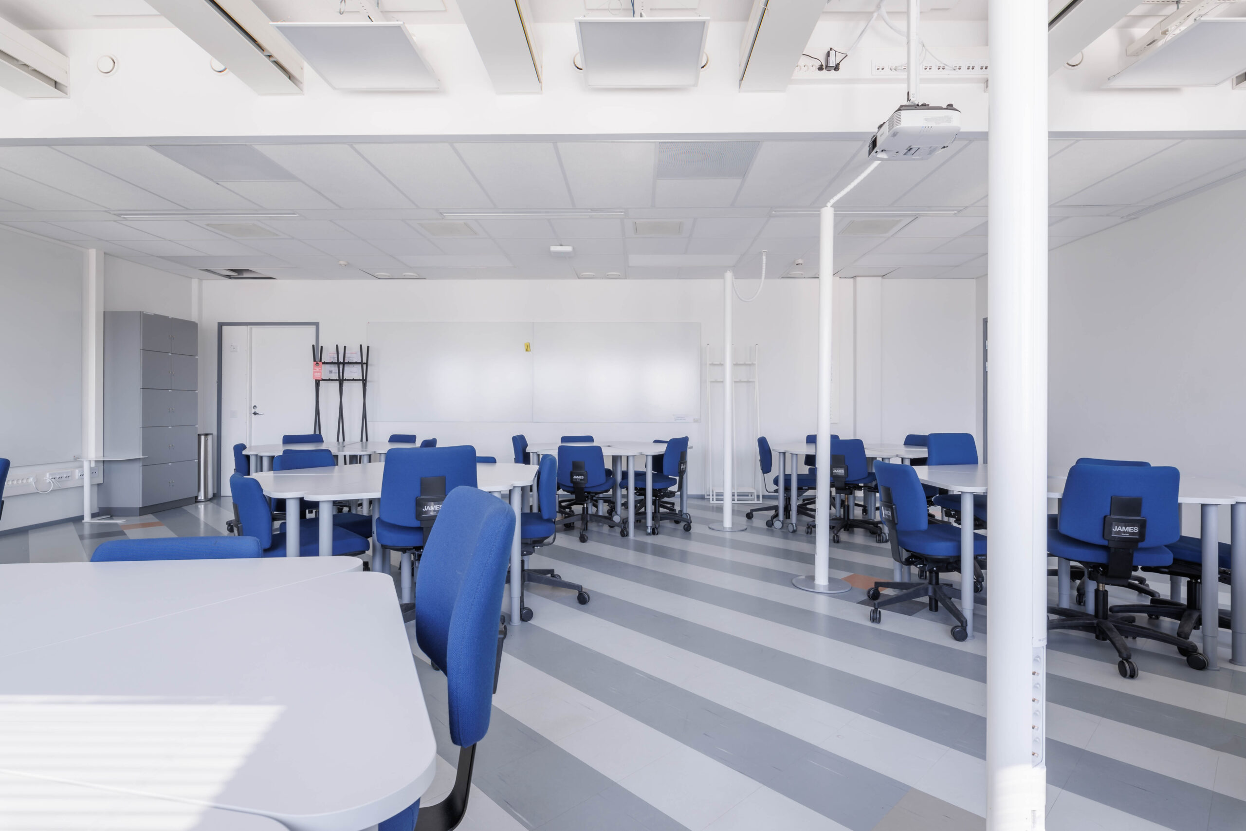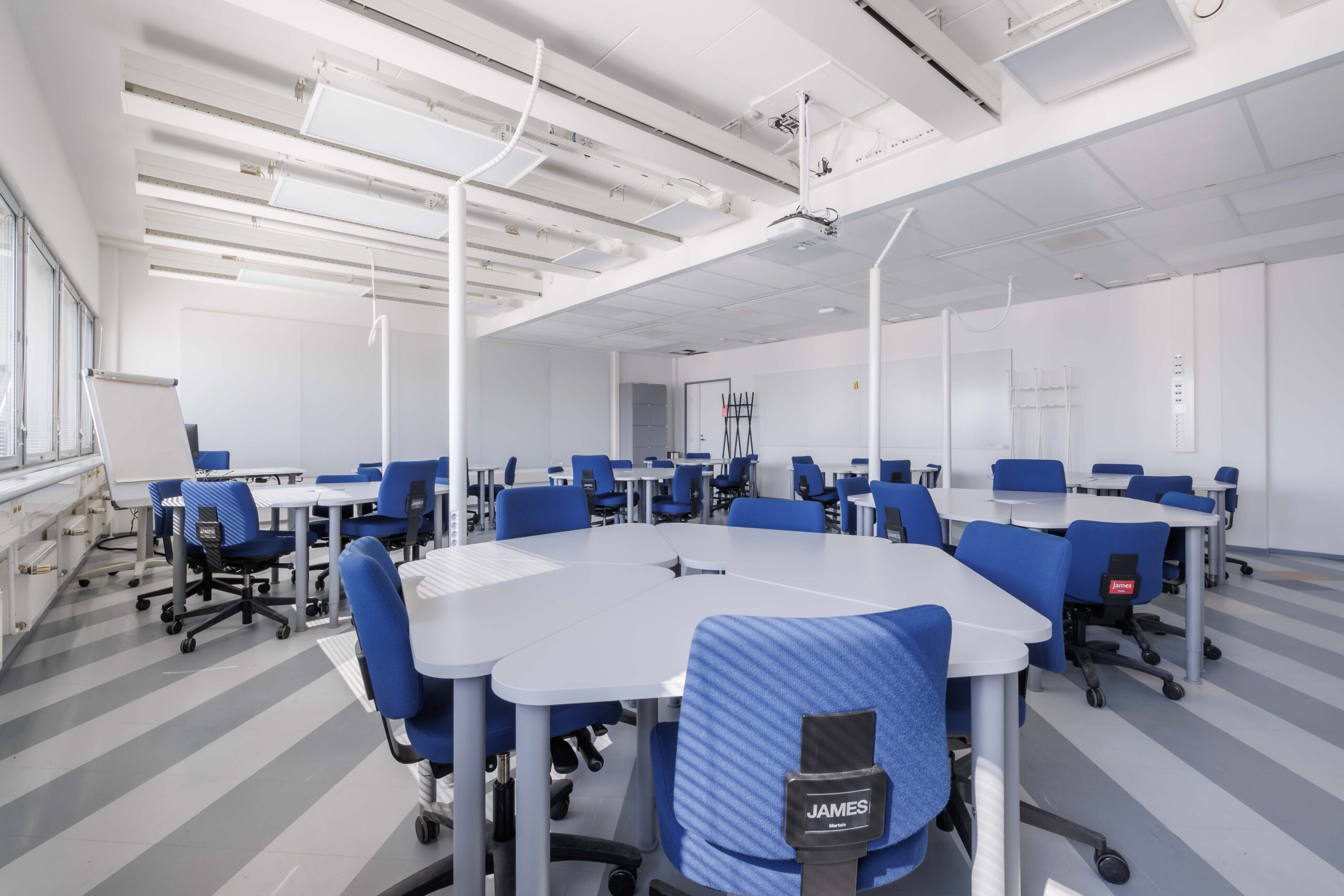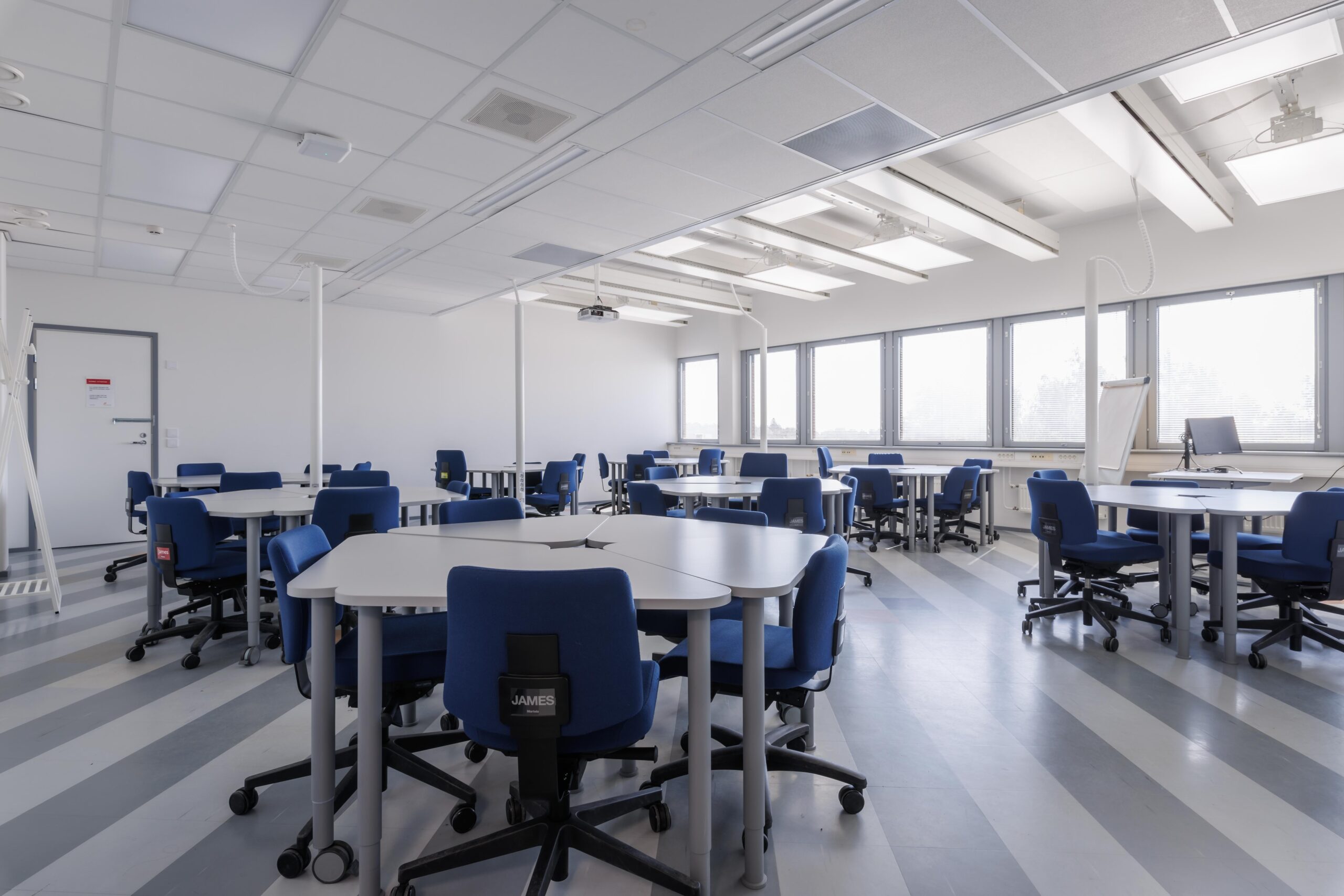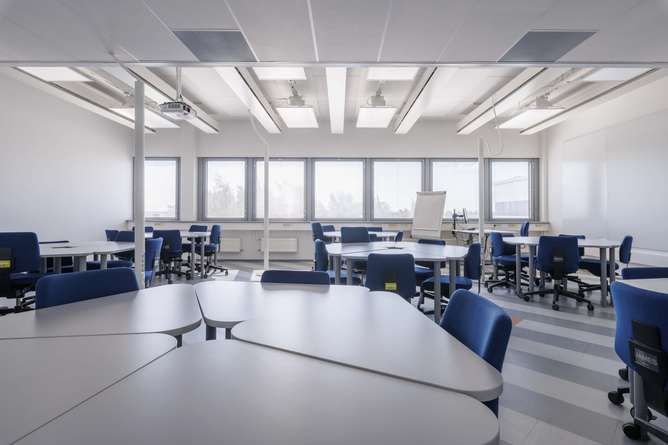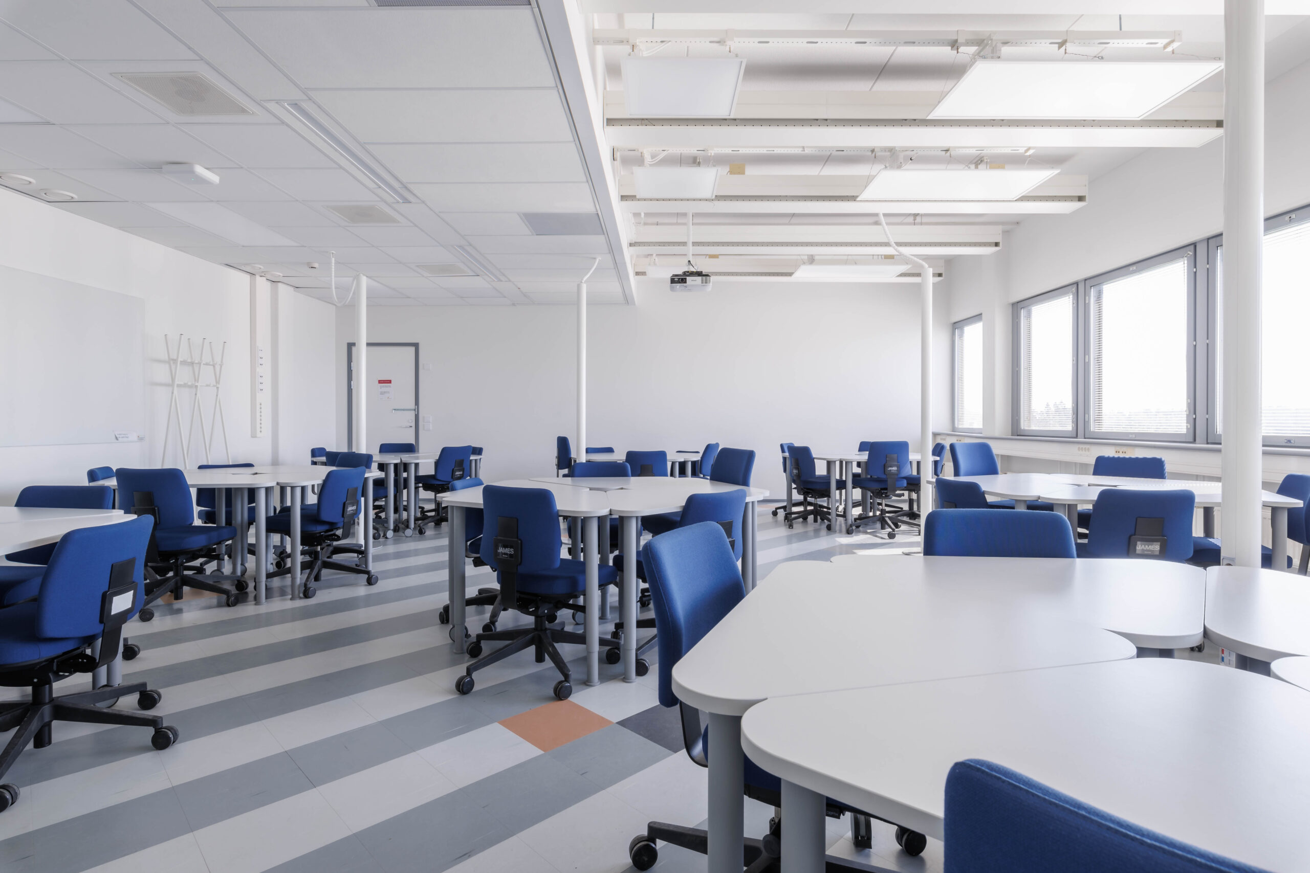 Yhden hengen pöydät tuoleilla, Tilassa etäprojektori