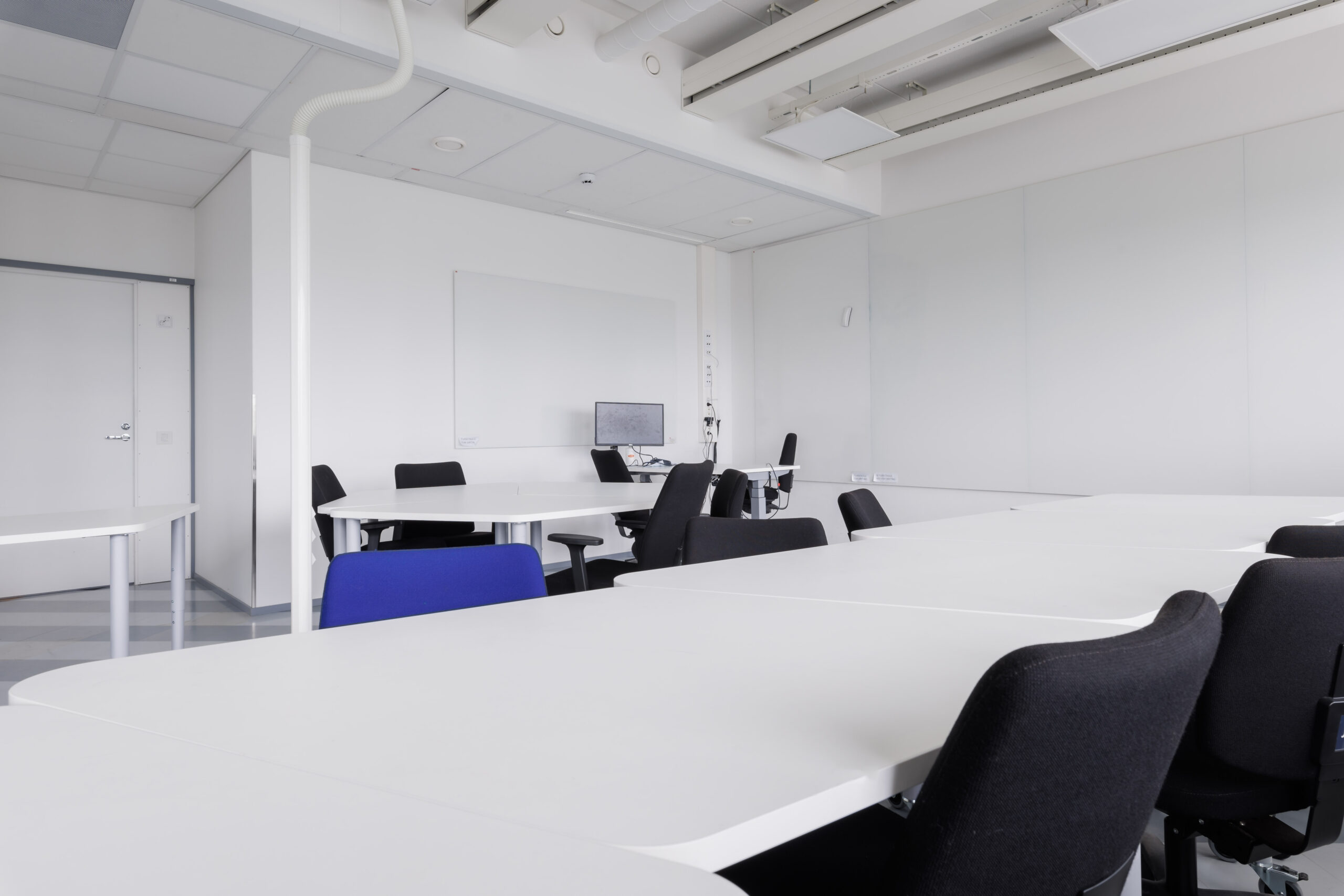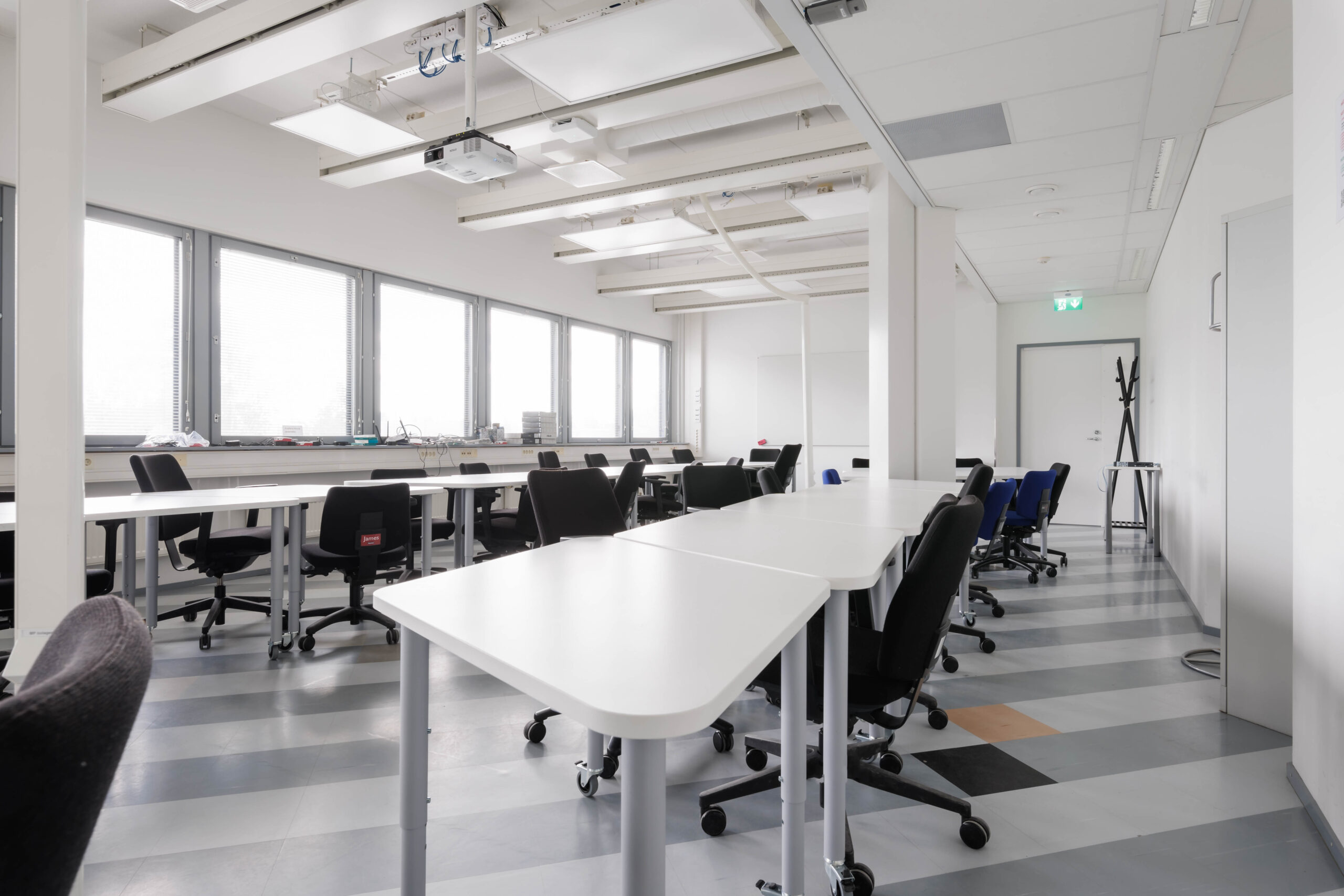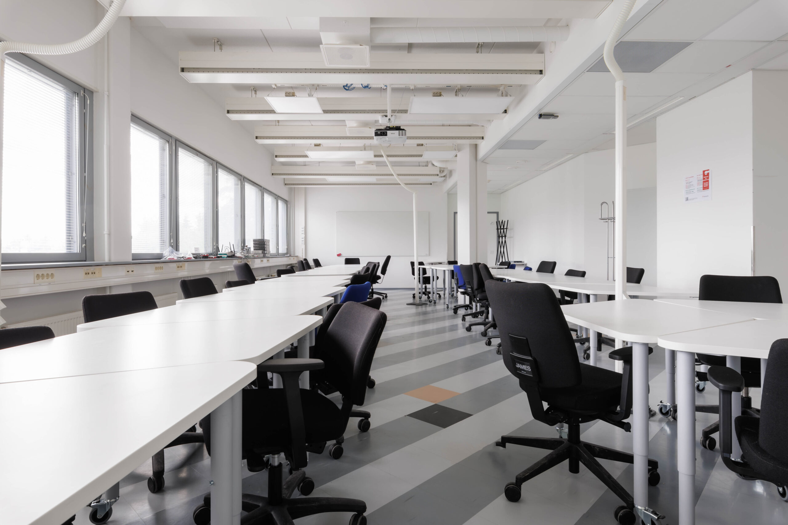 Yhden hengen pöydät tuoleilla. Tilassa etäprojektori
