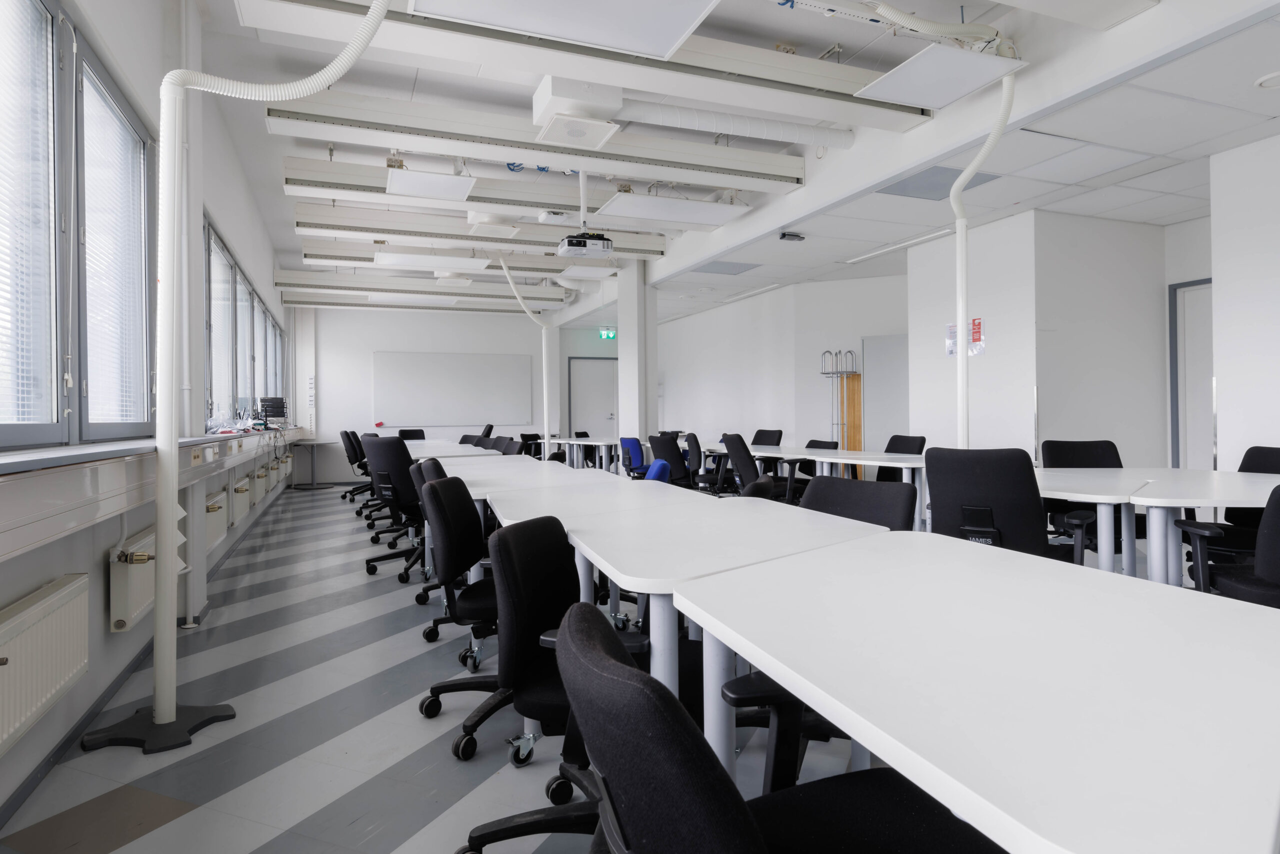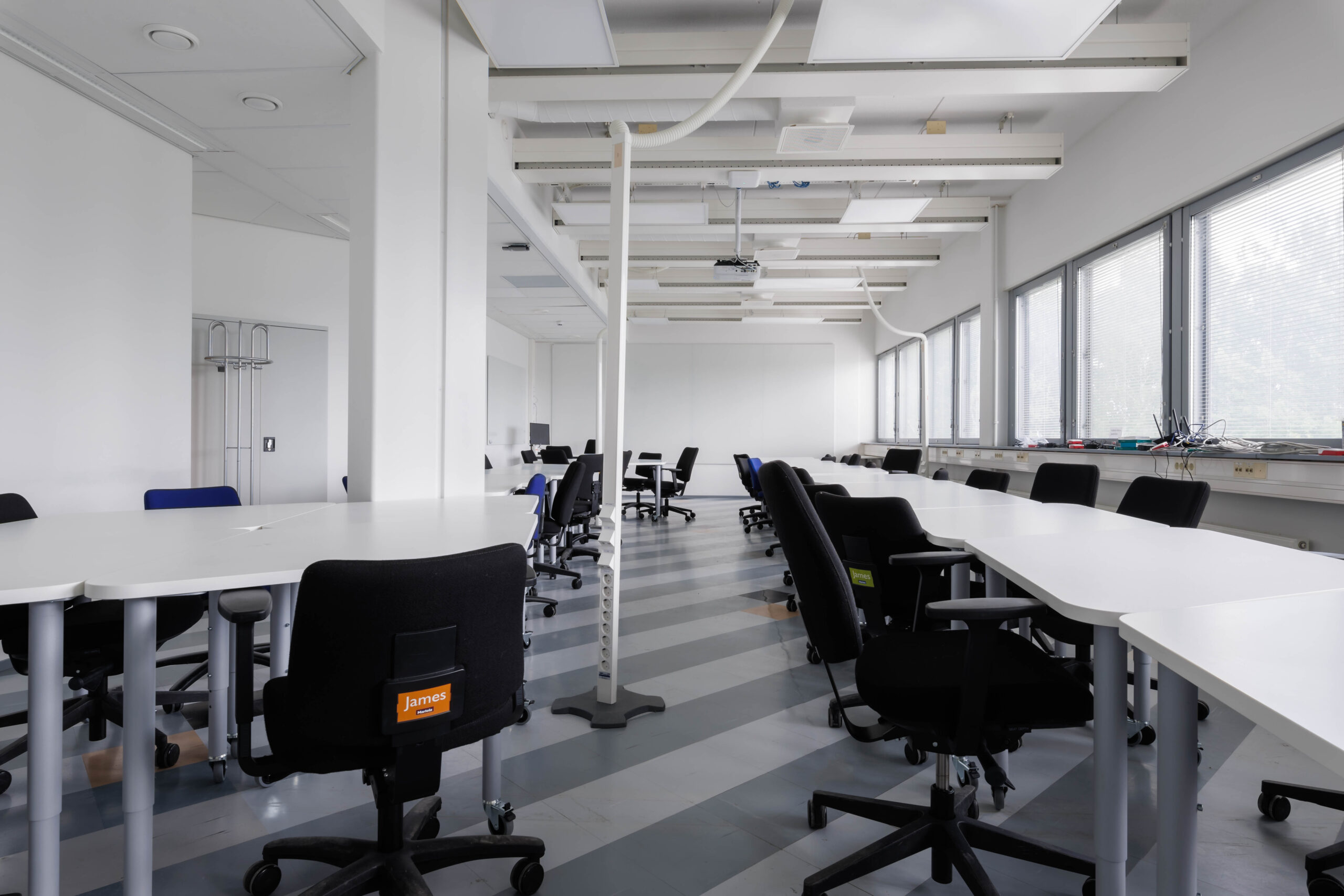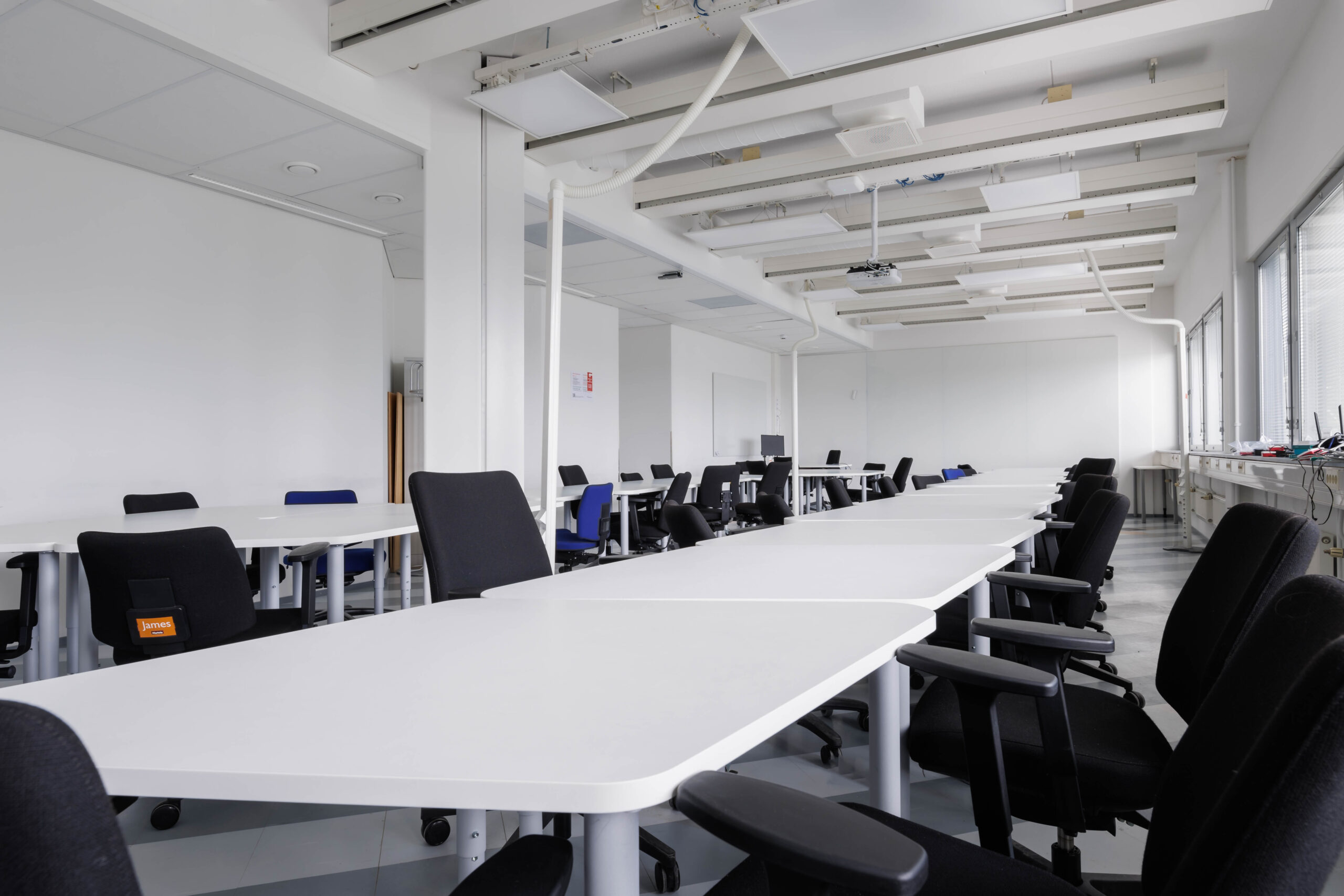 Yhden hengen pöydät tuoleilla. Tilassa etäprojektori