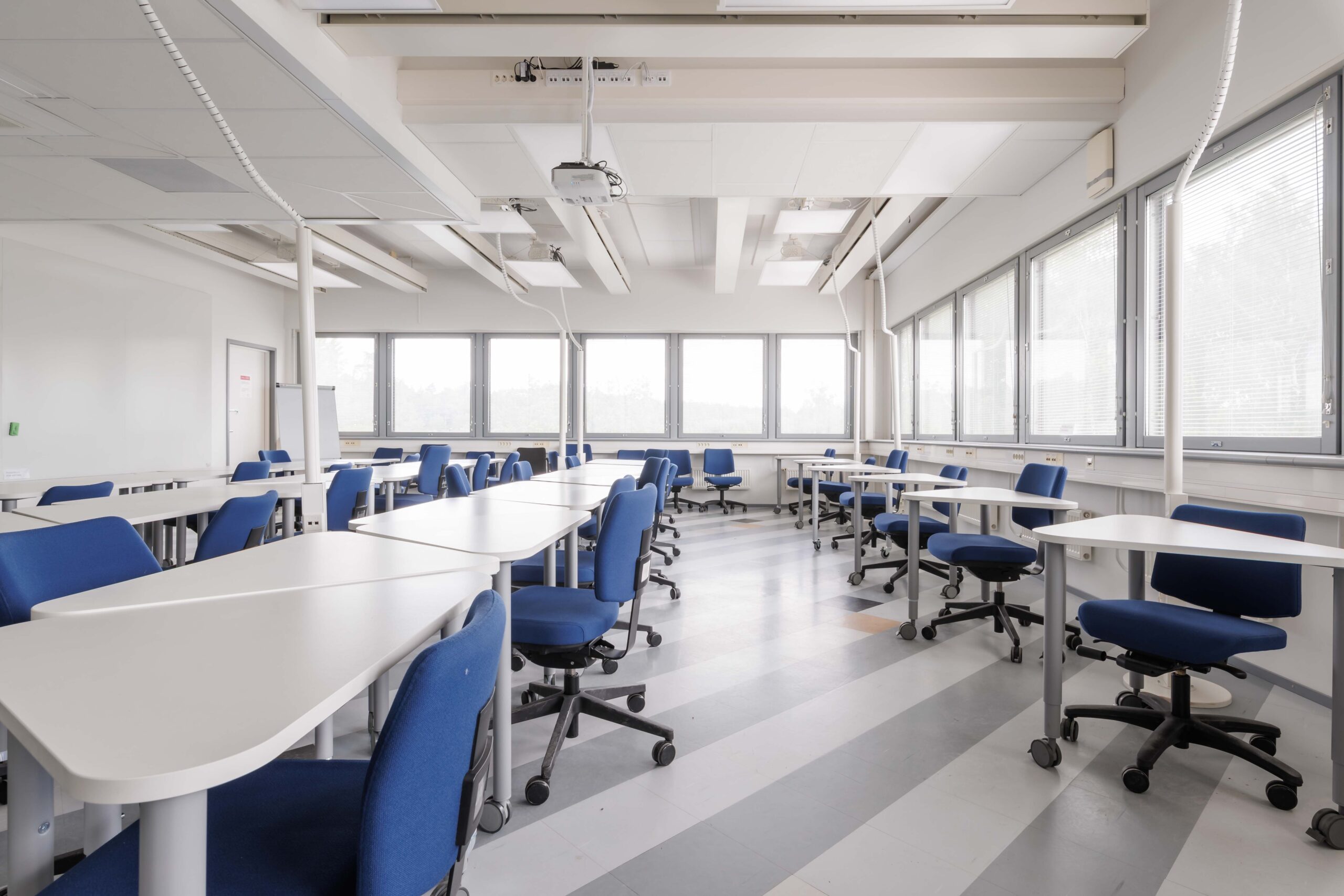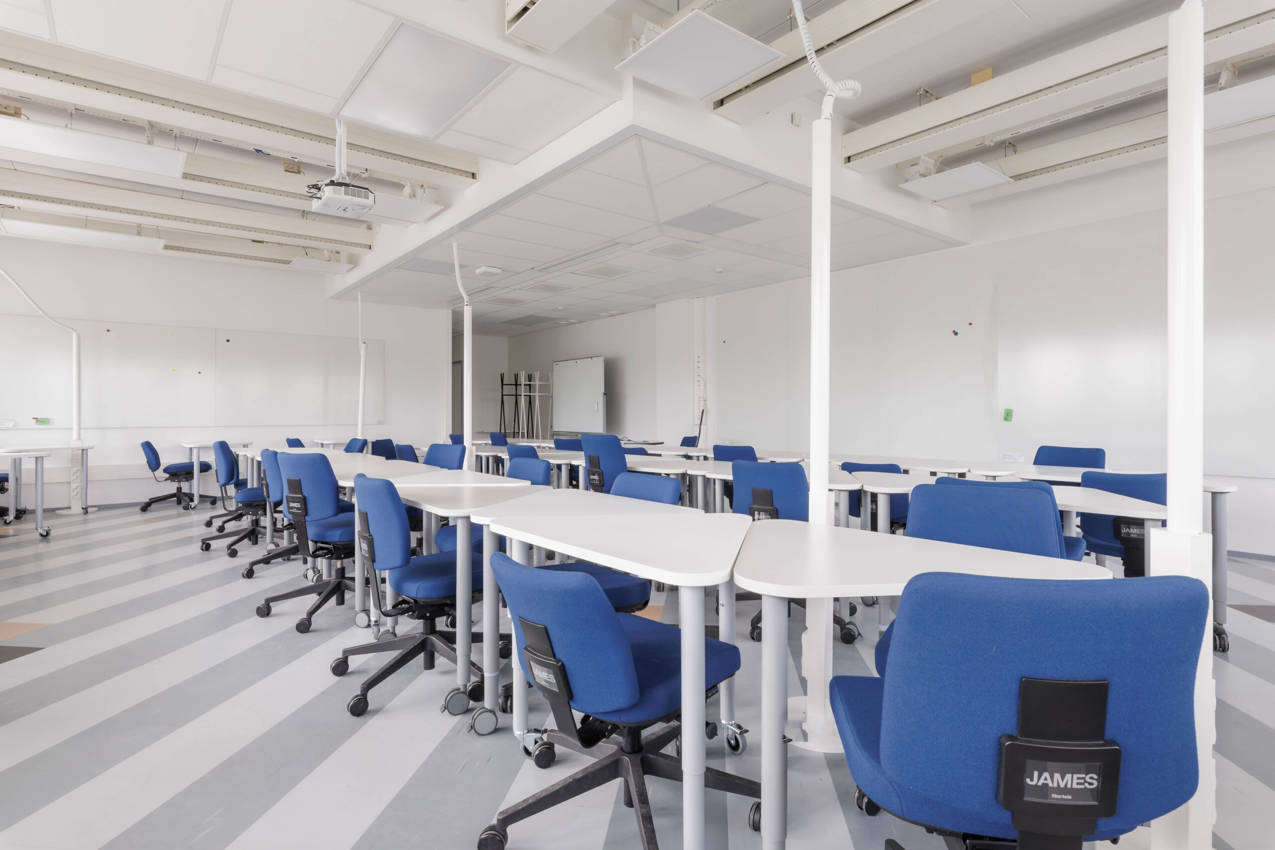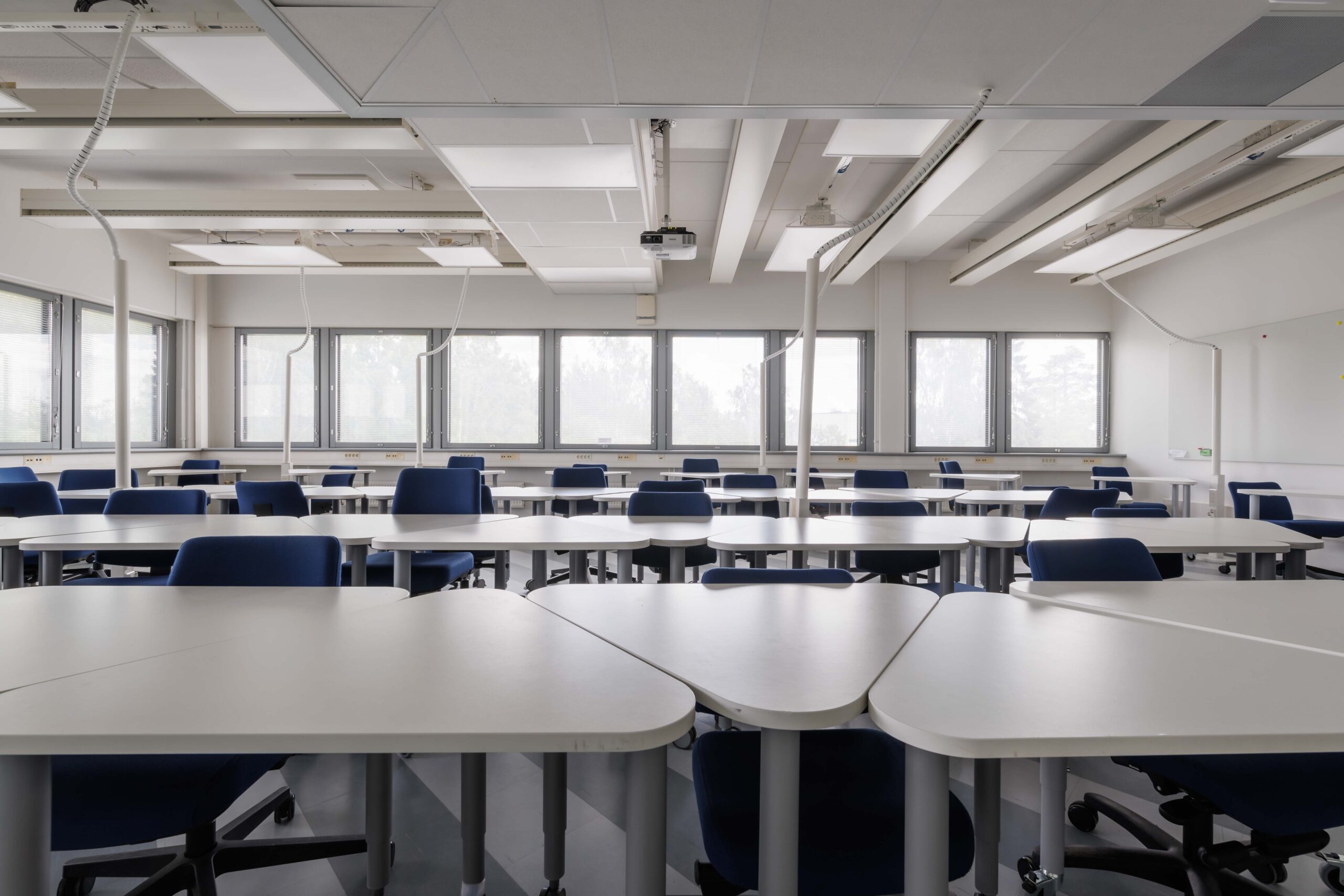 Yhden hengen pöydät tuoleilla. Tilassa etäprojektori