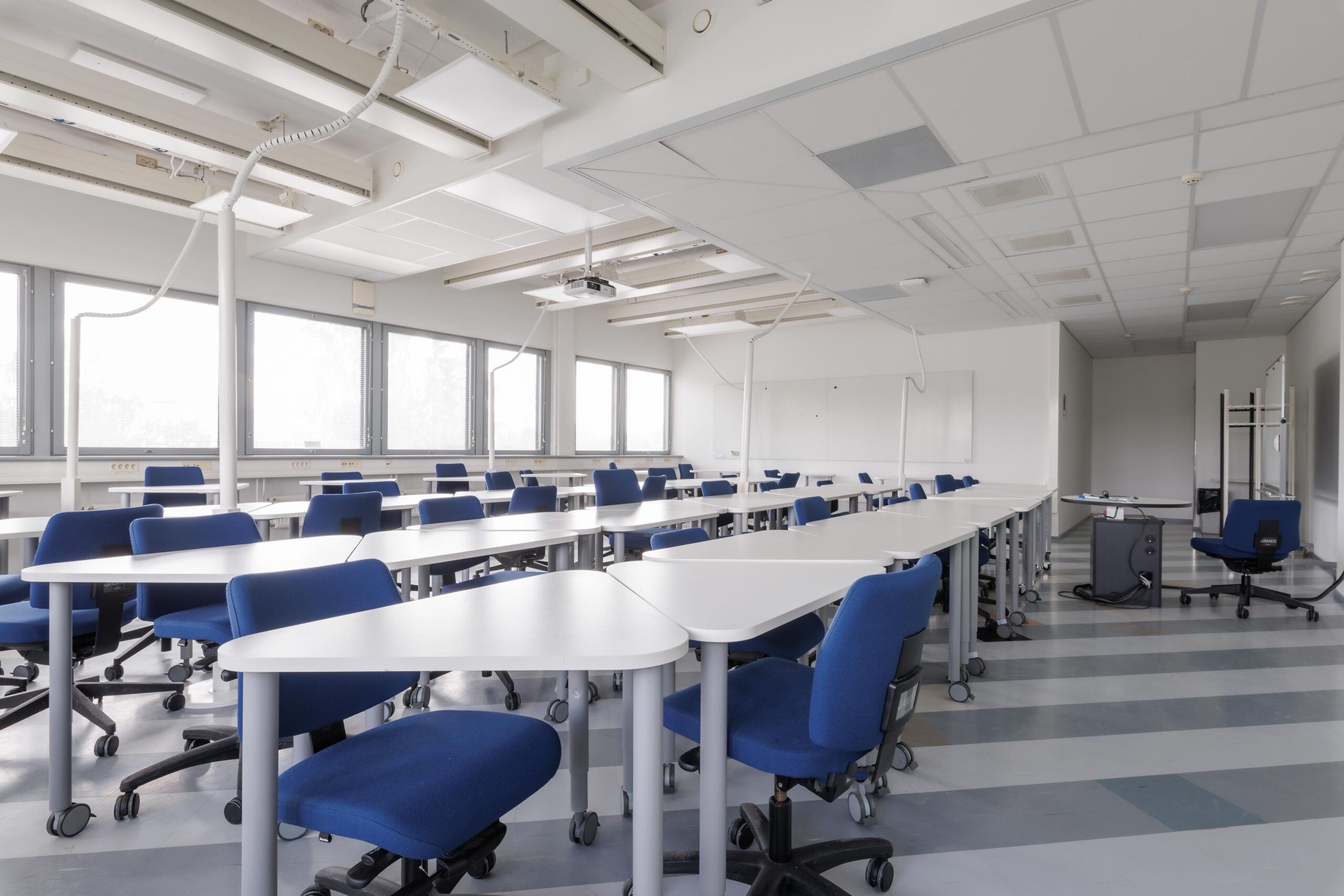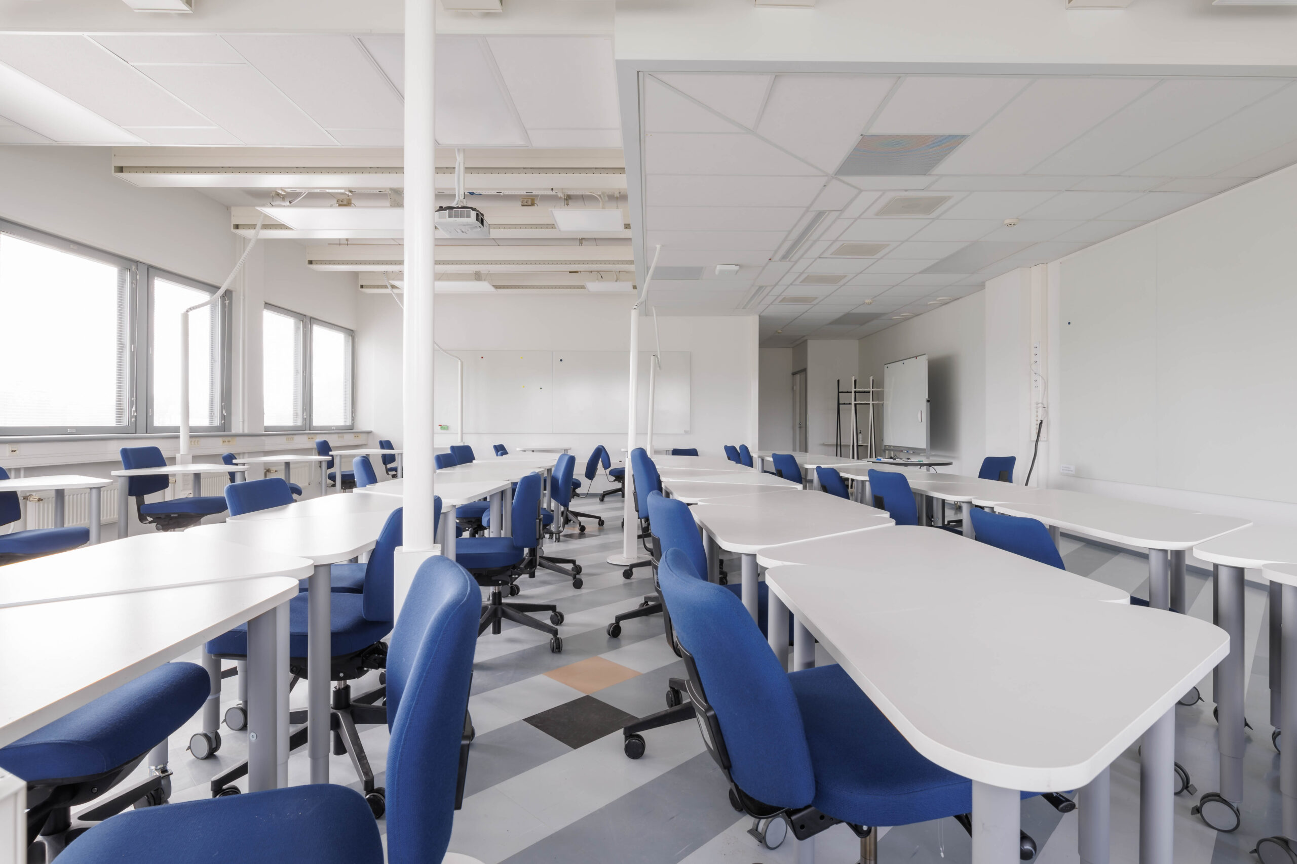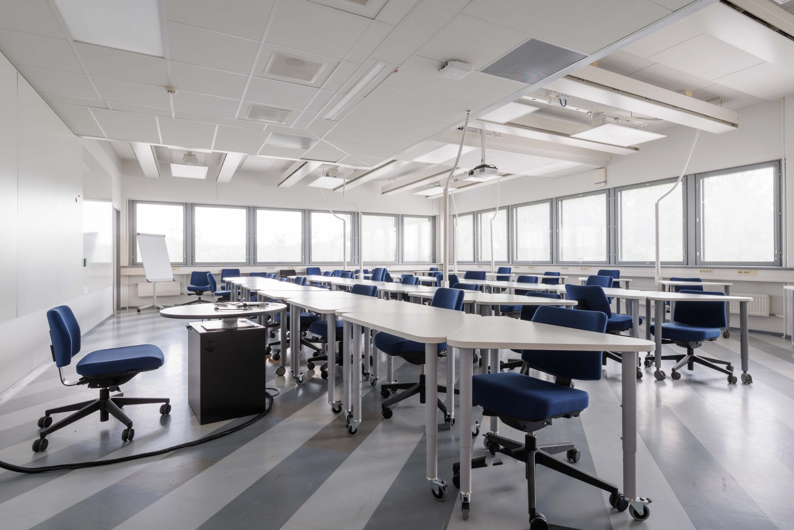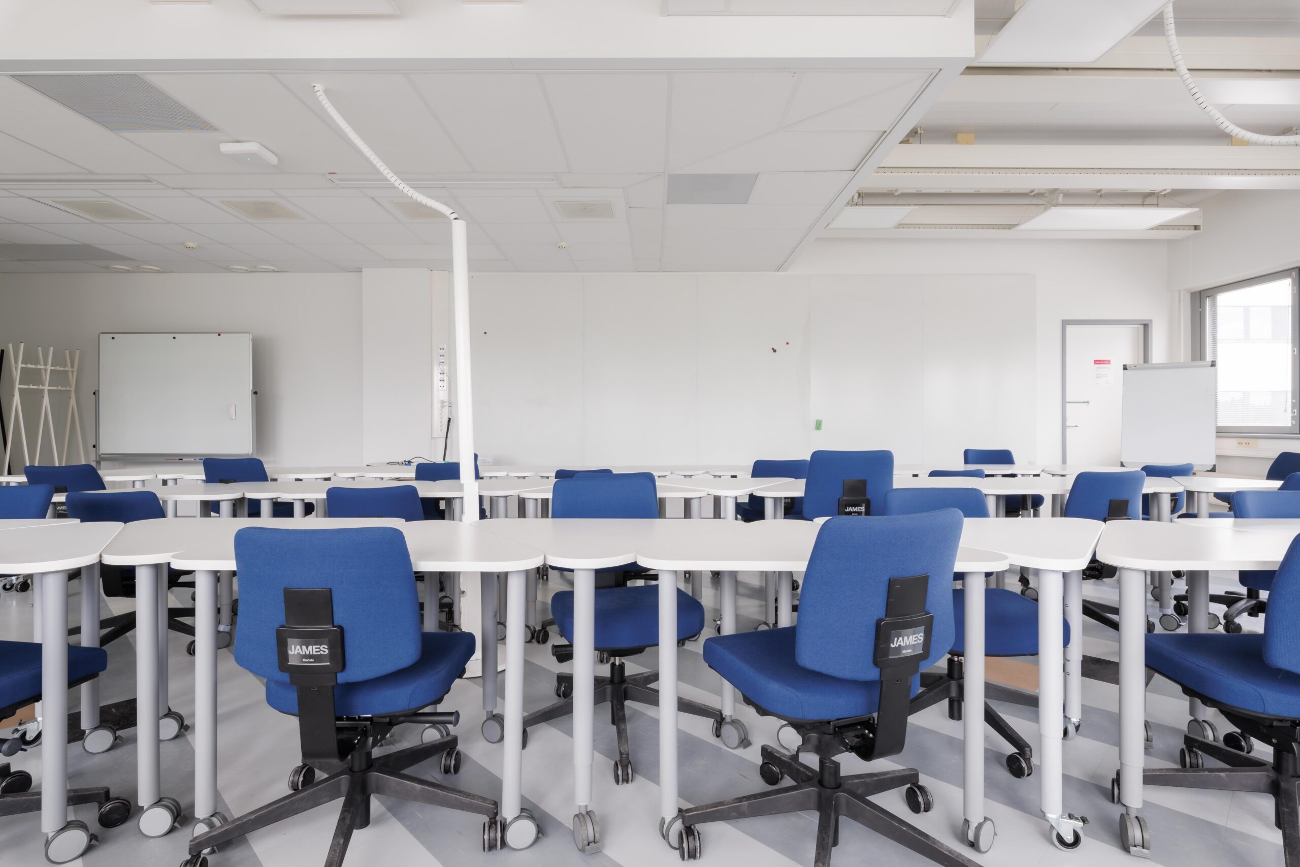 Yhden hengen pöydät tuoleilla. Tilassa etäprojektori