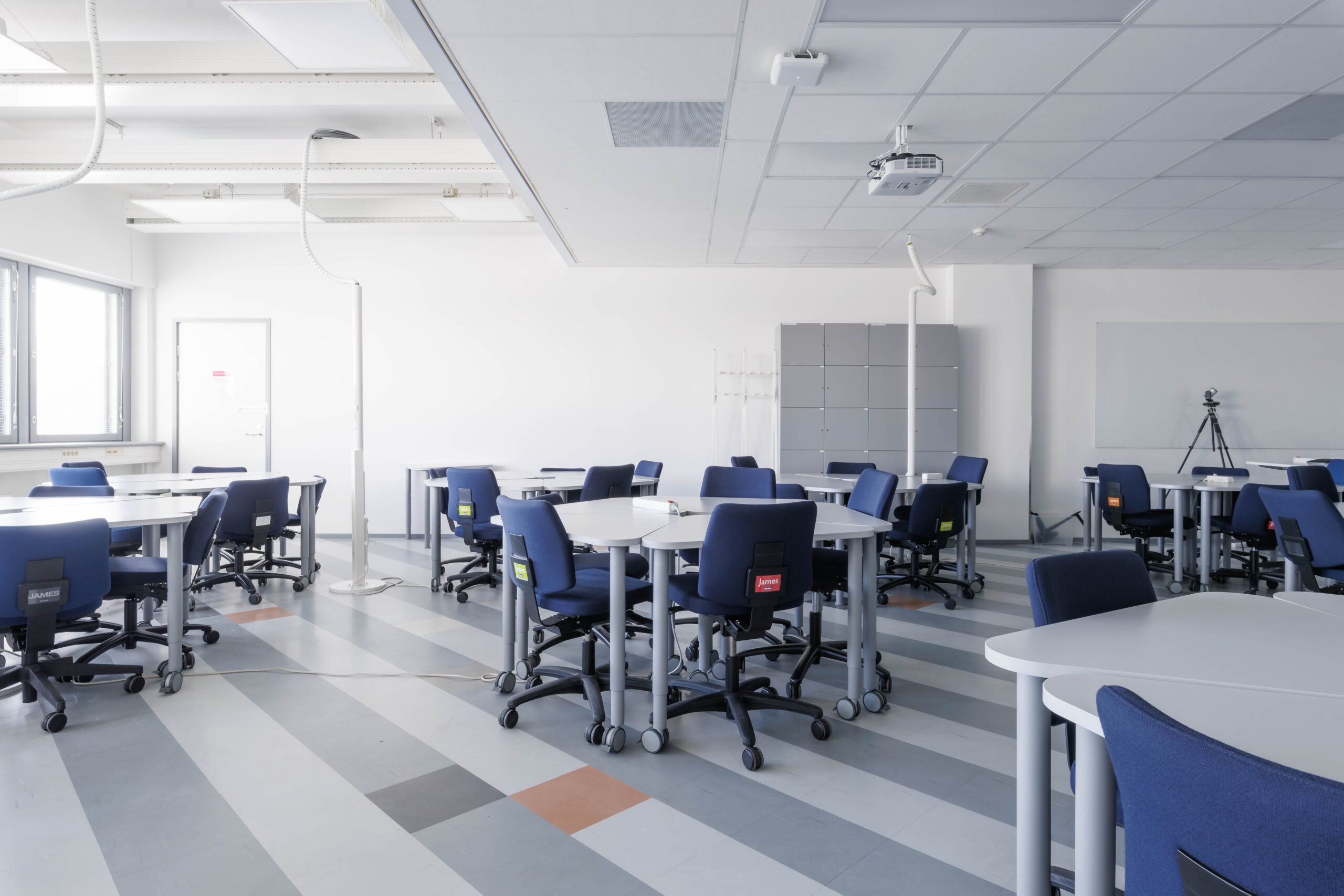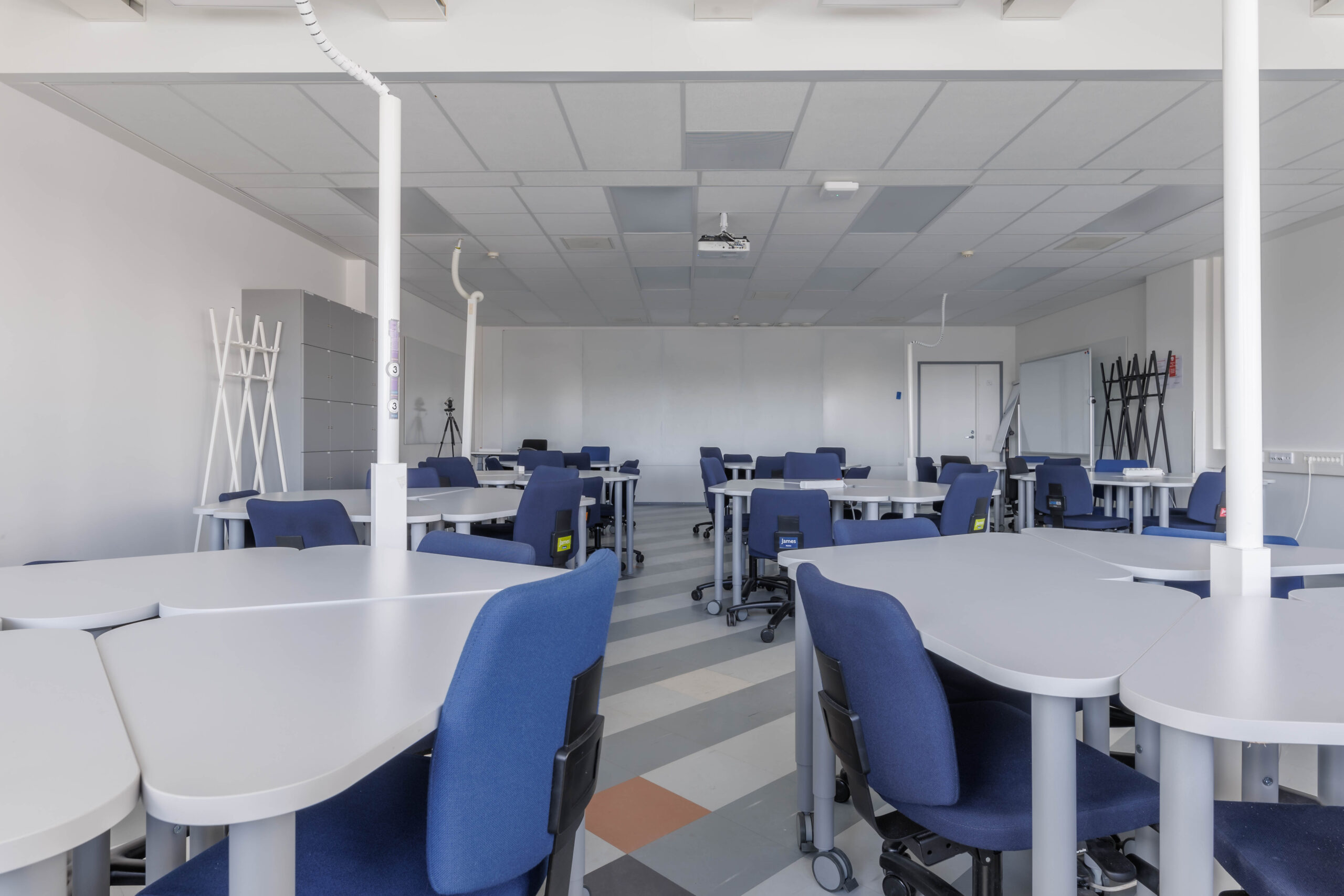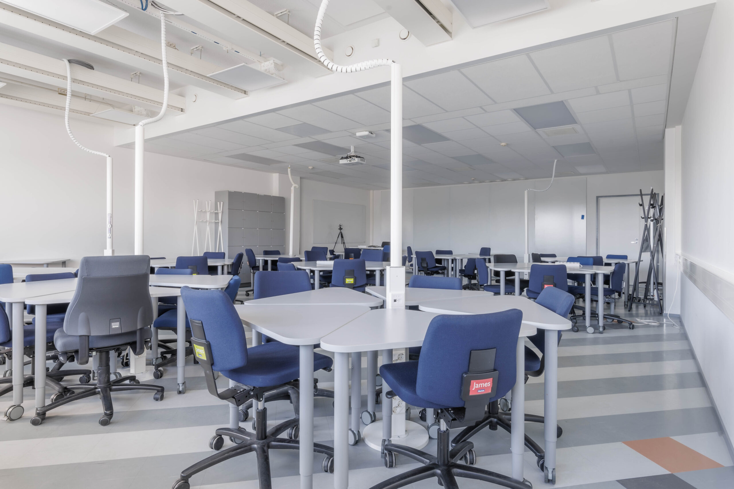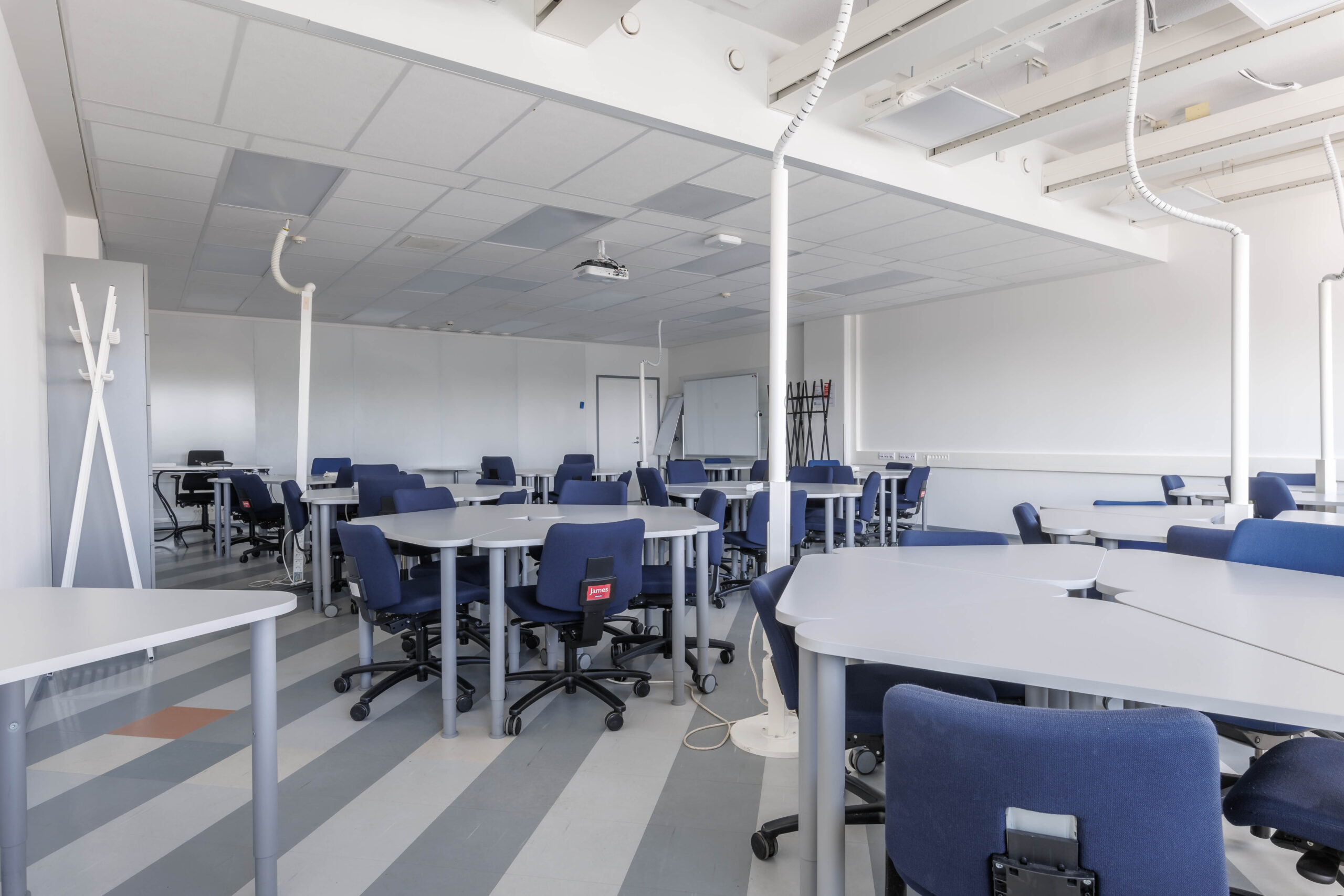 Yhden hengen pöydät tuoleilla. Tilassa etäprojektori.