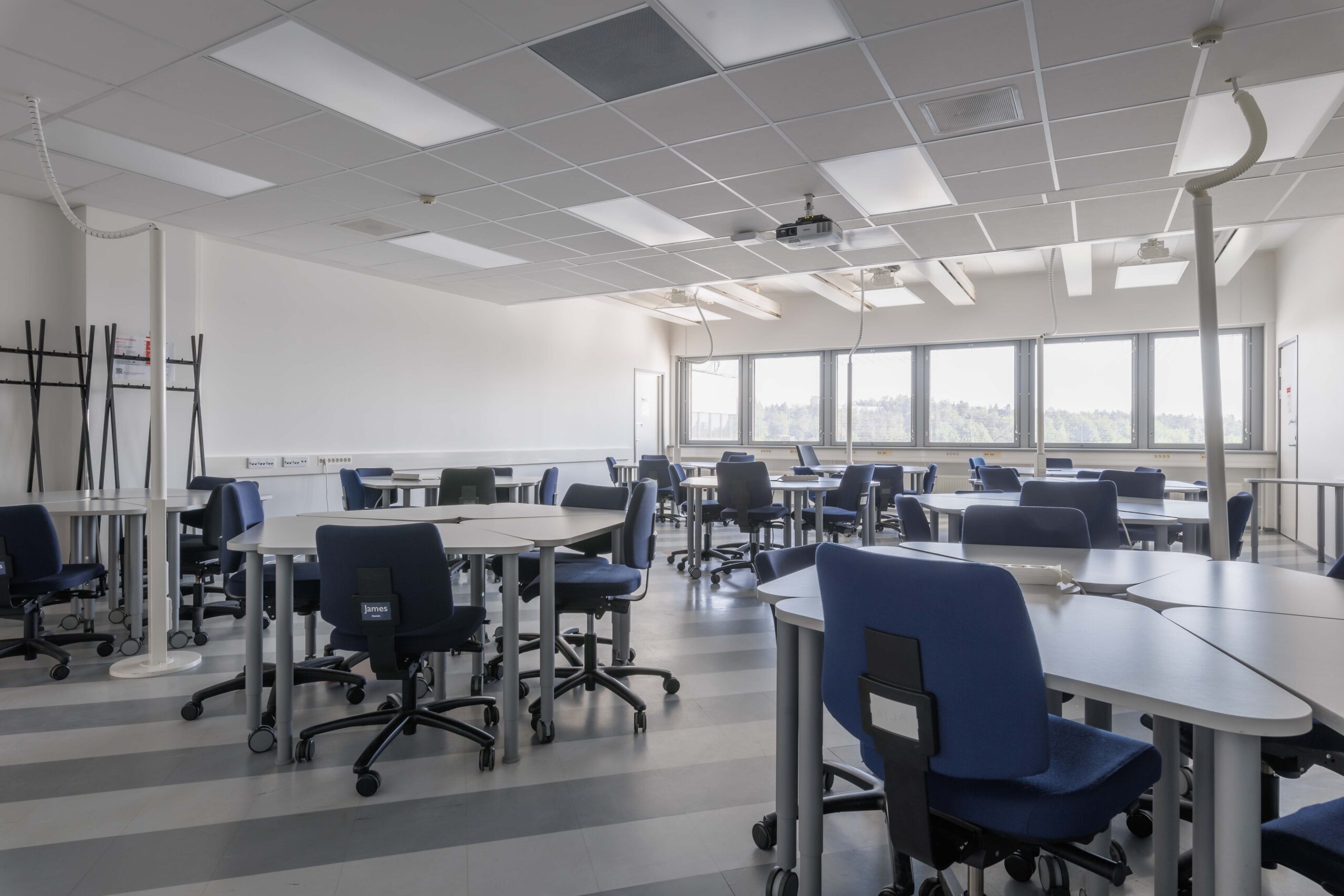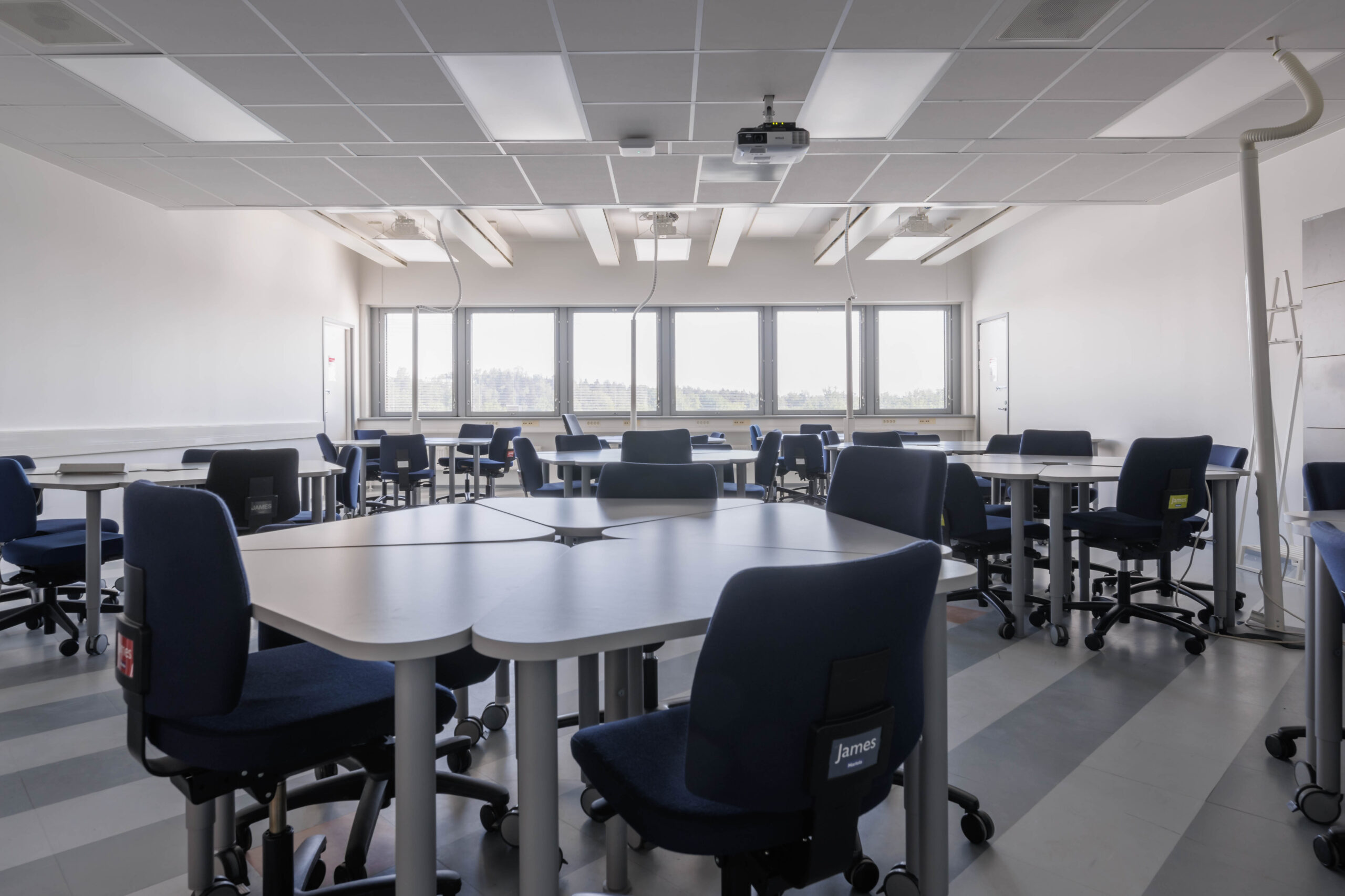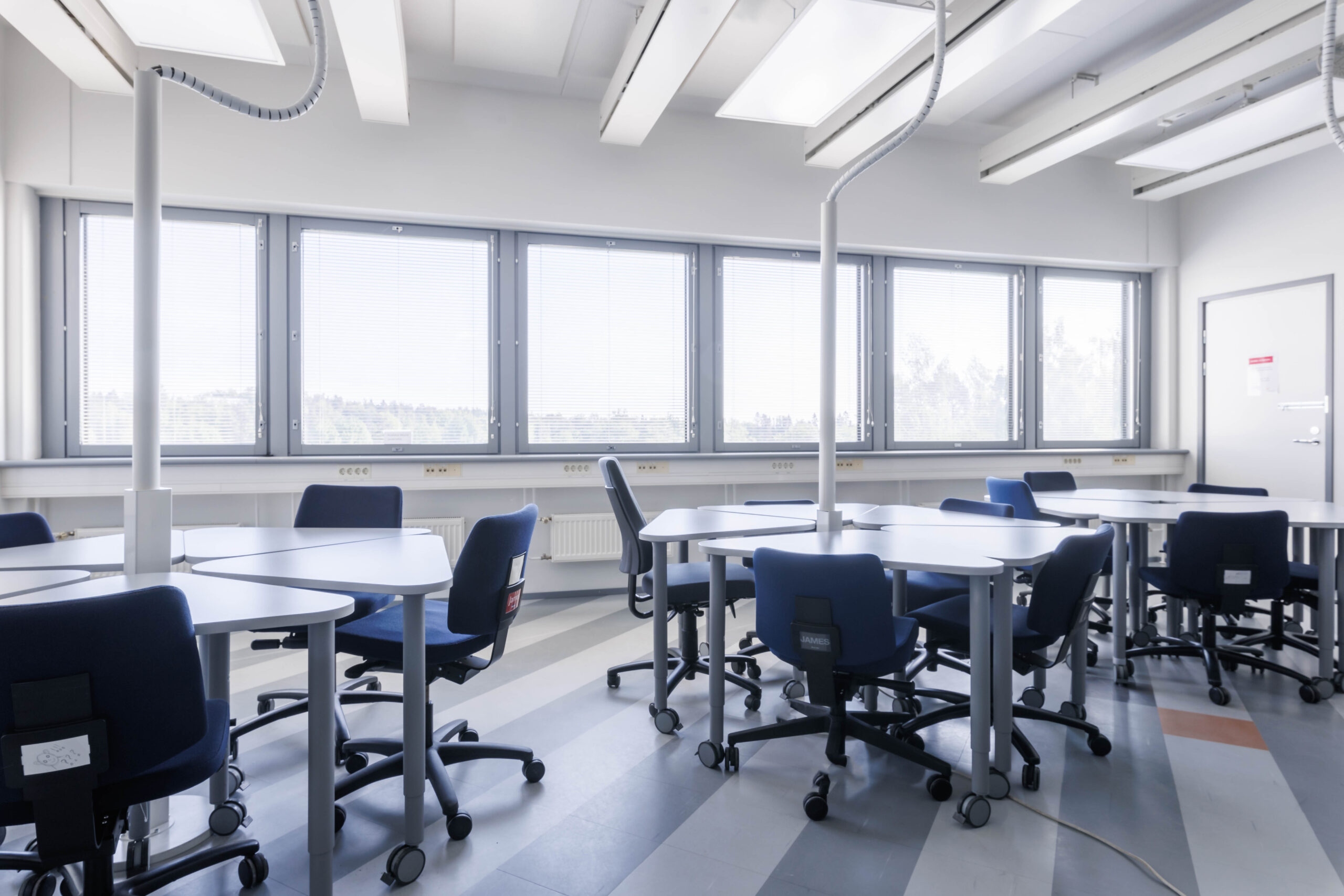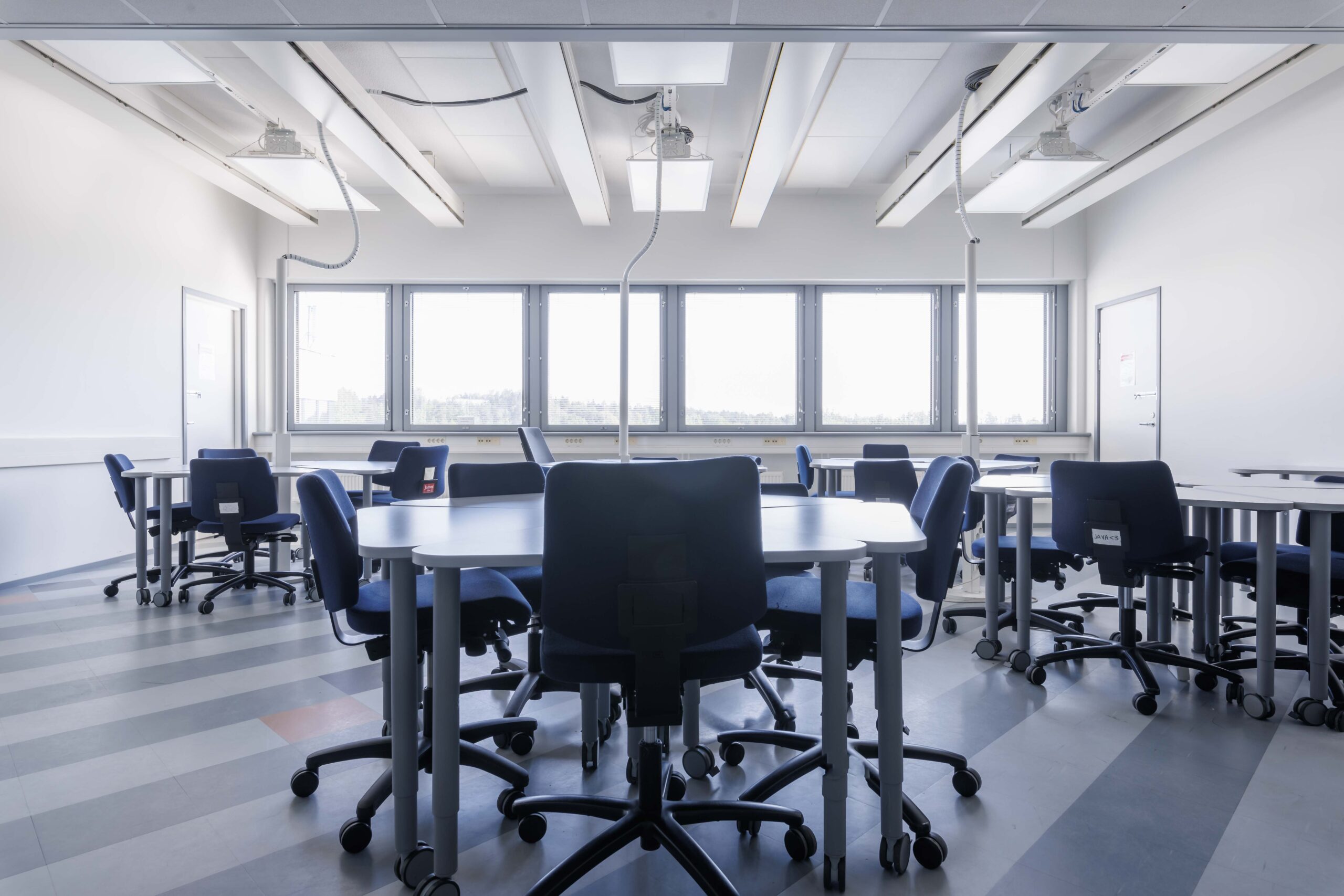 Yhden hengen pöydät tuoleilla. Tilassa etäprojektori.