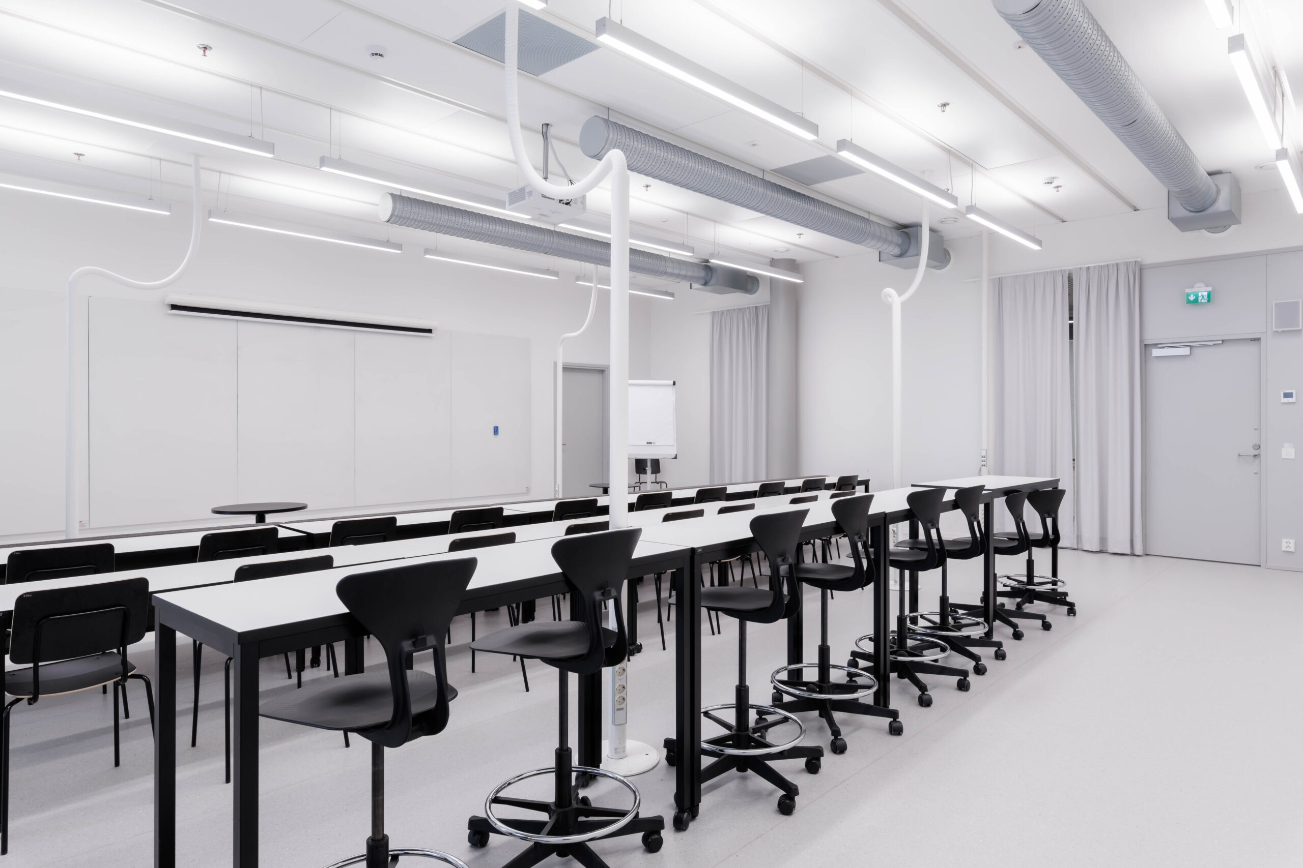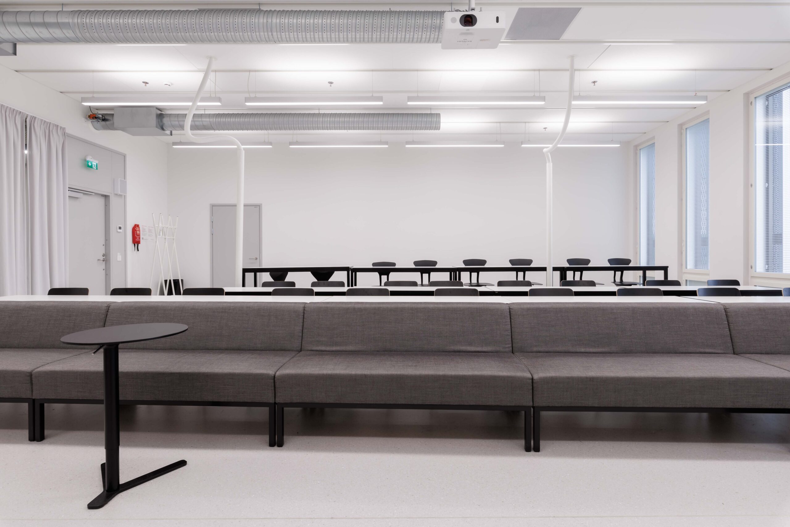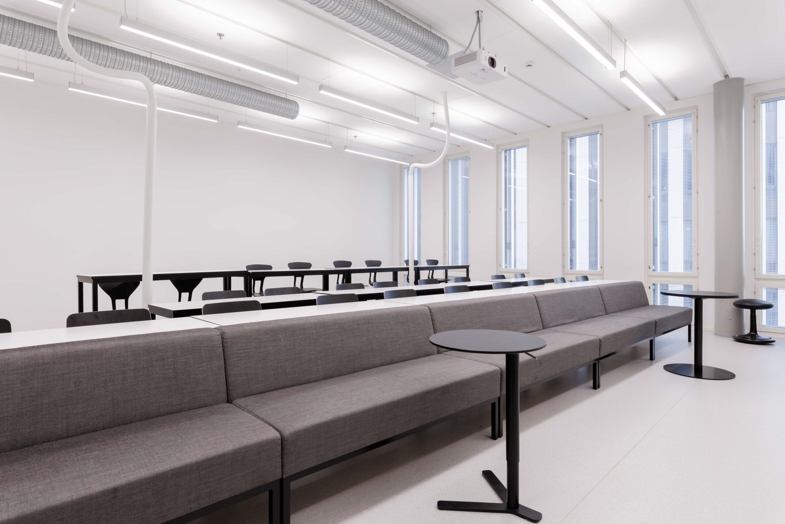 Porrastettu kalustus. Sohvat, sohvapöydät, eri korkuisia luentopöytiä, koulutuoleja, aktiivituoleja, pyörällisiä tuoleja. Tilassa etäprojektori.