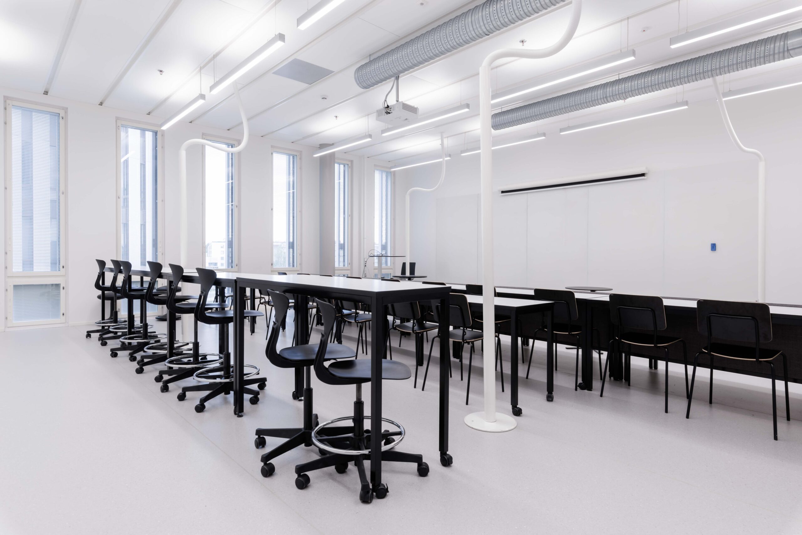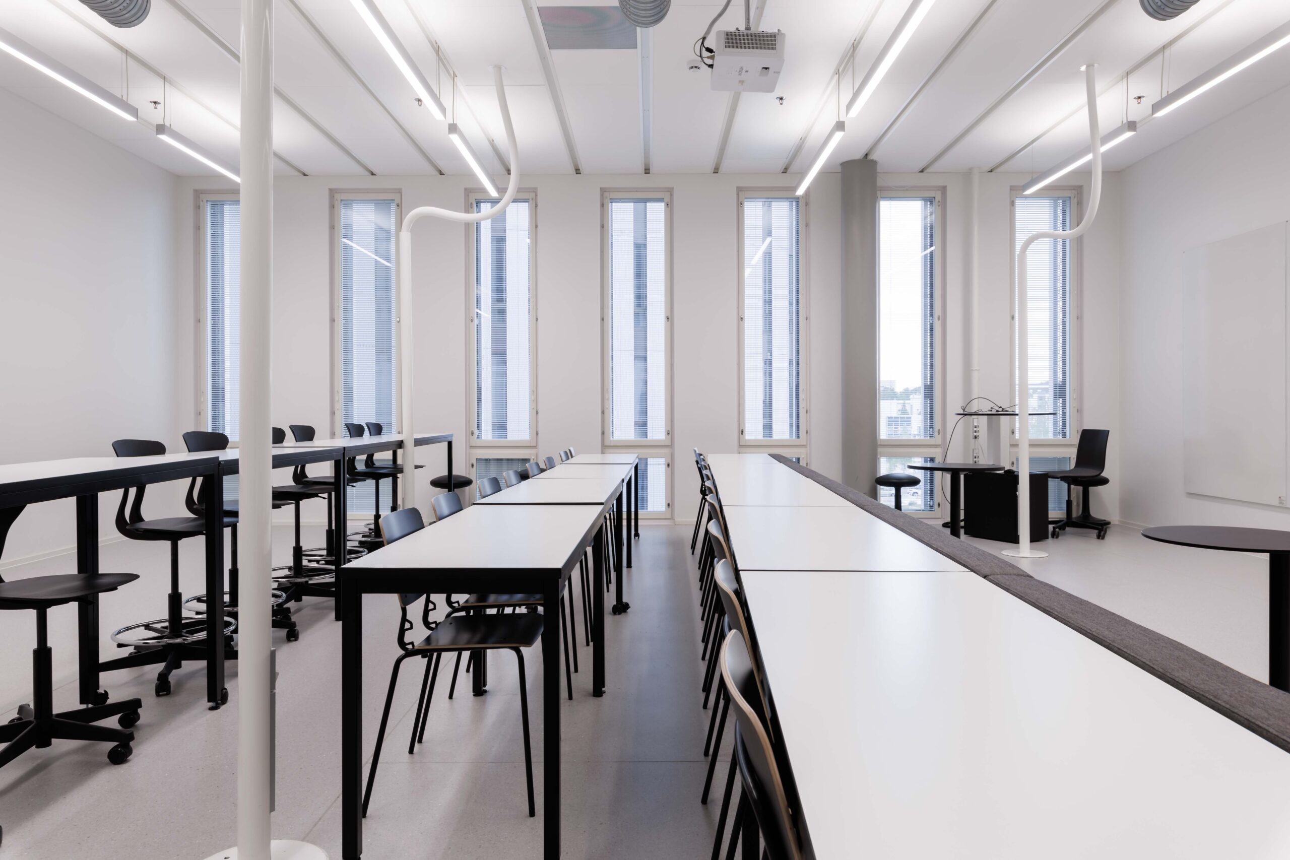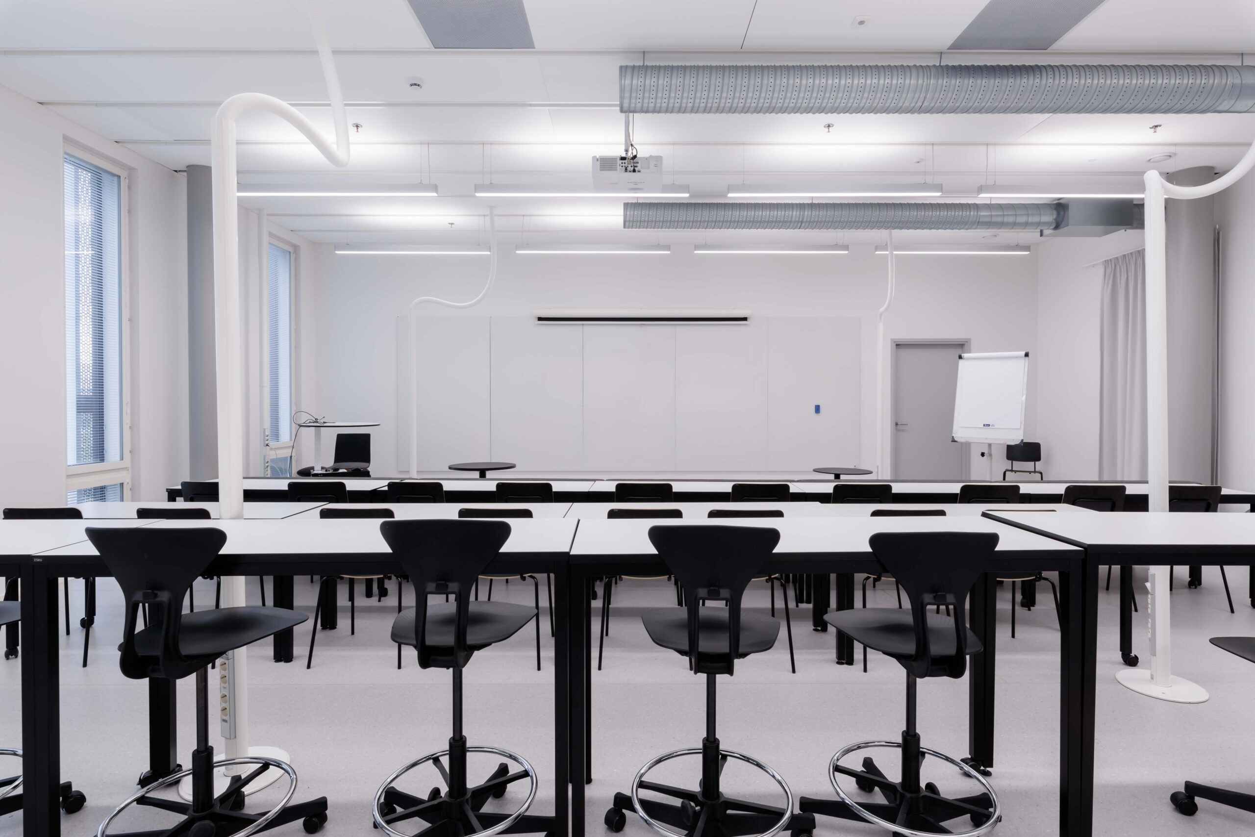 Porrastettu kalustus. Sohvat, sohvapöydät, eri korkuisia luentopöytiä, koulutuoleja, aktiivituoleja, pyörällisiä tuoleja. Tilassa etäprojektori.