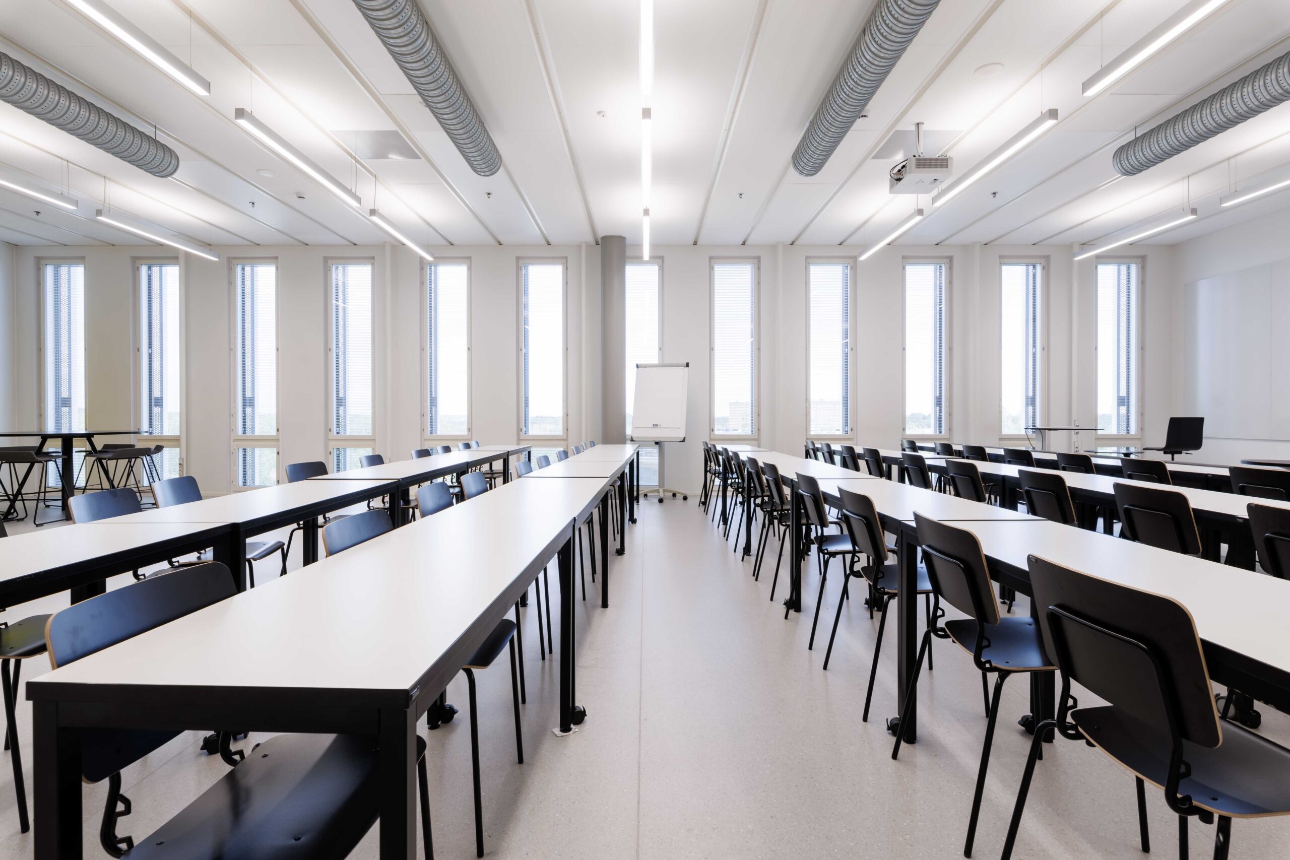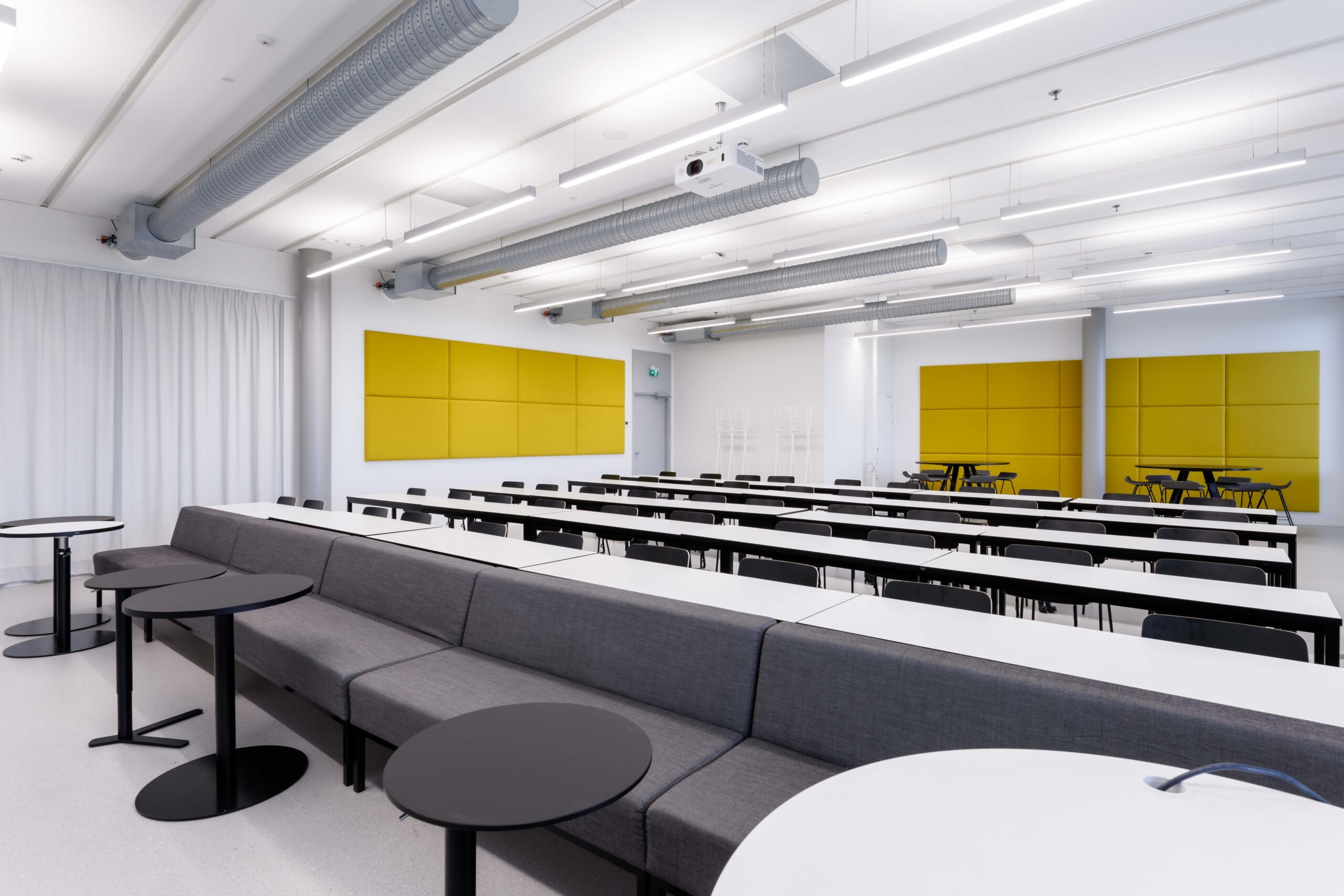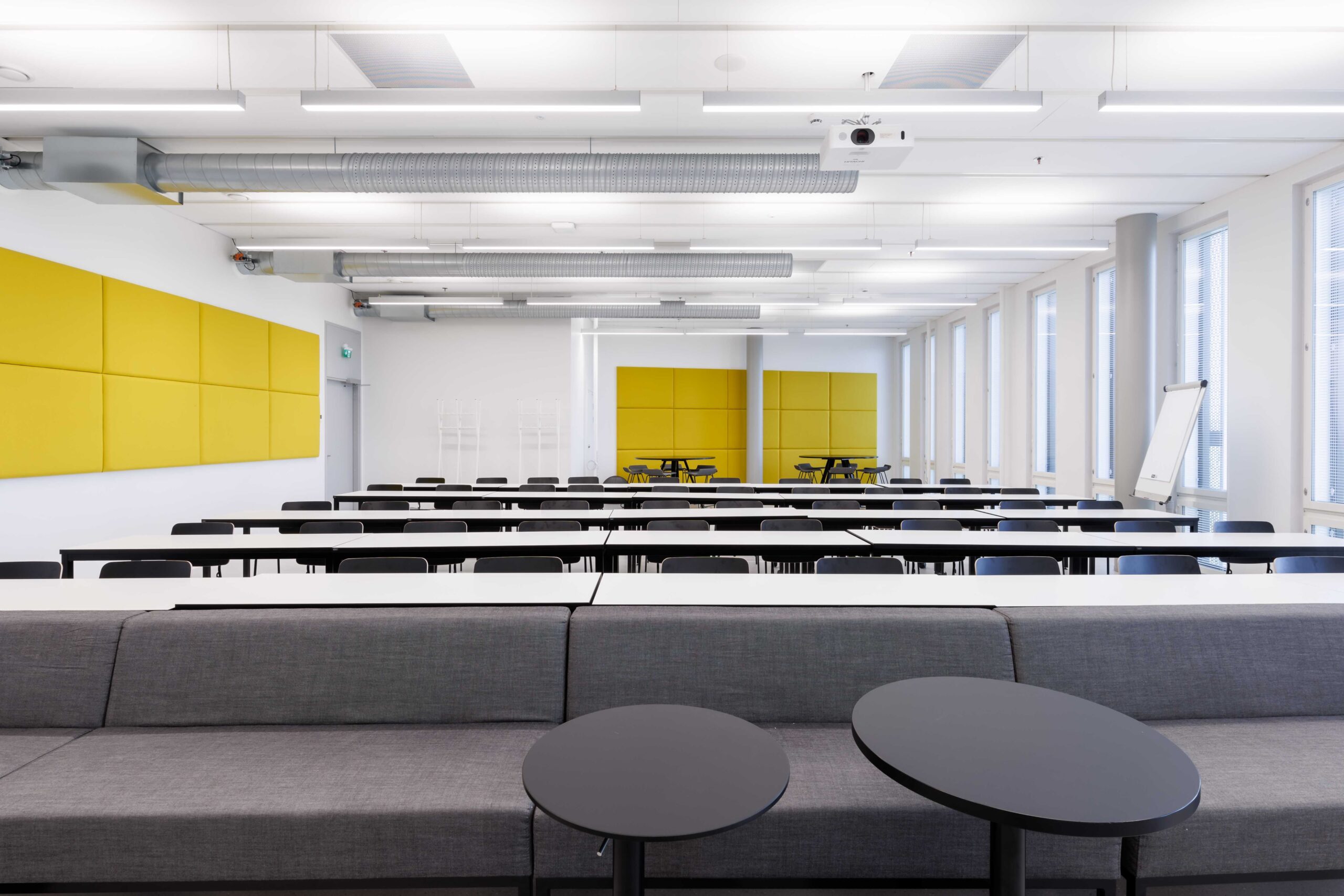 Porrastettu kalustus. Sohvat, sohvapöydät, eri korkuisia luentopöytiä, koulutuoleja,