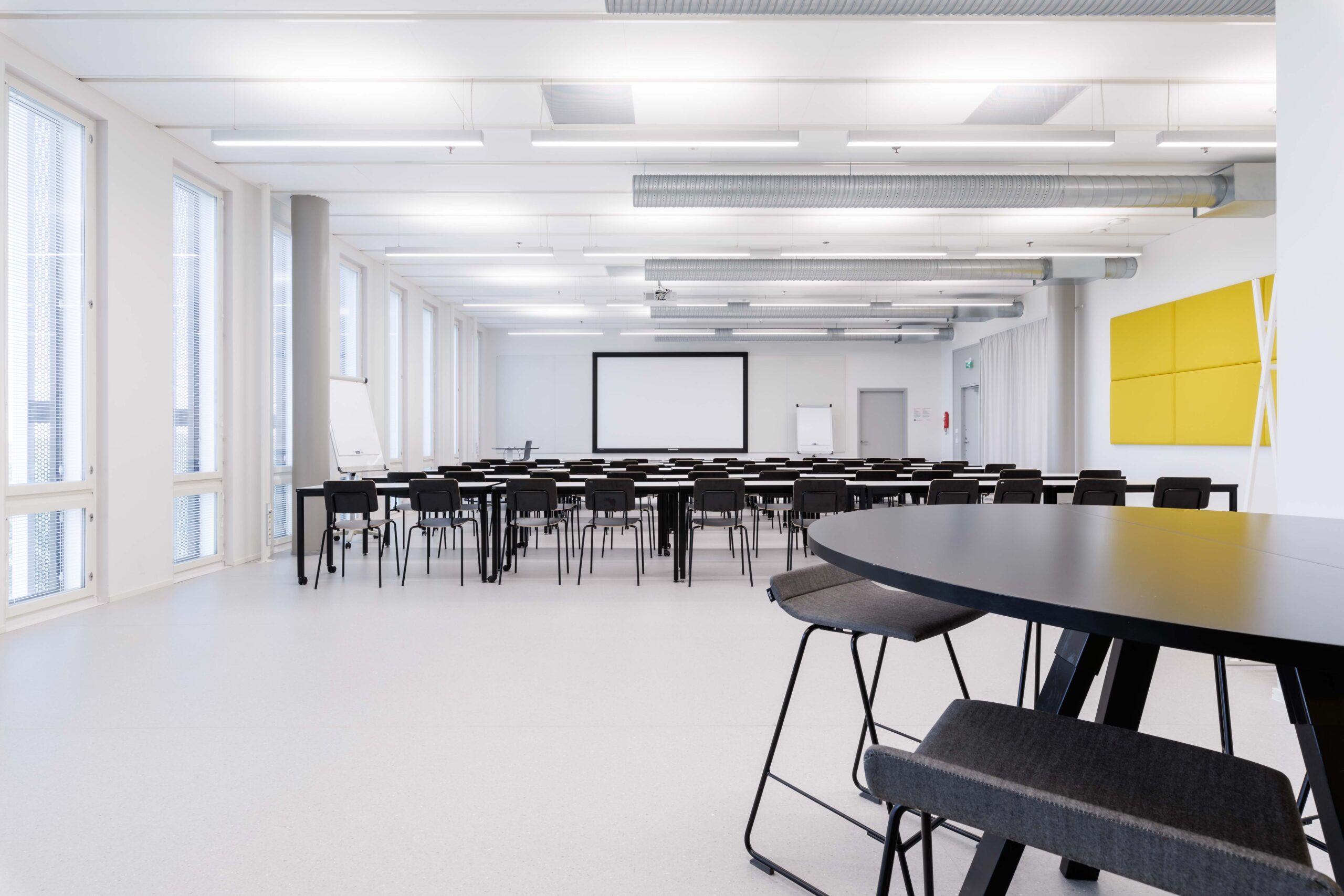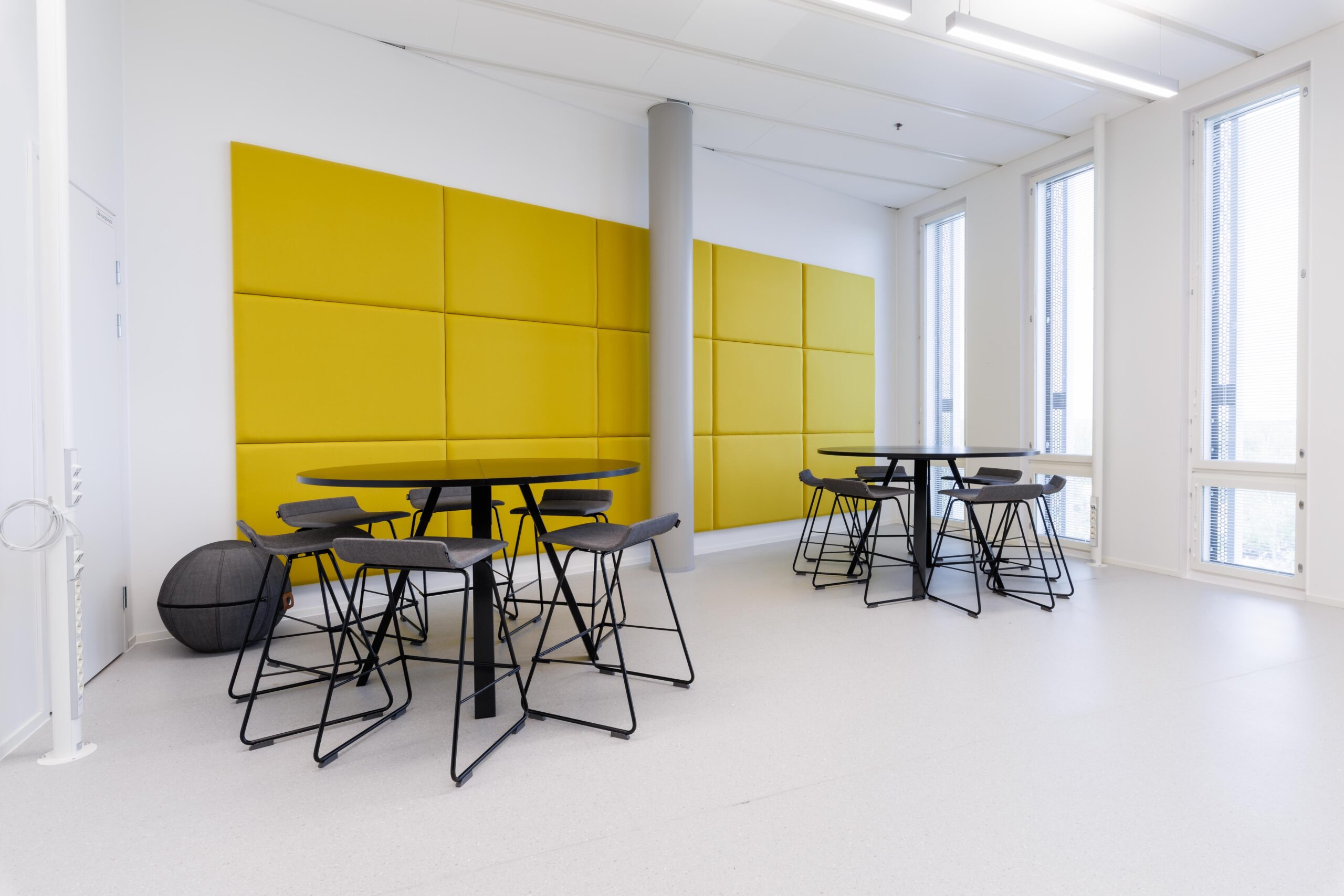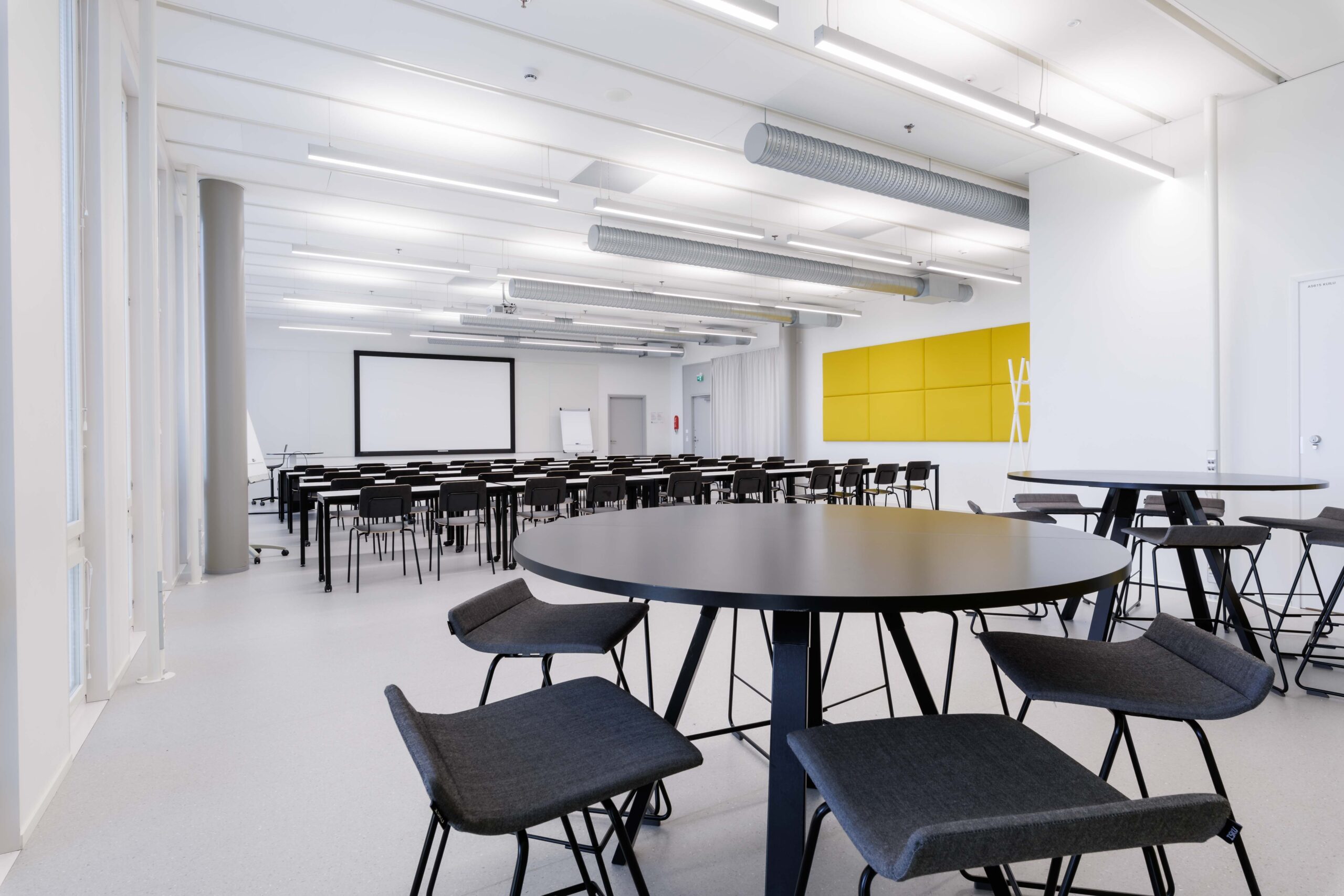 2kpl korkeita pyöreitä pöytiä + baarijakkarat. Tilassa etäprojektori.
