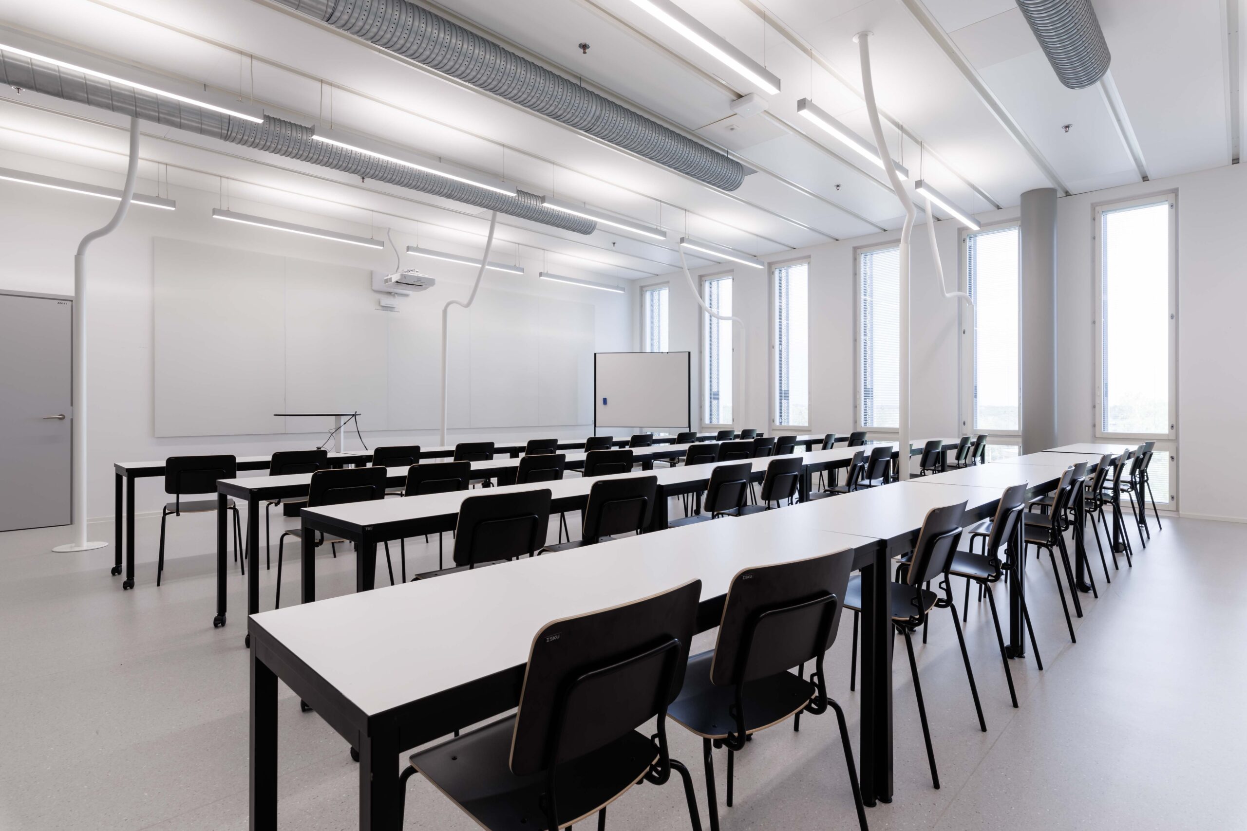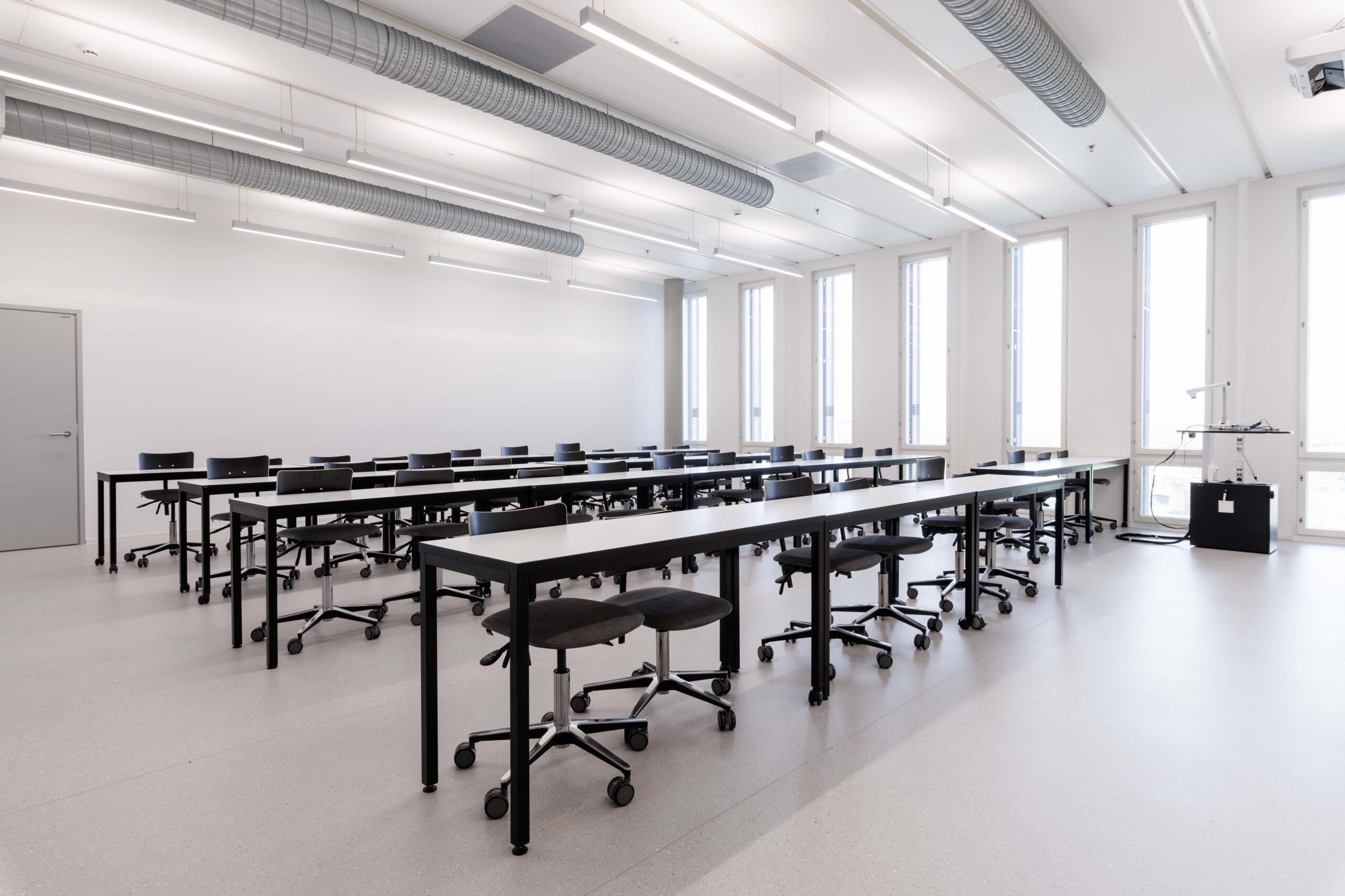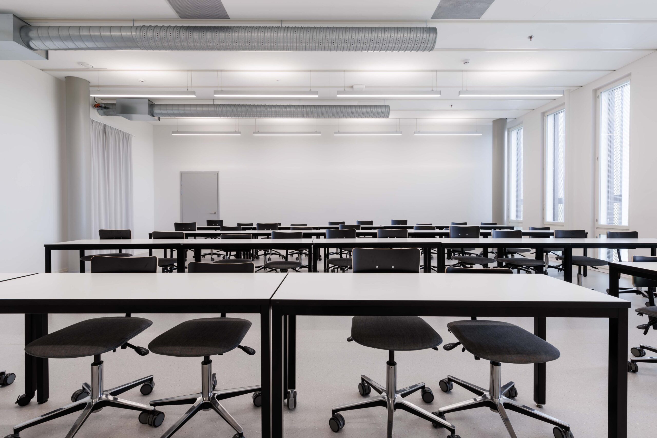 Korkeat pöydät ja tuolit, tilassa lähiprojektori.