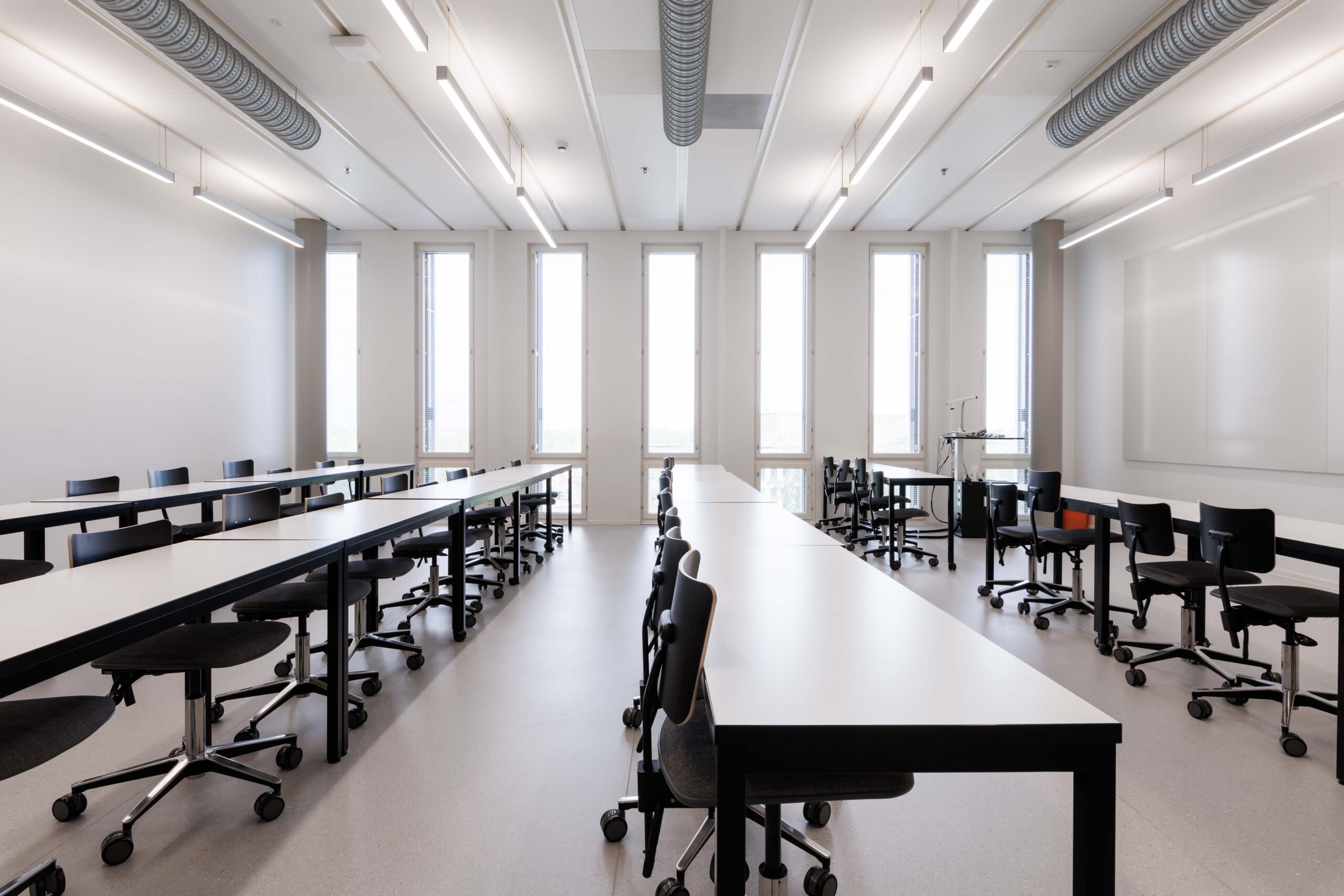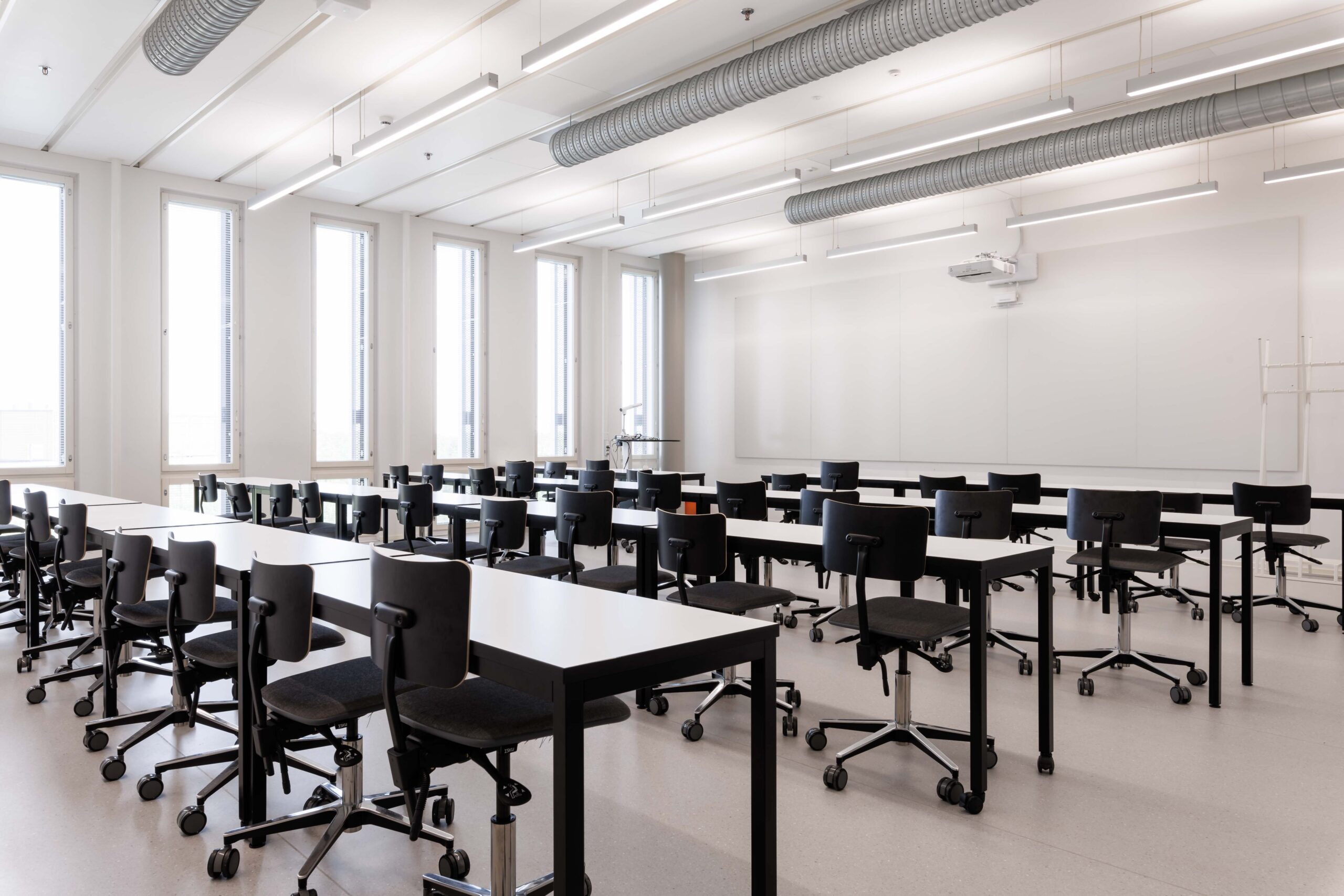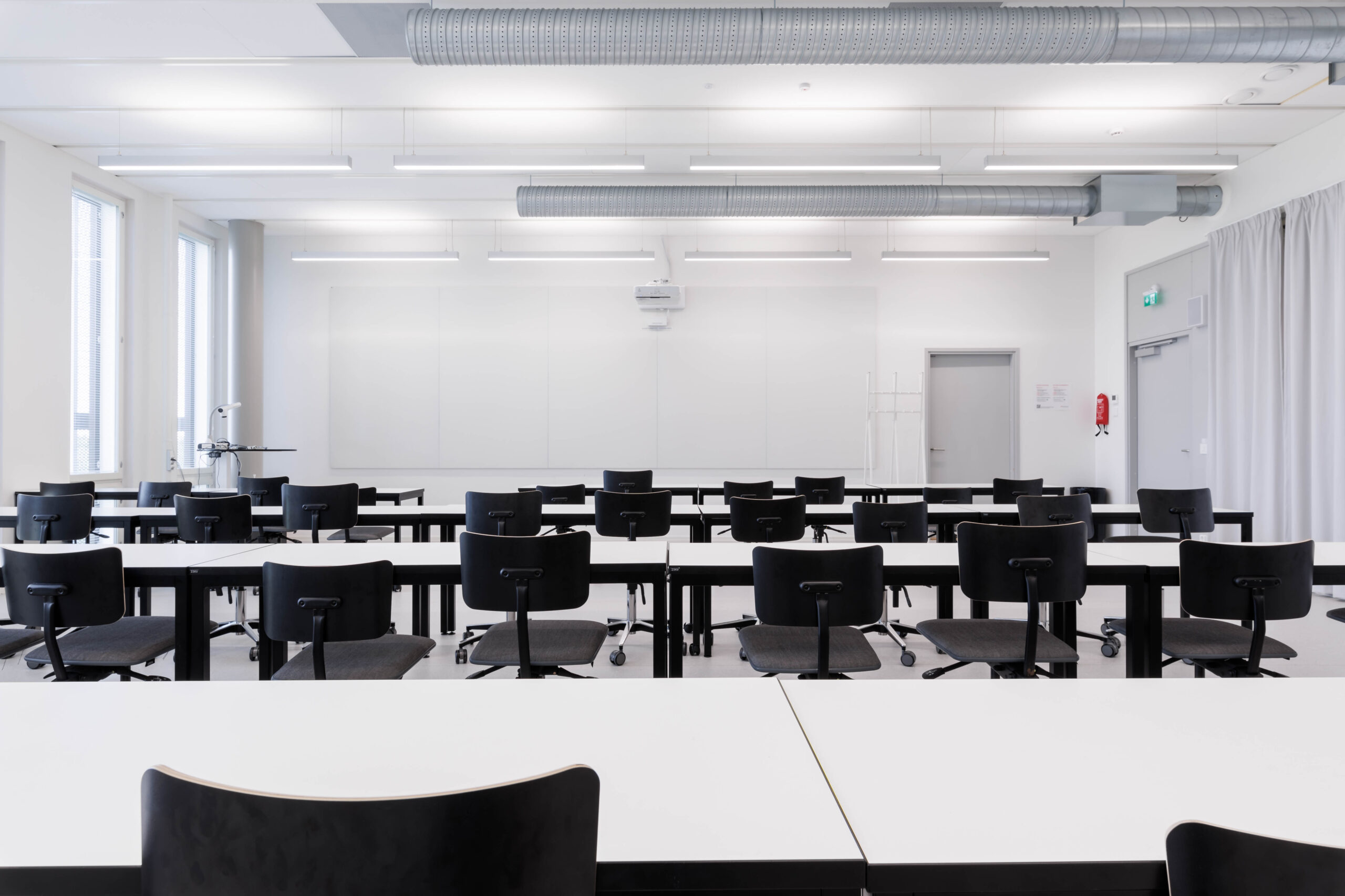 Korkeat pöydät ja tuolit, tilassa lähiprojektori.