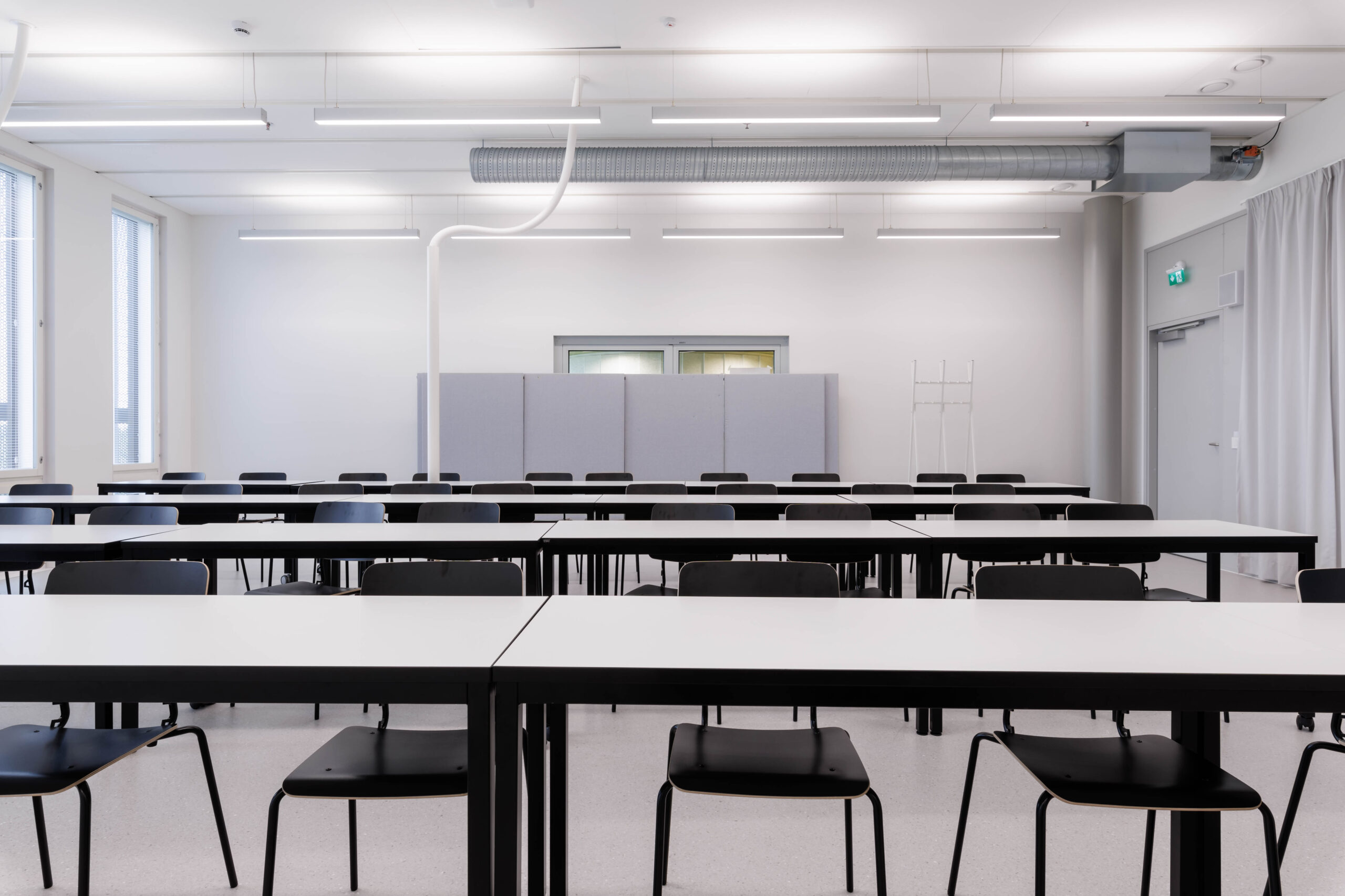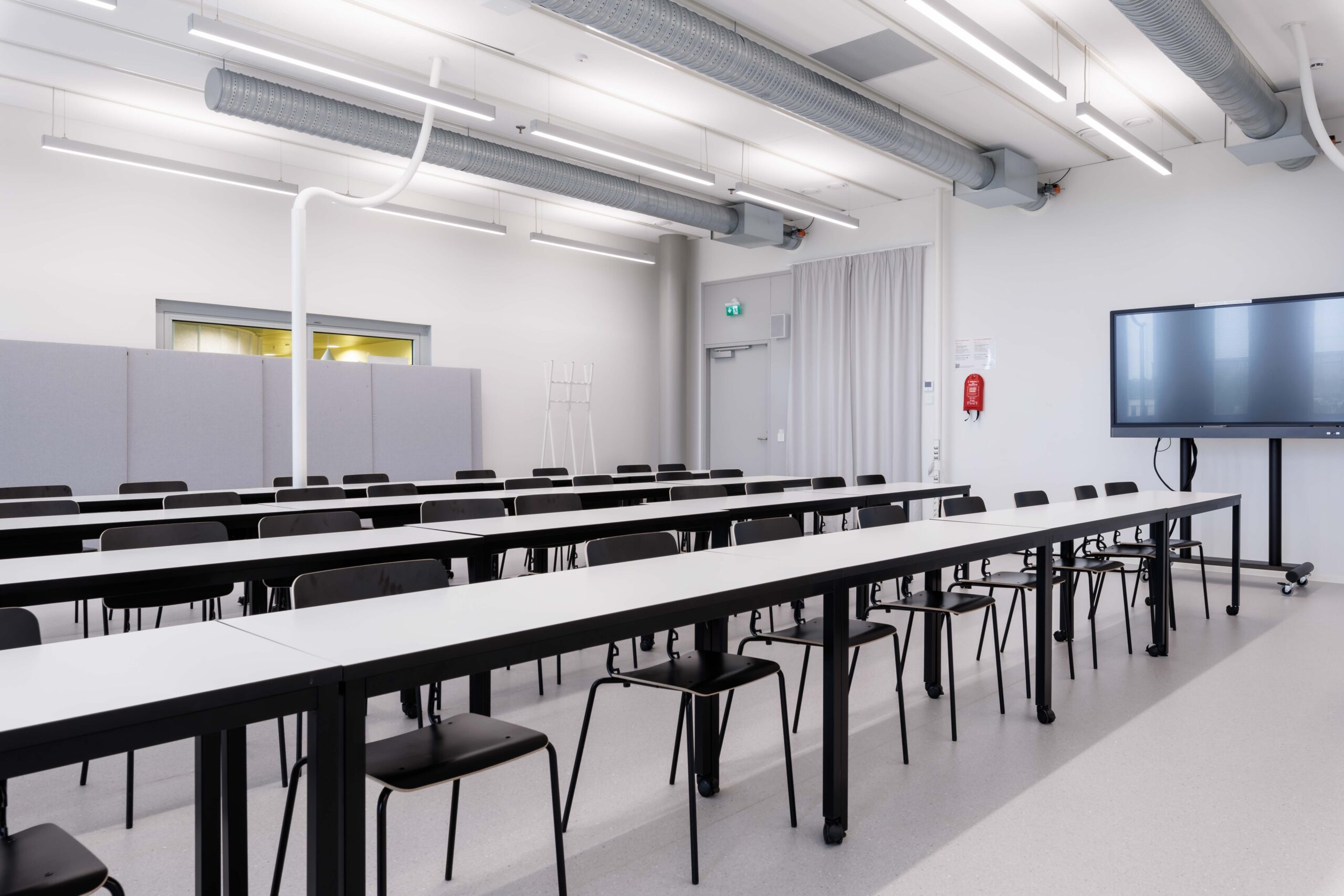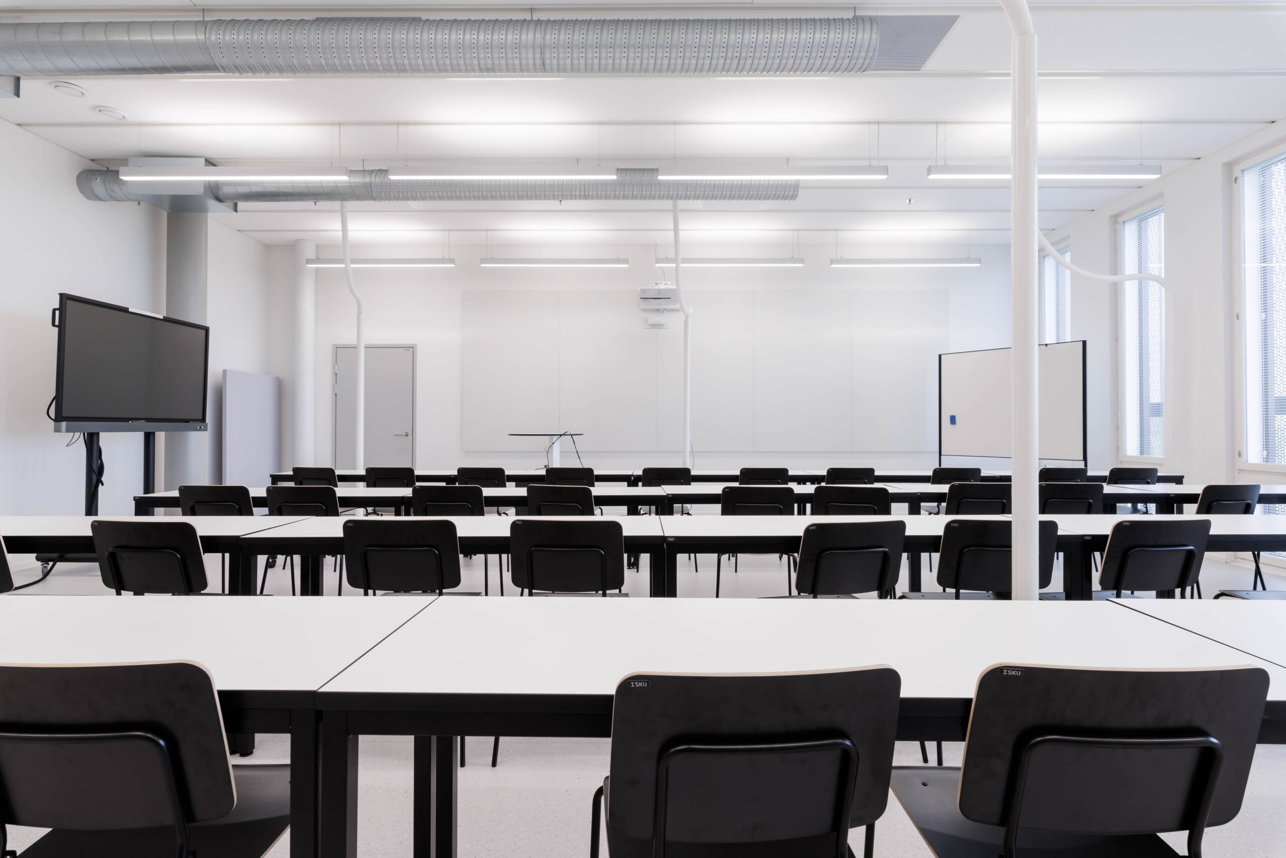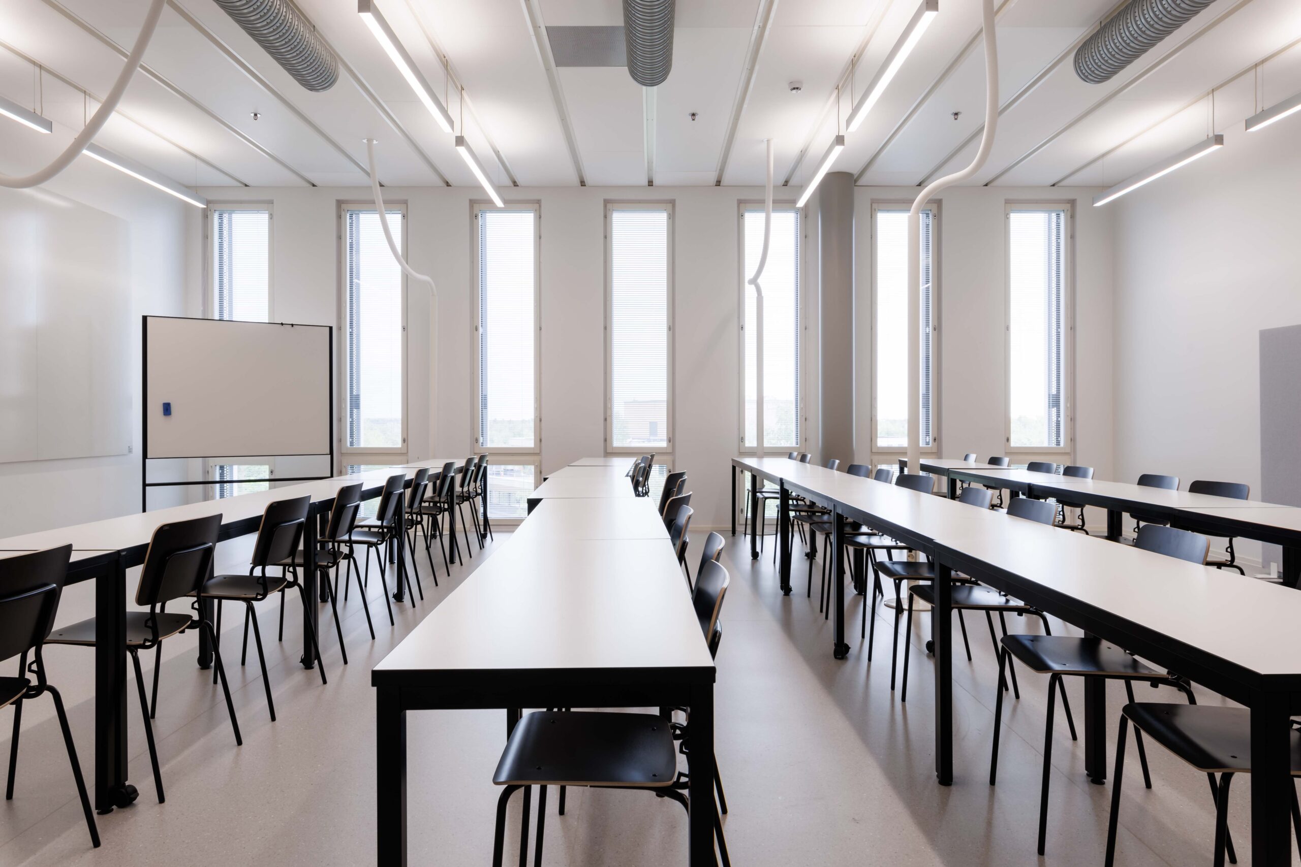 Kahden hengen pöydät tuoleilla, tilassa lähiprojektori.