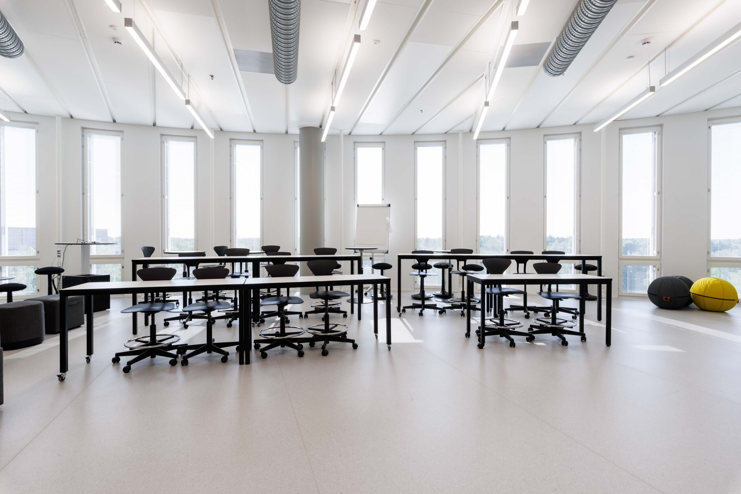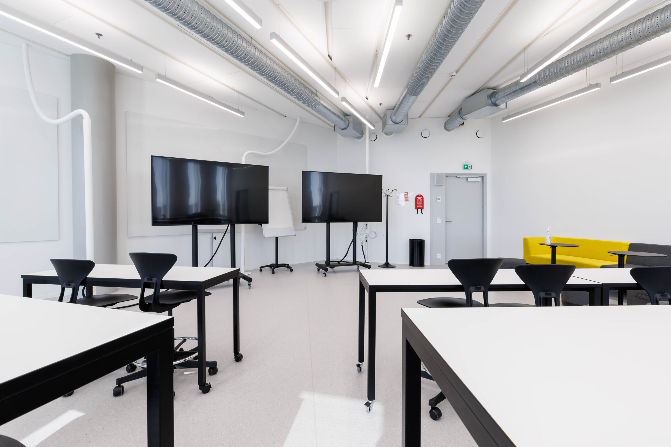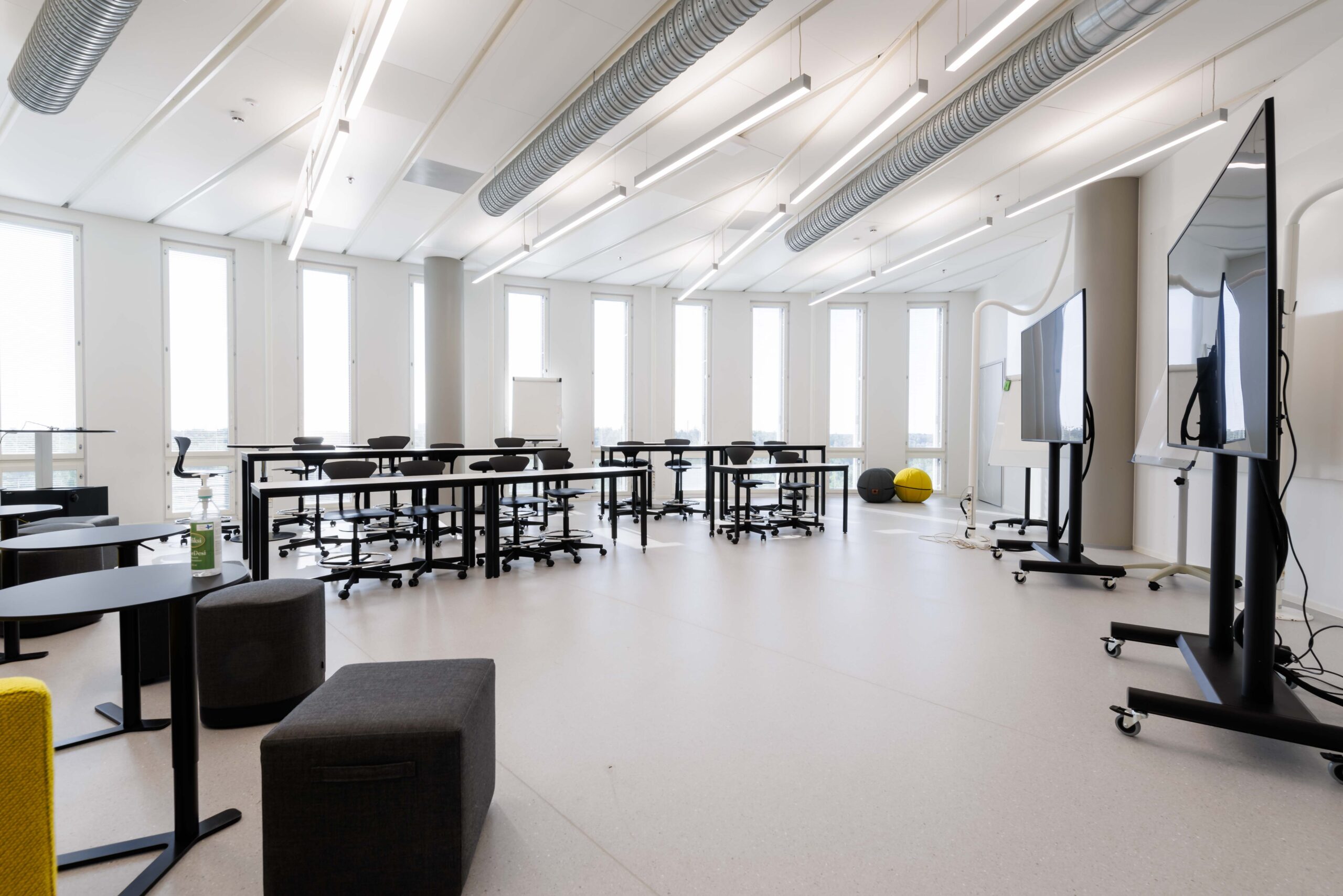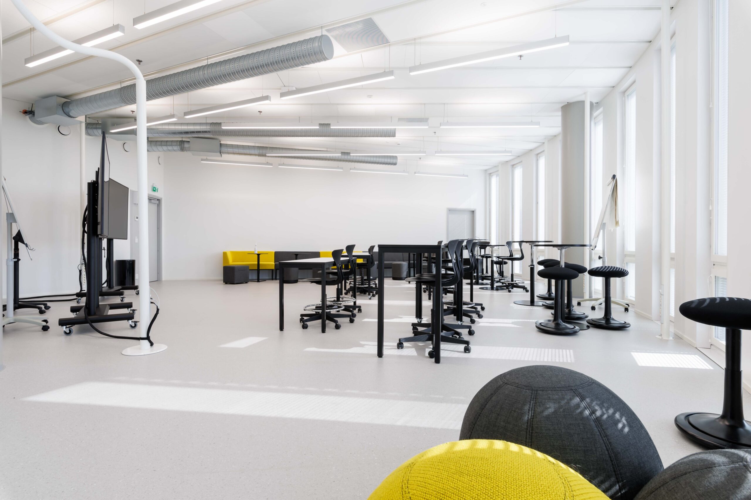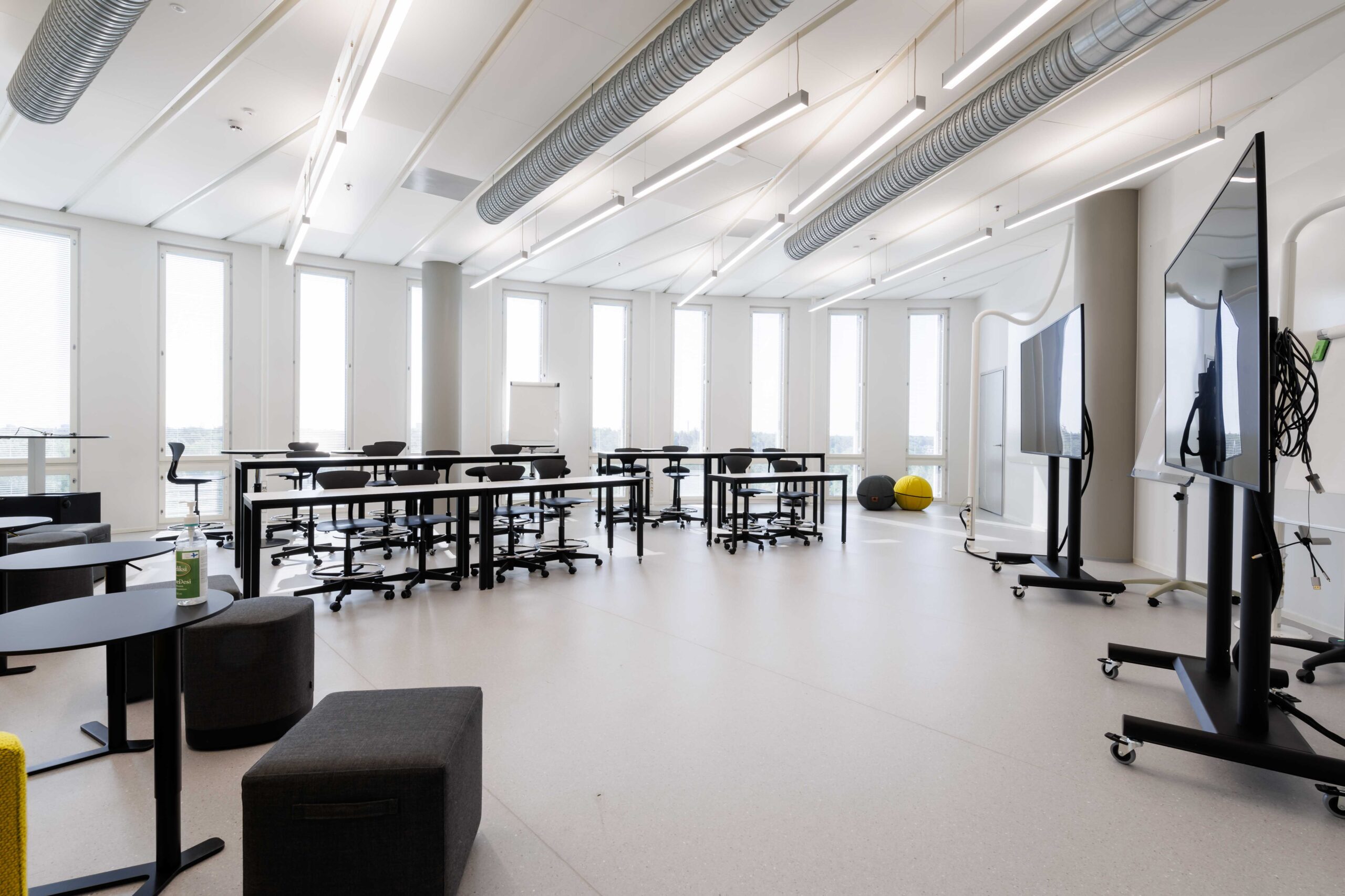 Porrastettu kalustus. Sohvat, sohvapöydät, eri korkuisia luentopöytiä, koulutuoleja, aktiivituoleja, pyörällisiä tuoleja. Tilassa kaksi esitysnäyttöä