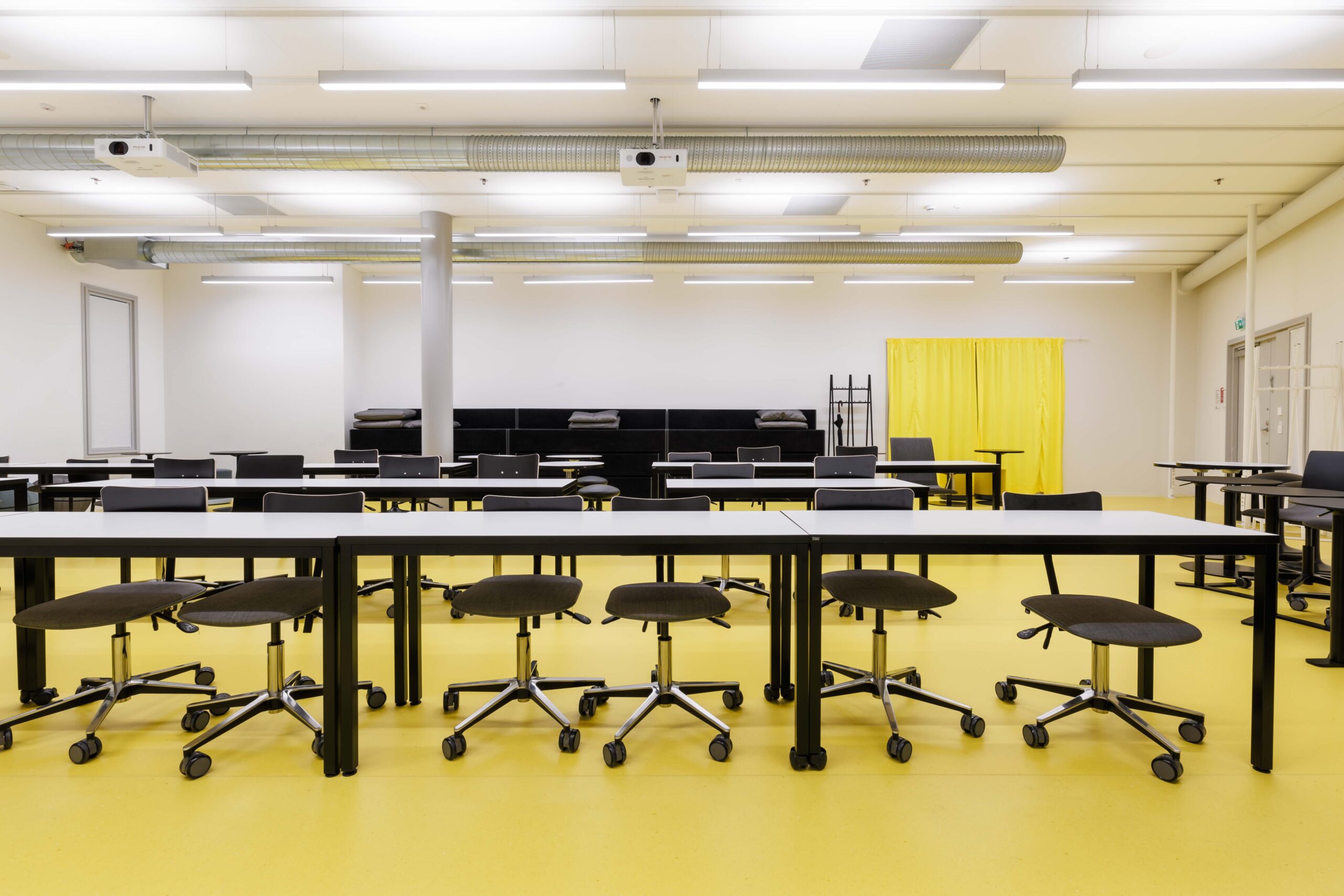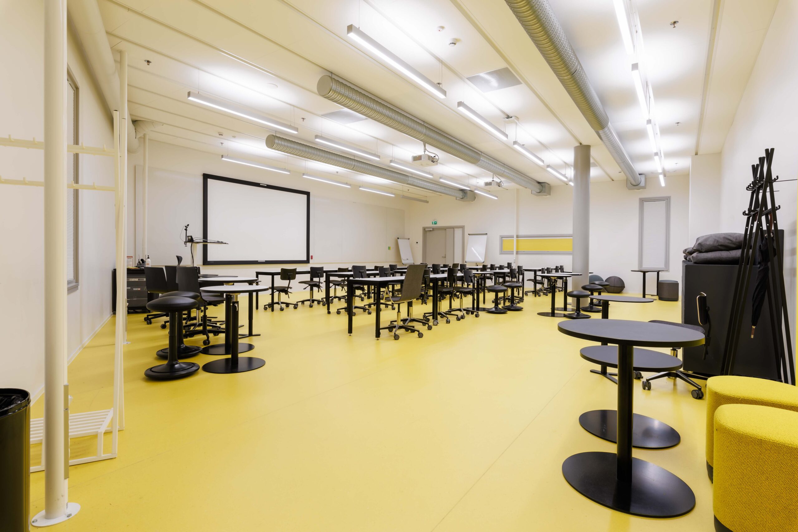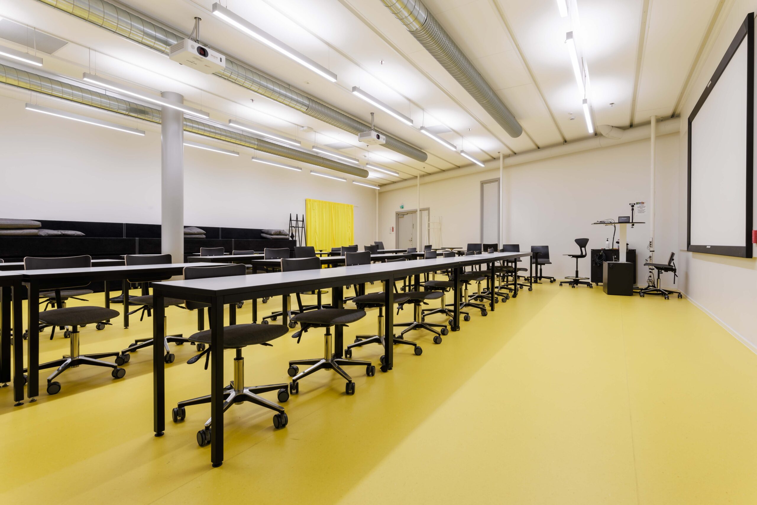 Kahden hengen pöydät tuoleilla ja Beatbox-katsomokaluste (2kpl), tilassa etäprojektori.