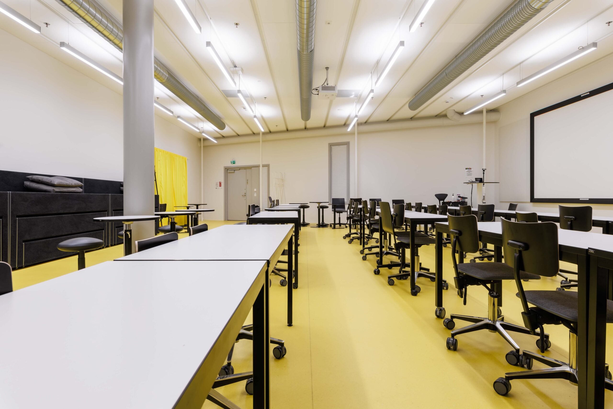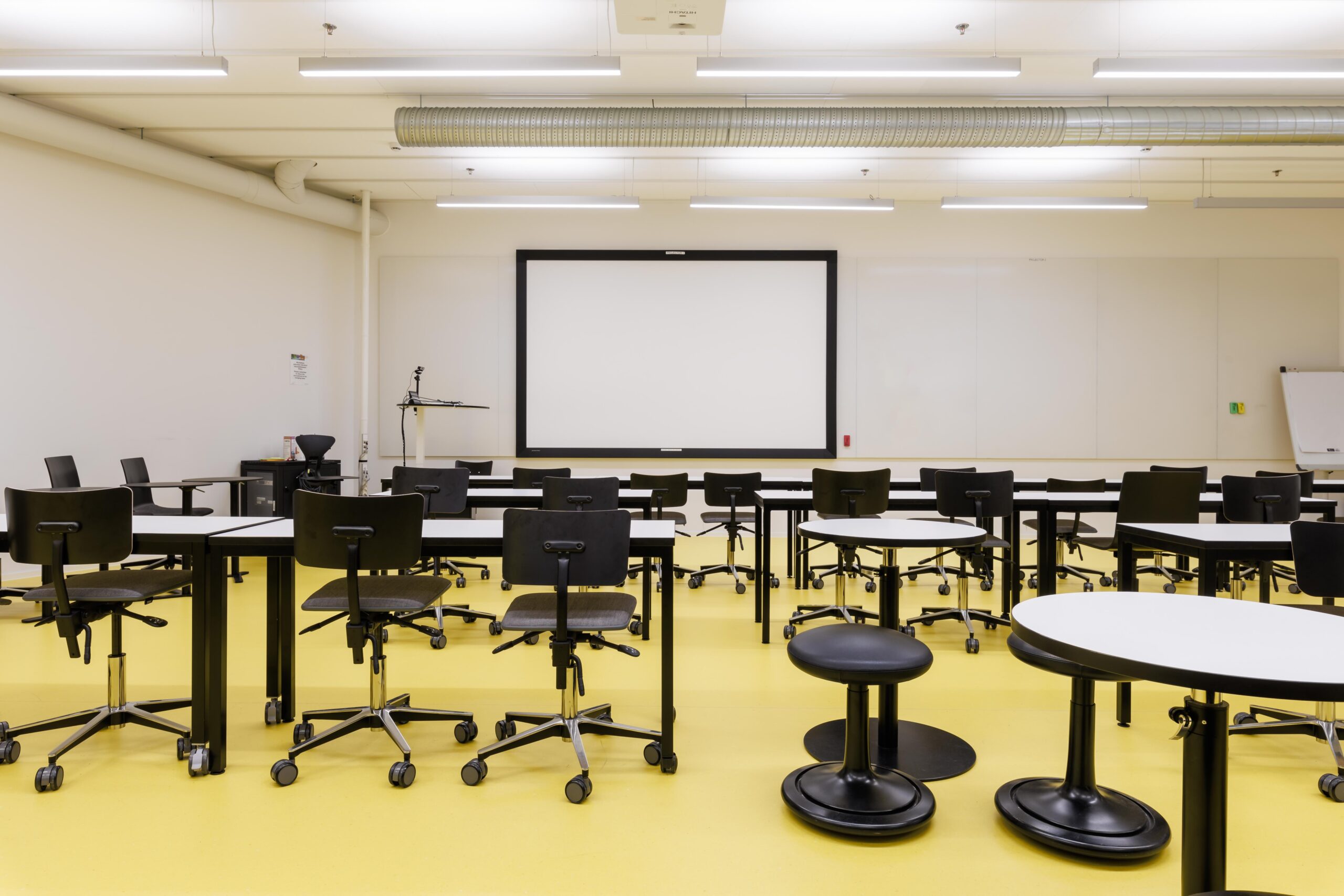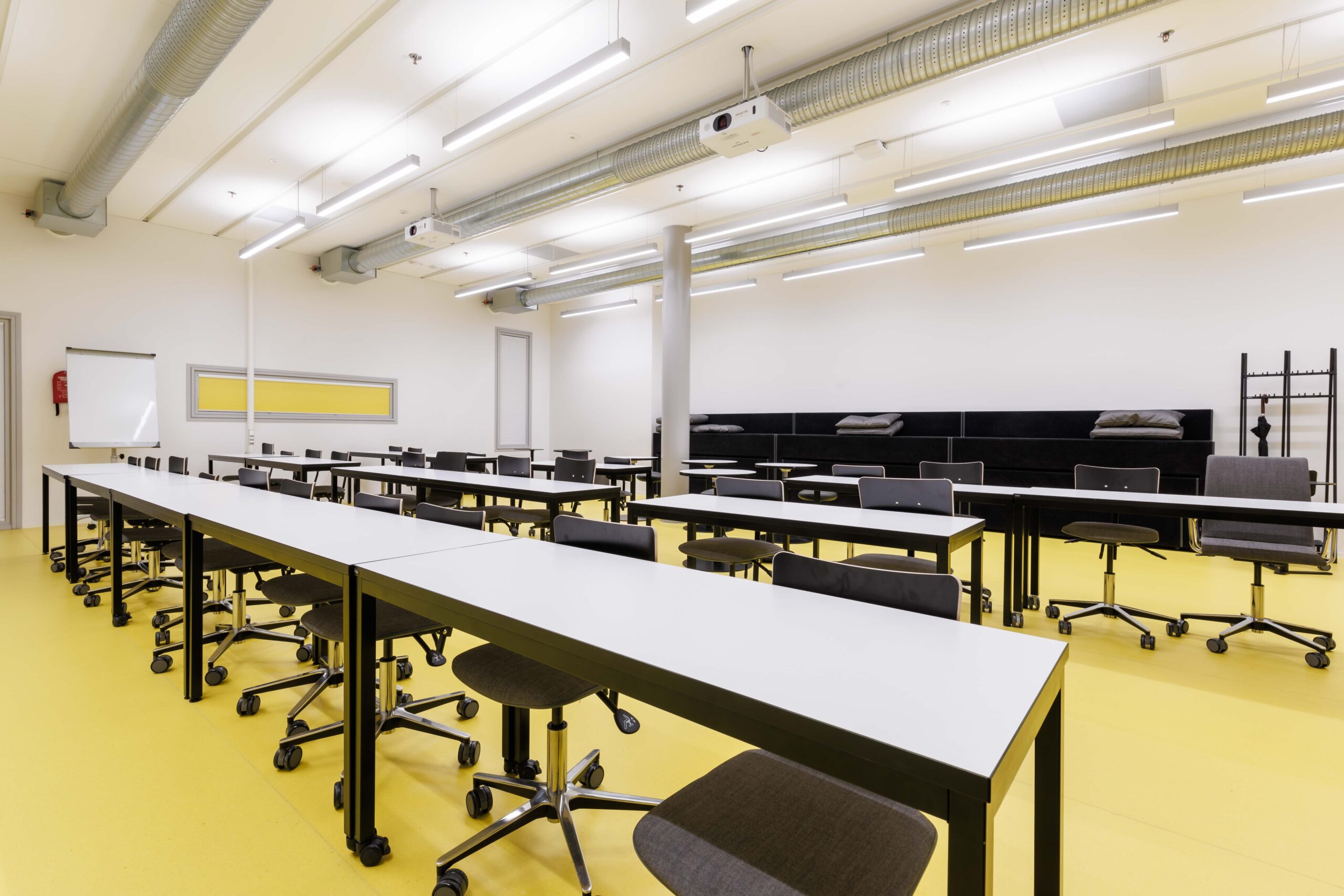 Kahden hengen pöydät tuoleilla ja Beatbox-katsomokaluste (2kpl), tilassa etäprojektori.