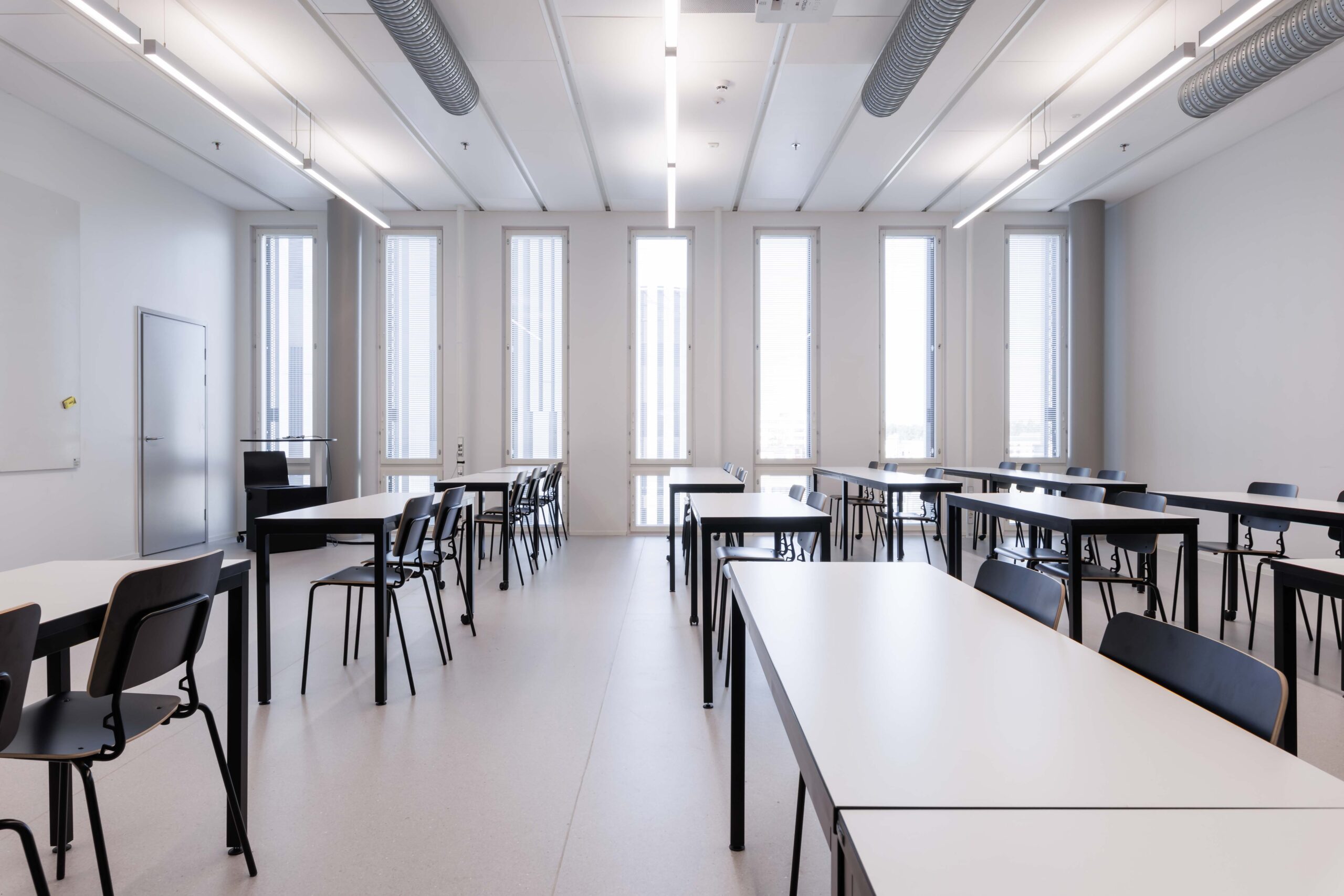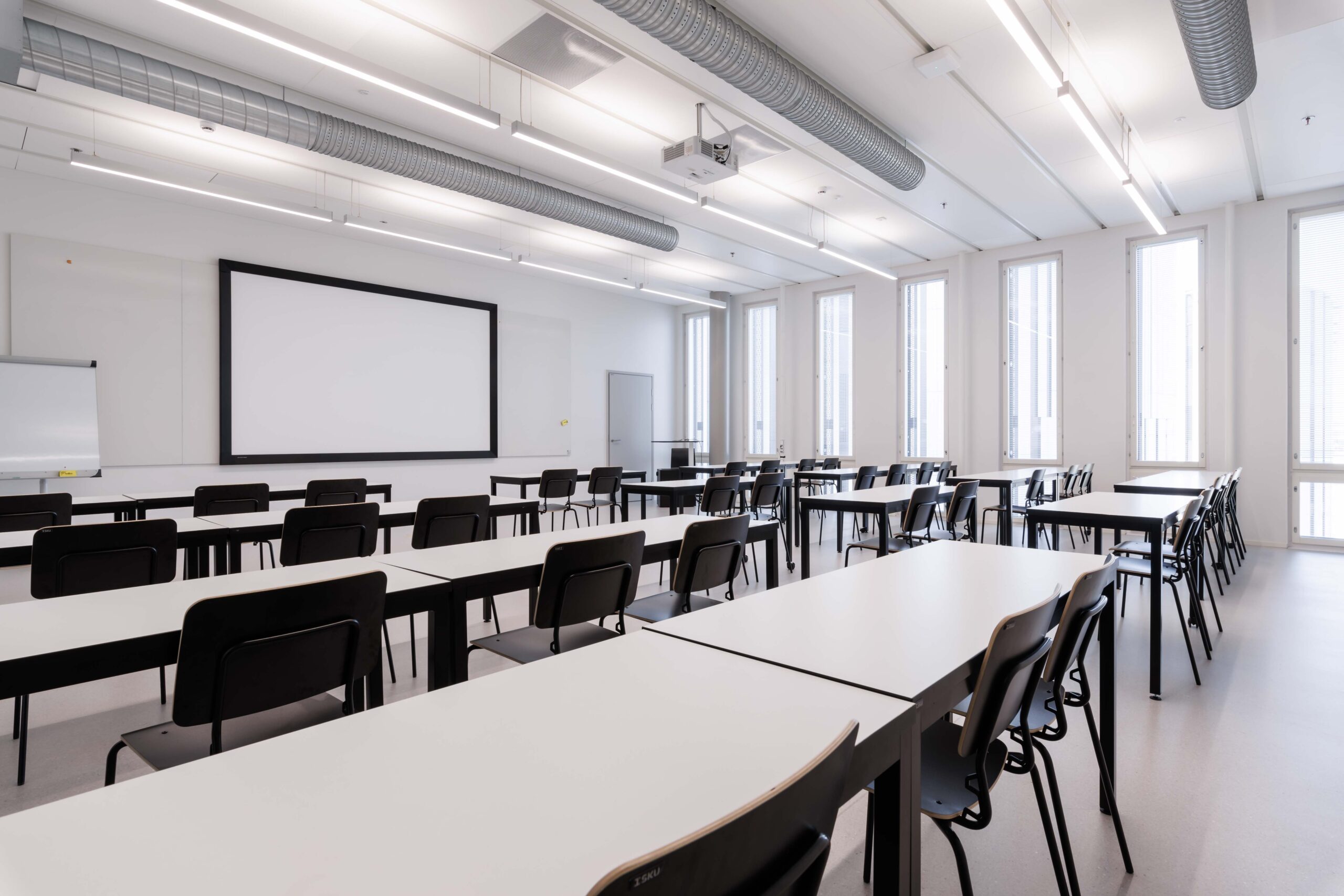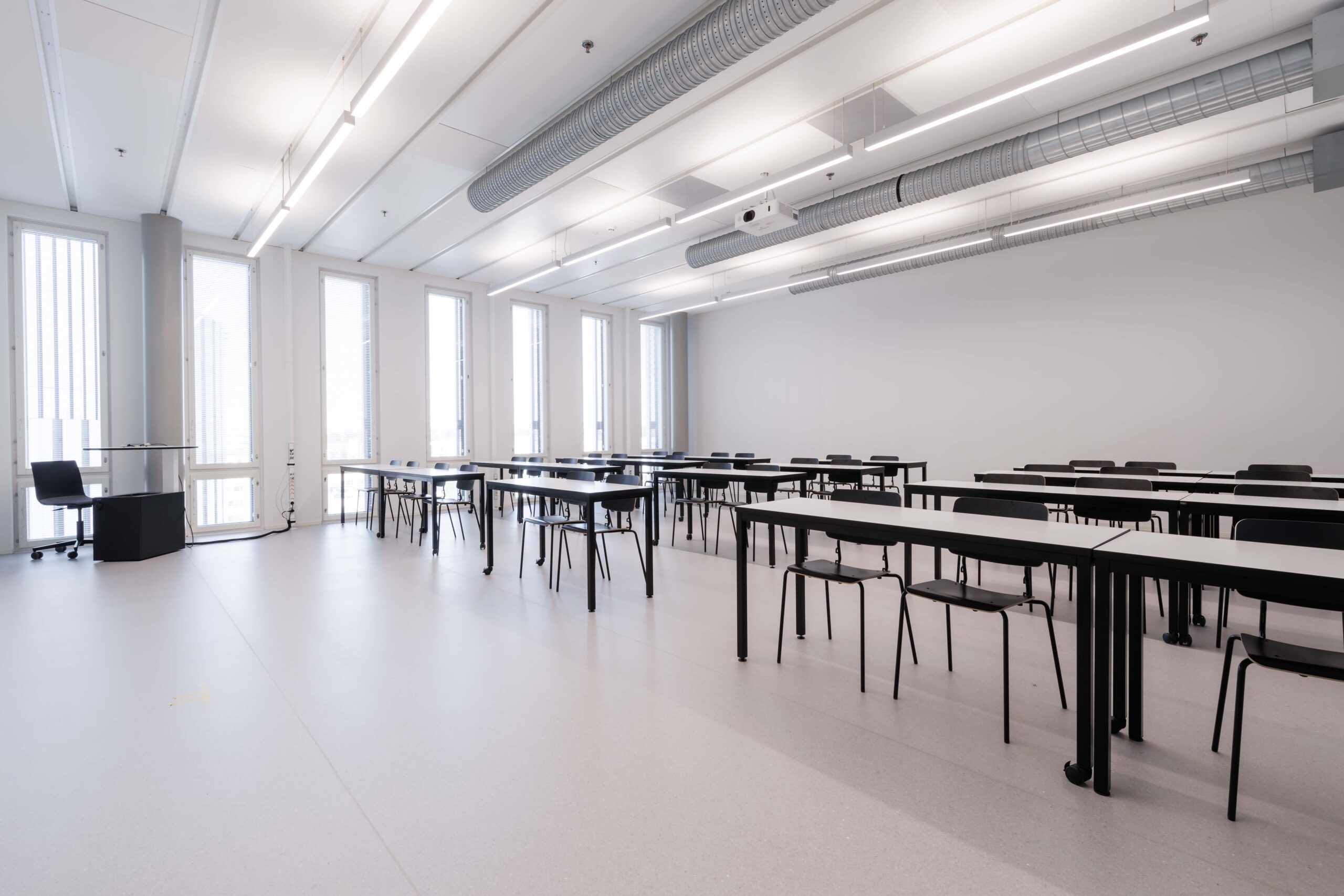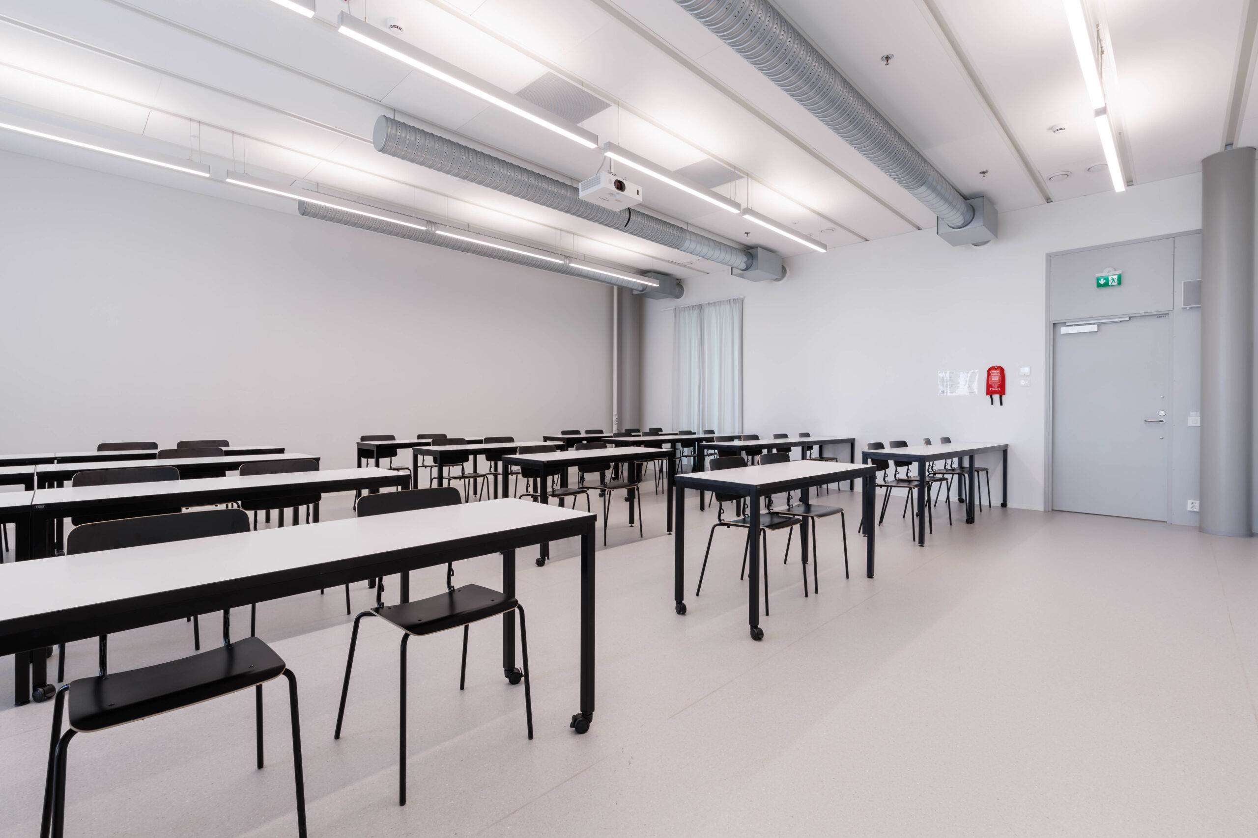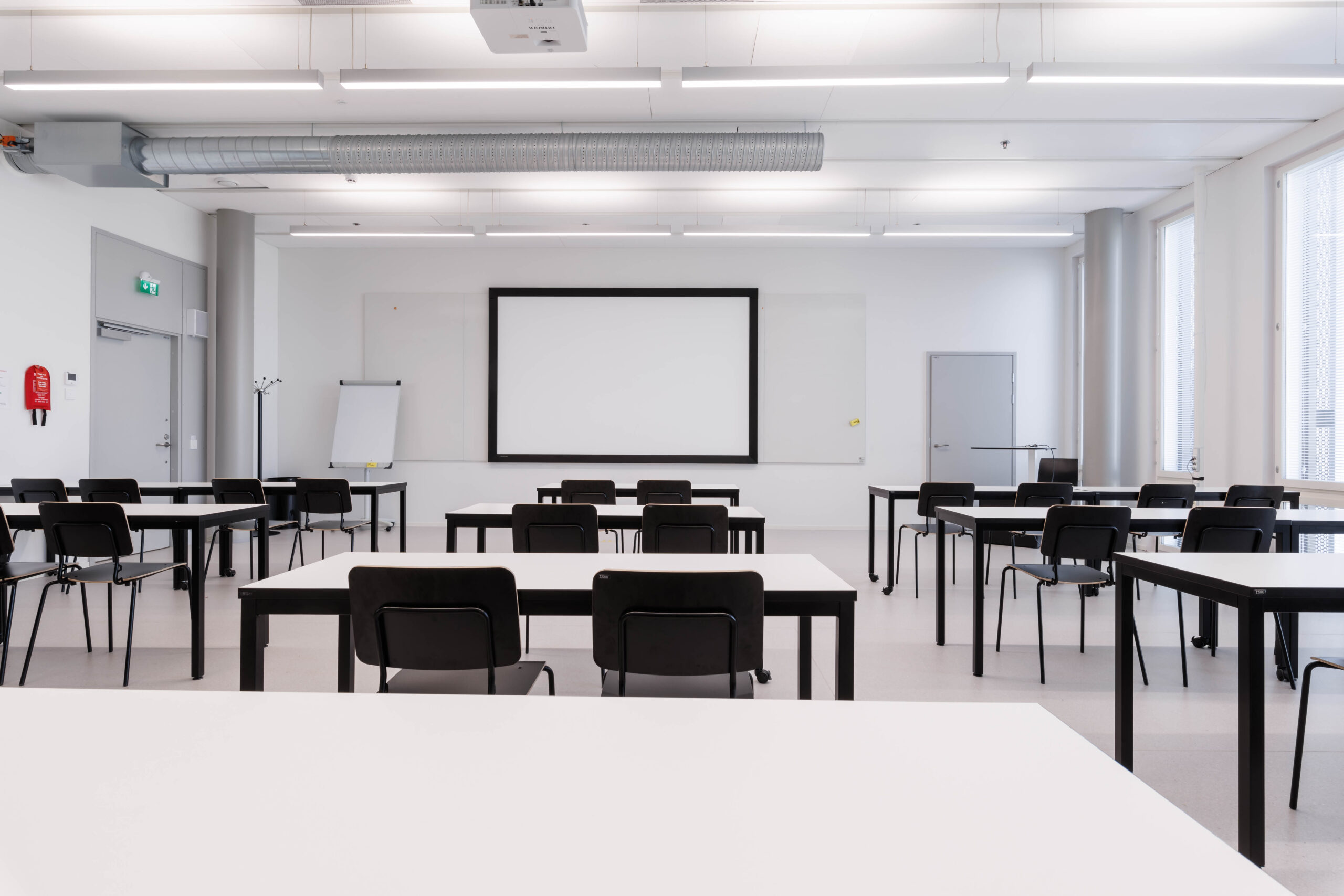 Kahden hengen pöydät tuoleilla. Tilassa etäprojektori.