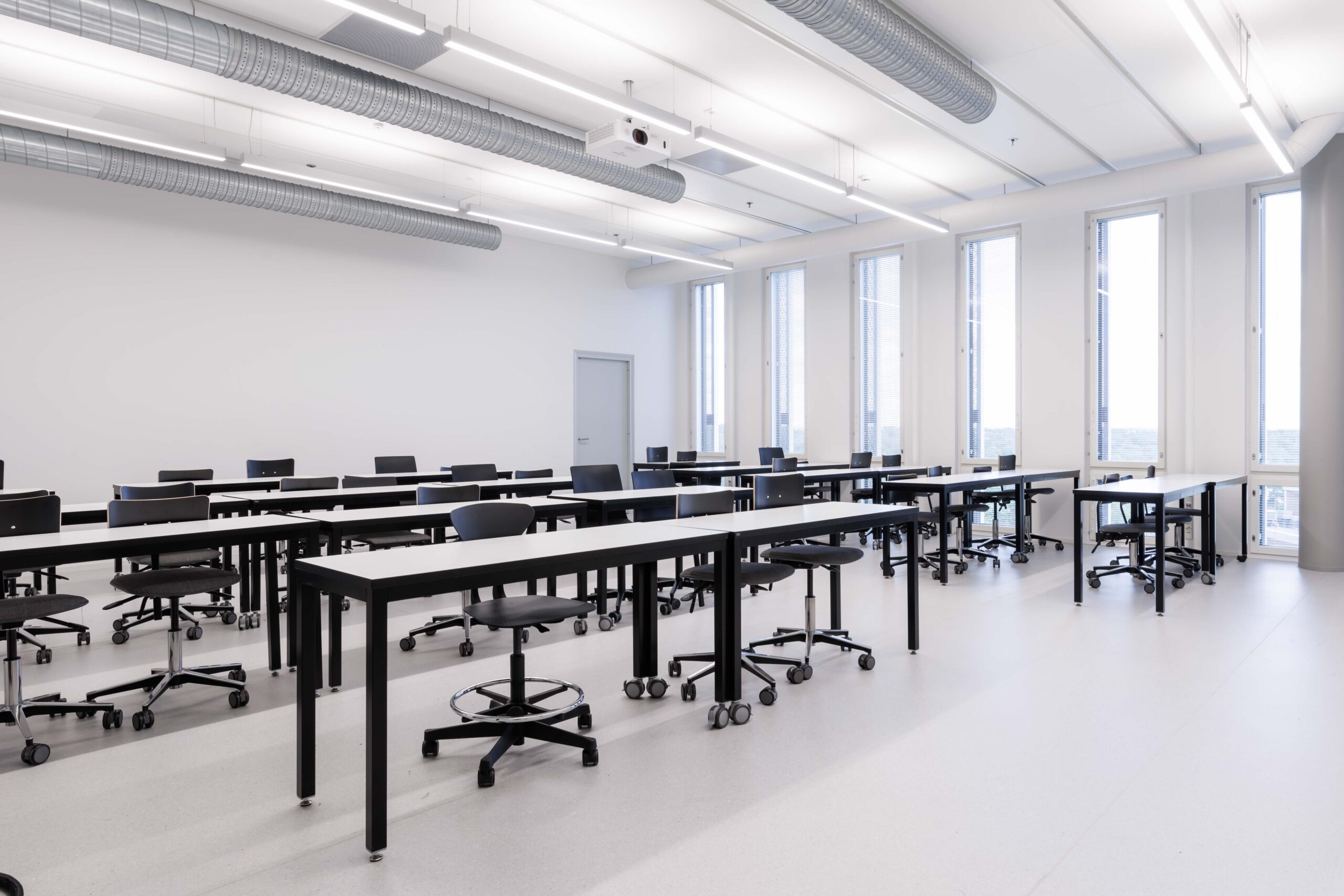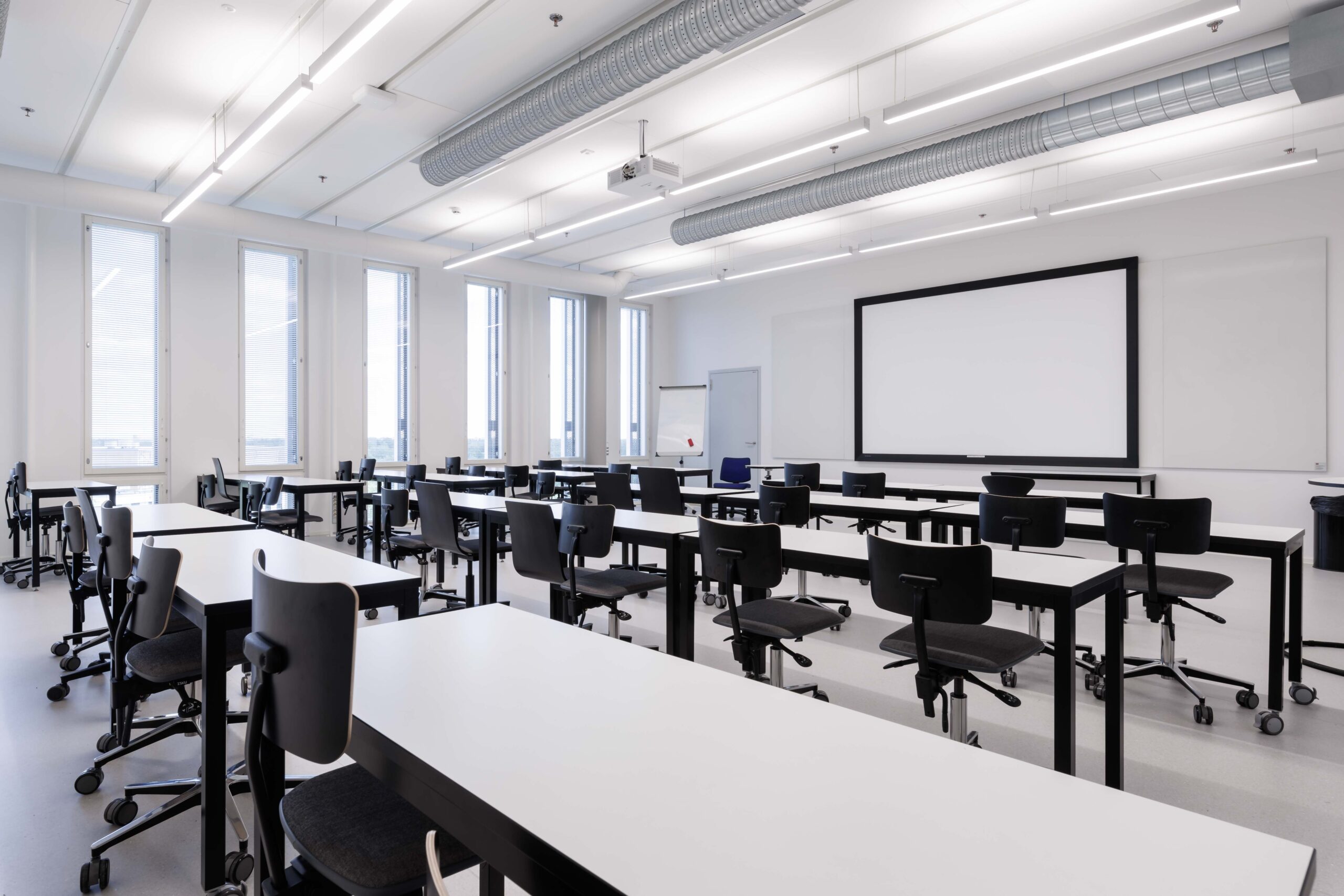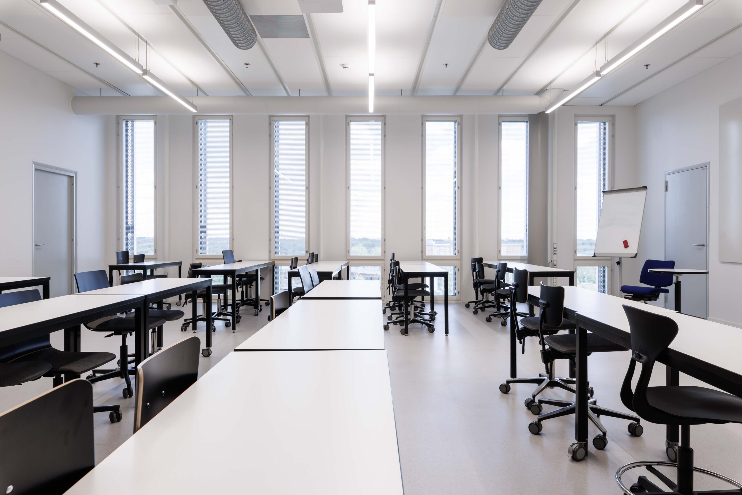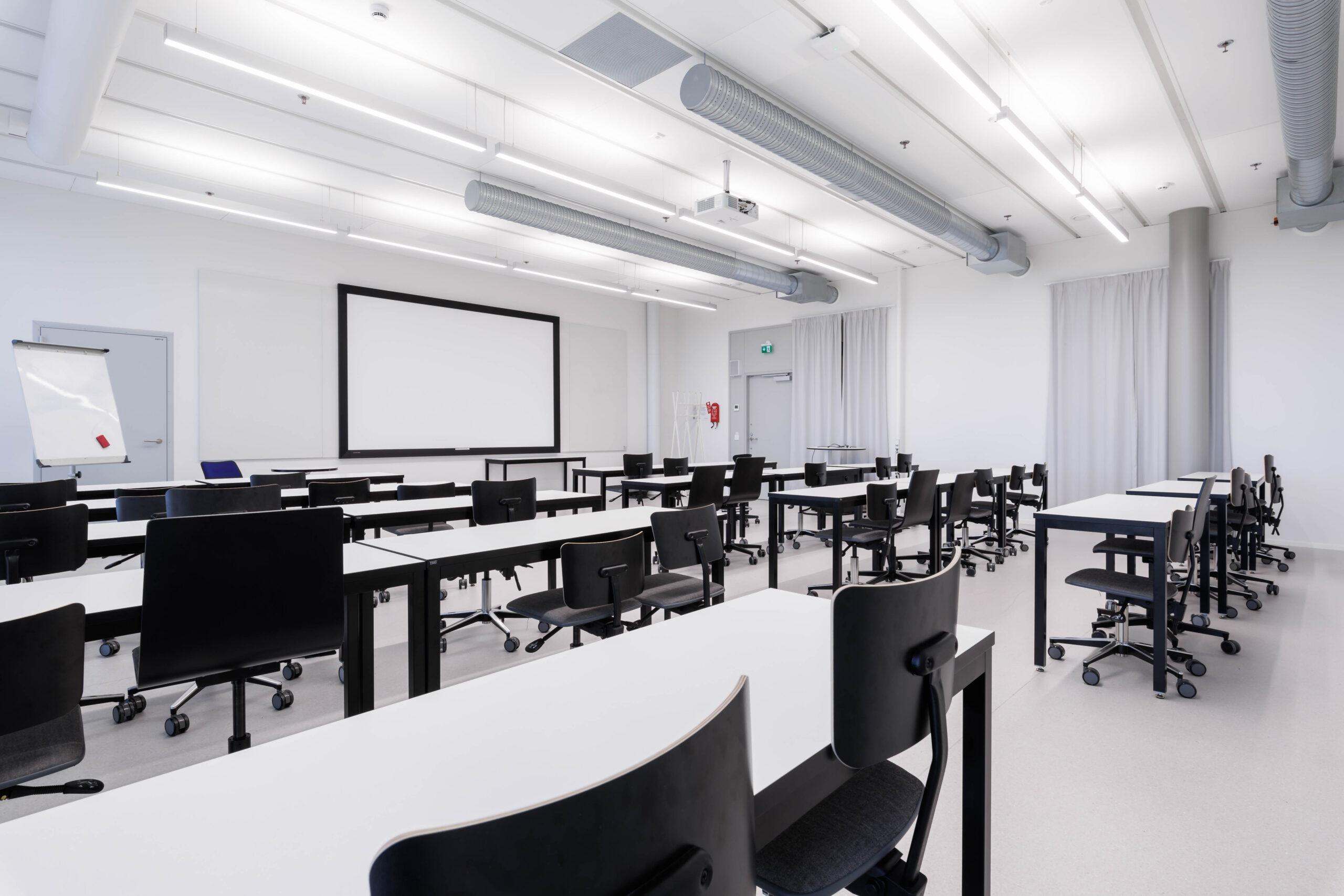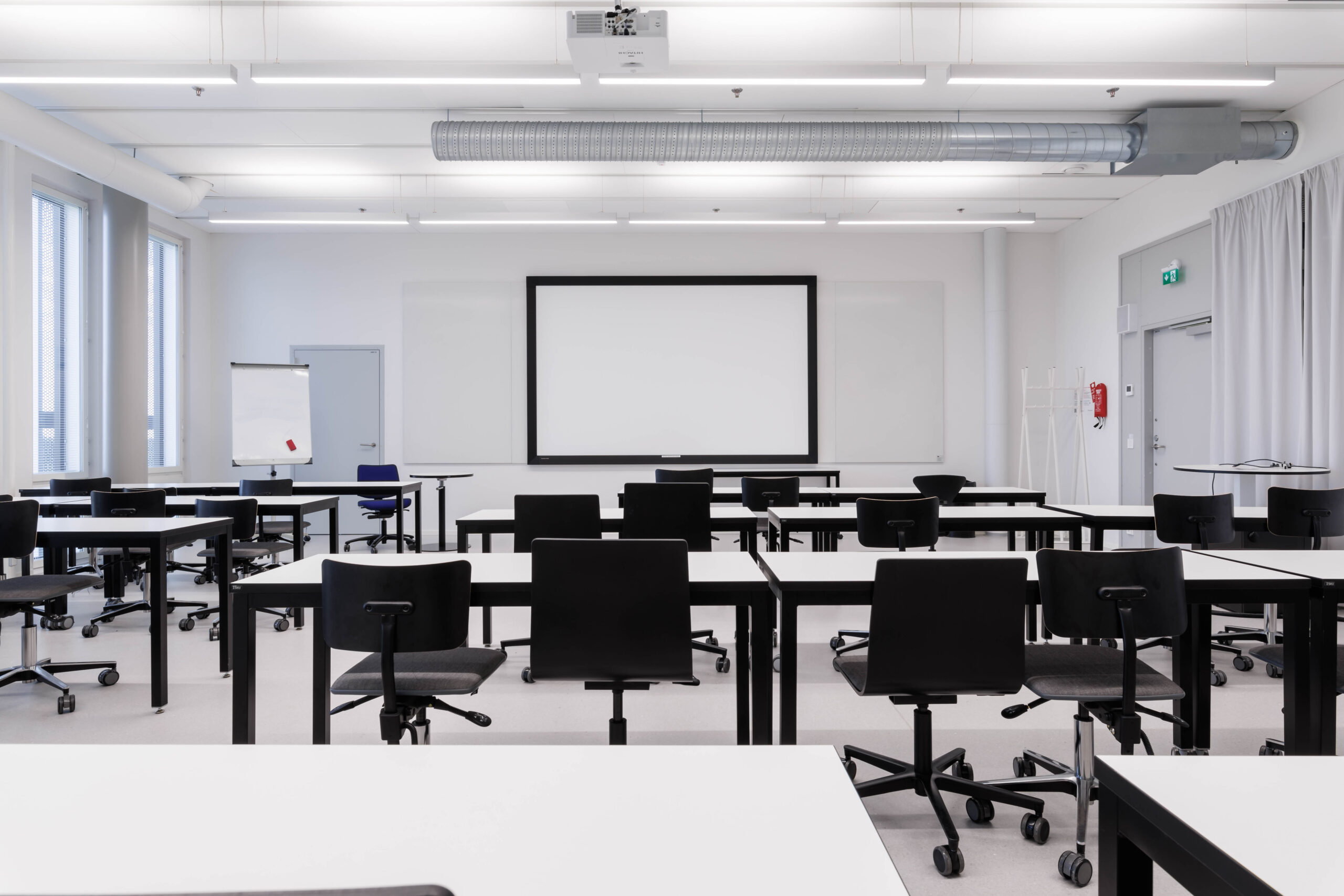 Korkeat pöydät ja tuolit, tilassa etäprojektori.