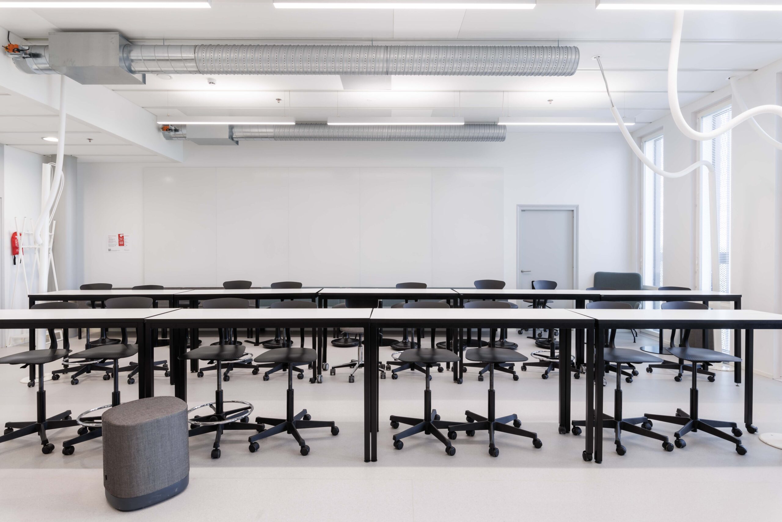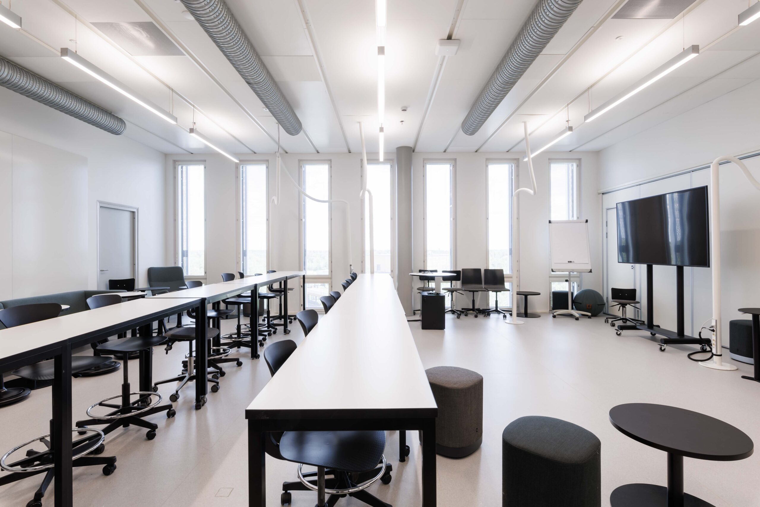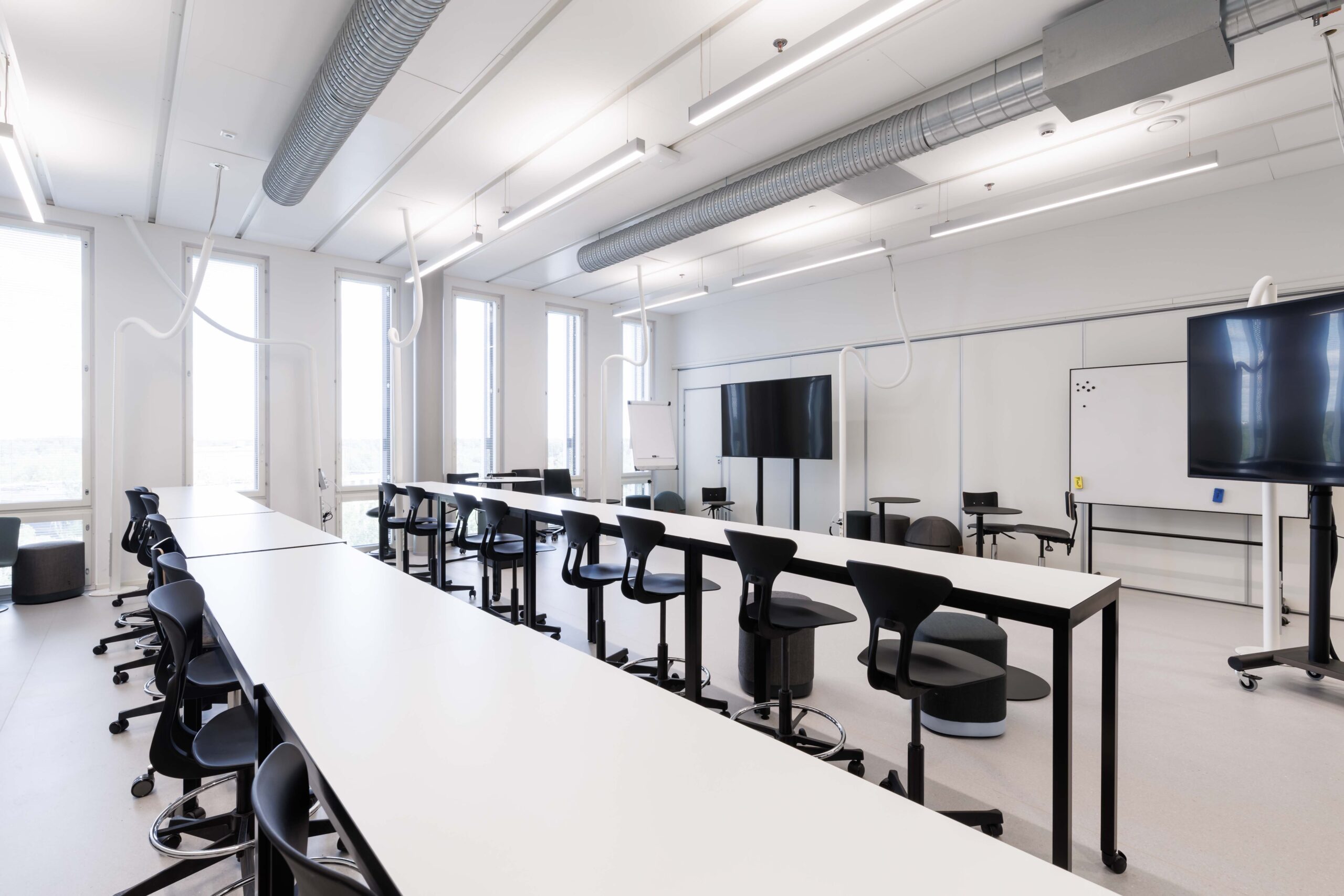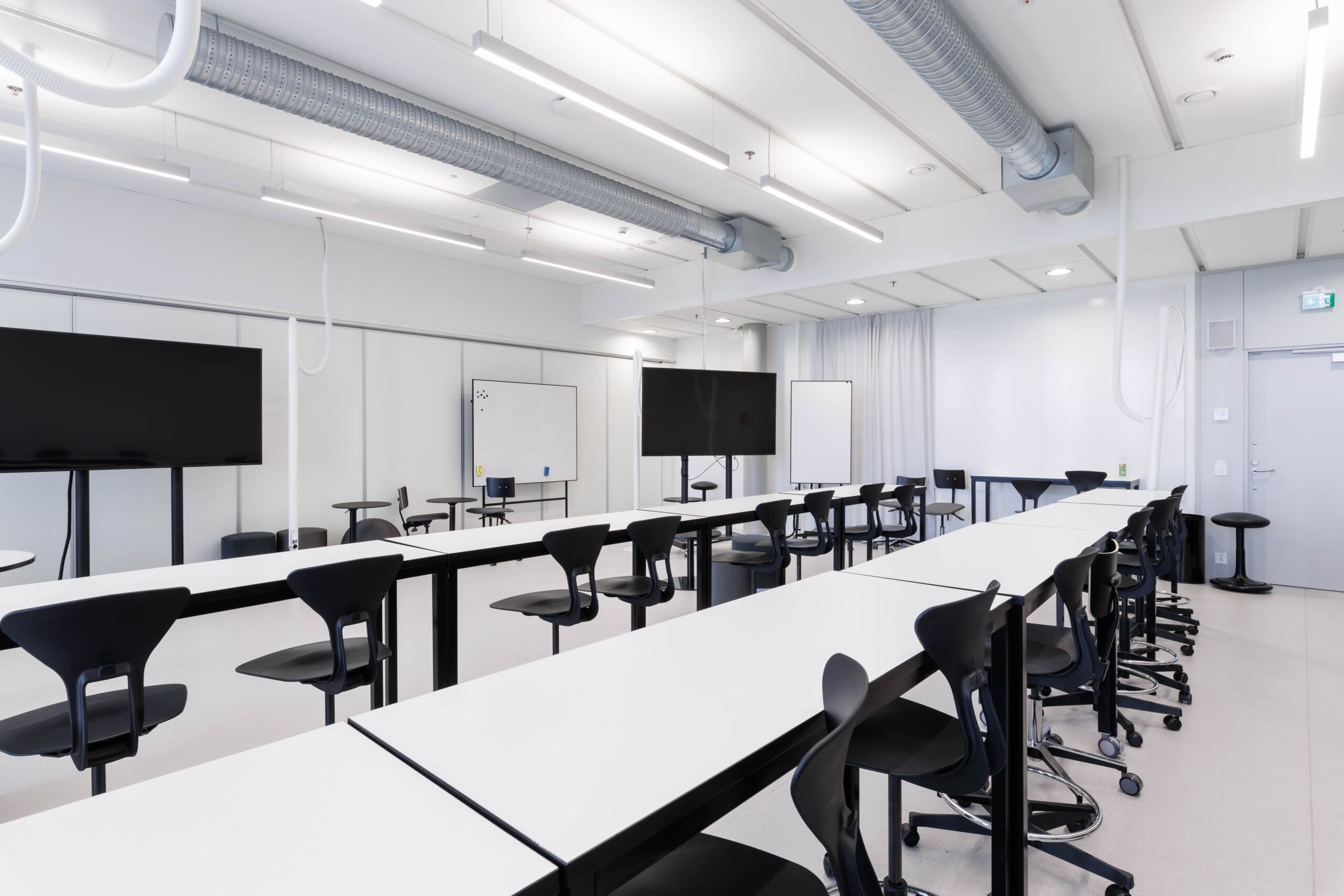 Korkeat pöydät ja tuolit sekä takaseinällä sohvat. Tilassa esitysnäyttö.