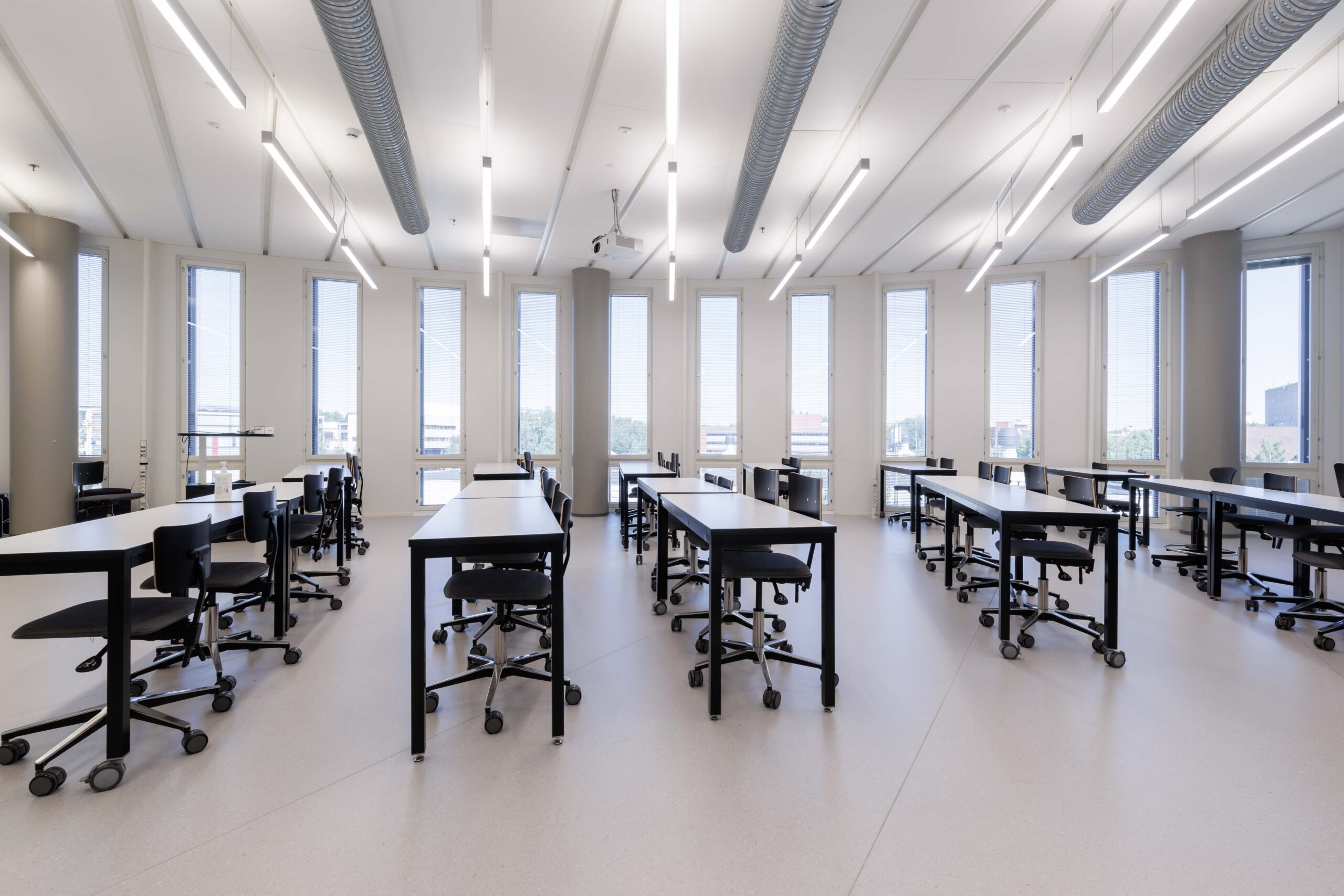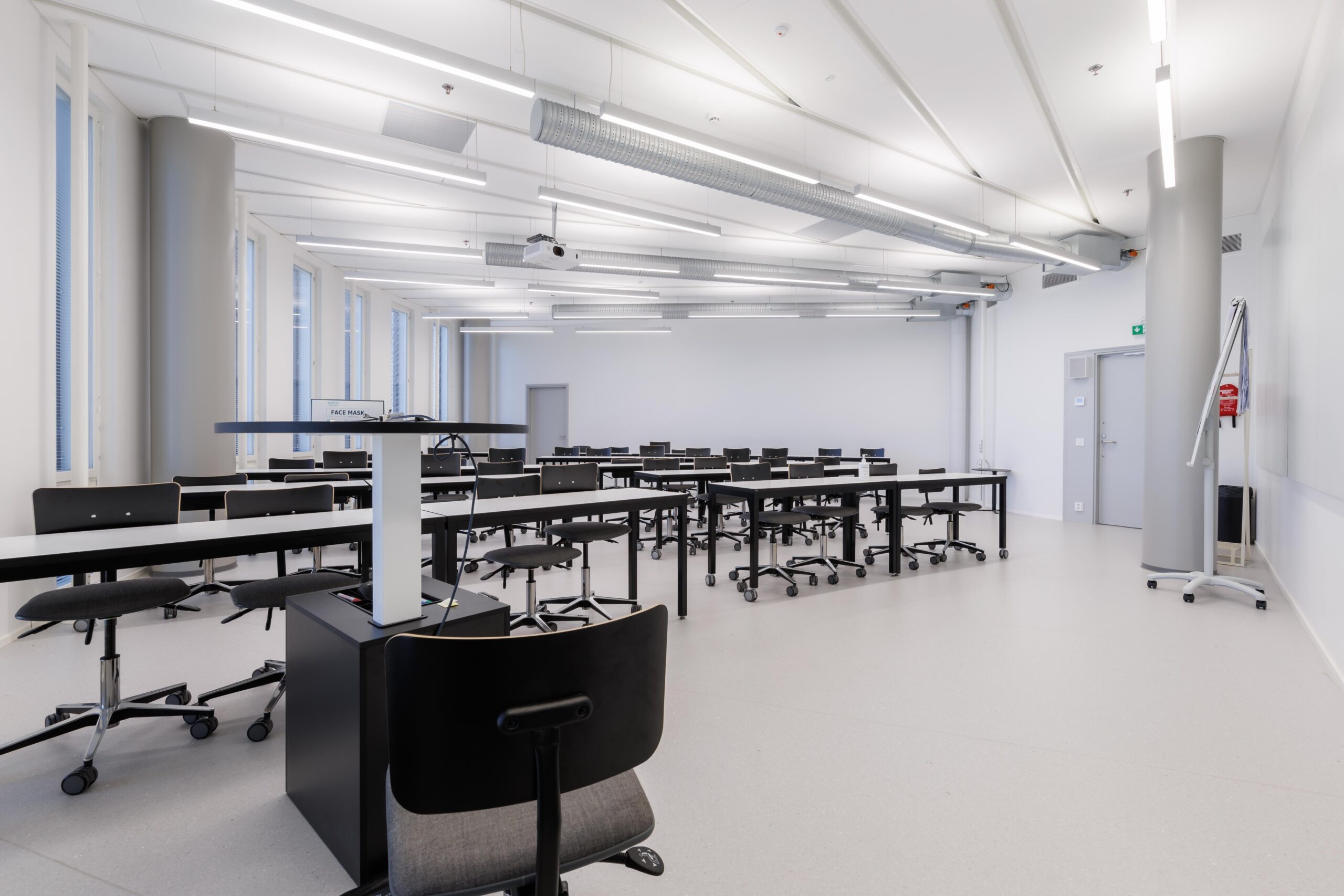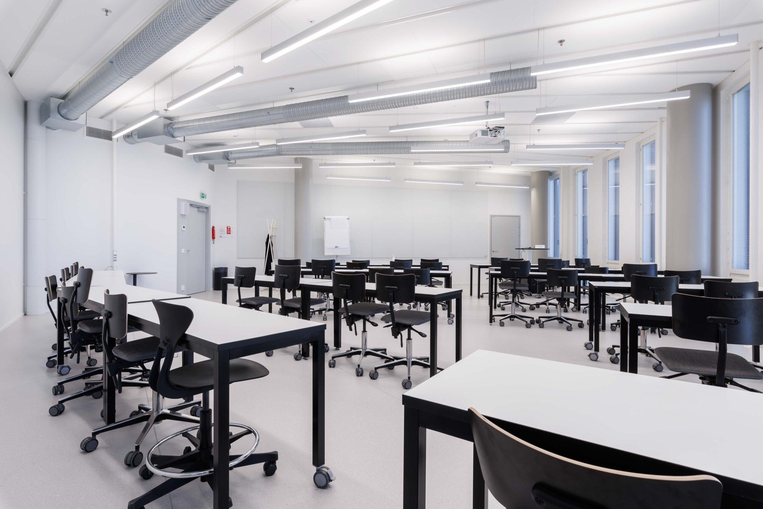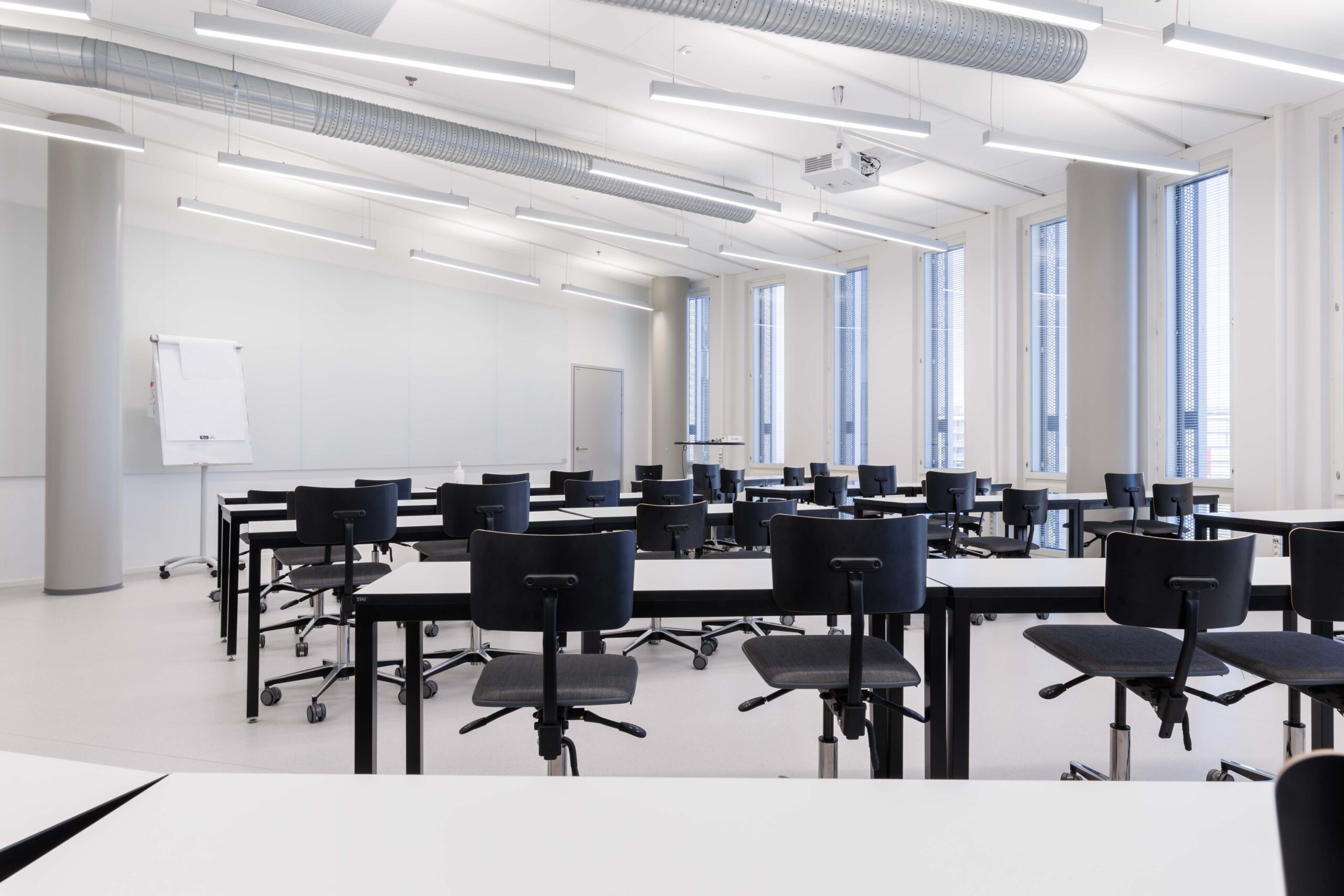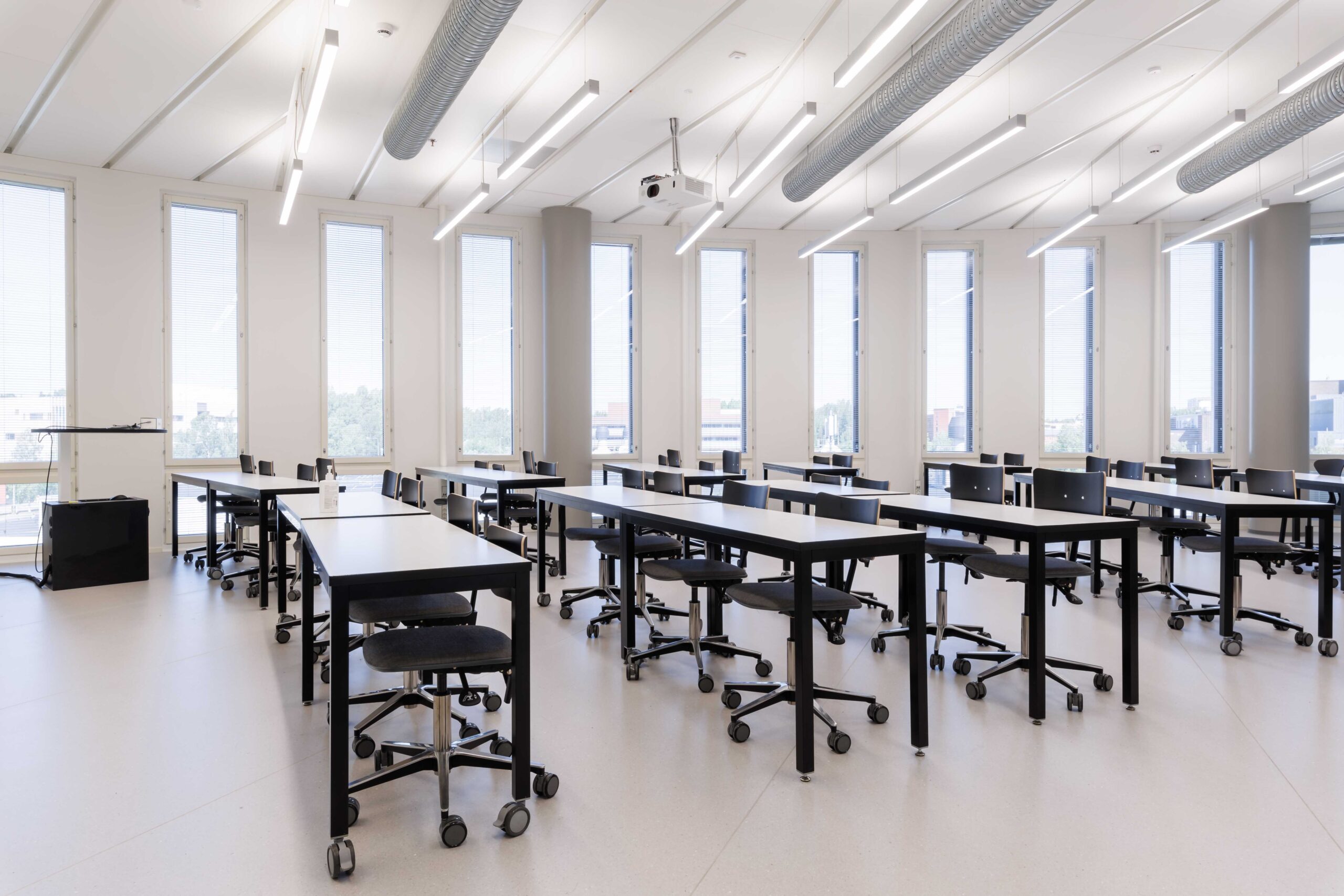 Kahden hengen pöydät tuoleilla, etäprojektori.