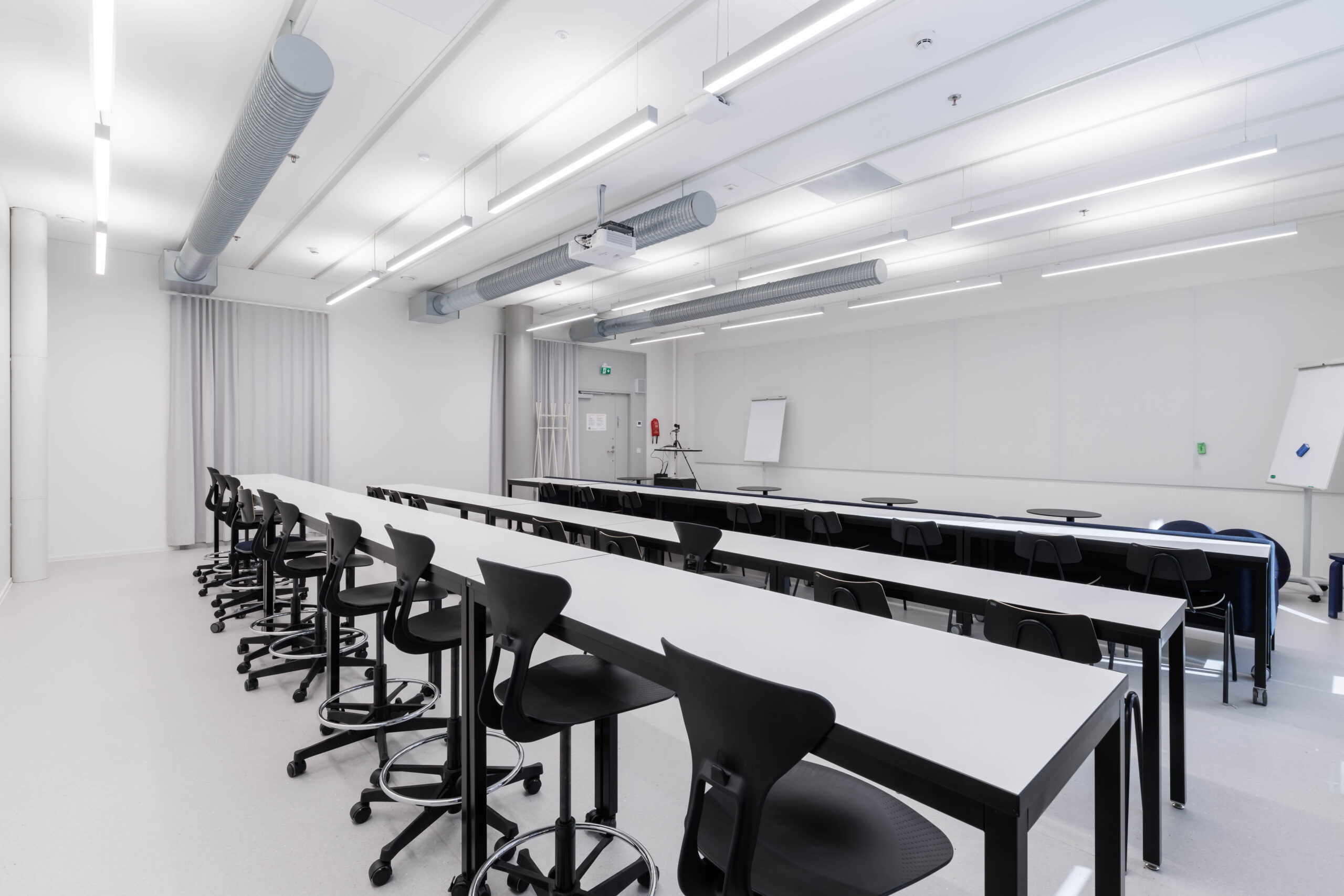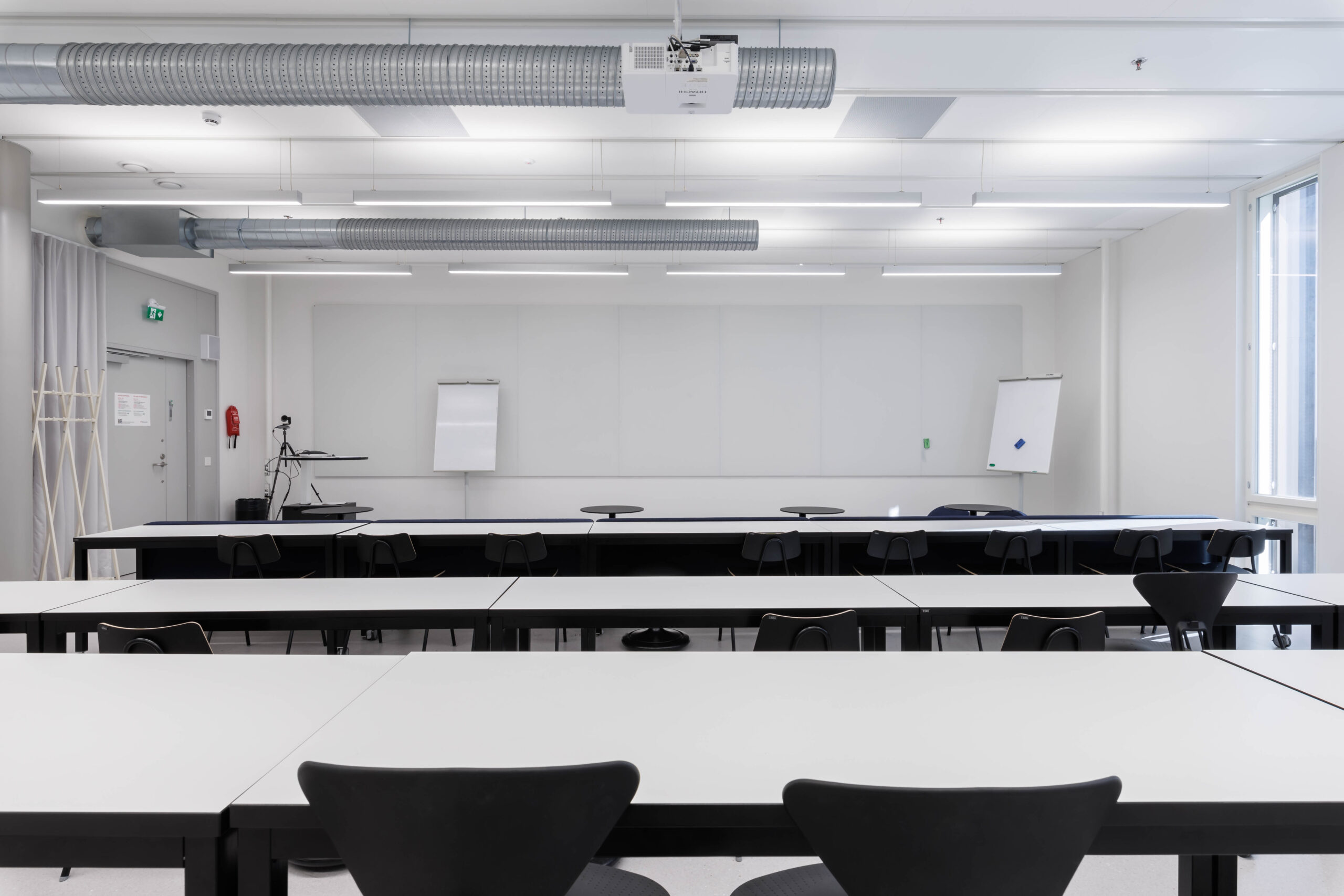 Porrastettu kalustus. Sohvat, sohvapöydät, eri korkuisia luentopöytiä, koulutuoleja, aktiivituoleja, pyörällisiä tuoleja. Tilassa etäprojektori.