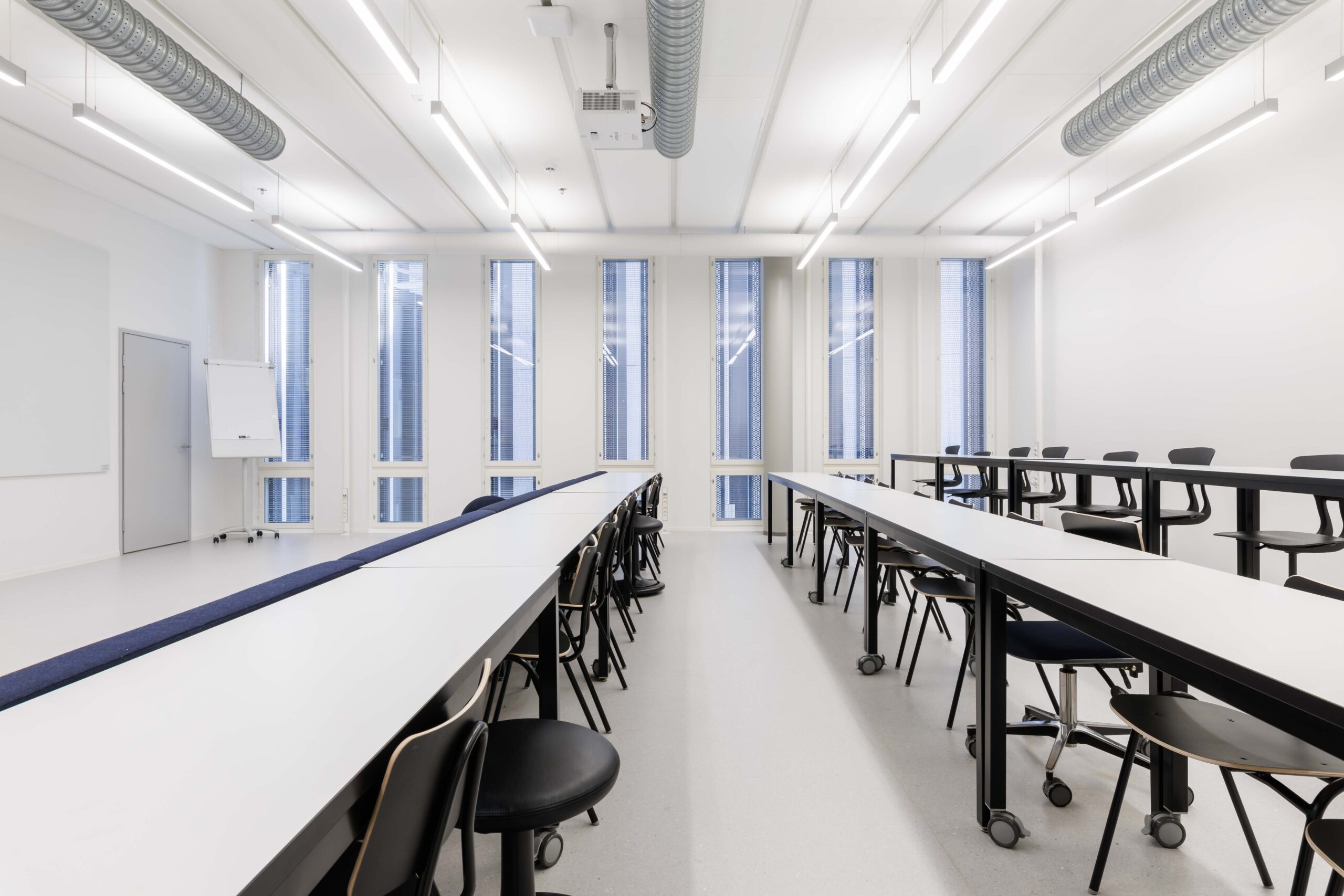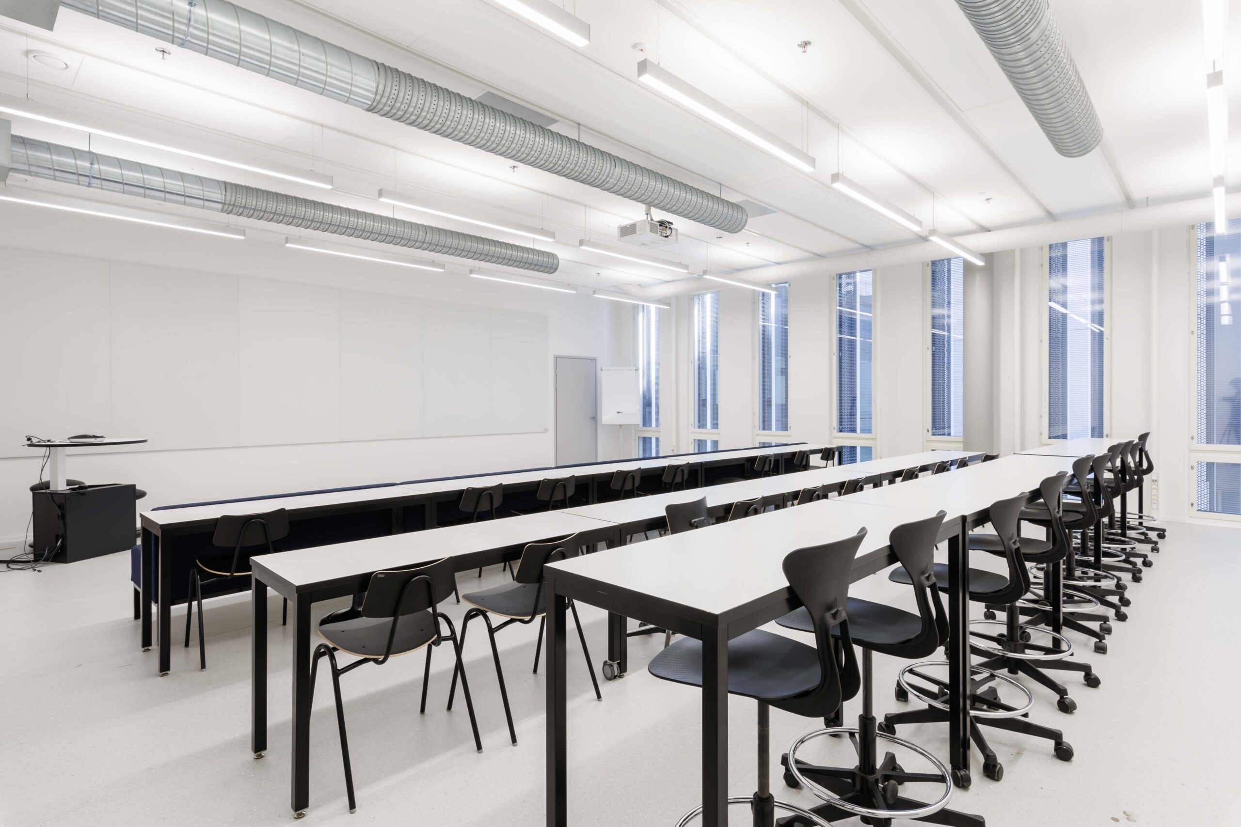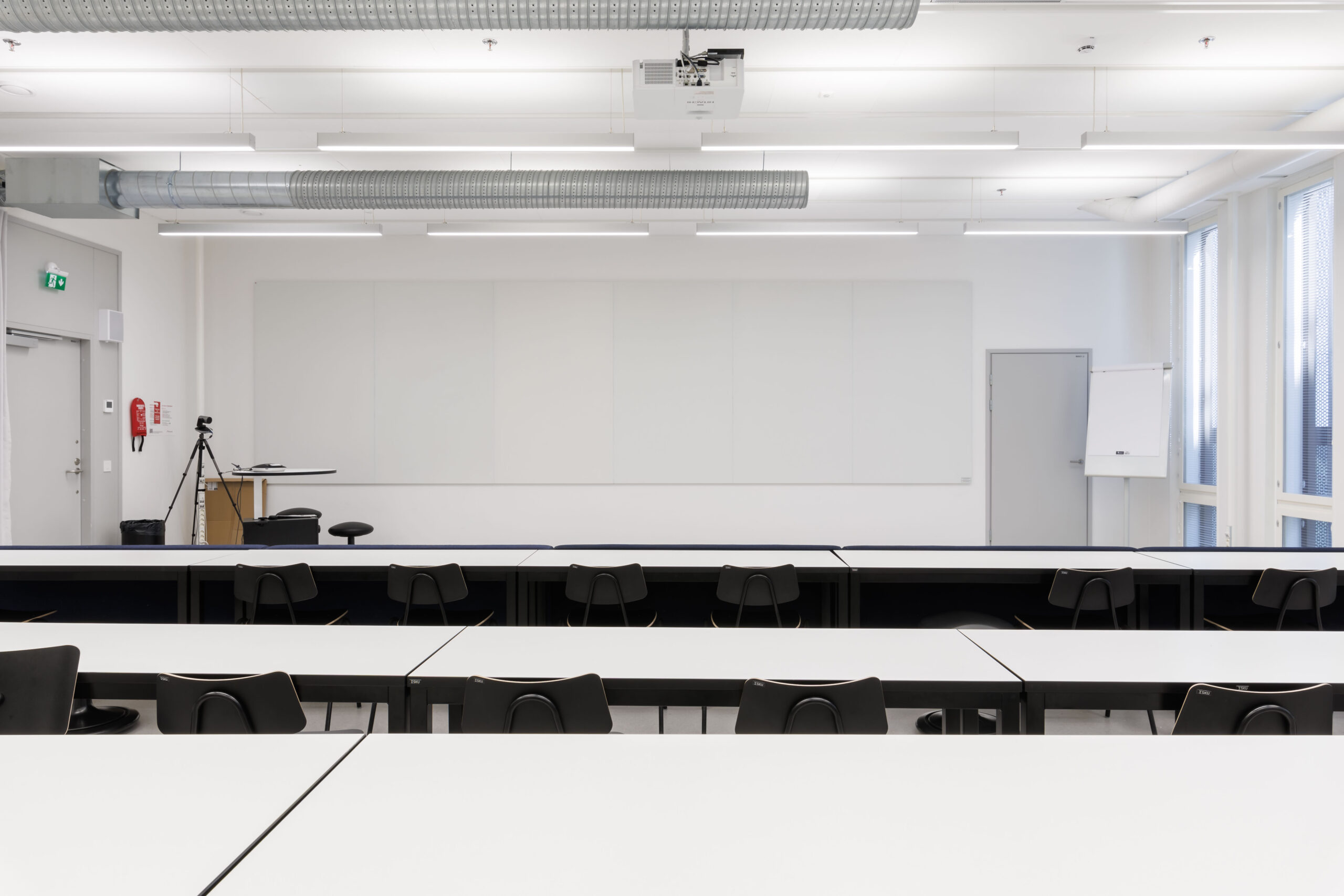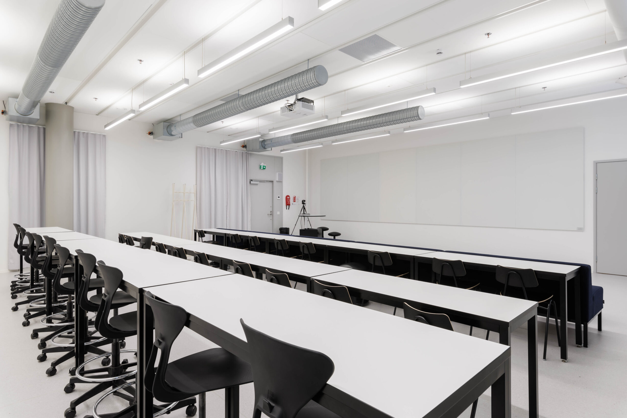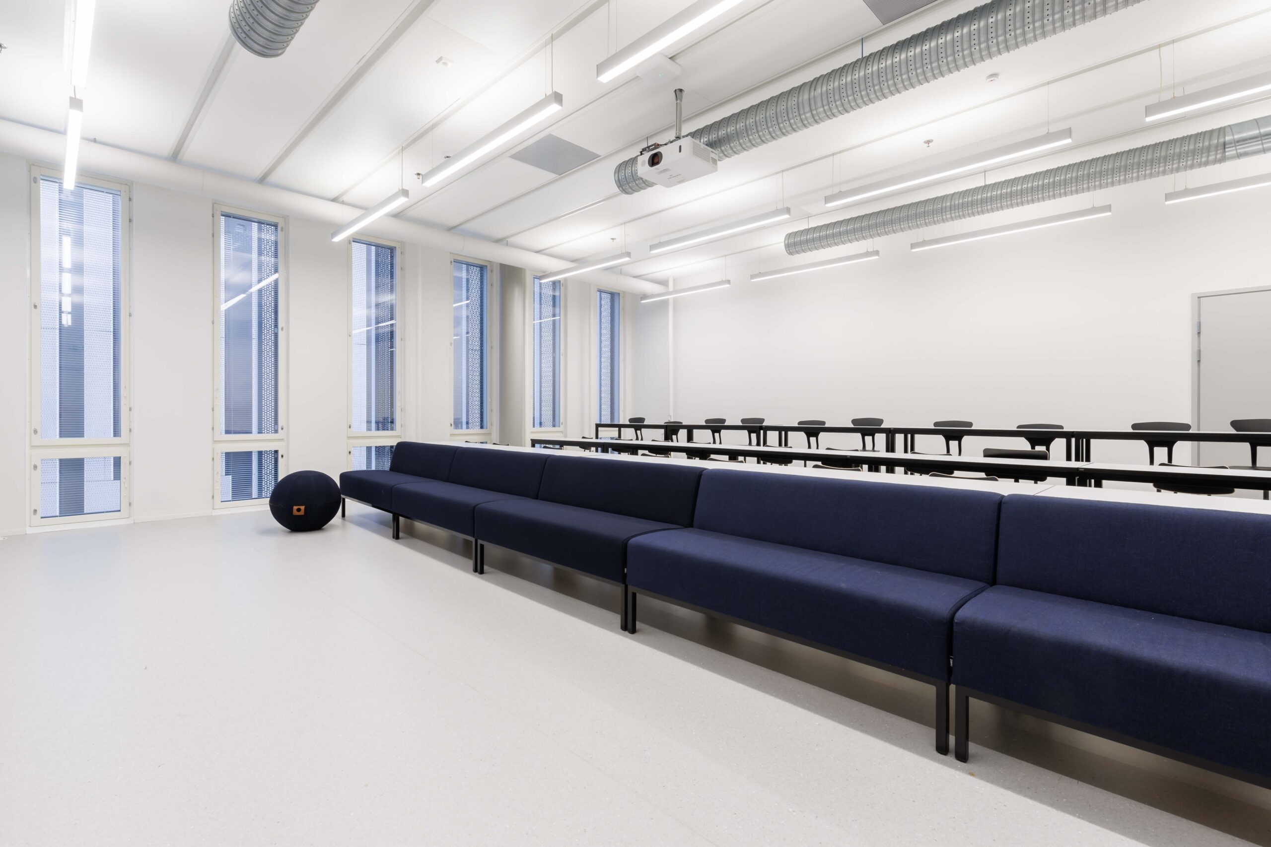 Porrastettu kalustus. Sohvat, sohvapöydät, eri korkuisia luentopöytiä, koulutuoleja, aktiivituoleja, pyörällisiä tuoleja. Tilassa etäprojektori.