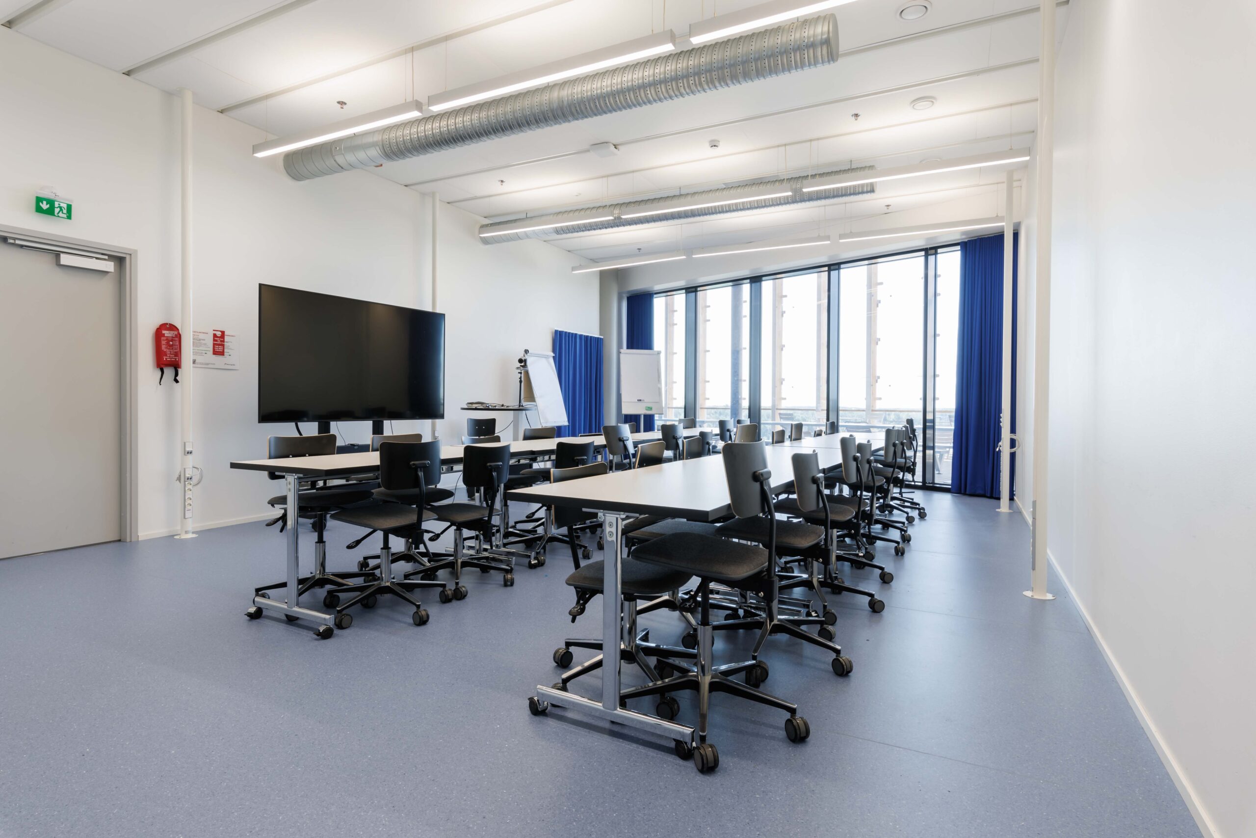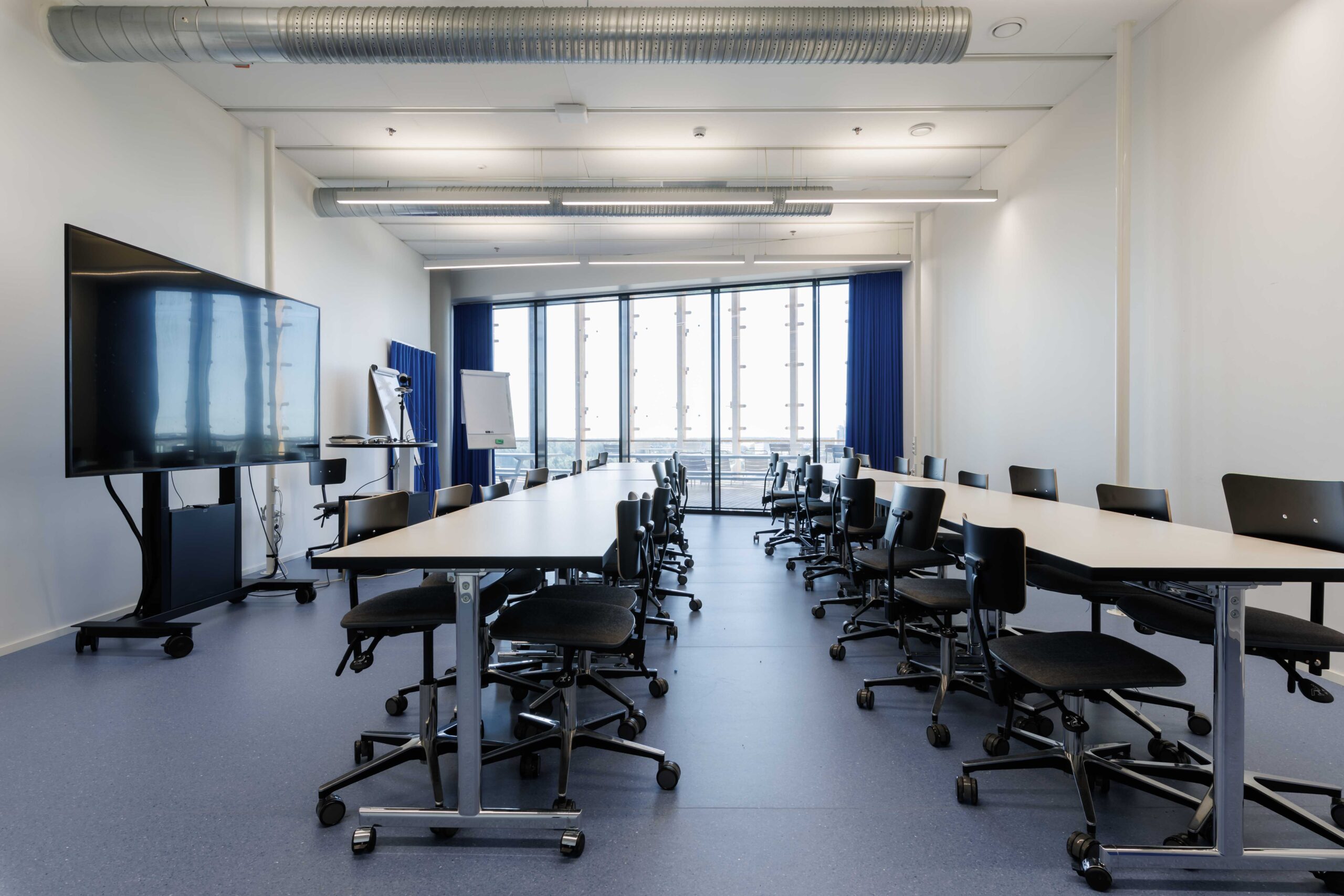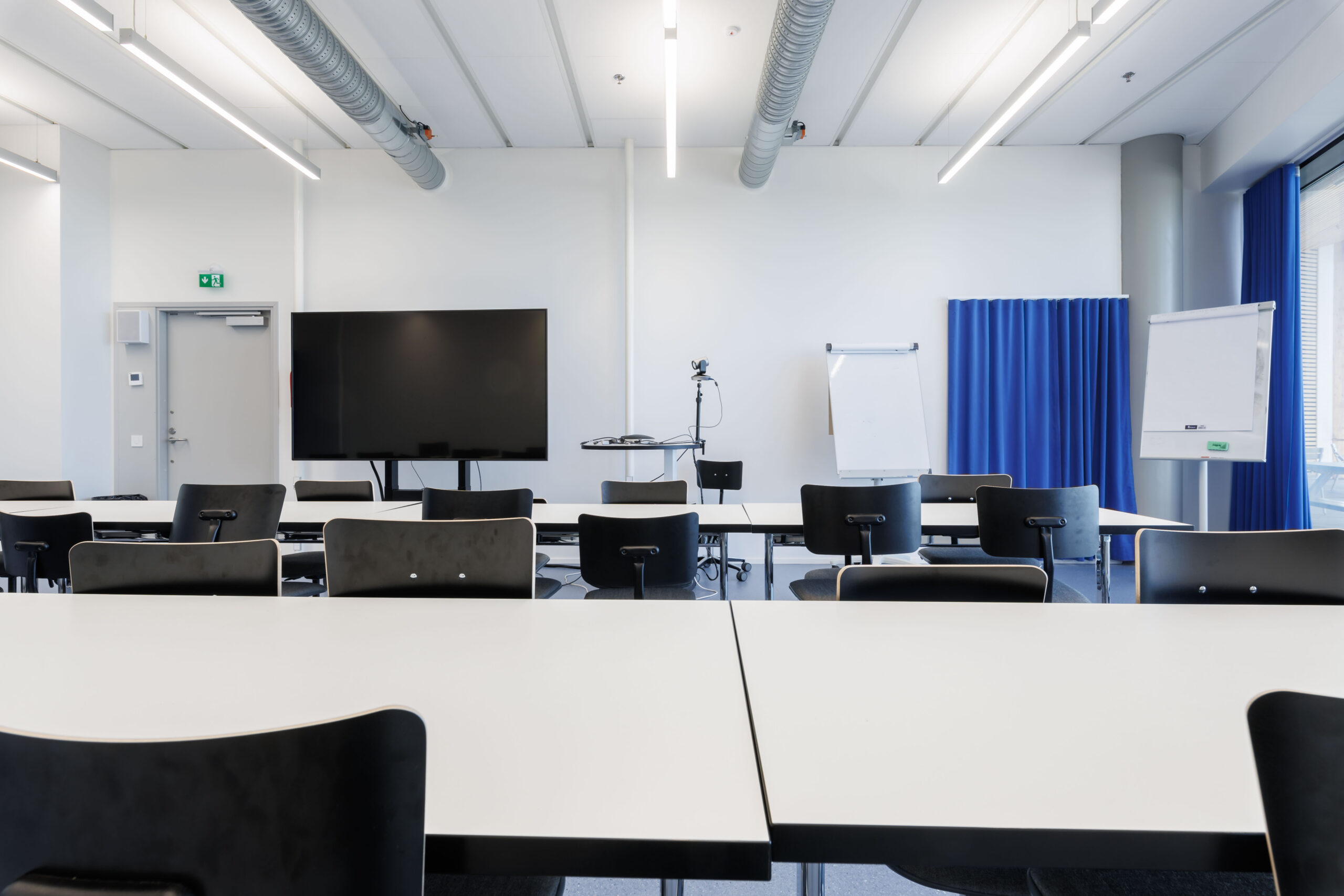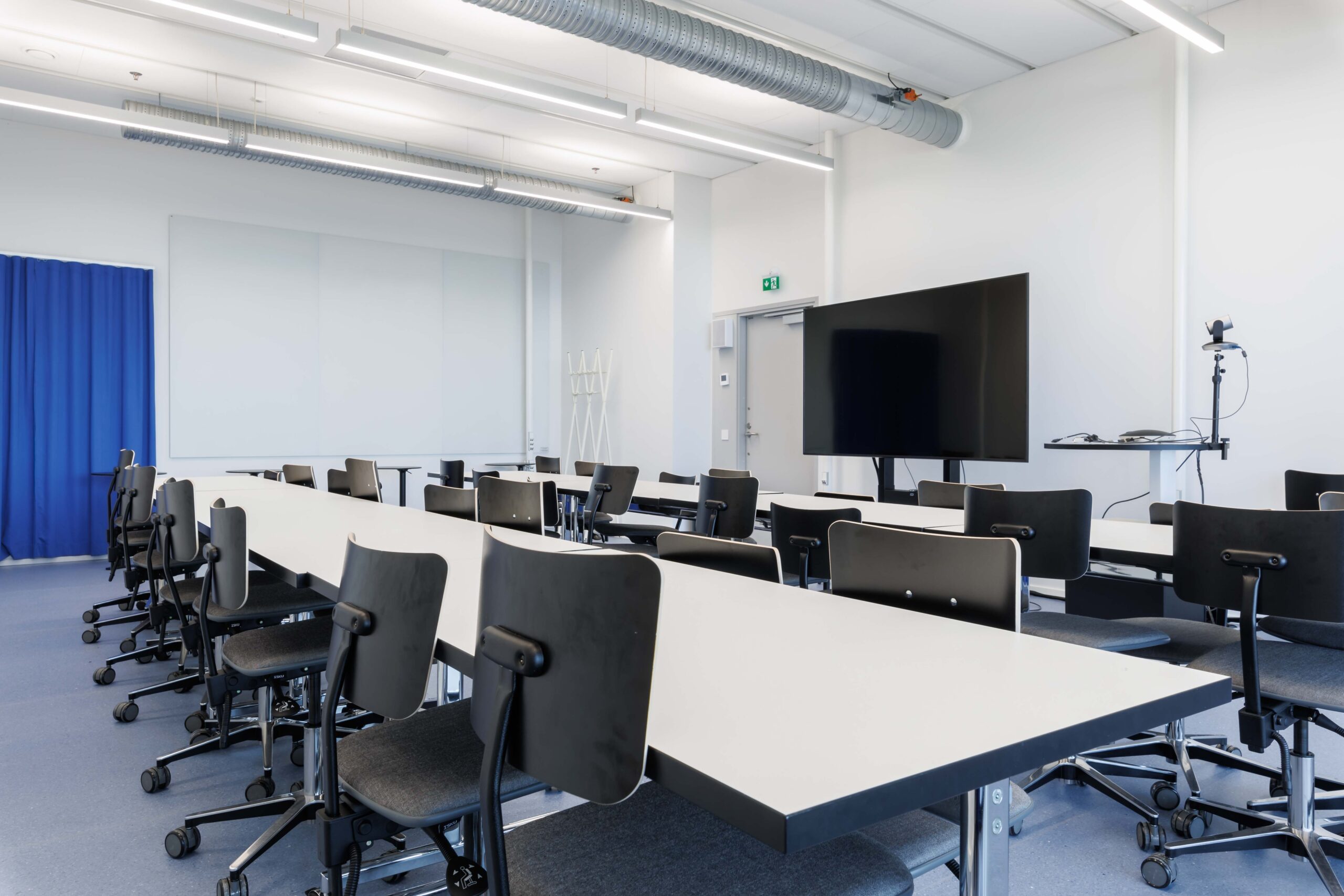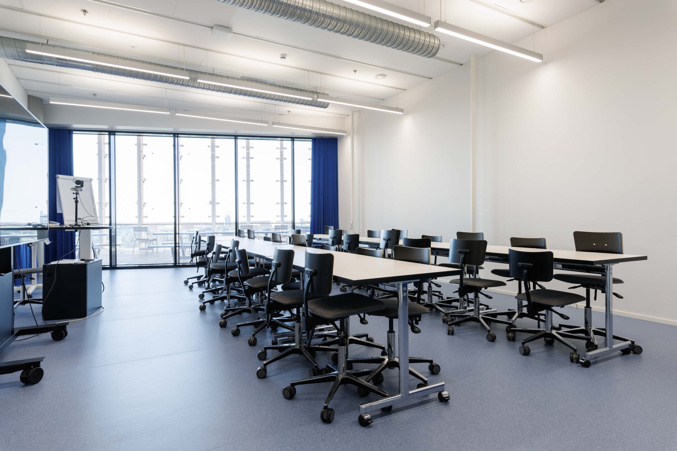 Neljän hengen pöydät tuoleilla, tilassa esitysnäyttö.