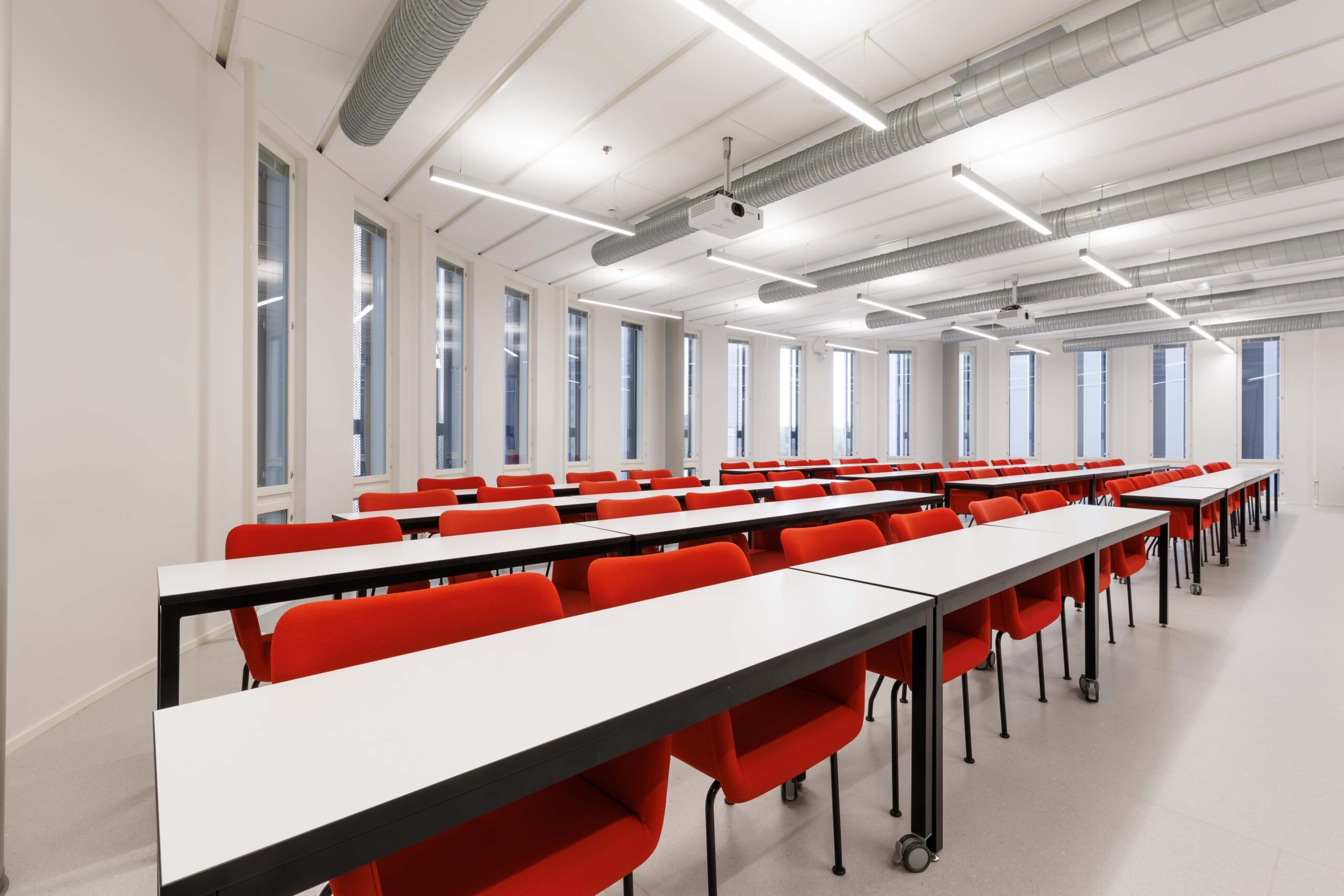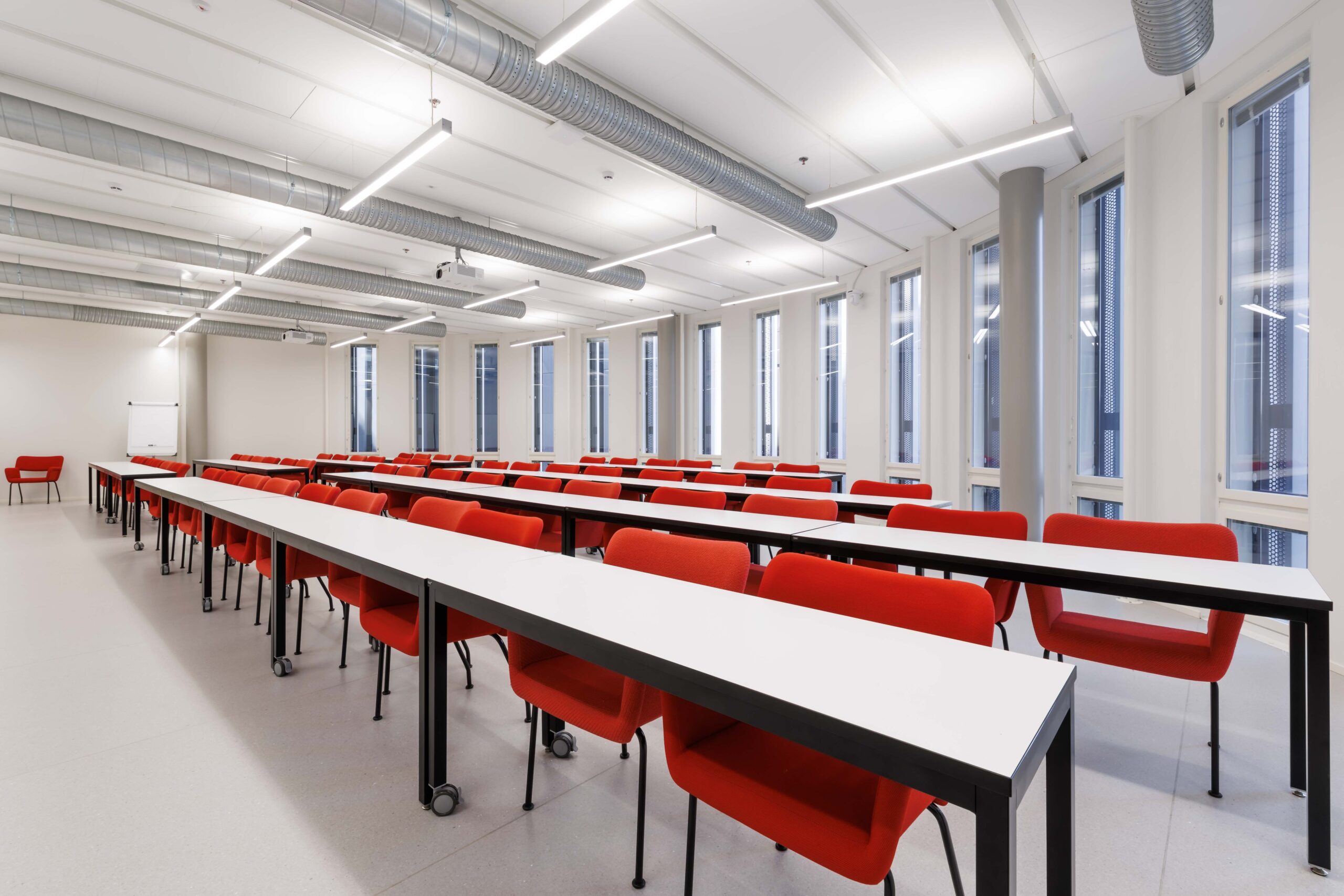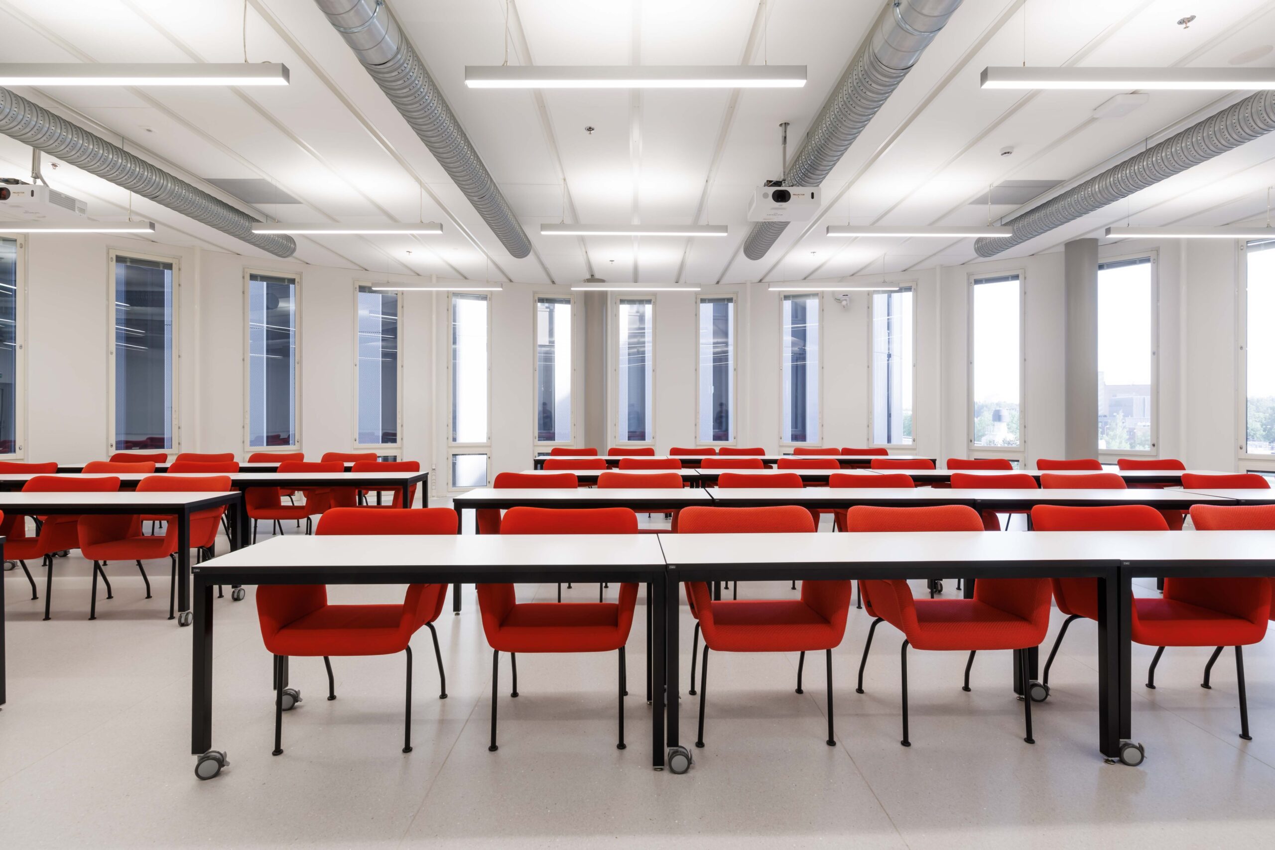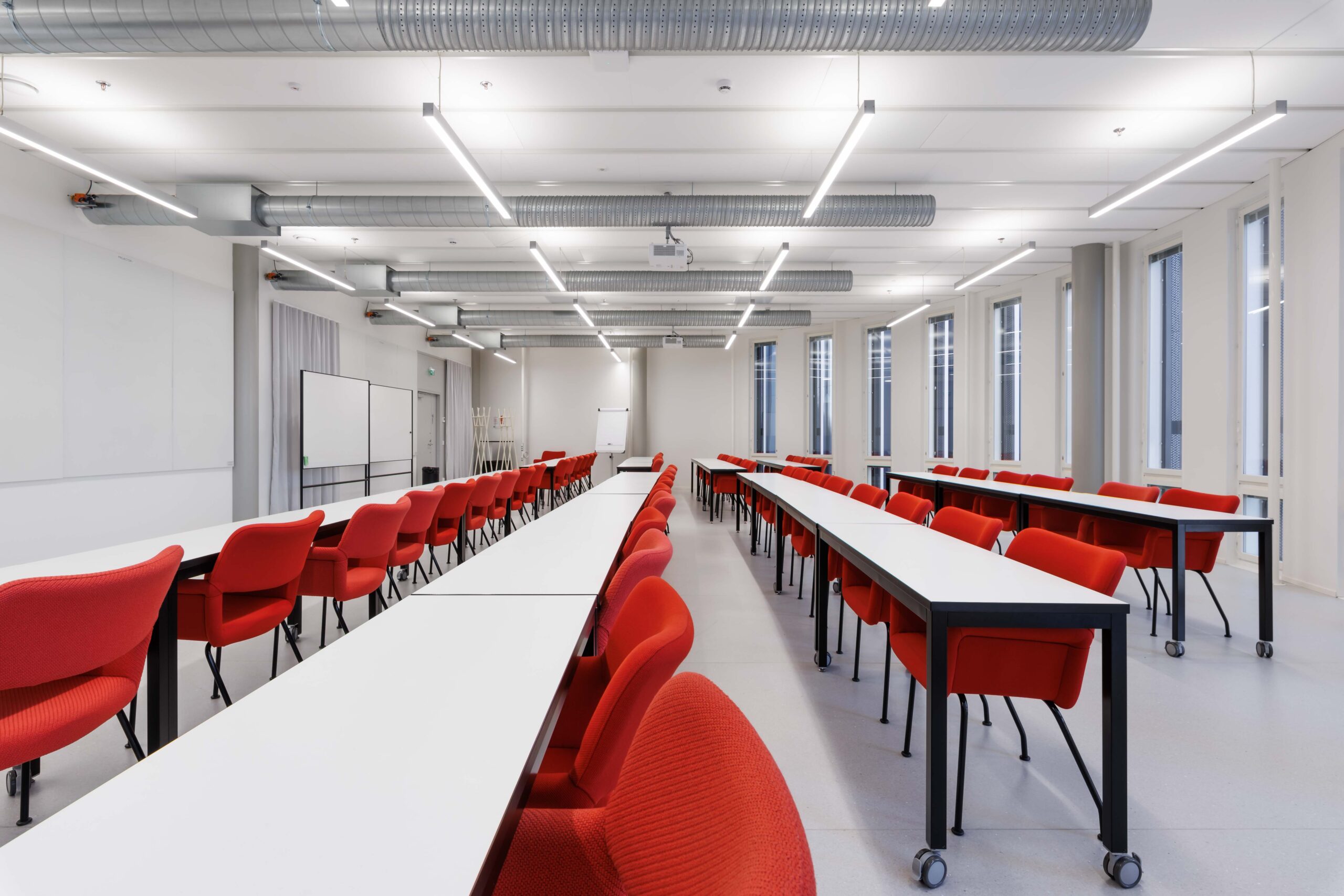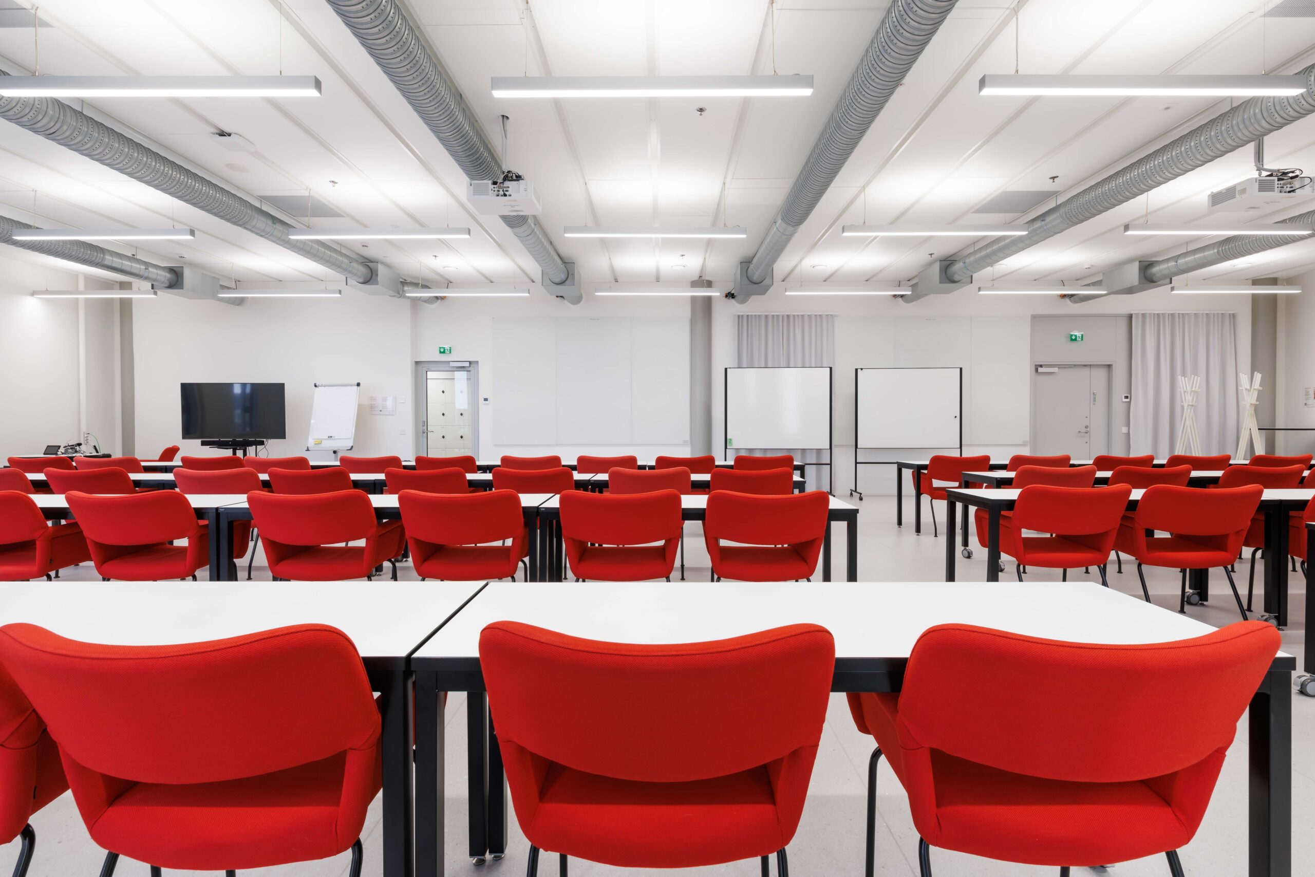 Kahden hengen pöydät nojatuoleilla, tilassa on etäprojektori.