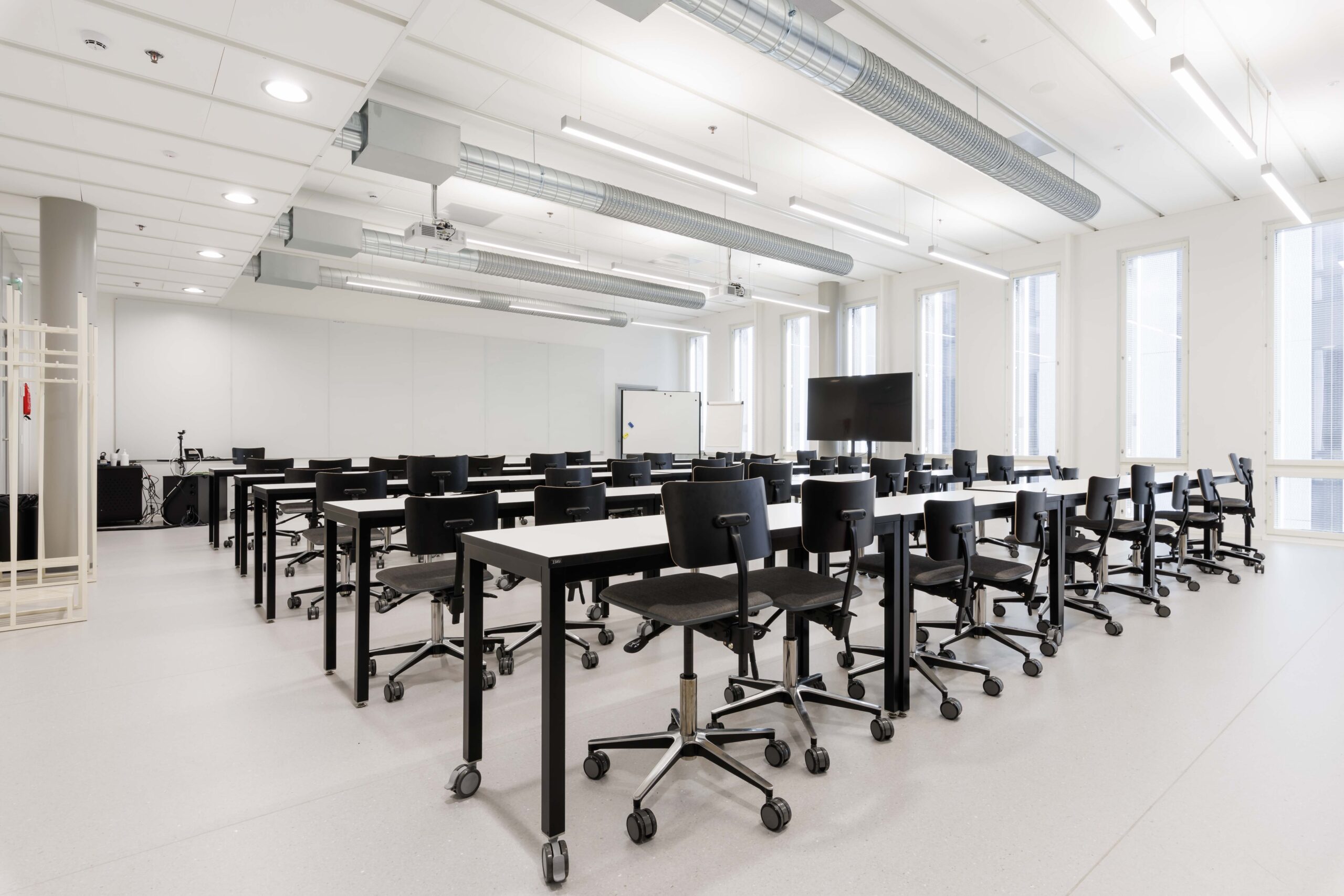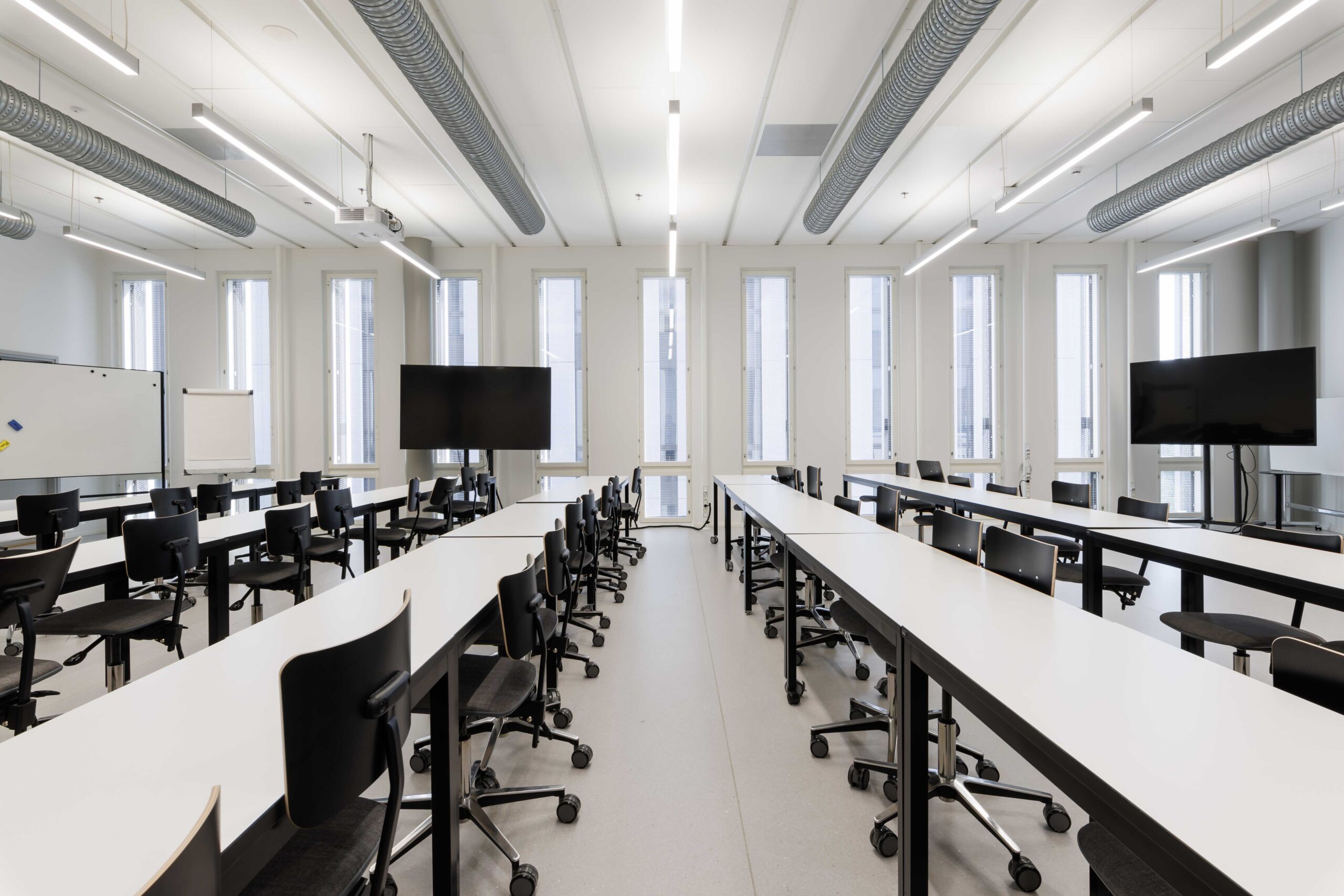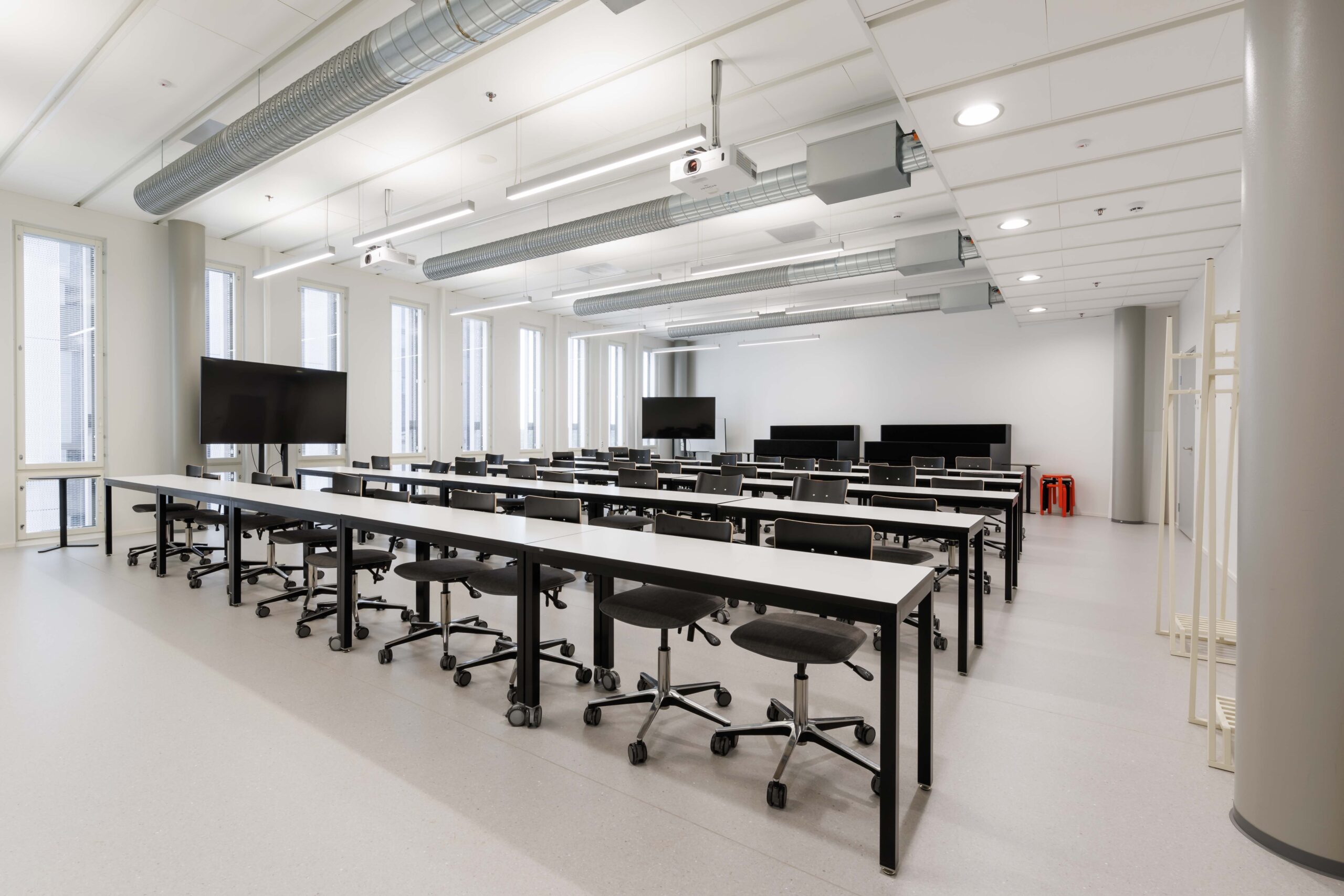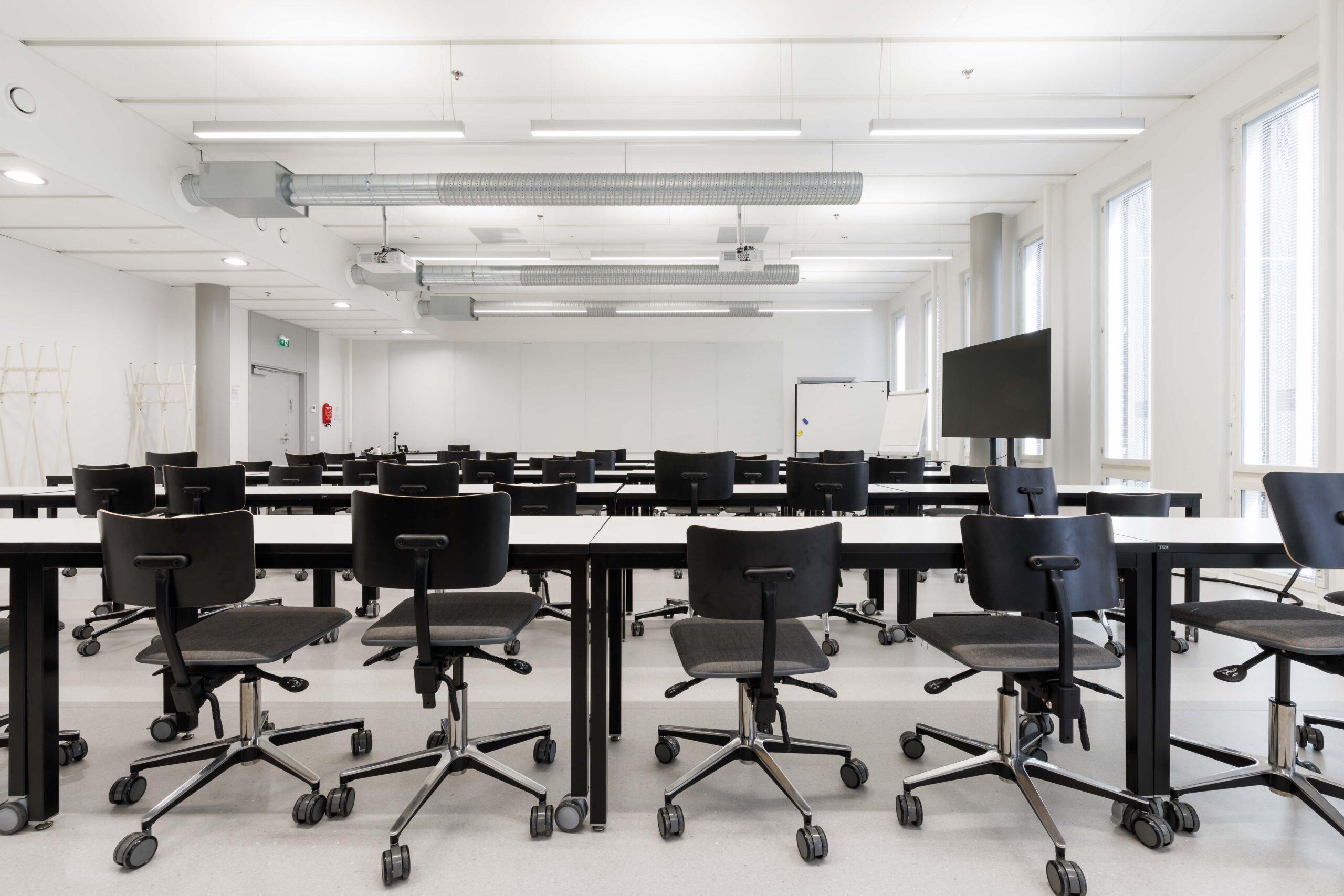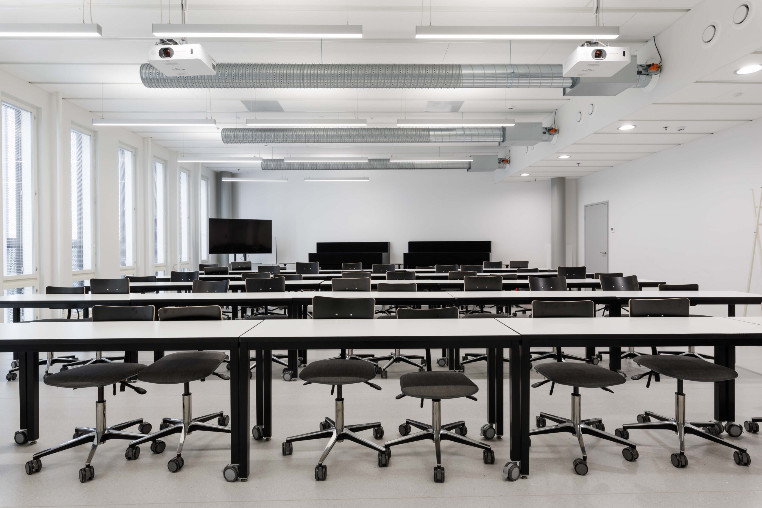 Kahden hengen pöydät tuoleilla, Beatbox-katsomokaluste (2kpl). Tilassa etäprojektori.