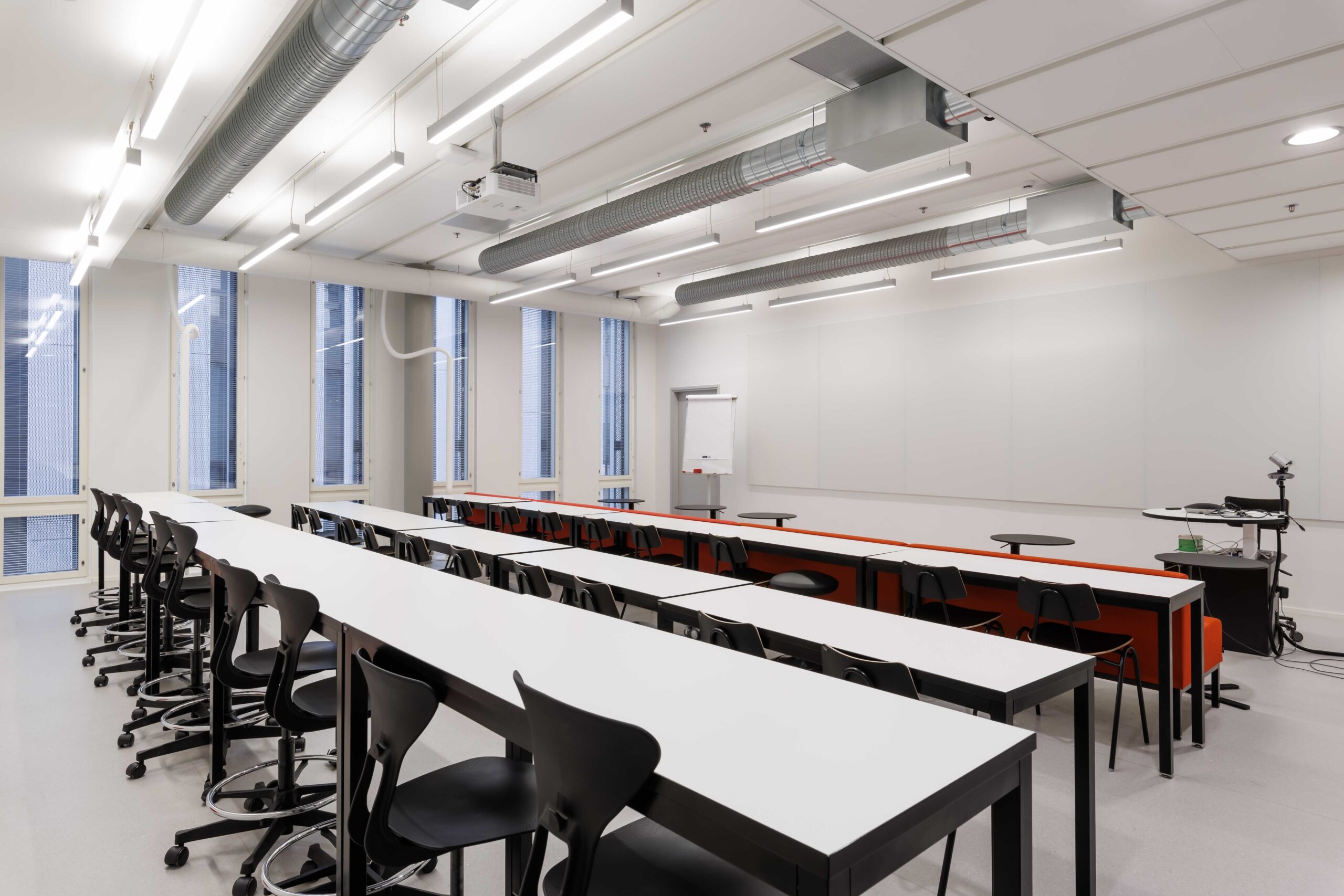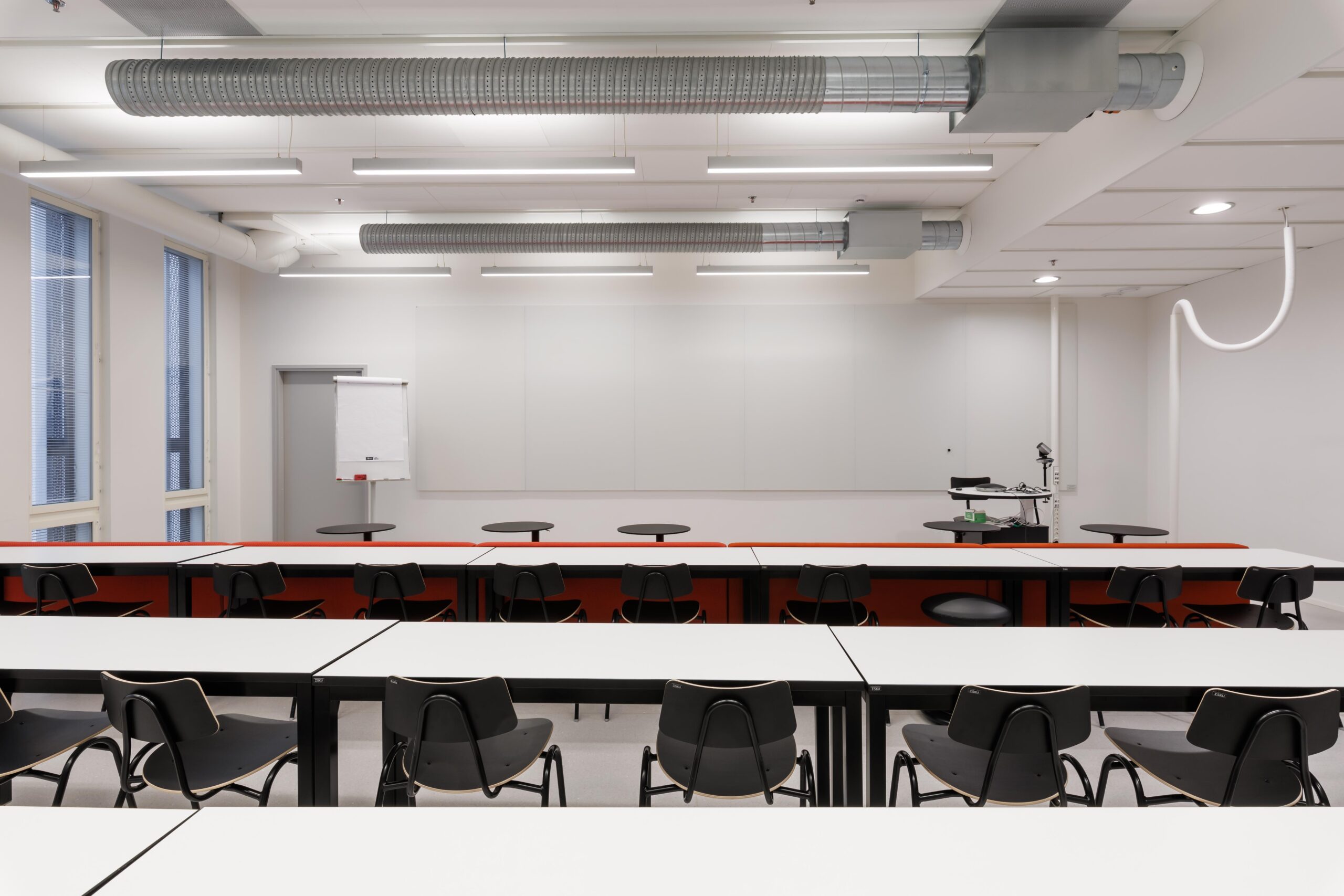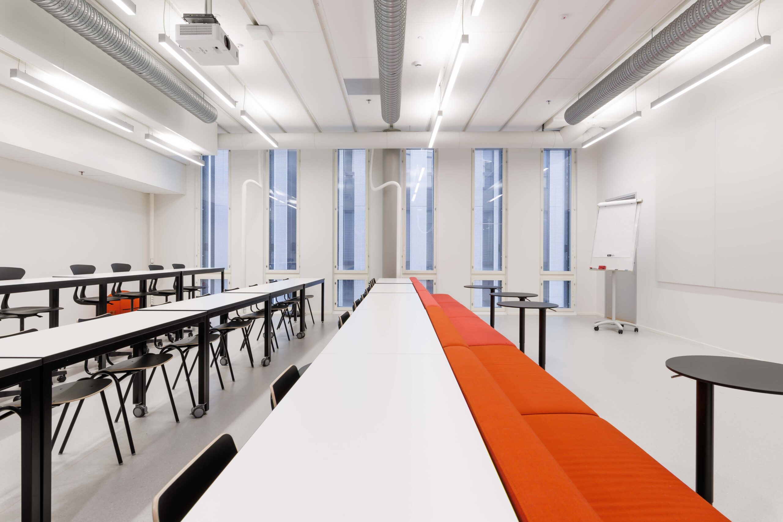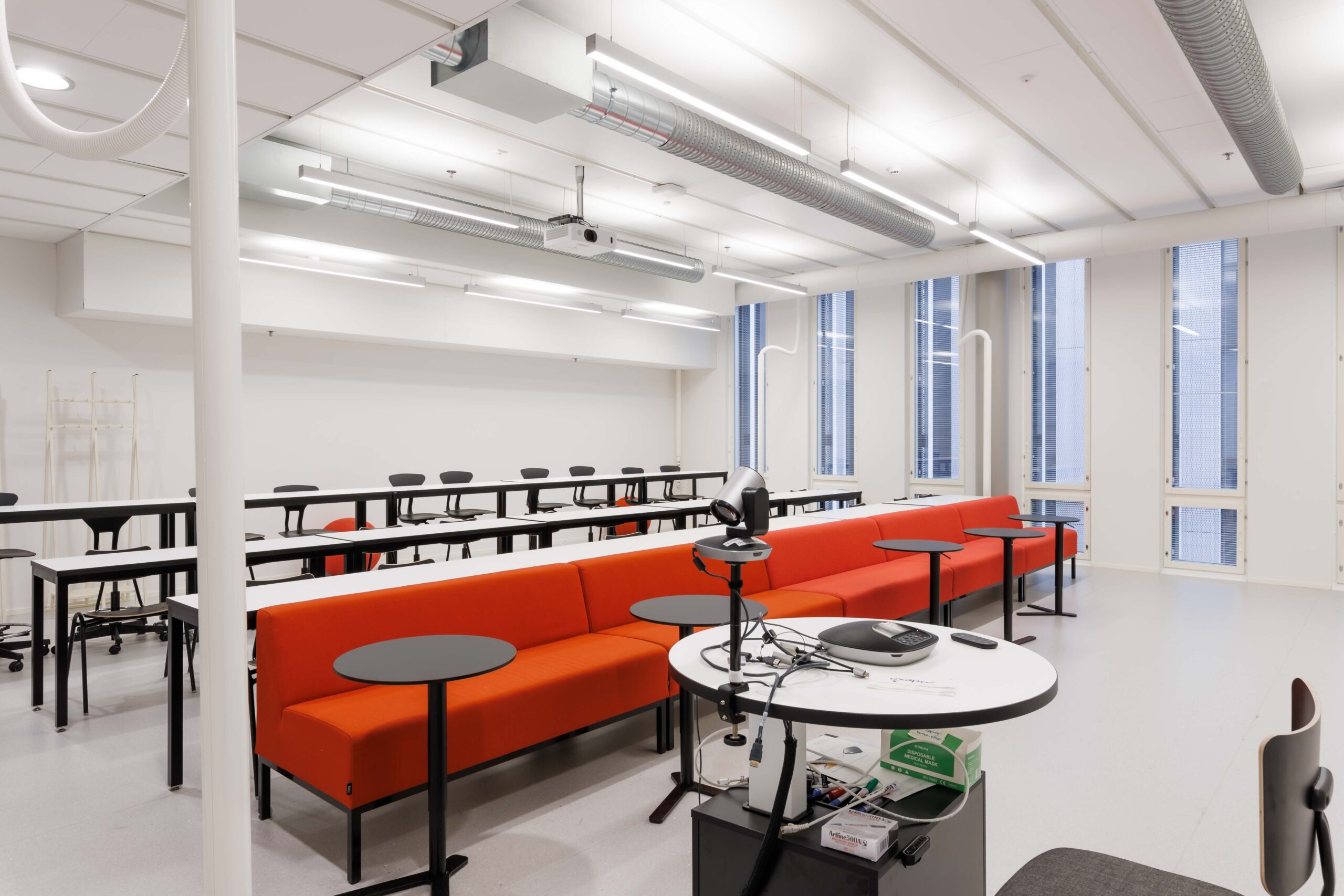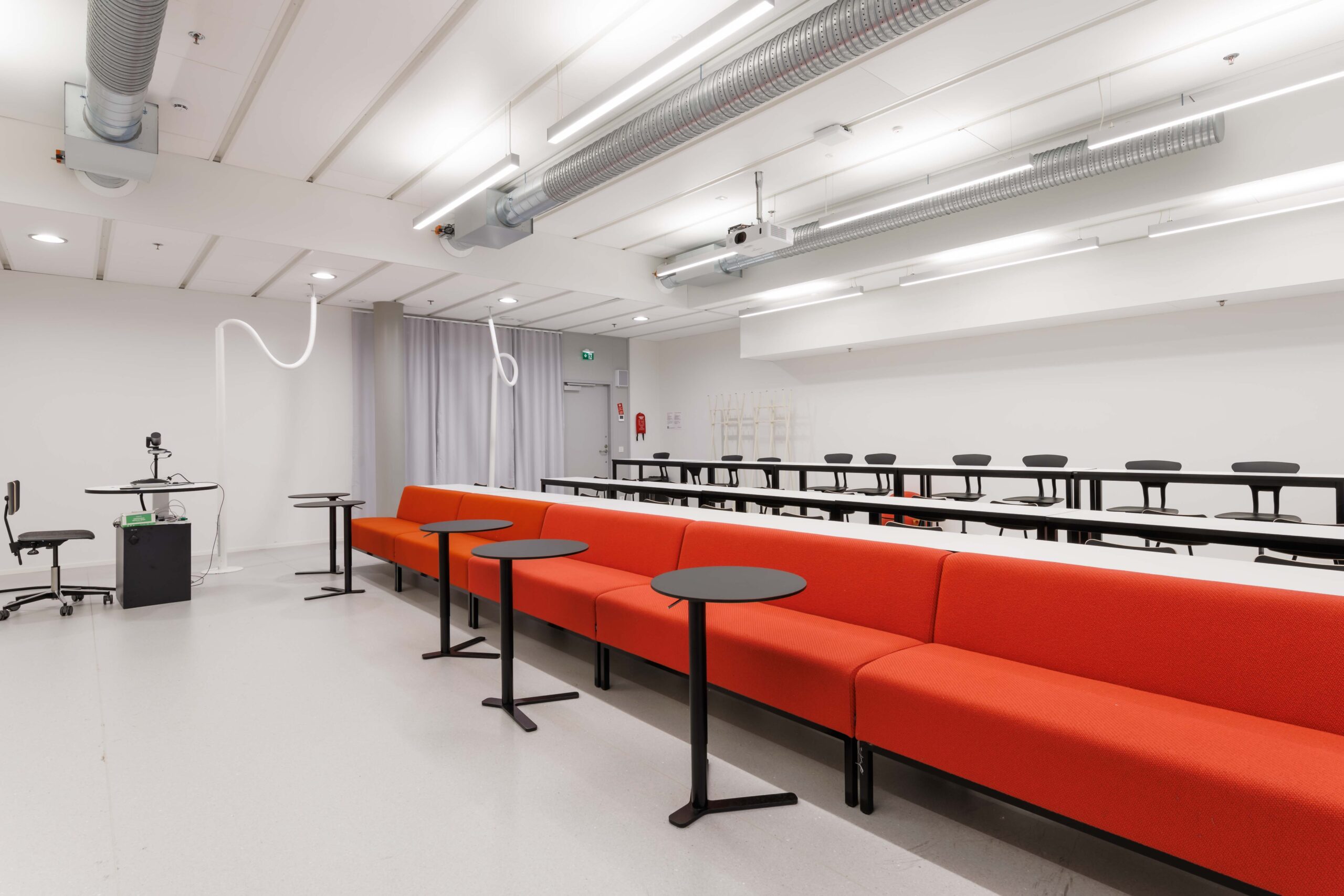 Porrastettu kalustus. Sohvat, sohvapöydät, eri korkuisia luentopöytiä, koulutuoleja, aktiivituoleja, pyörällisiä tuoleja. Tilassa etäprojektori.